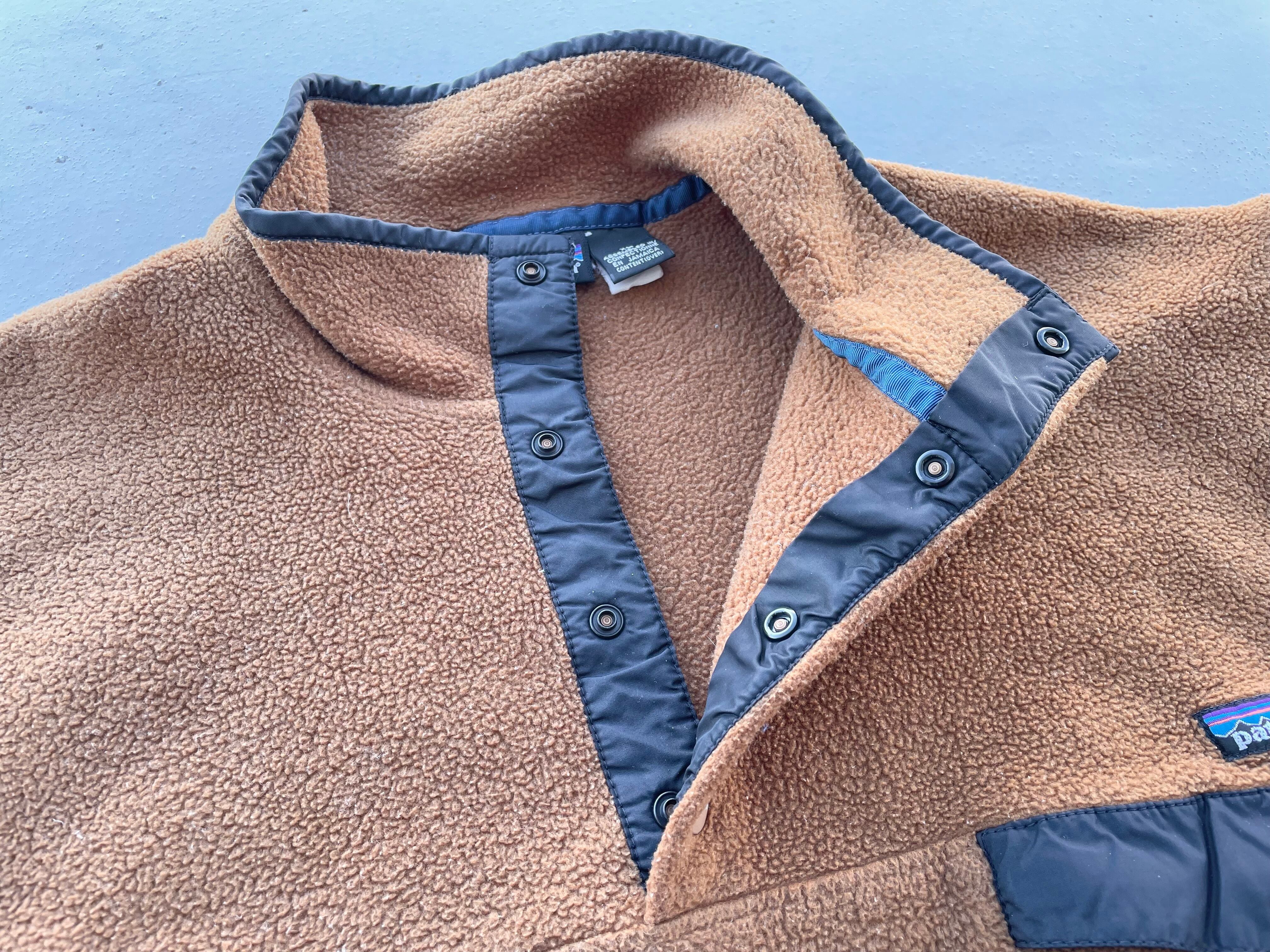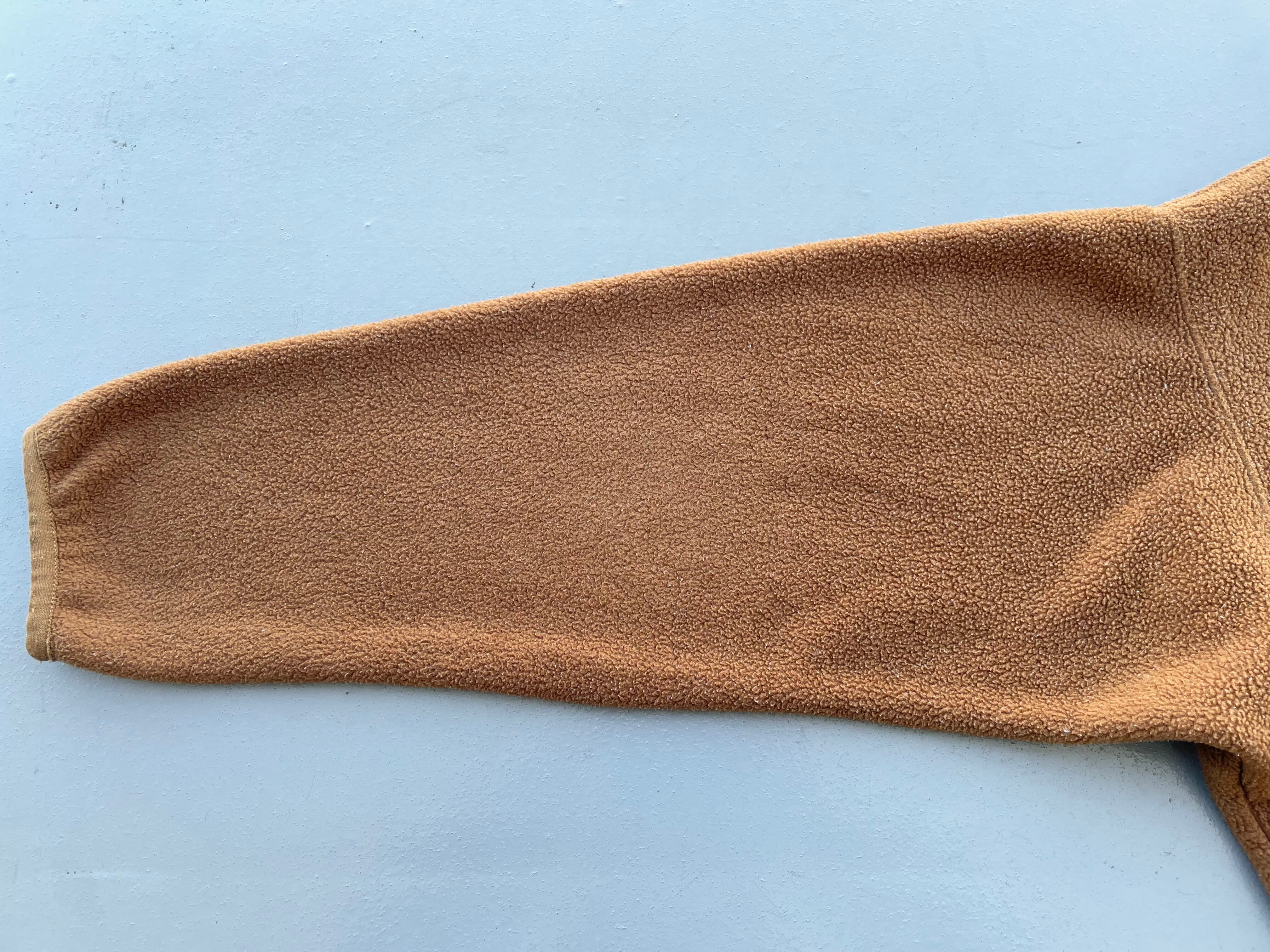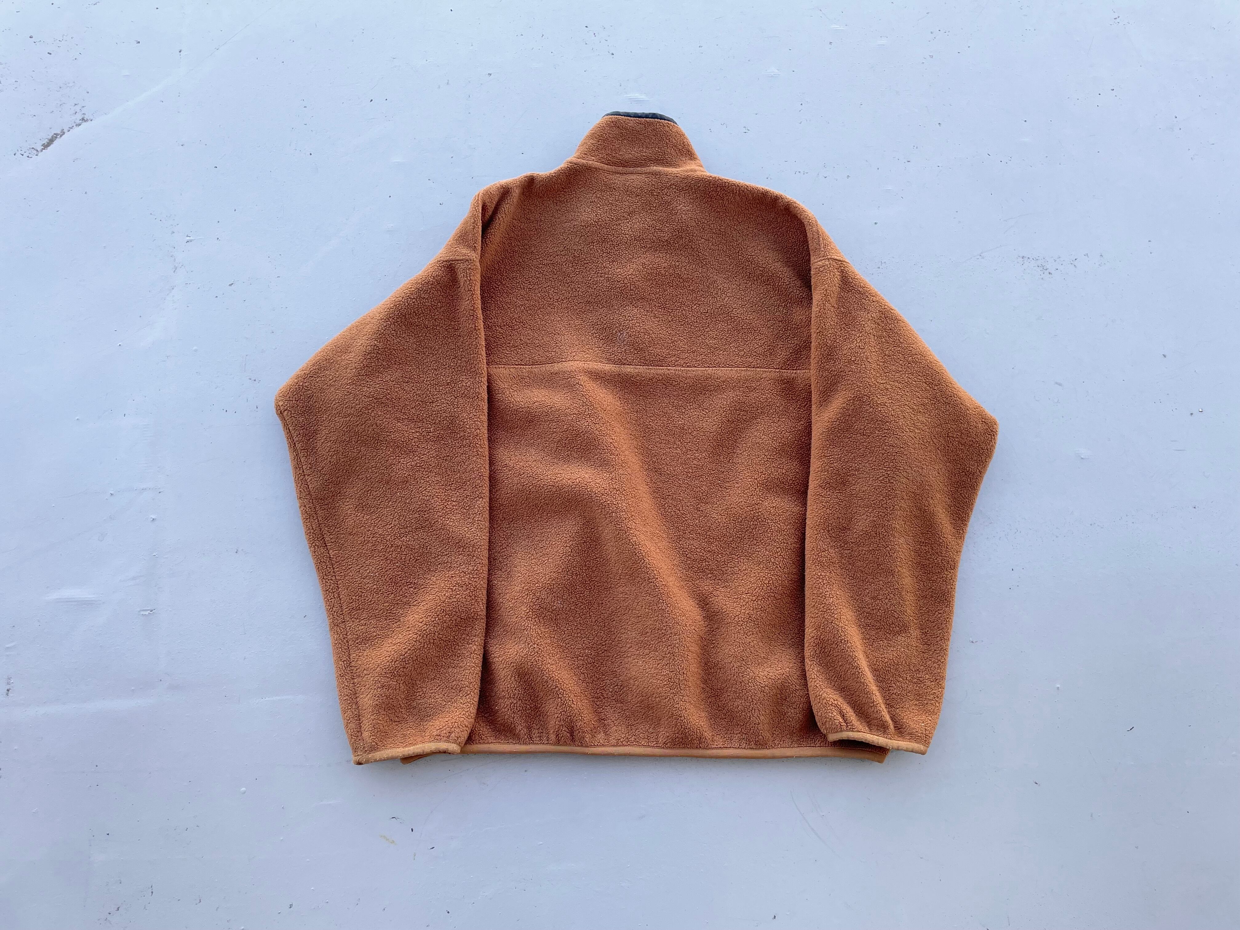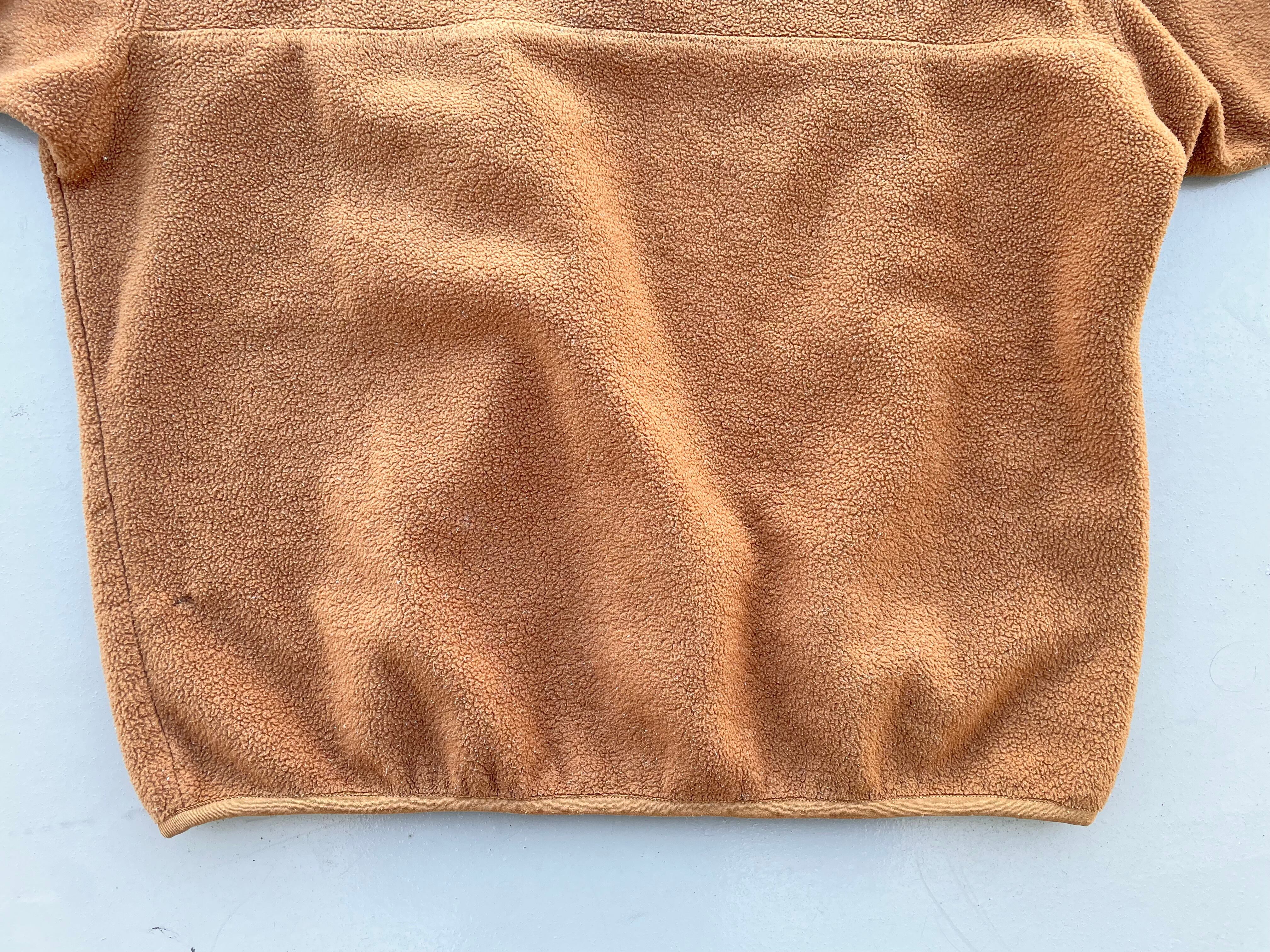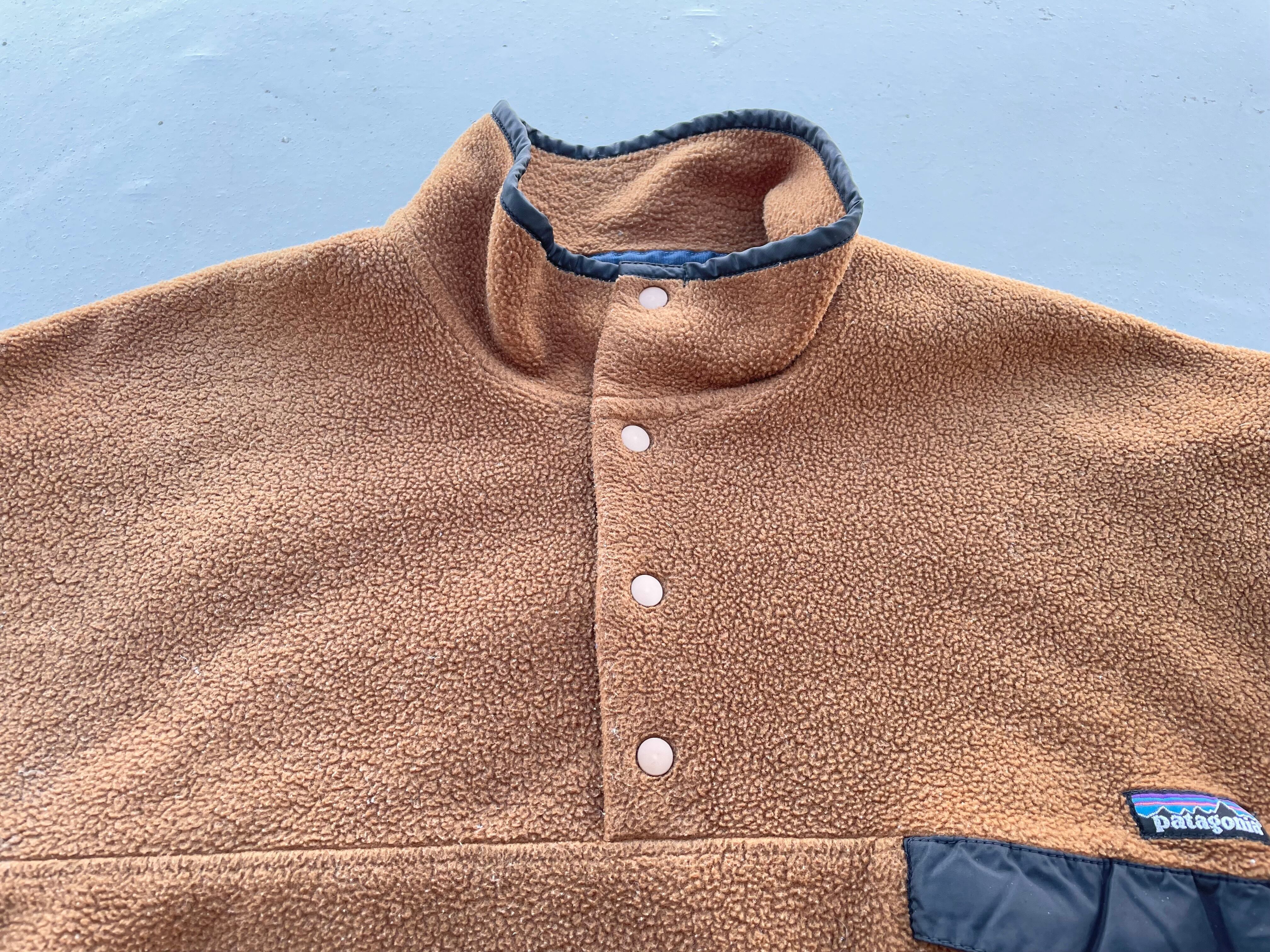 【商品詳細】パタゴニアのシンチラスナップT。サイズはXL。カラーははベアブラウン。95年ジャマイカ製。出回り少ないベアブラウンカラー。大人なブラウンカラーで着回しやすそうです。サイズ縮みなくしっかり大きいです。一部箇所にフリース抜けはございますがフリース地はペラペラしておらず厚みがあり全体で見ると悪くないコンディションだと思います。
