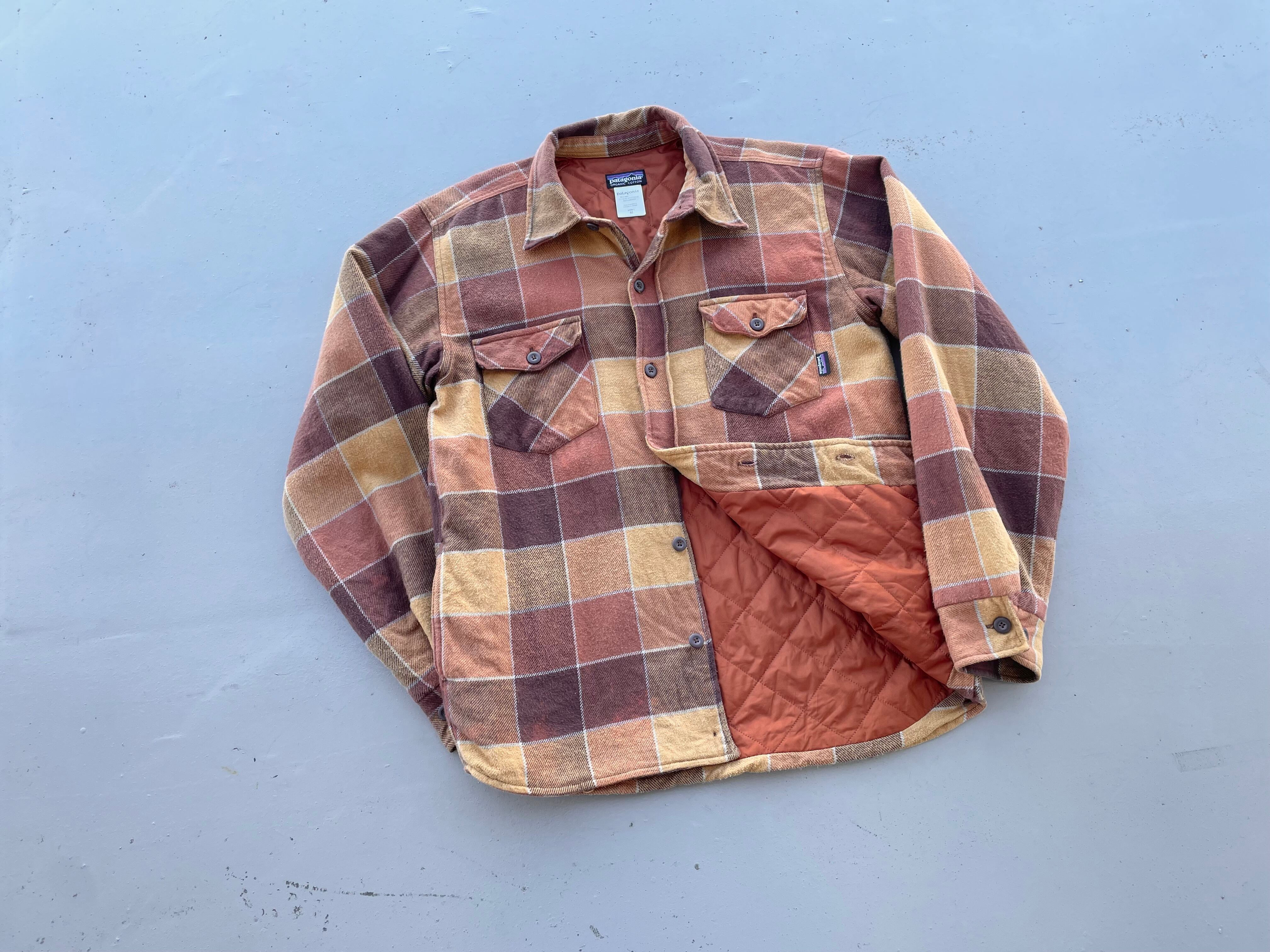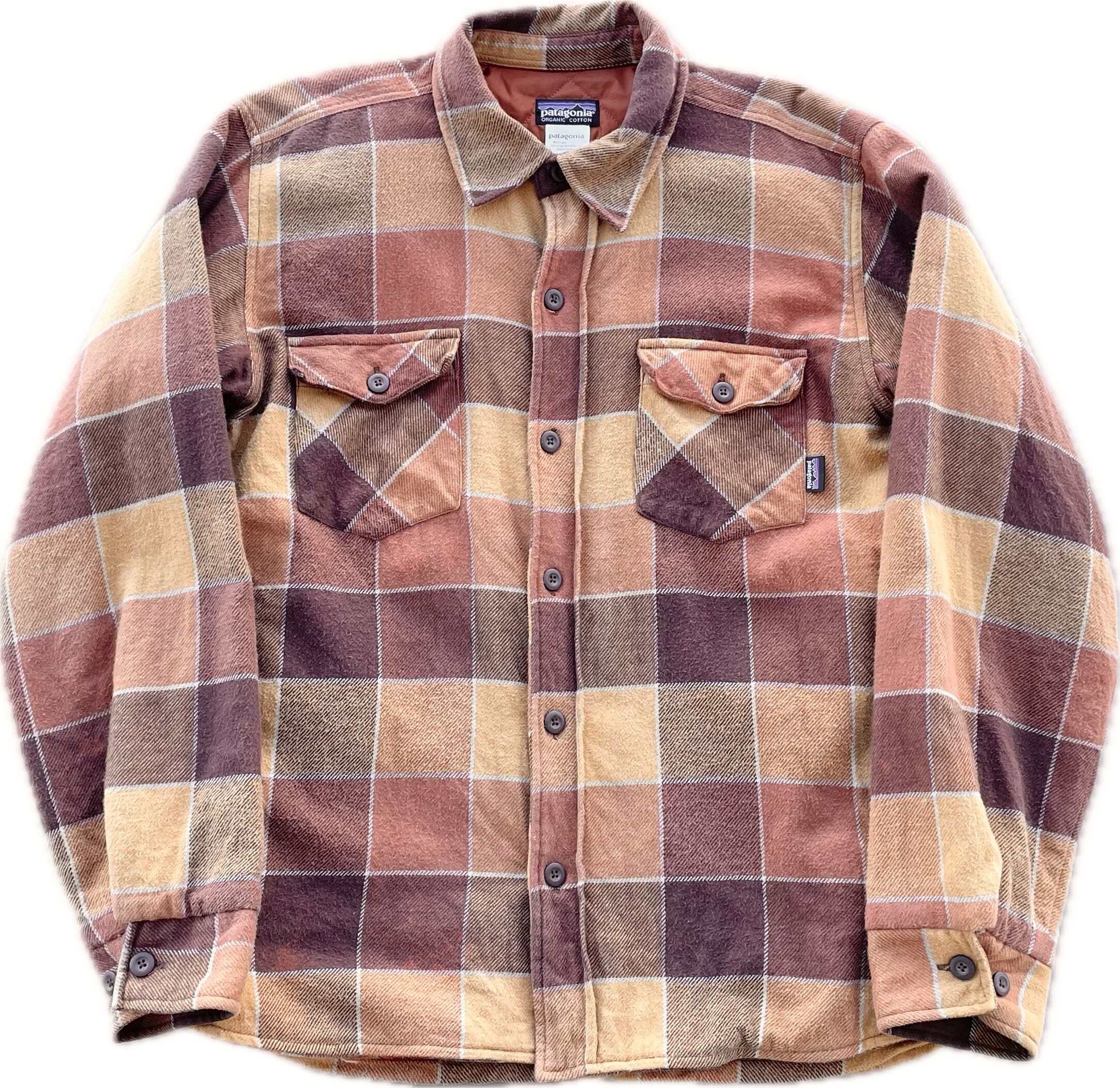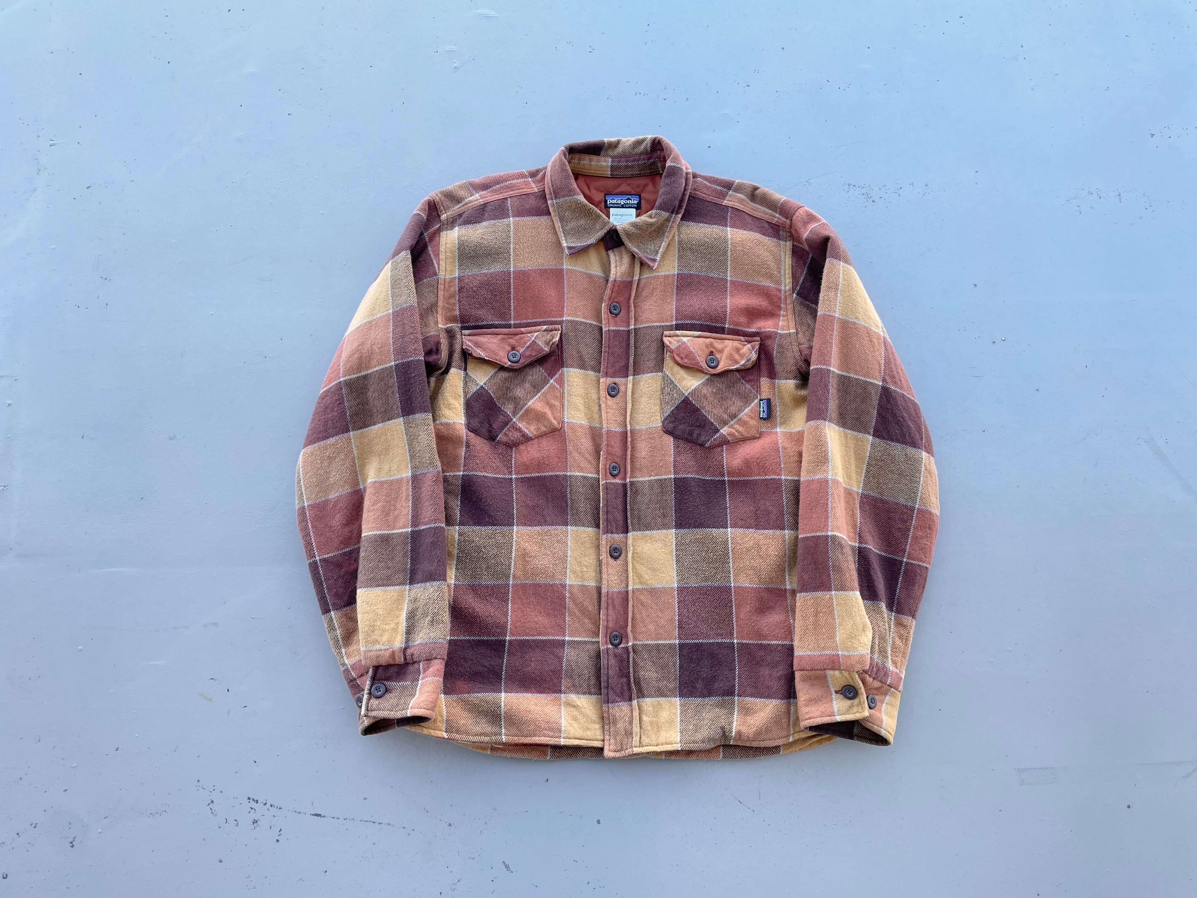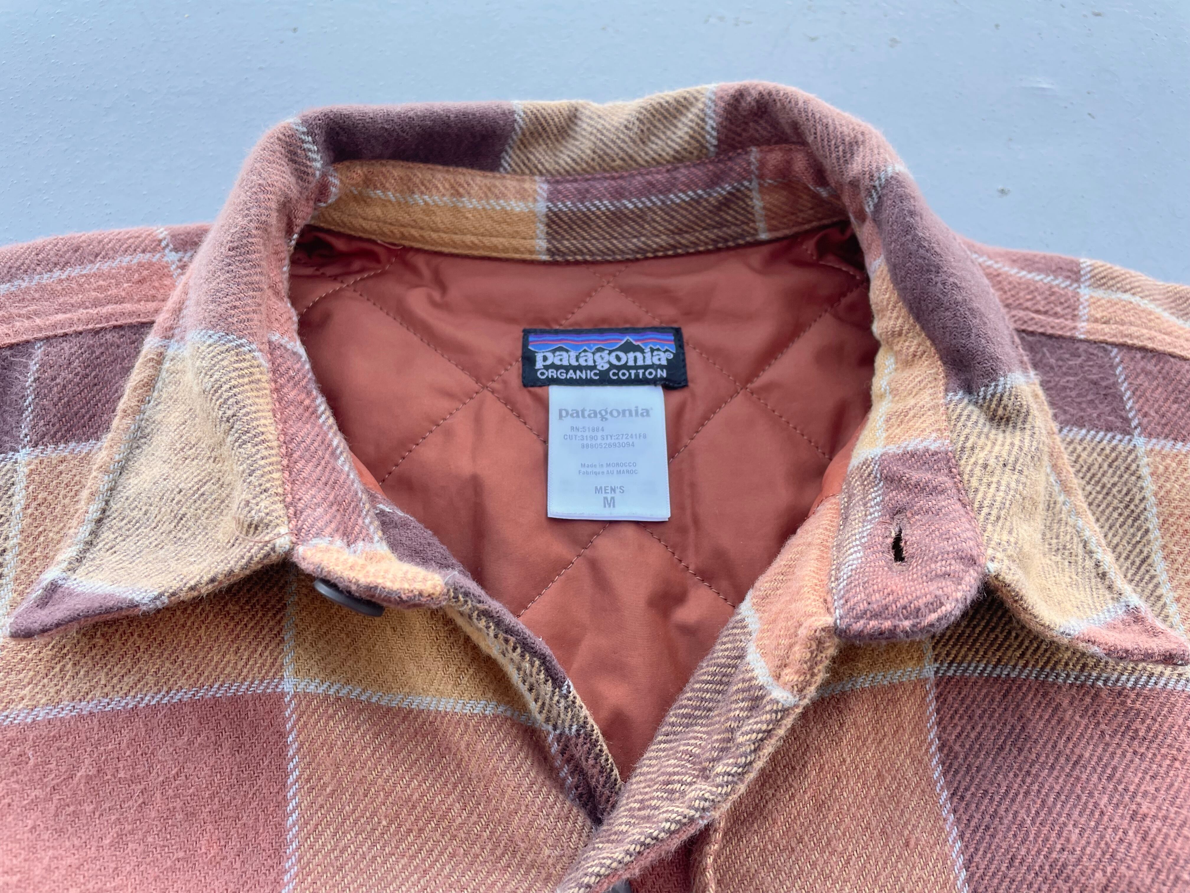 【商品詳細】パタゴニアのフランネルチェックキルティングライナーシャツ。カラーはブラウン×オレンジベースのチェックパターン。サイズはM。08年モロッコ製。古着によく合いそうなチェックパターン◎ライニングはキルティング仕様で今時期活躍するかと。