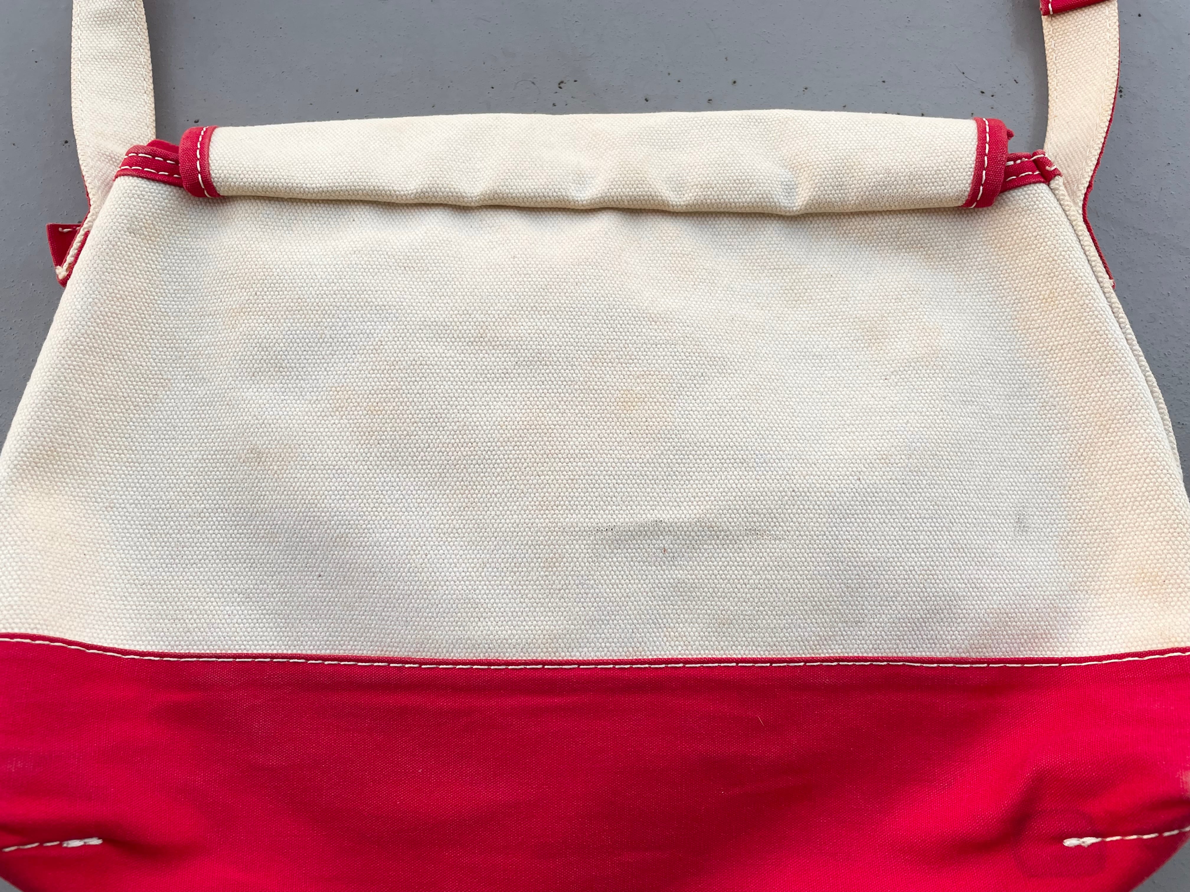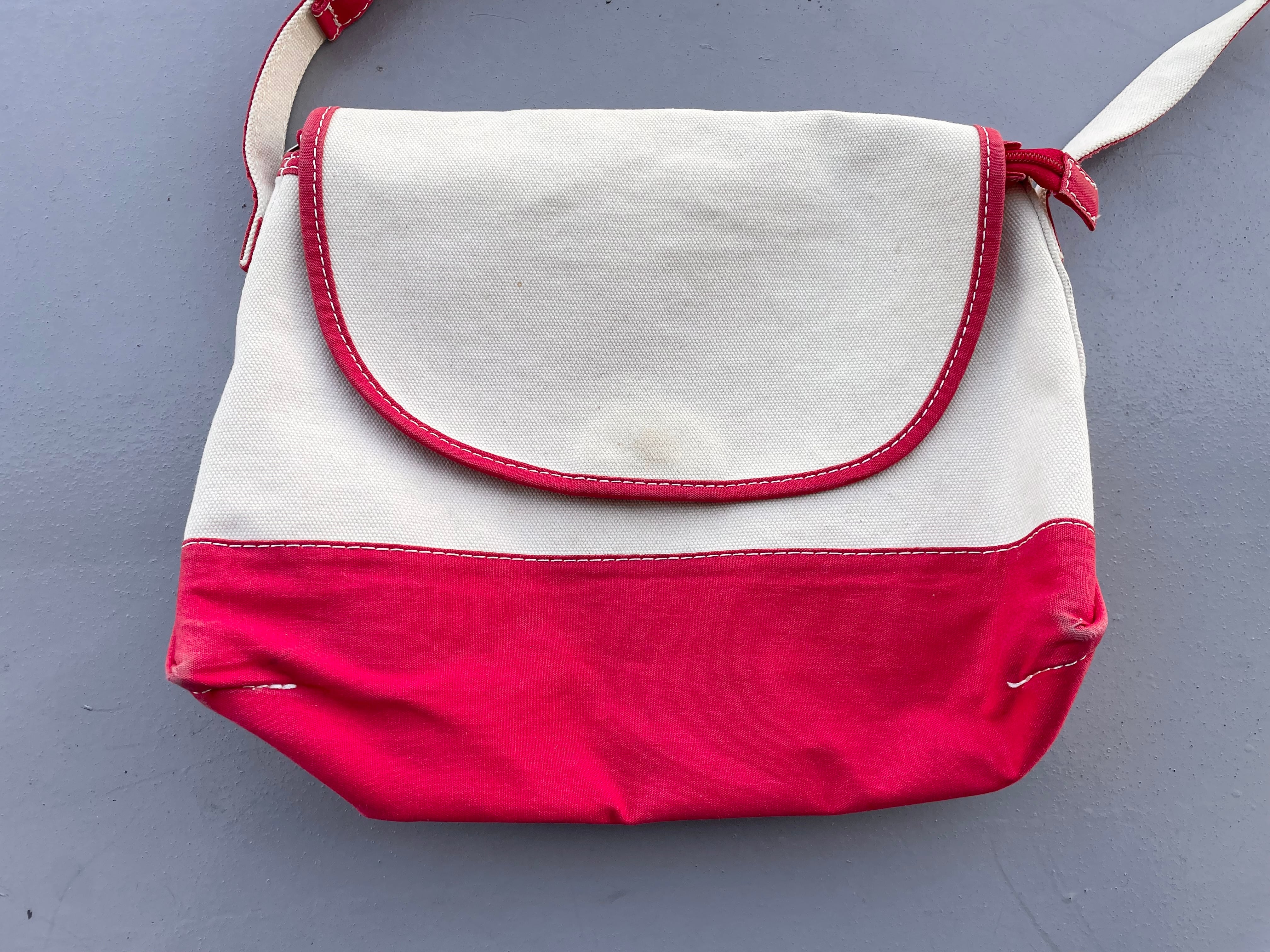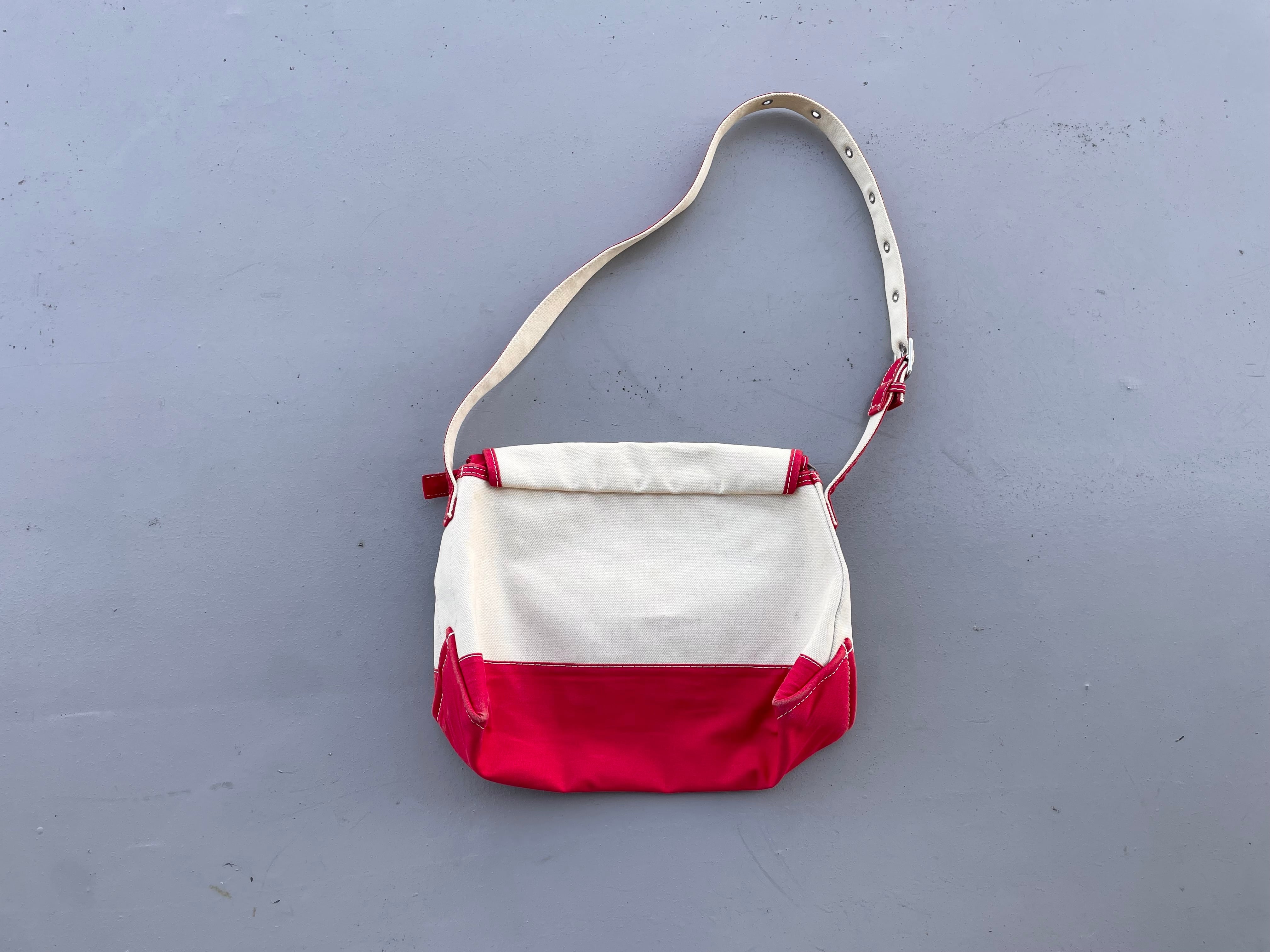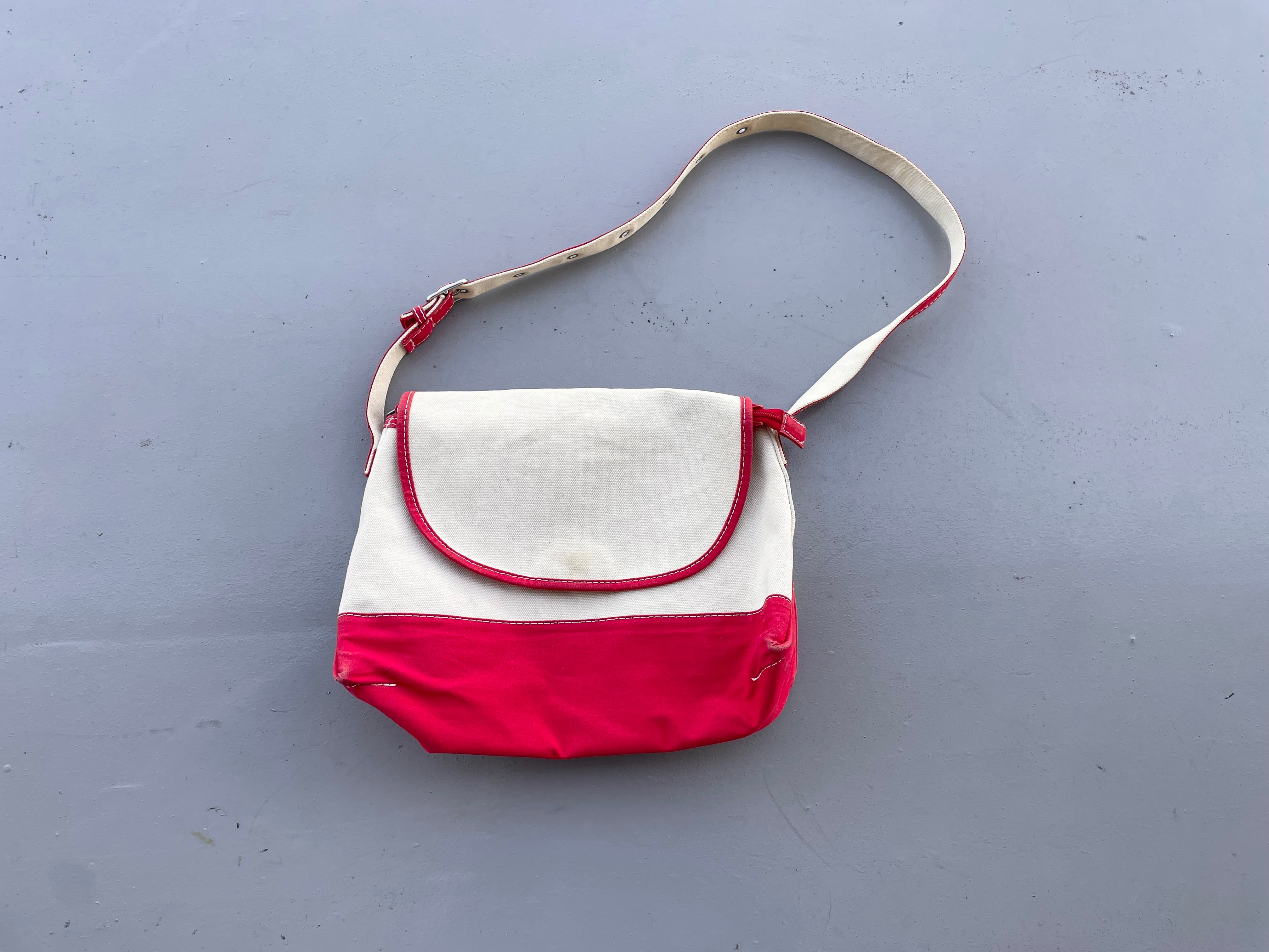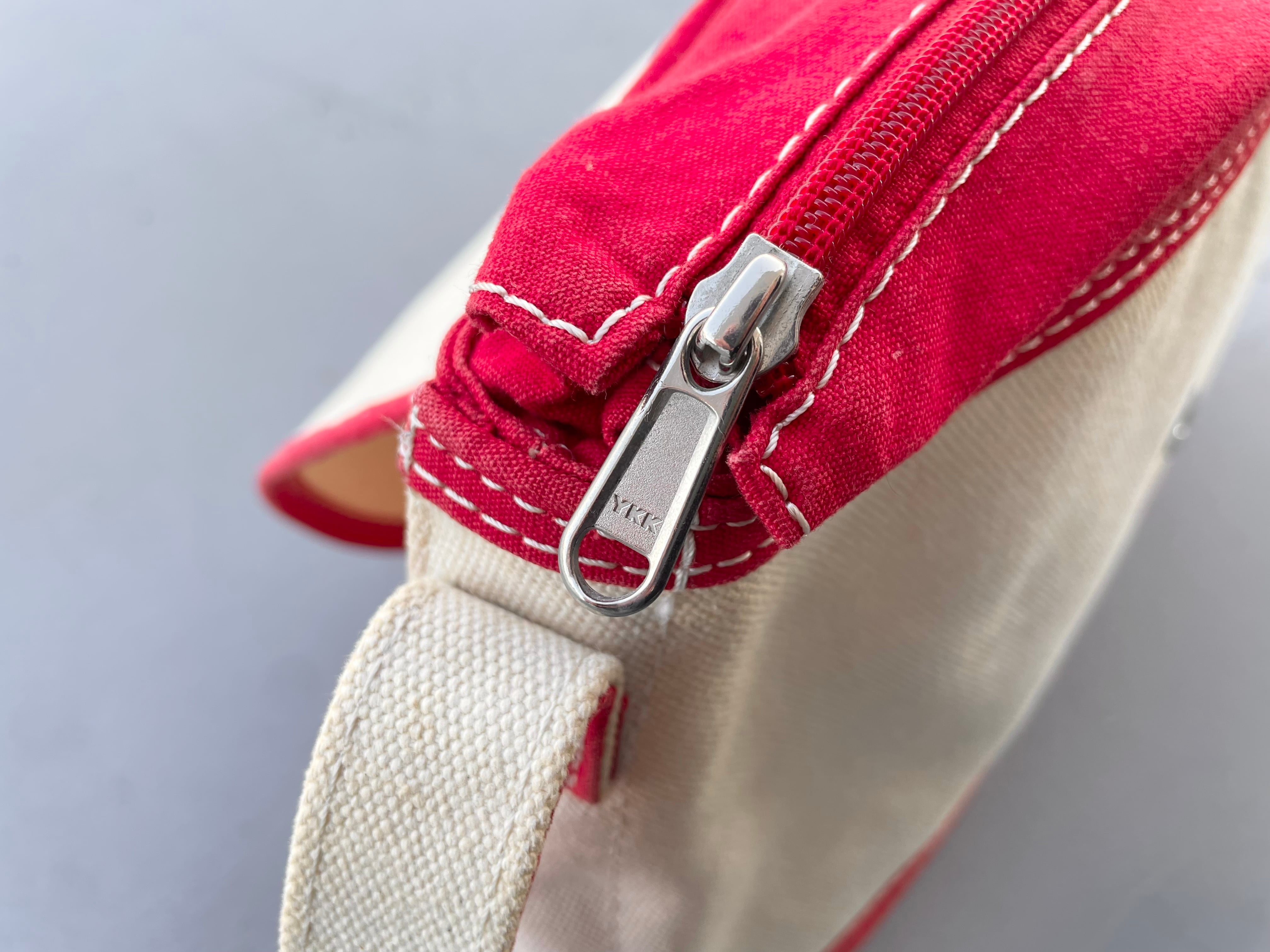 【商品詳細】エルエルビーンのキャンバスショルダーバッグ。カラーはナチュラル×レッド。00年代中国製。定番ボート&トート地をショルダーバッグに落とし込んだ珍品。大きすぎず小さすぎずのデイリーに使いやすいサイズ感◎生地にはハリがあり独立して立つコンディションです。全体的に薄汚れございますが、まだまだ使える活躍する個体かと。古いモデルではないですが結構珍しいと思います。