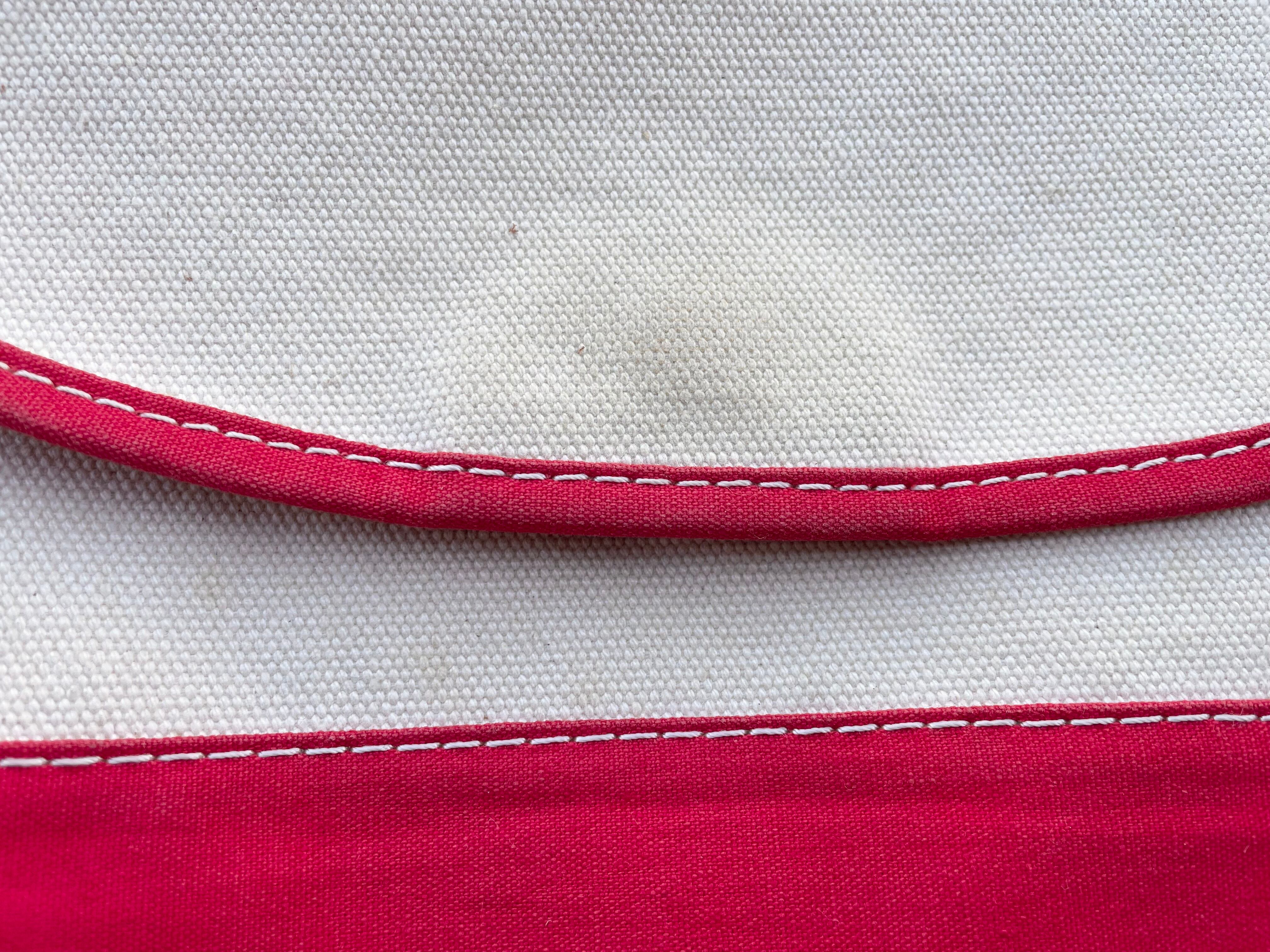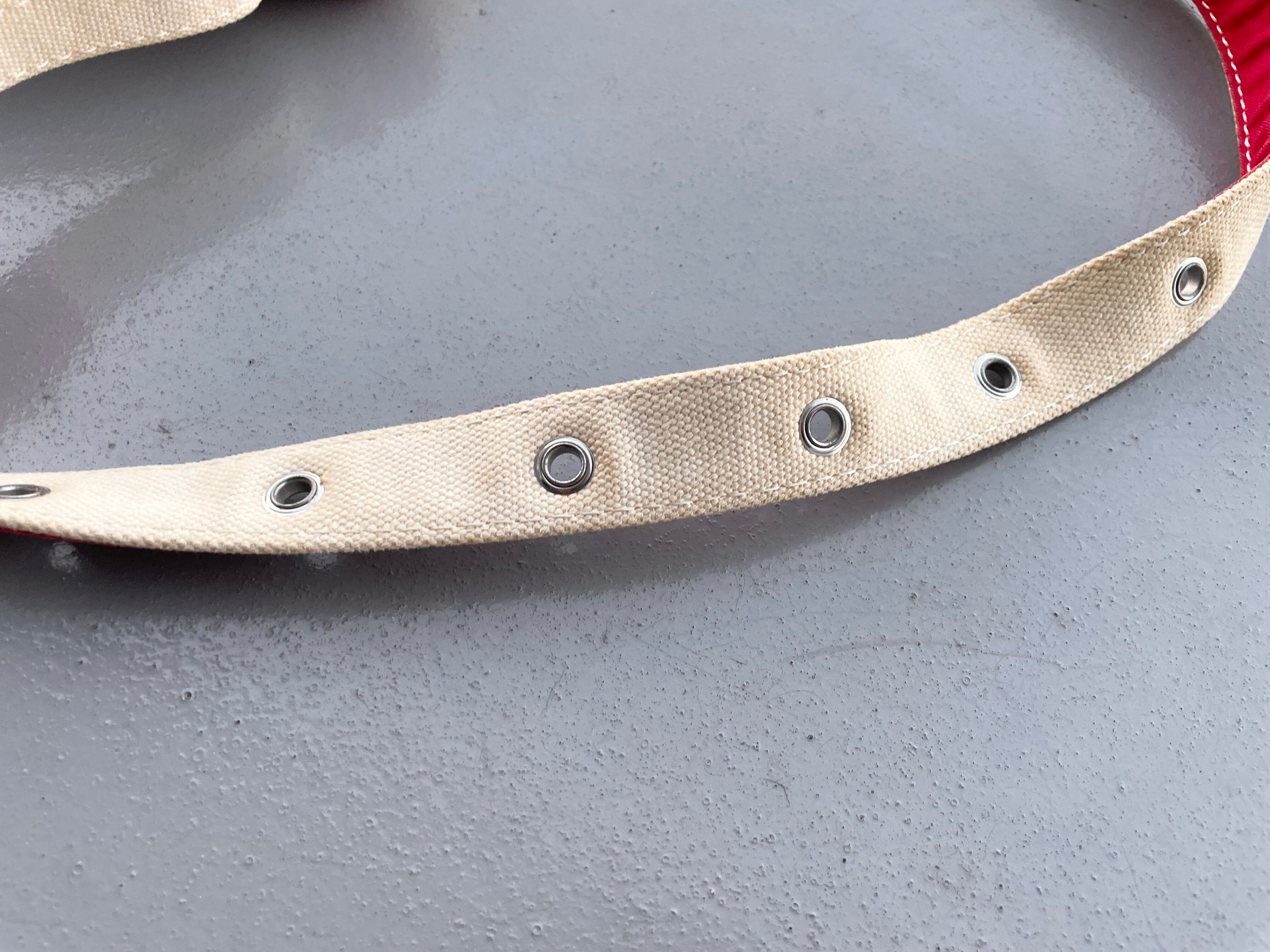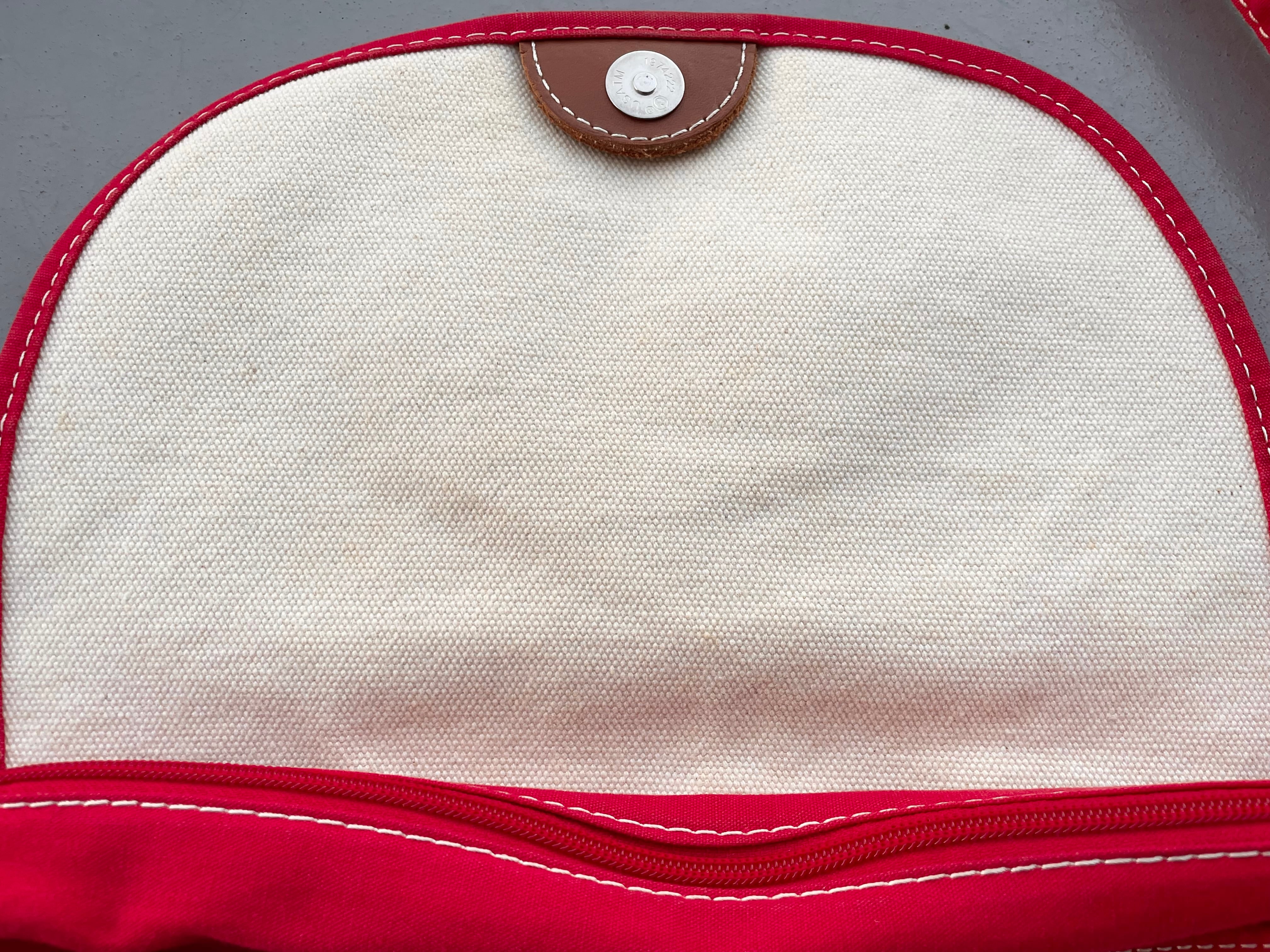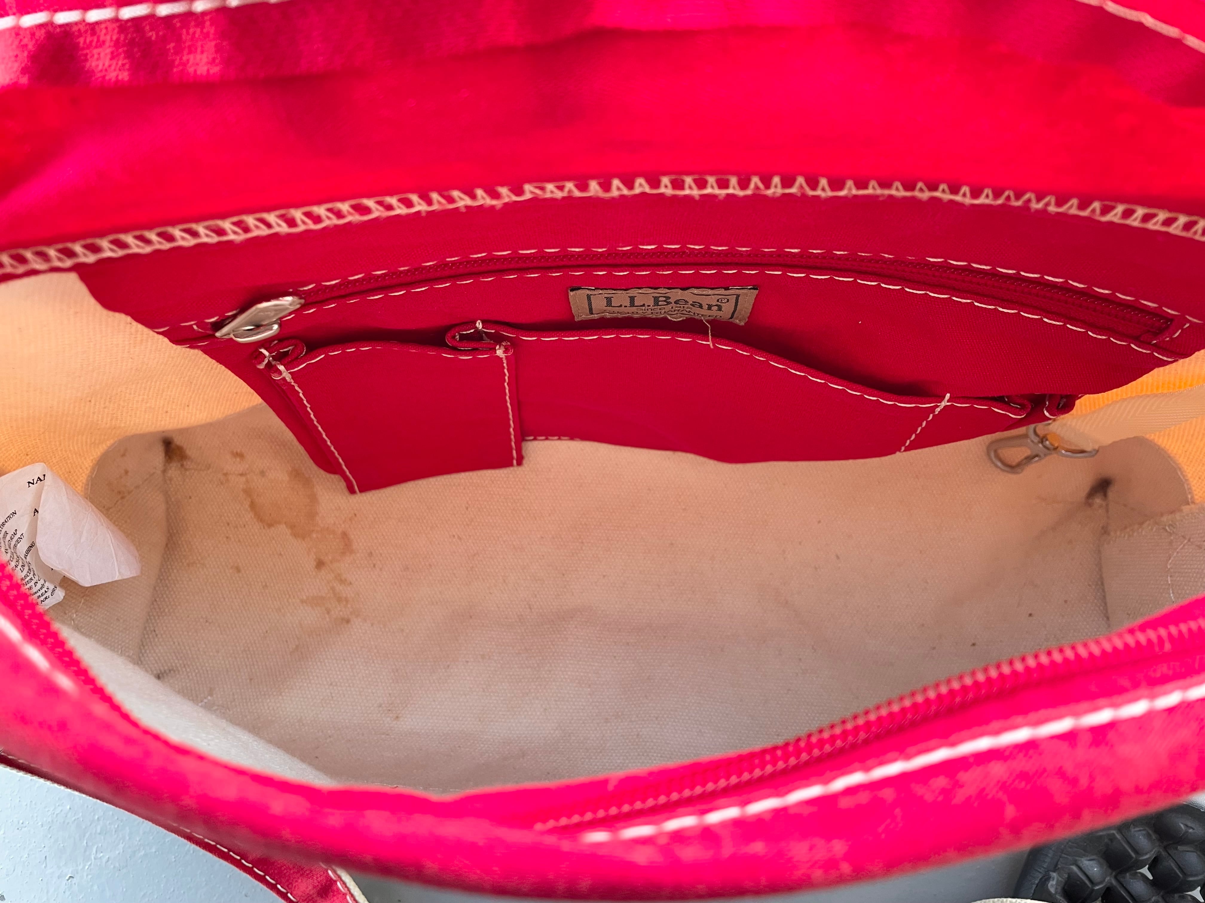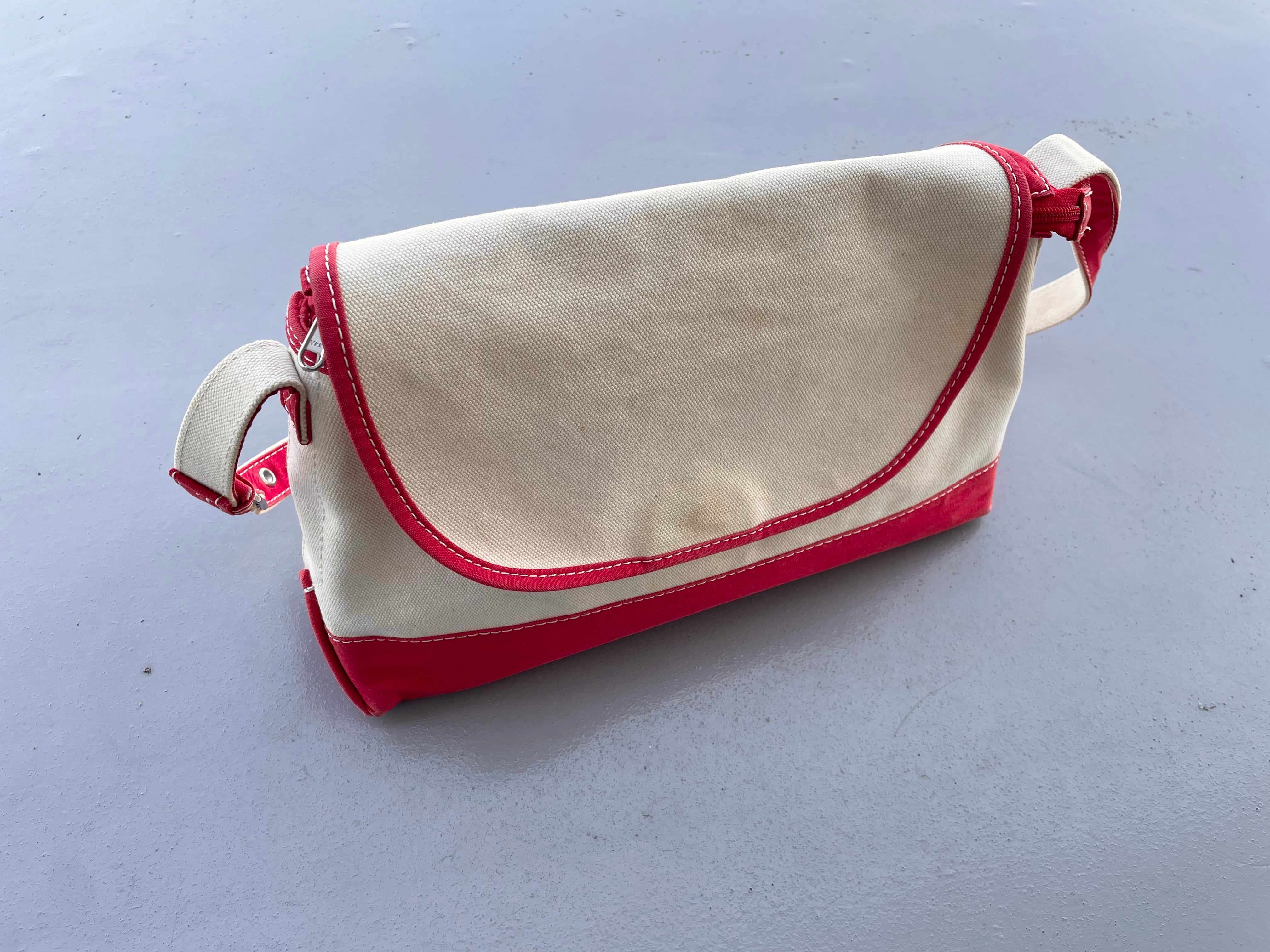 【商品詳細】エルエルビーンのキャンバスショルダーバッグ。カラーはナチュラル×レッド。00年代中国製。定番ボート&トート地をショルダーバッグに落とし込んだ珍品。大きすぎず小さすぎずのデイリーに使いやすいサイズ感◎生地にはハリがあり独立して立つコンディションです。全体的に薄汚れございますが、まだまだ使える活躍する個体かと。古いモデルではないですが結構珍しいと思います。