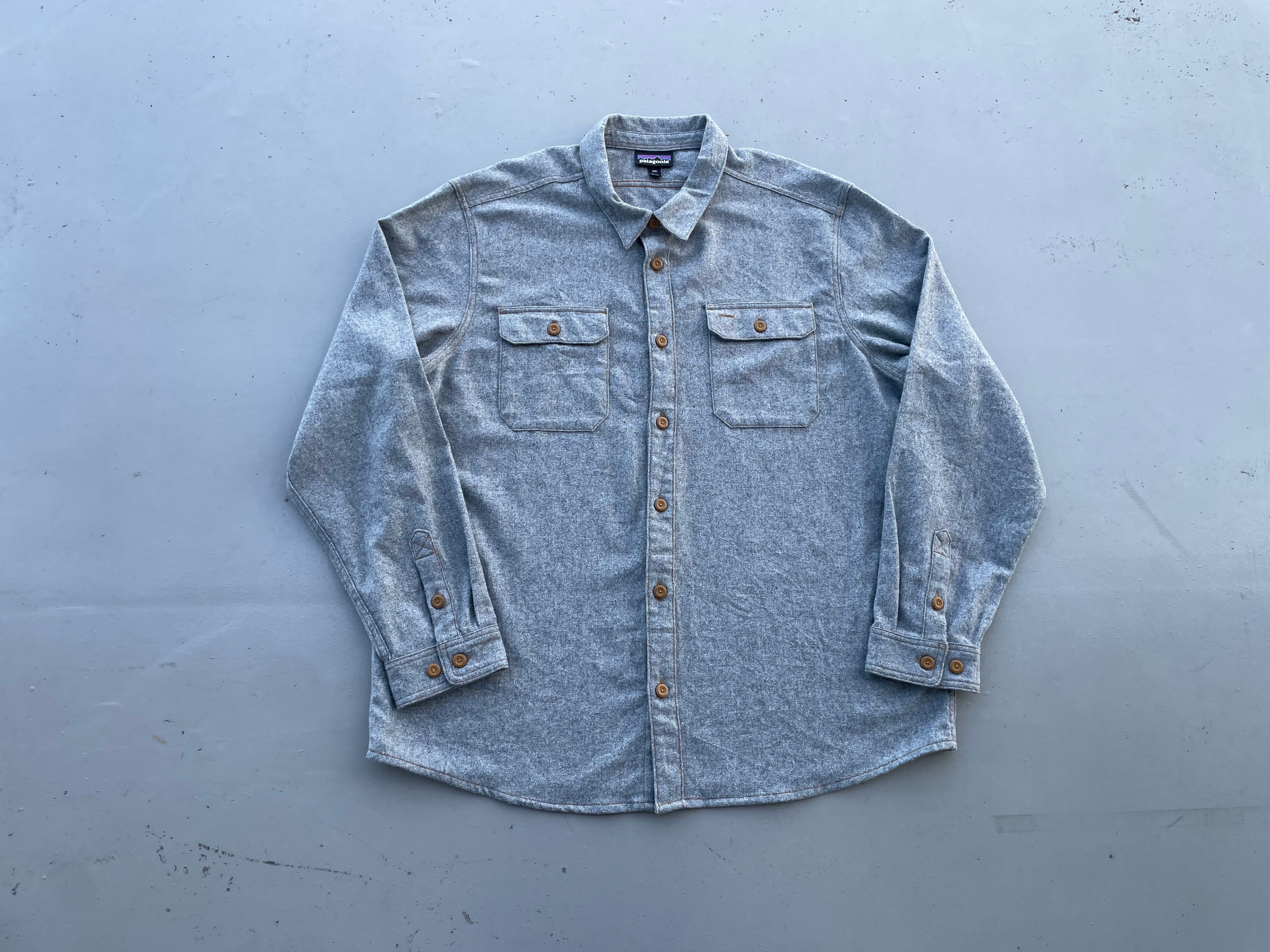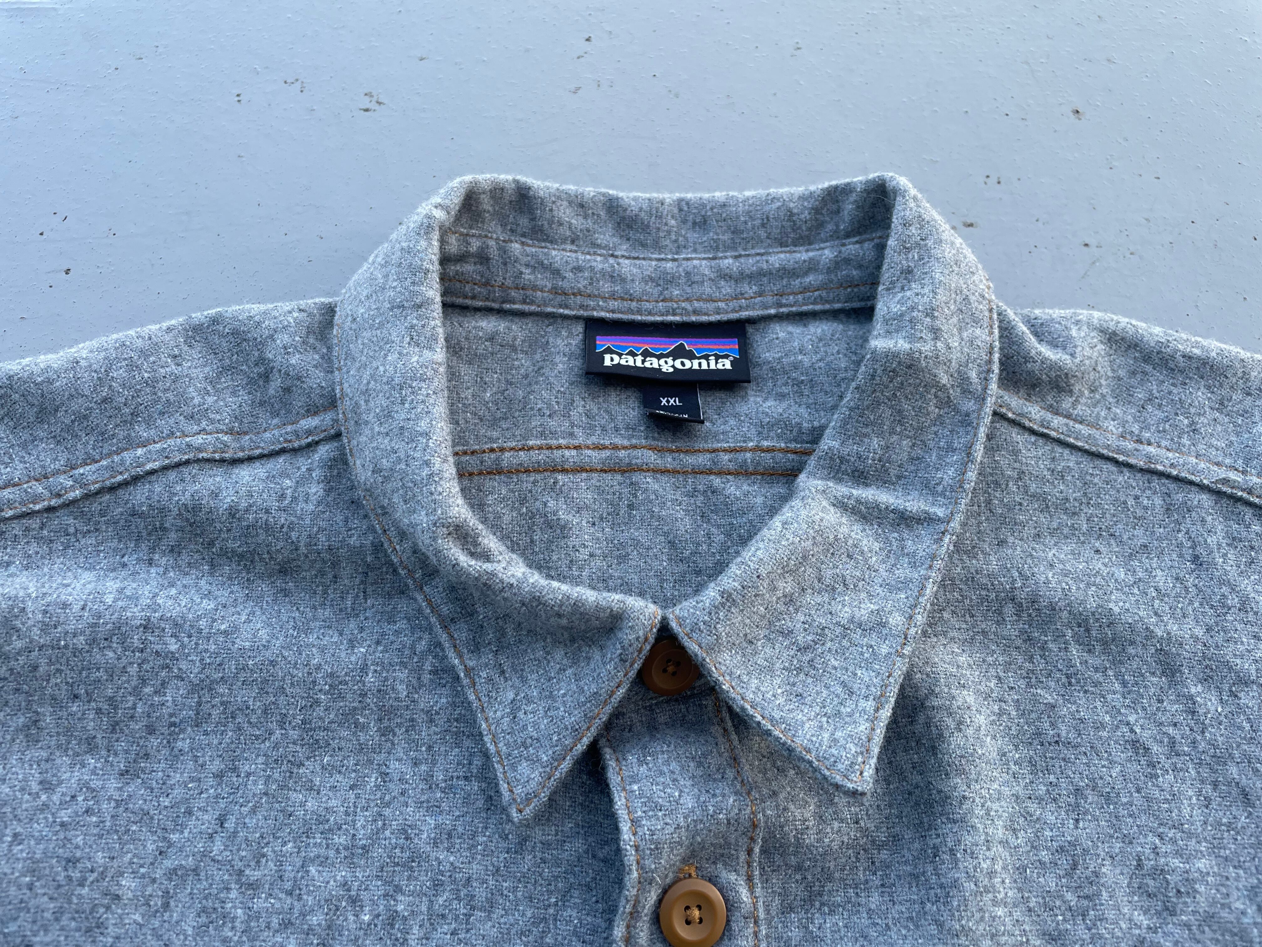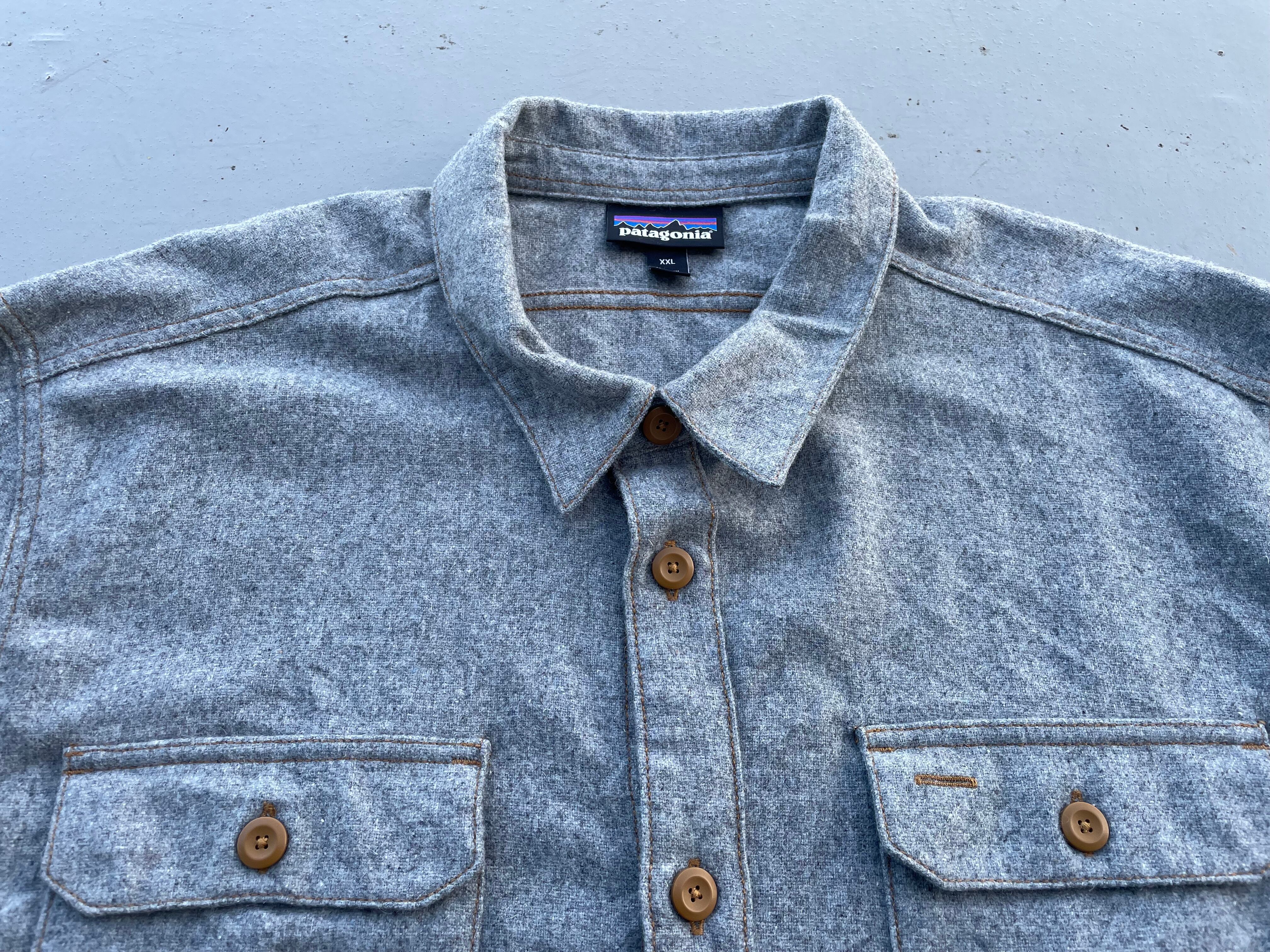 【商品詳細】パタゴニアのウールシャツ。サイズはXXL。カラーはグレー。16年スリランカ製。パタゴニアでは珍しいウール&ポリエステル混紡のシャツ。グレーカラーのボディにキャラメルカラーのステッチとボタンが洒落てます。大きめサイズで身幅もしっかりありジャケット感覚でご着用いただけます。着丈長過ぎないのでバランスよく着用出来そうです。