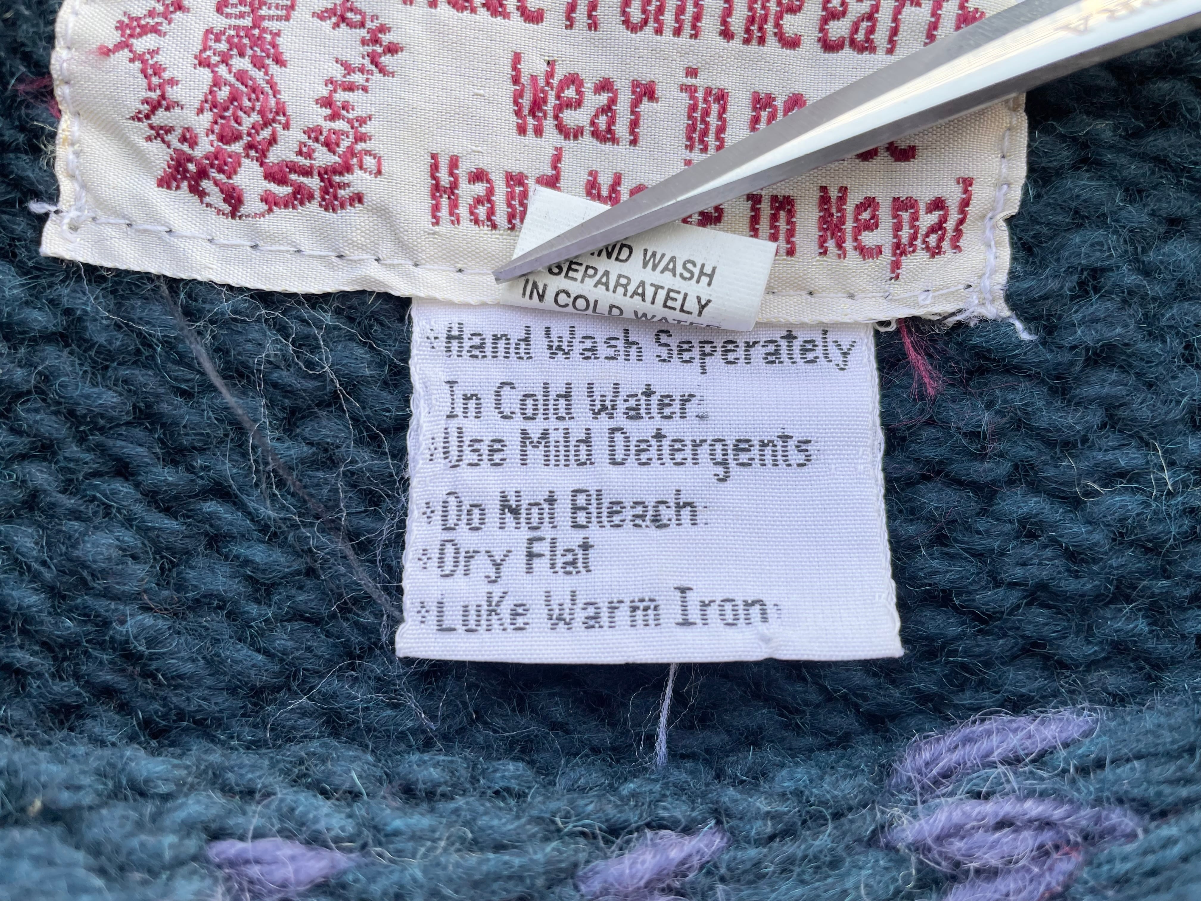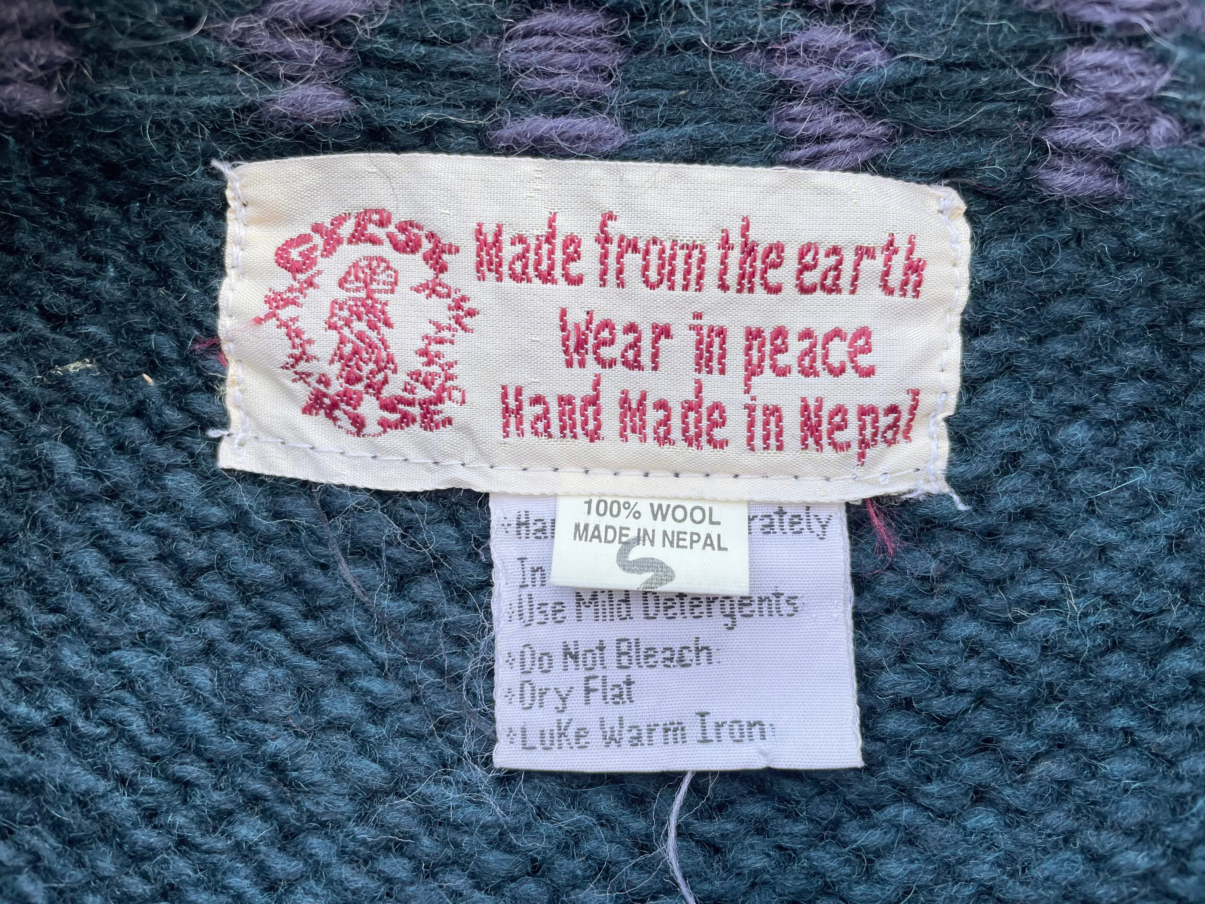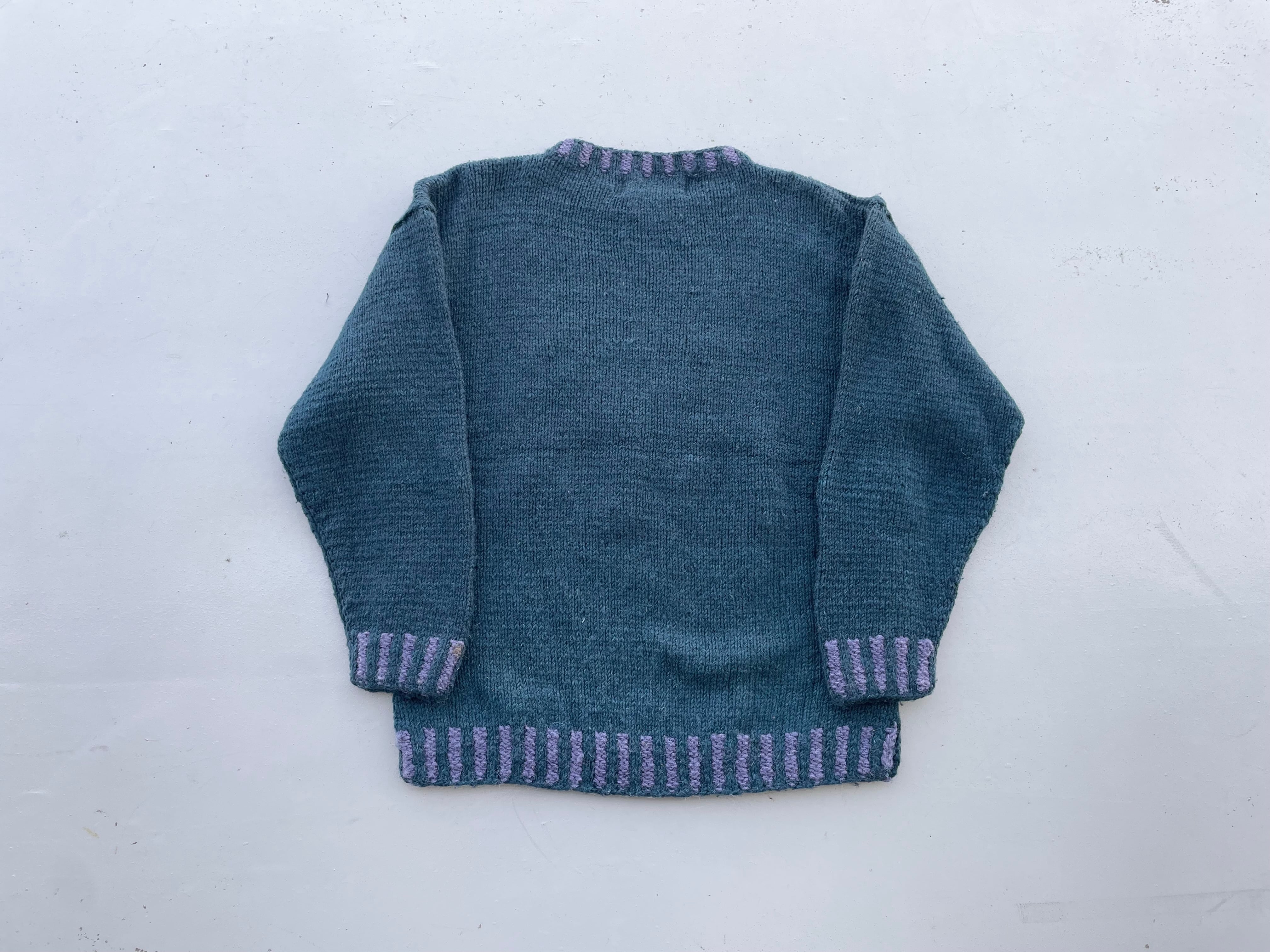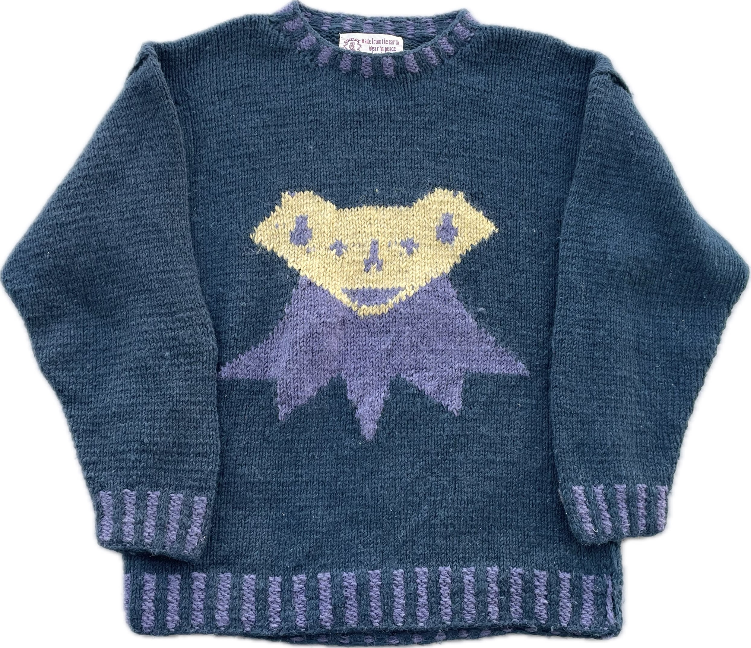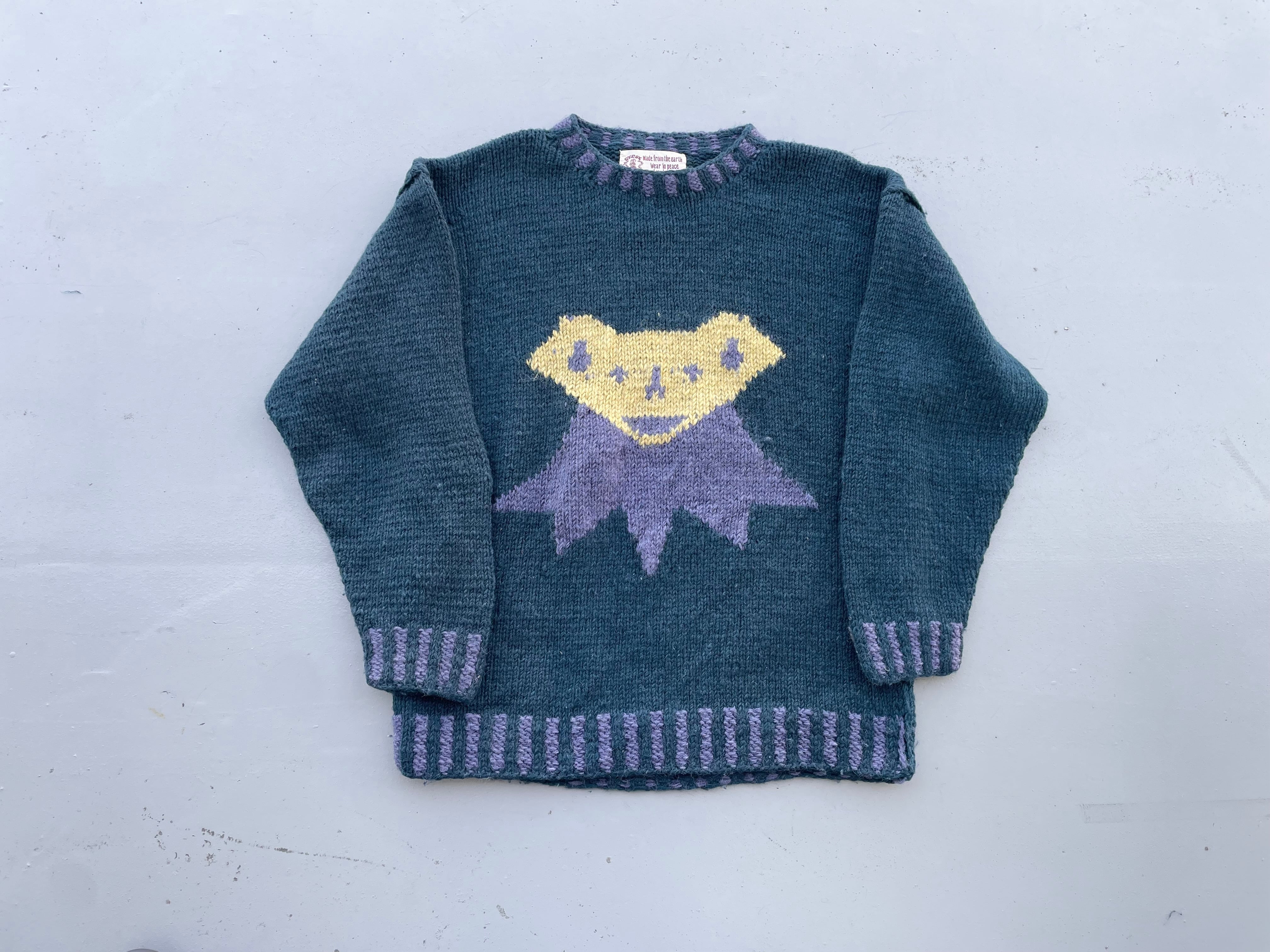 【商品詳細】GYPSY RISEのハンドニットセーター。サイズは実寸L-XL程。カラーは暗めのグリーンとブルーの中間色のような色。90年代ネパール製。グレイトフル・デッド名物キャラクターのダンシングベアがフロント中央に大胆にデザインされた珍品物。襟元・裾、袖先のデザインや全体の配色もかっこいいです。ざっくりした手編みな紡績も良い風合い◎