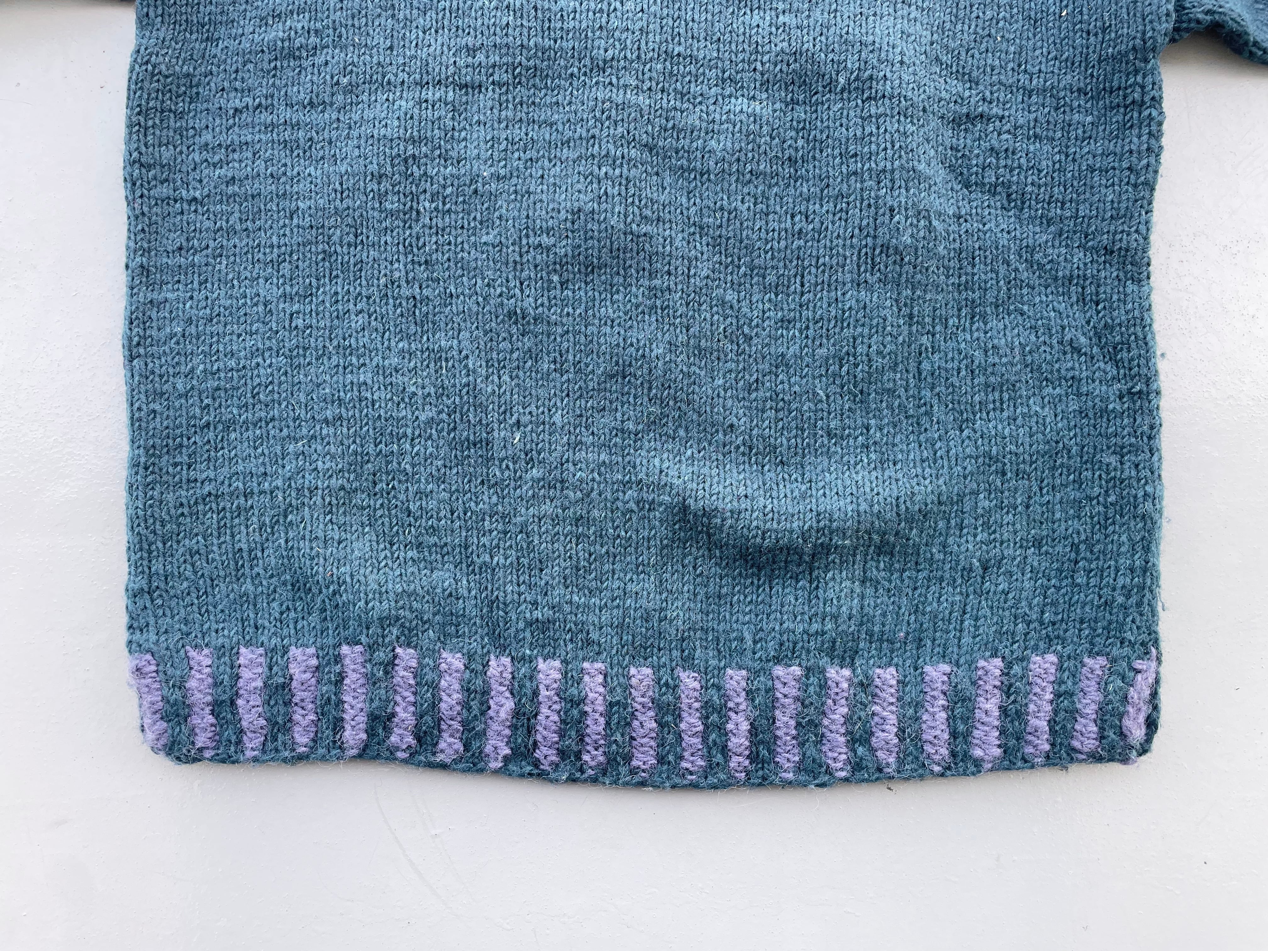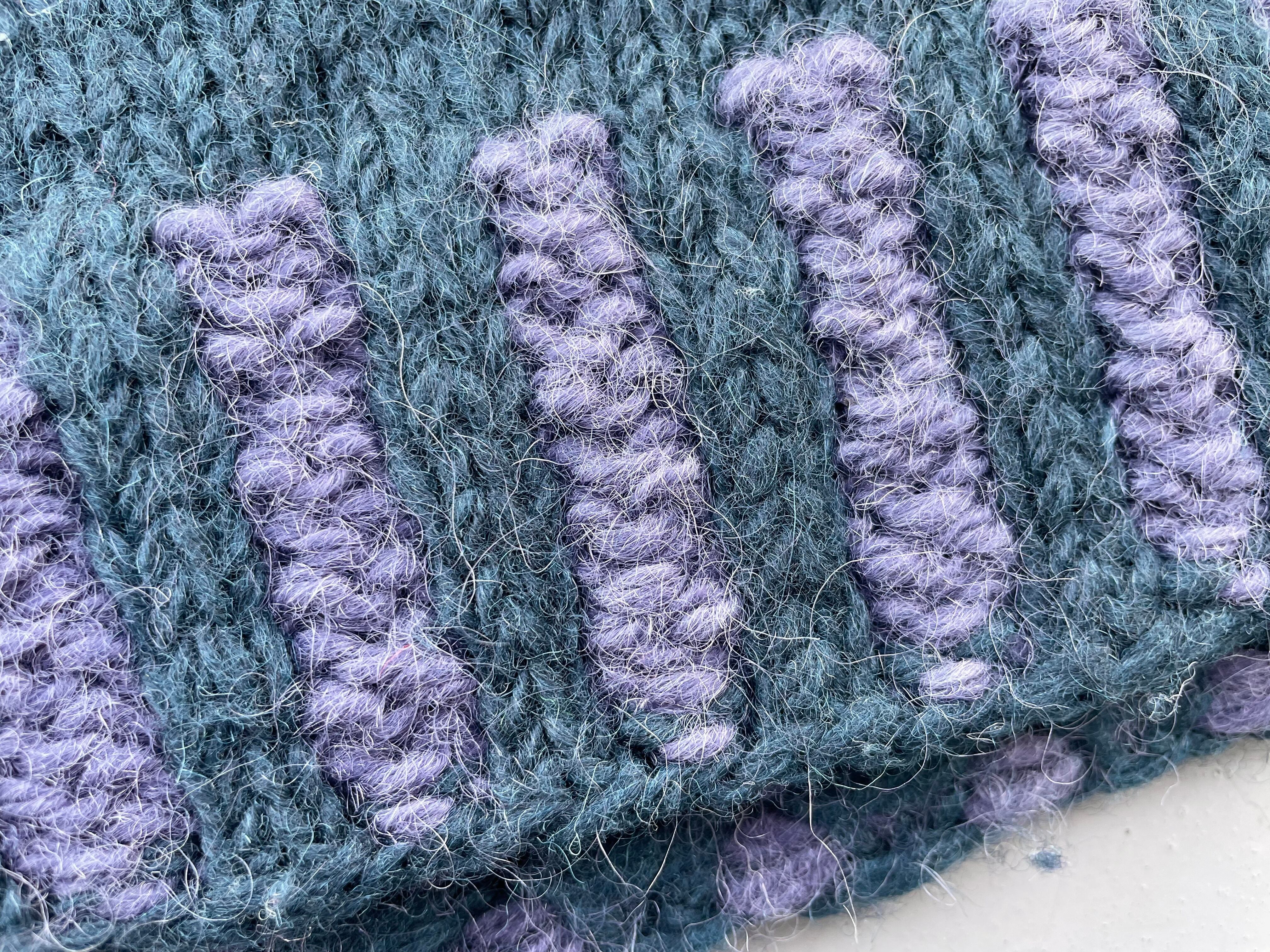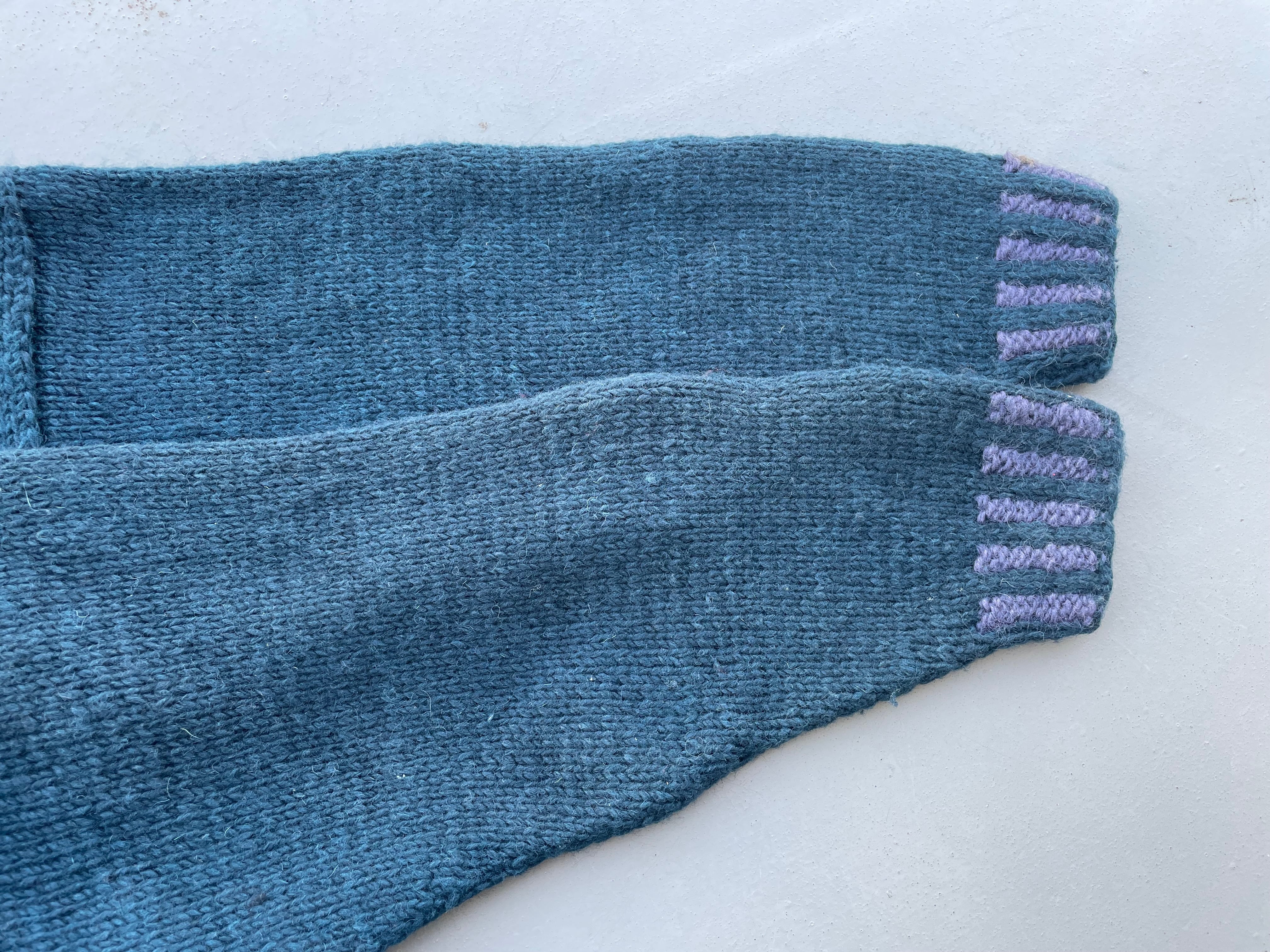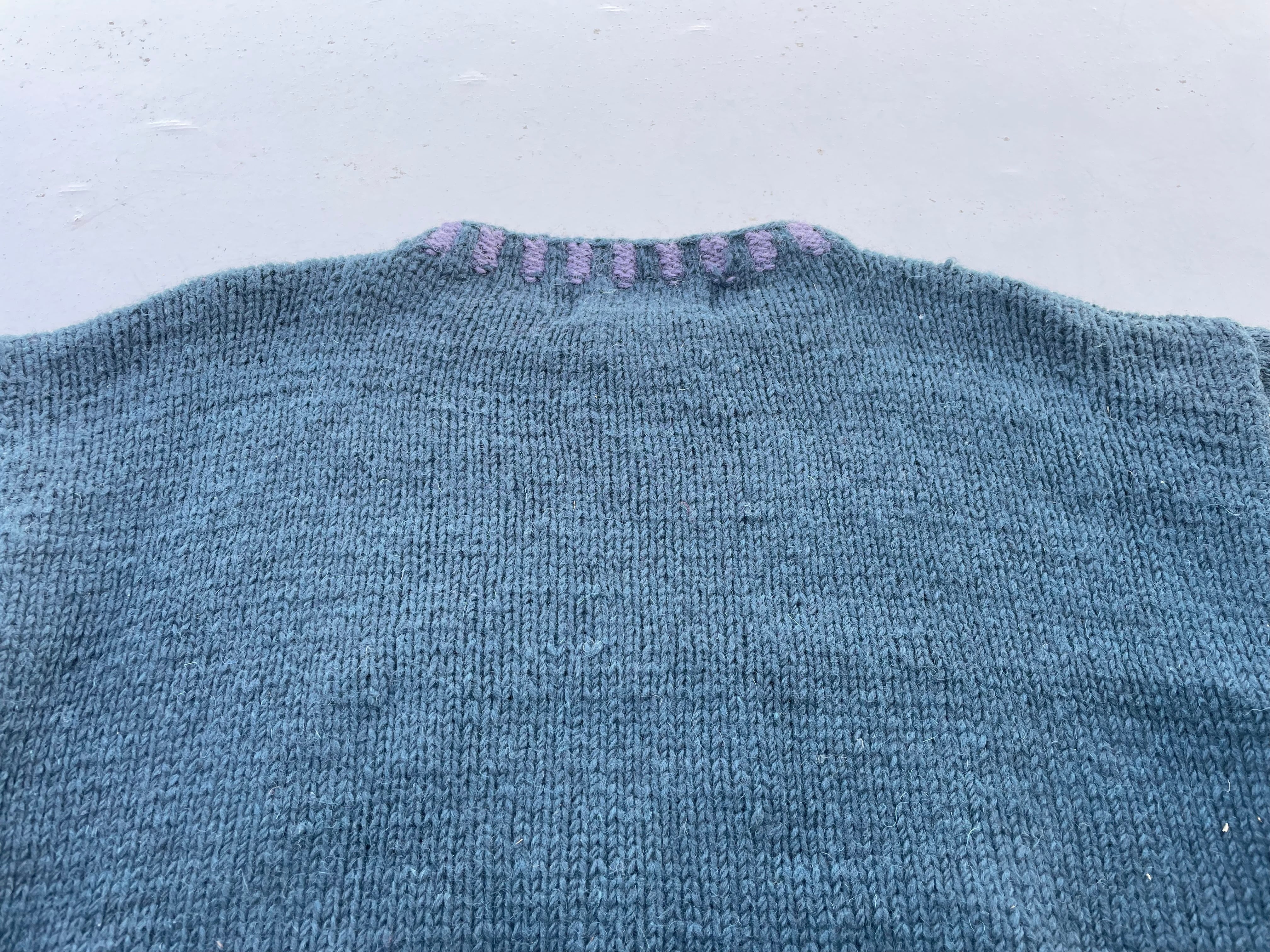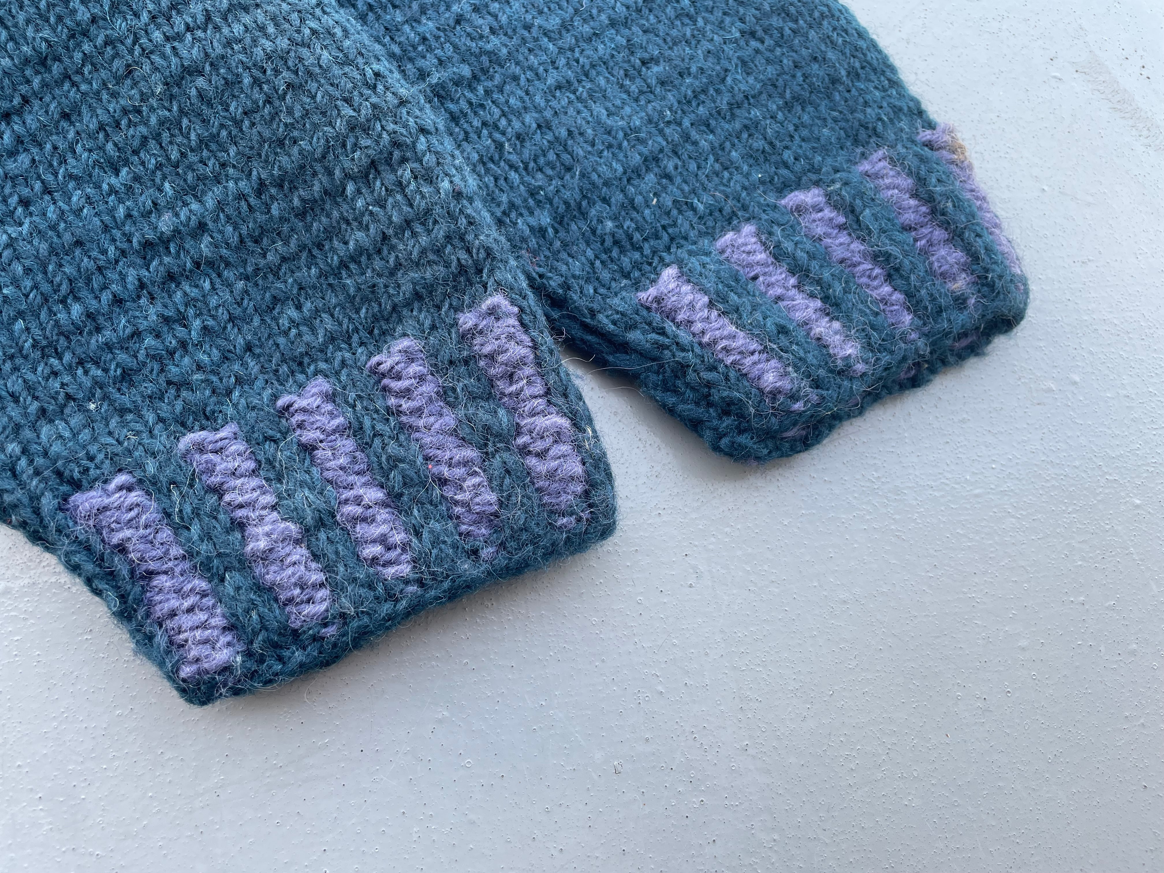 【商品詳細】GYPSY RISEのハンドニットセーター。サイズは実寸L-XL程。カラーは暗めのグリーンとブルーの中間色のような色。90年代ネパール製。グレイトフル・デッド名物キャラクターのダンシングベアがフロント中央に大胆にデザインされた珍品物。襟元・裾、袖先のデザインや全体の配色もかっこいいです。ざっくりした手編みな紡績も良い風合い◎