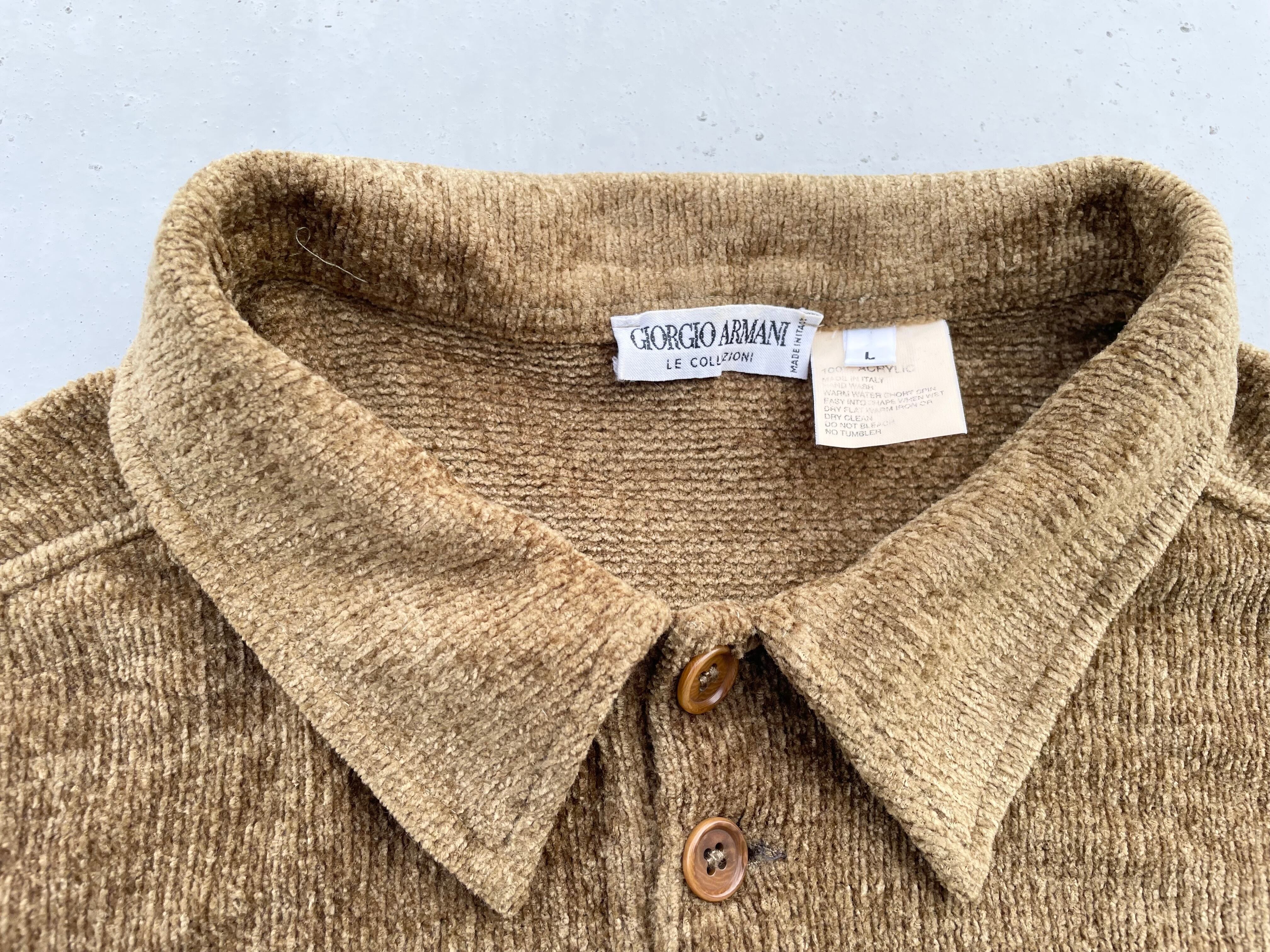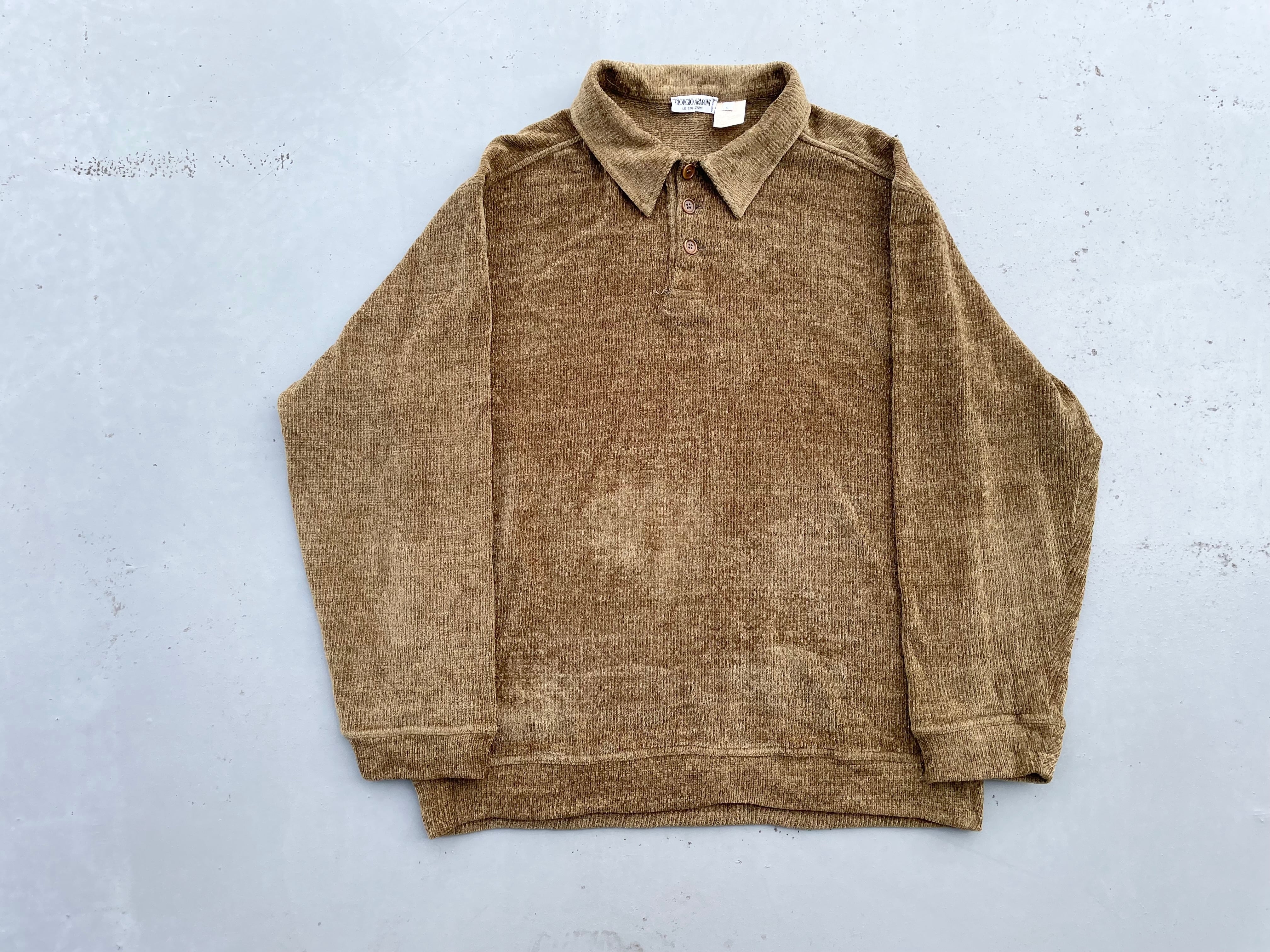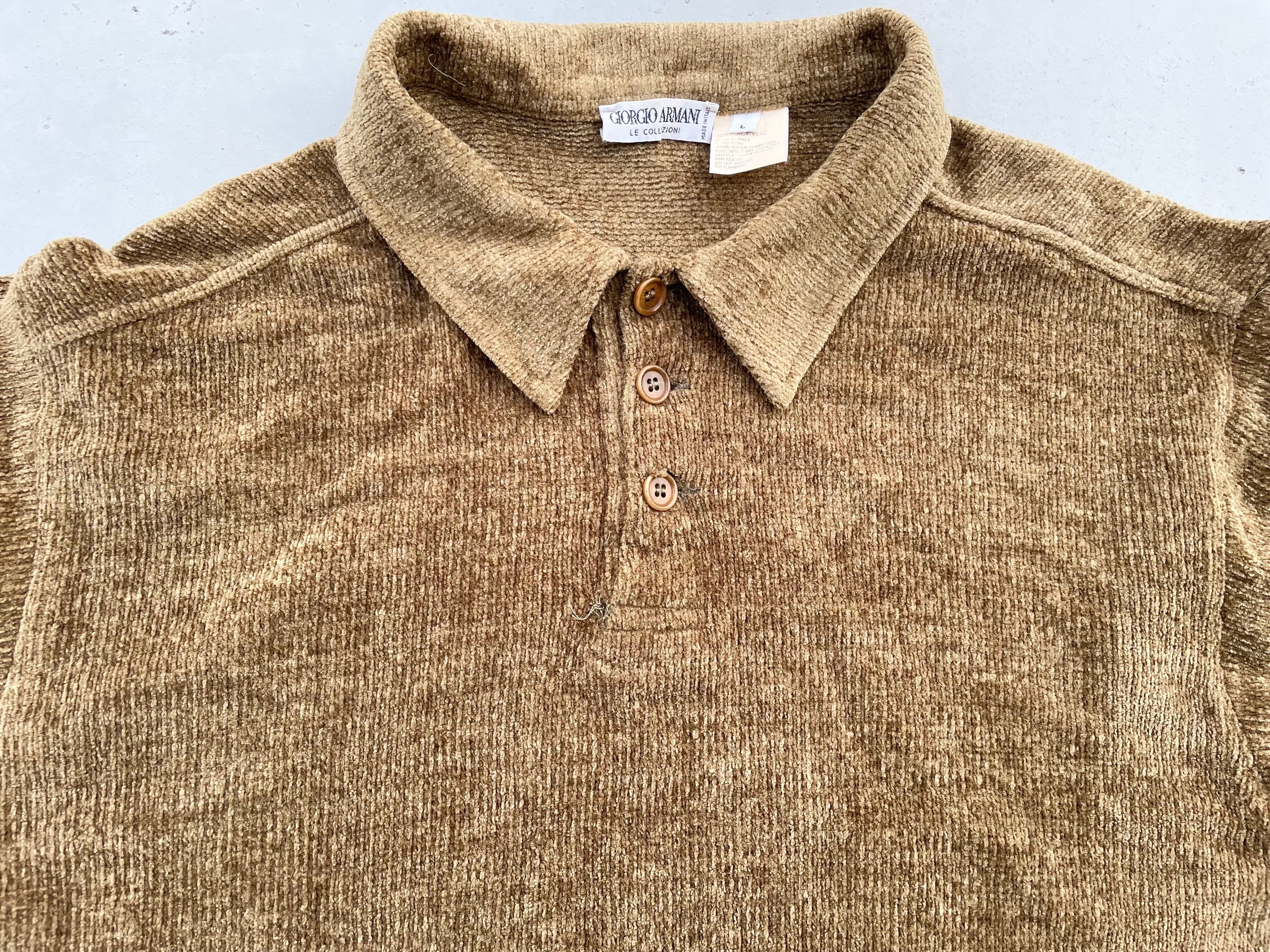 【商品詳細】ジョルジオアルマーニのプルオーバーニットポロシャツ。サイズはL。カラーはマスタードゴールド。80-90年代頃イタリア製。光沢のあるアクリル編みの表情が良い雰囲気な一着。パタゴニアカラーのシャンパンゴールドを思わせるマスタードゴールド◎