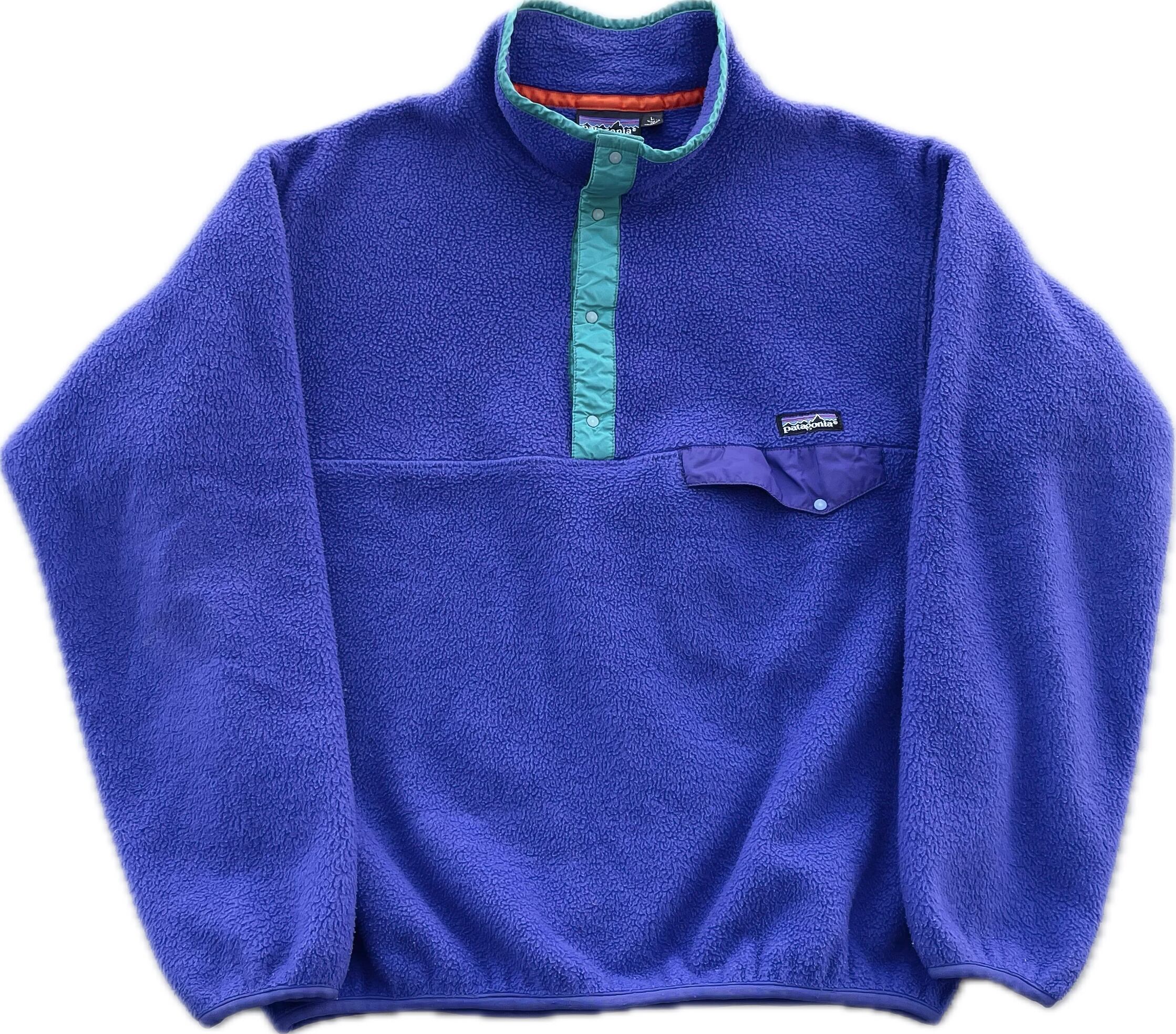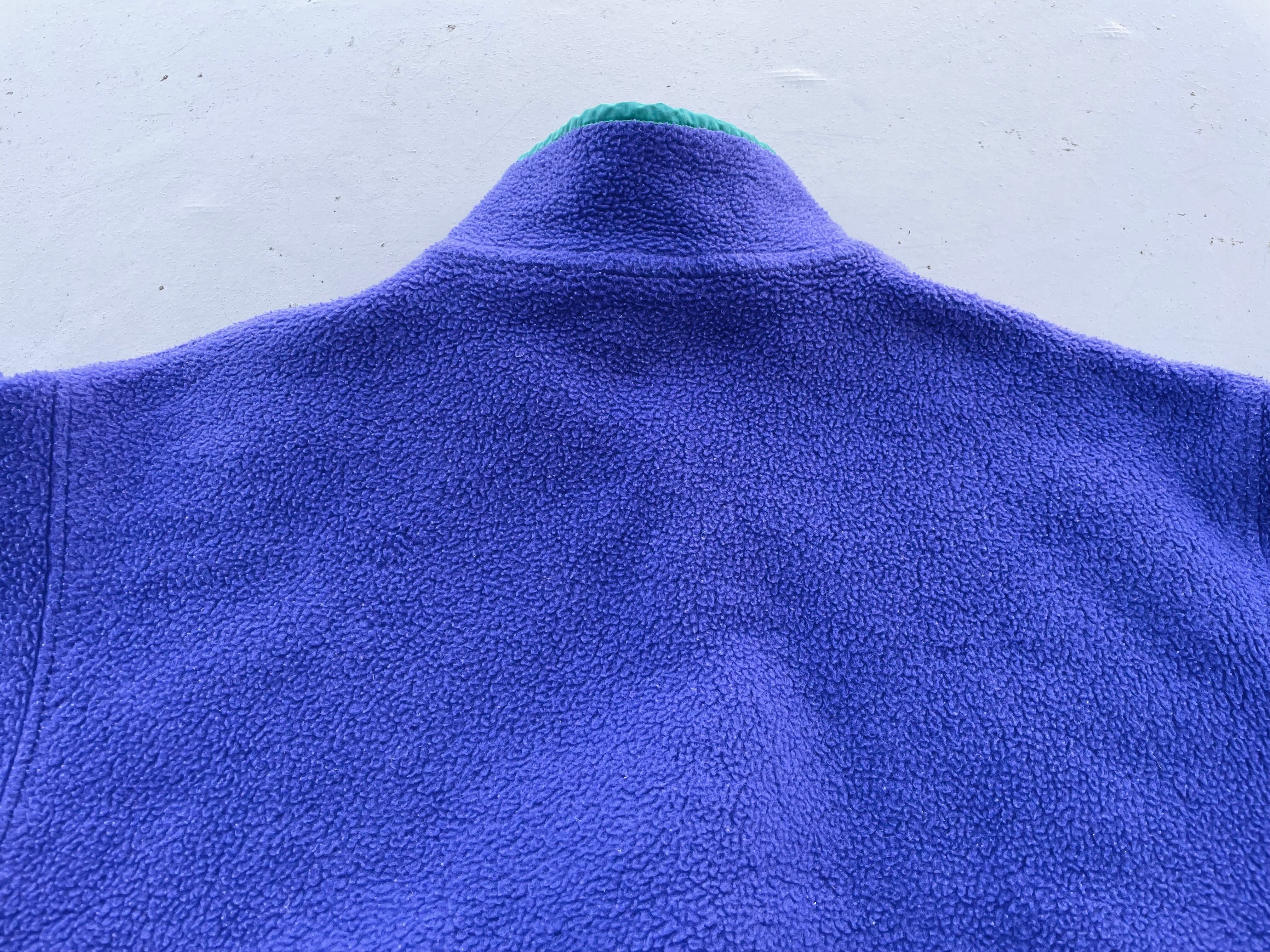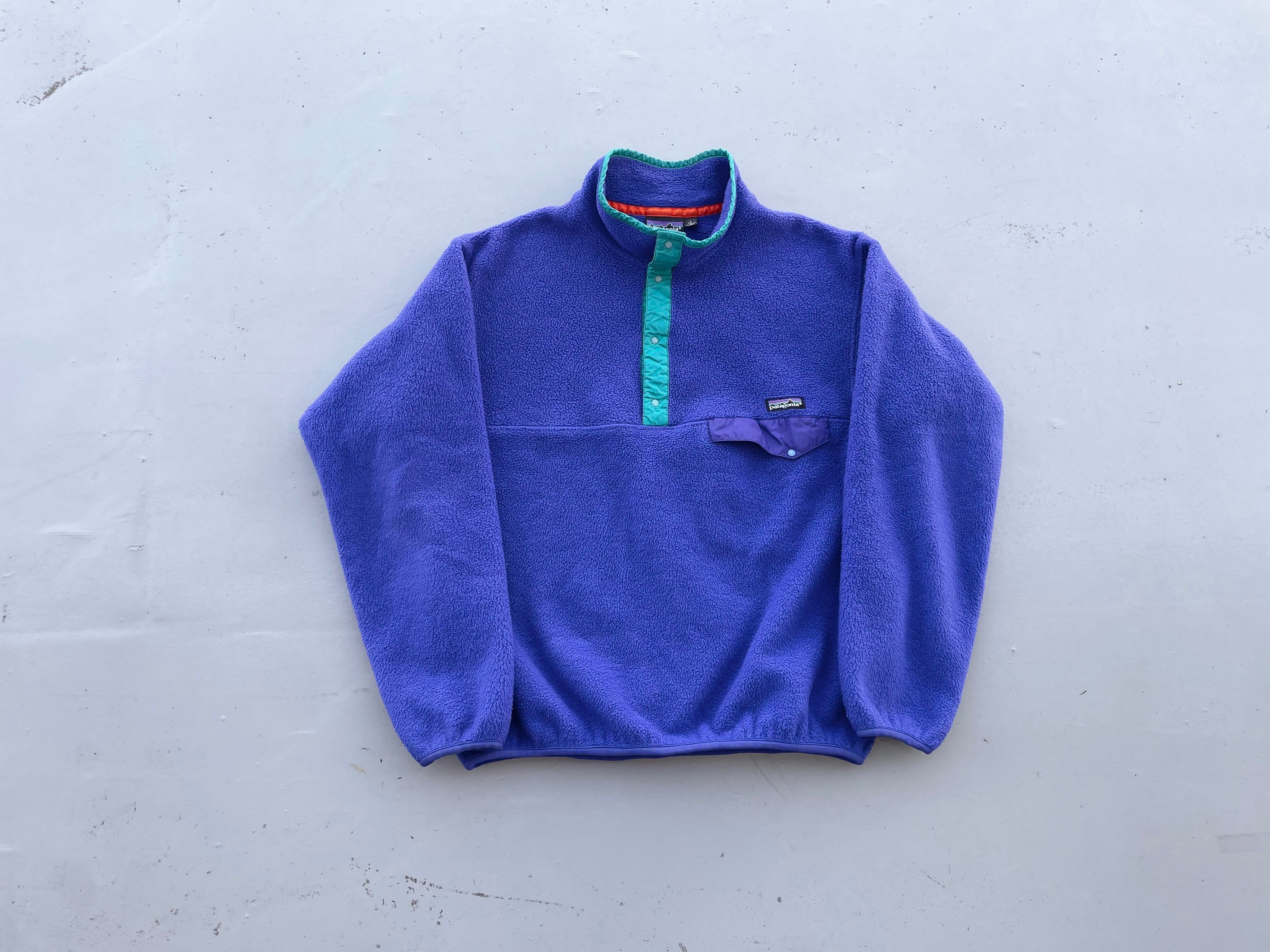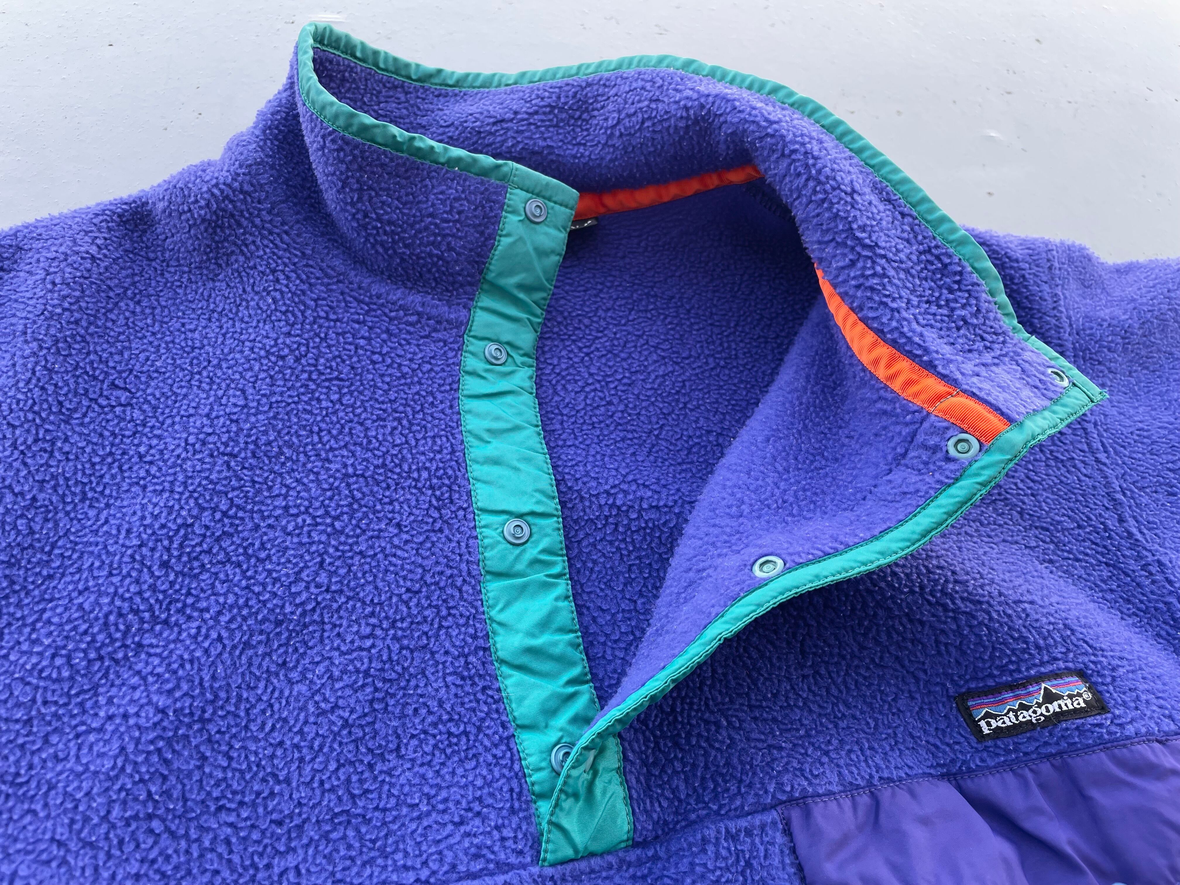 【商品詳細】パタゴニアのシンチラスナップT。サイズはL。カラーはパープルカラーのコバルト。91年ジャマイカ製。パタゴニアカラーな紫色が映えるコバルト物。肉厚なフリース地で保温性バッチリです。サイズも縮みなくしっかり大きめのディテール保ってます。年代物ですがフリース地にはフカフカみがあり比較的良好なコンディションかと。