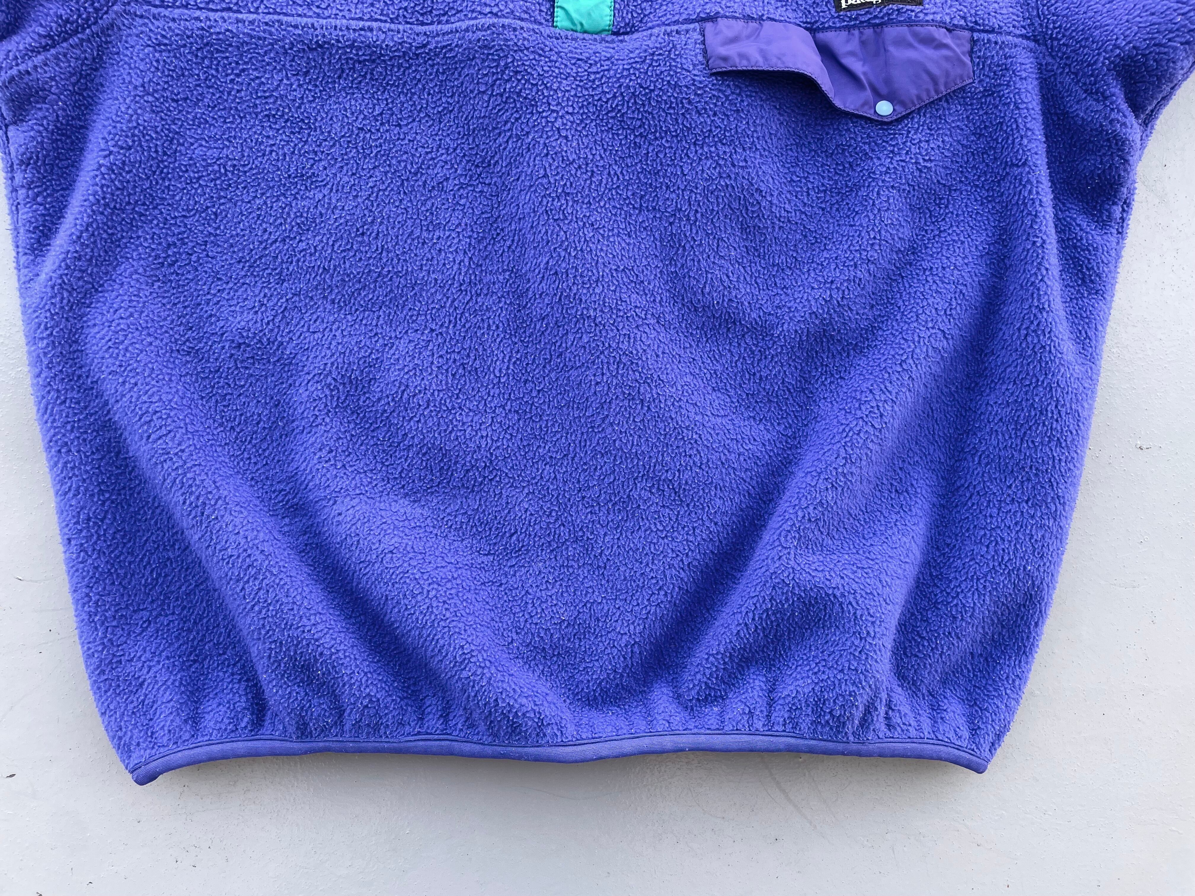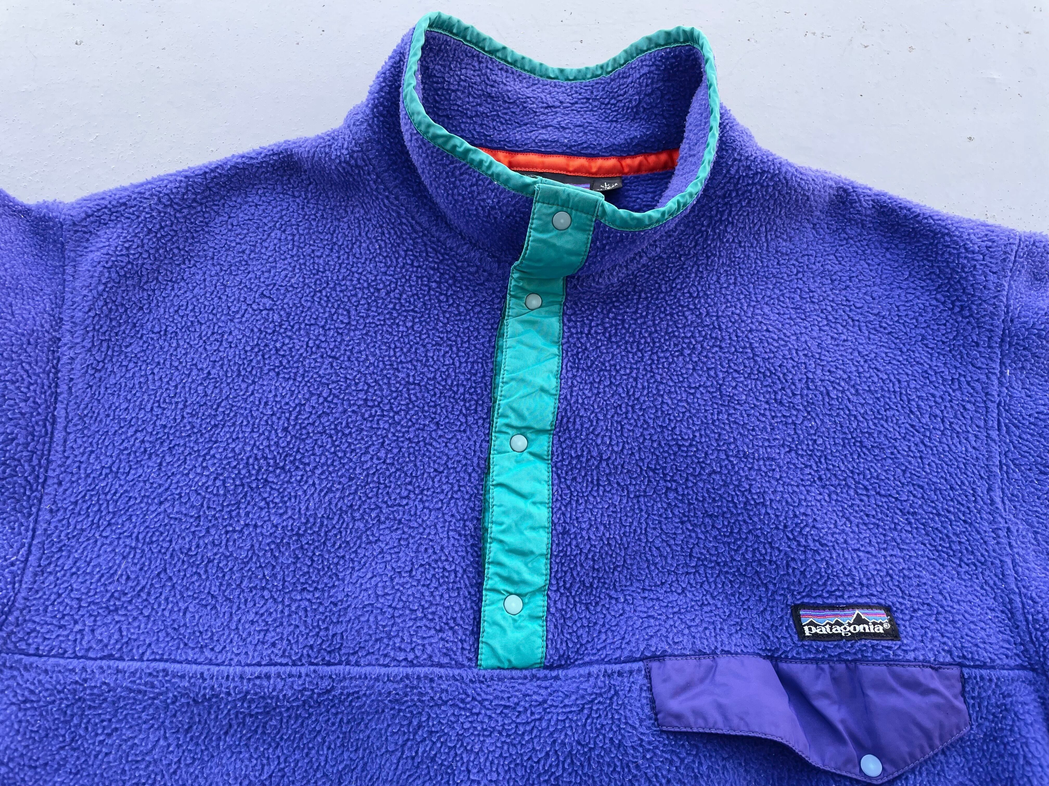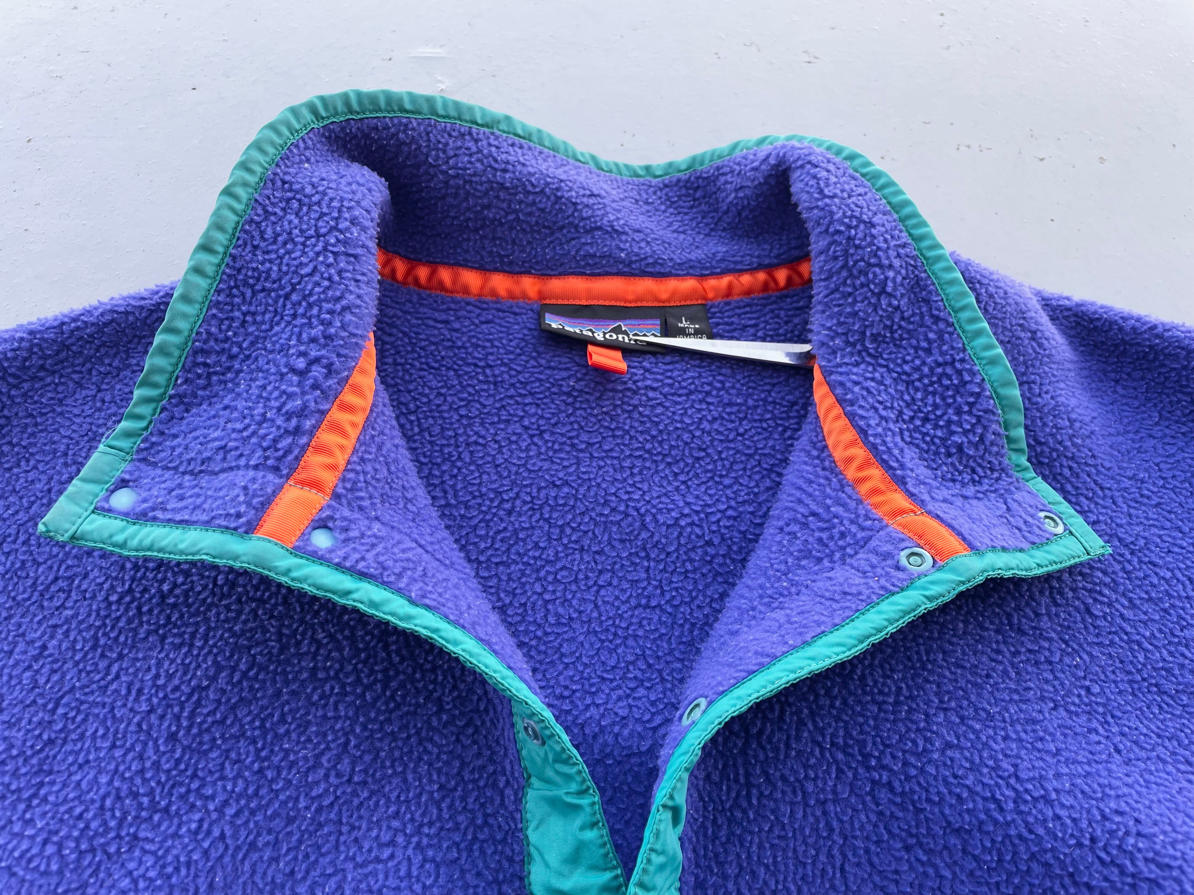 【商品詳細】パタゴニアのシンチラスナップT。サイズはL。カラーはパープルカラーのコバルト。91年ジャマイカ製。パタゴニアカラーな紫色が映えるコバルト物。肉厚なフリース地で保温性バッチリです。サイズも縮みなくしっかり大きめのディテール保ってます。年代物ですがフリース地にはフカフカみがあり比較的良好なコンディションかと。