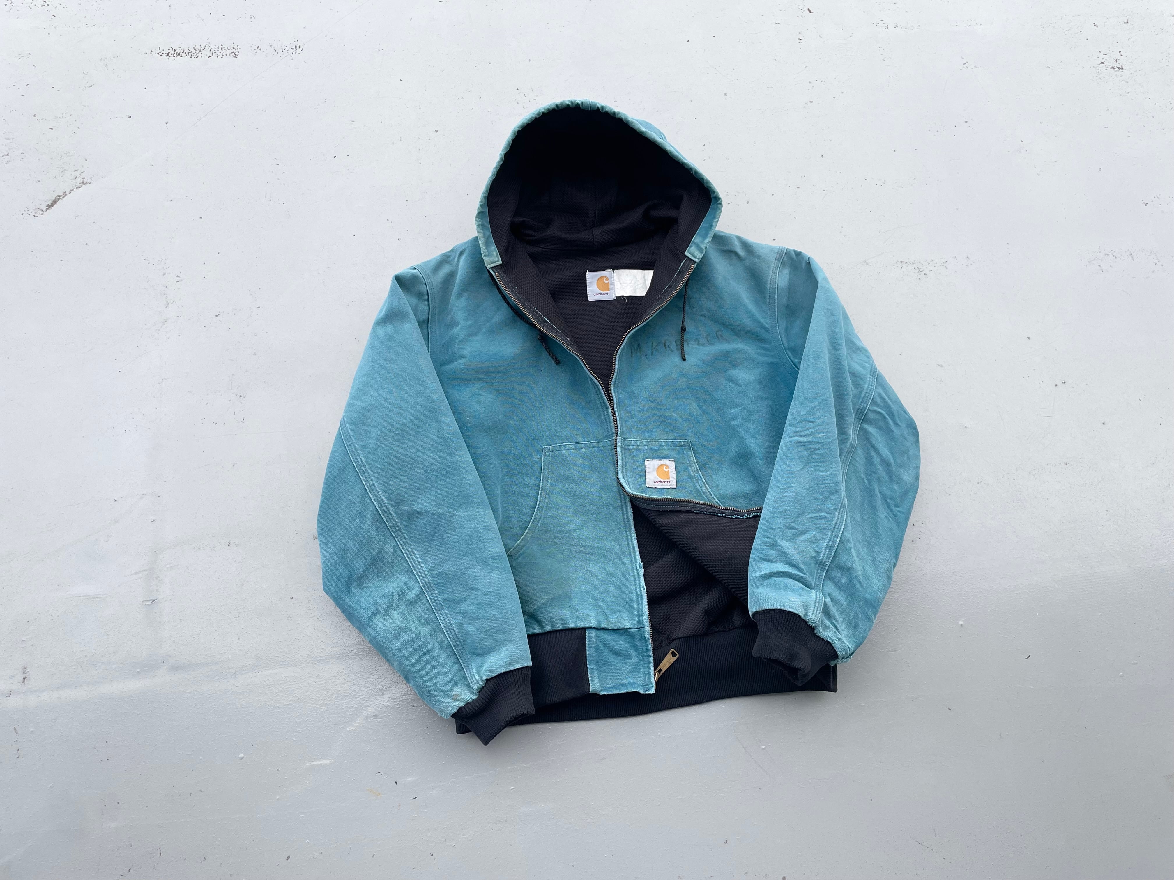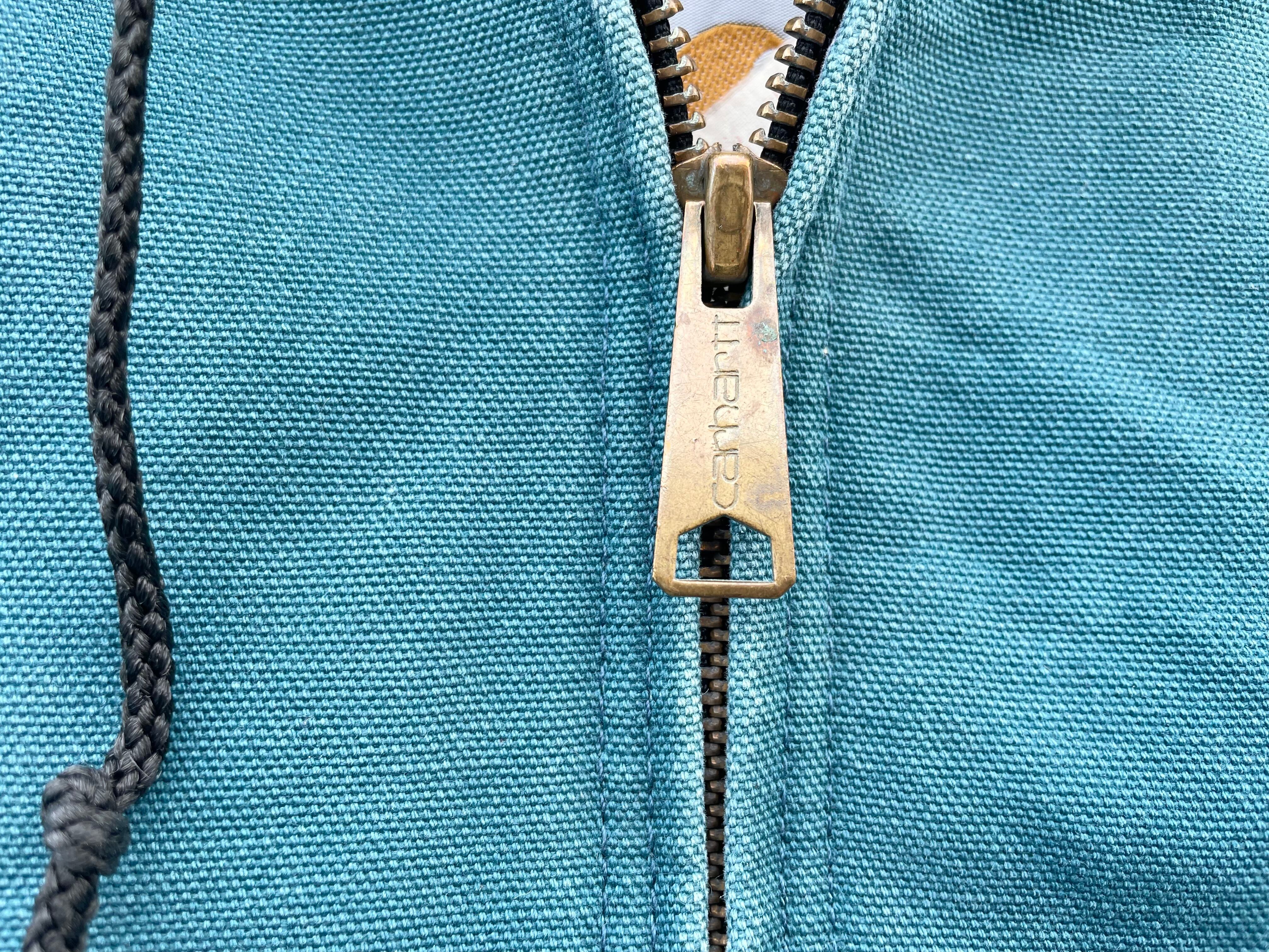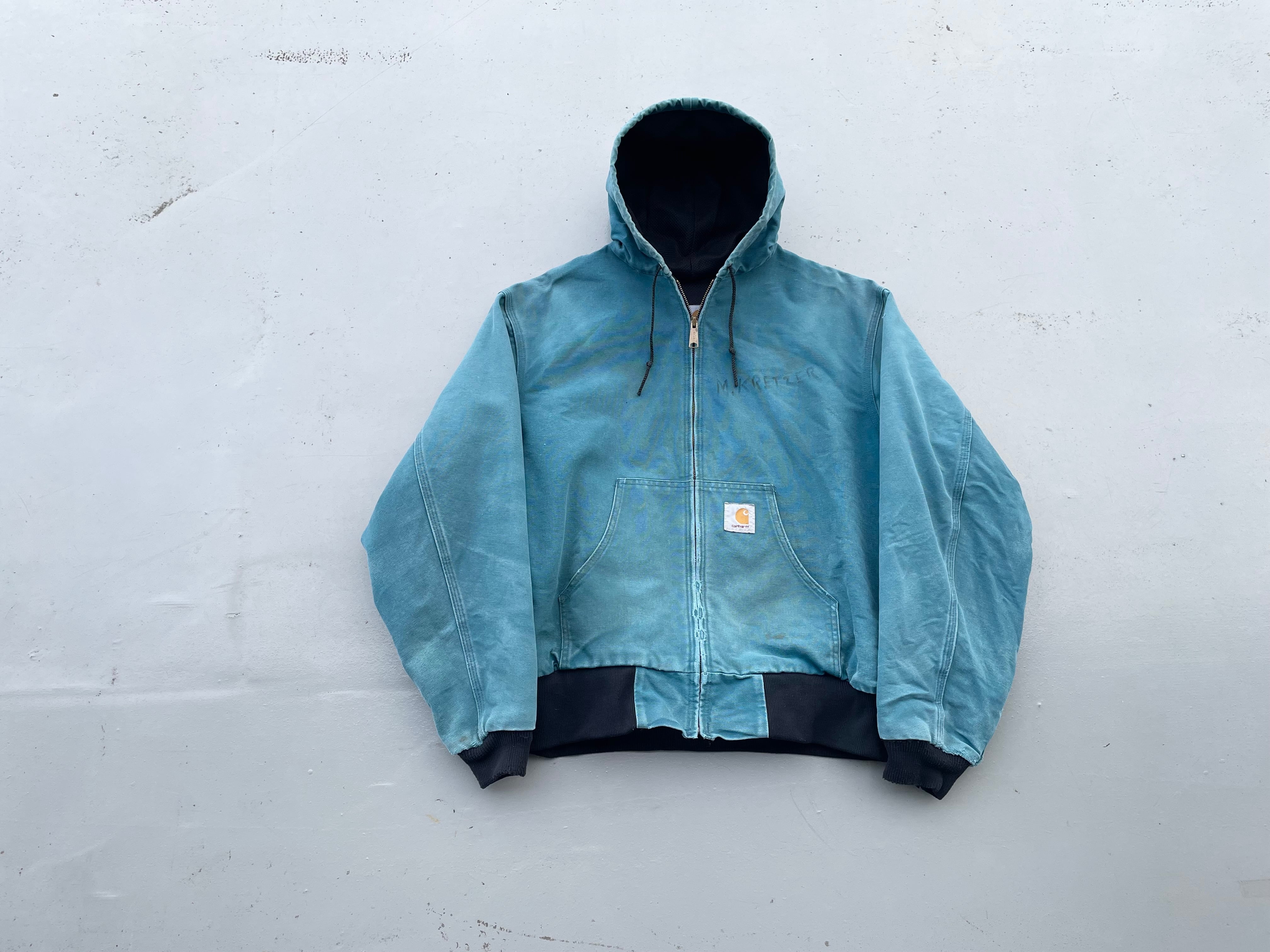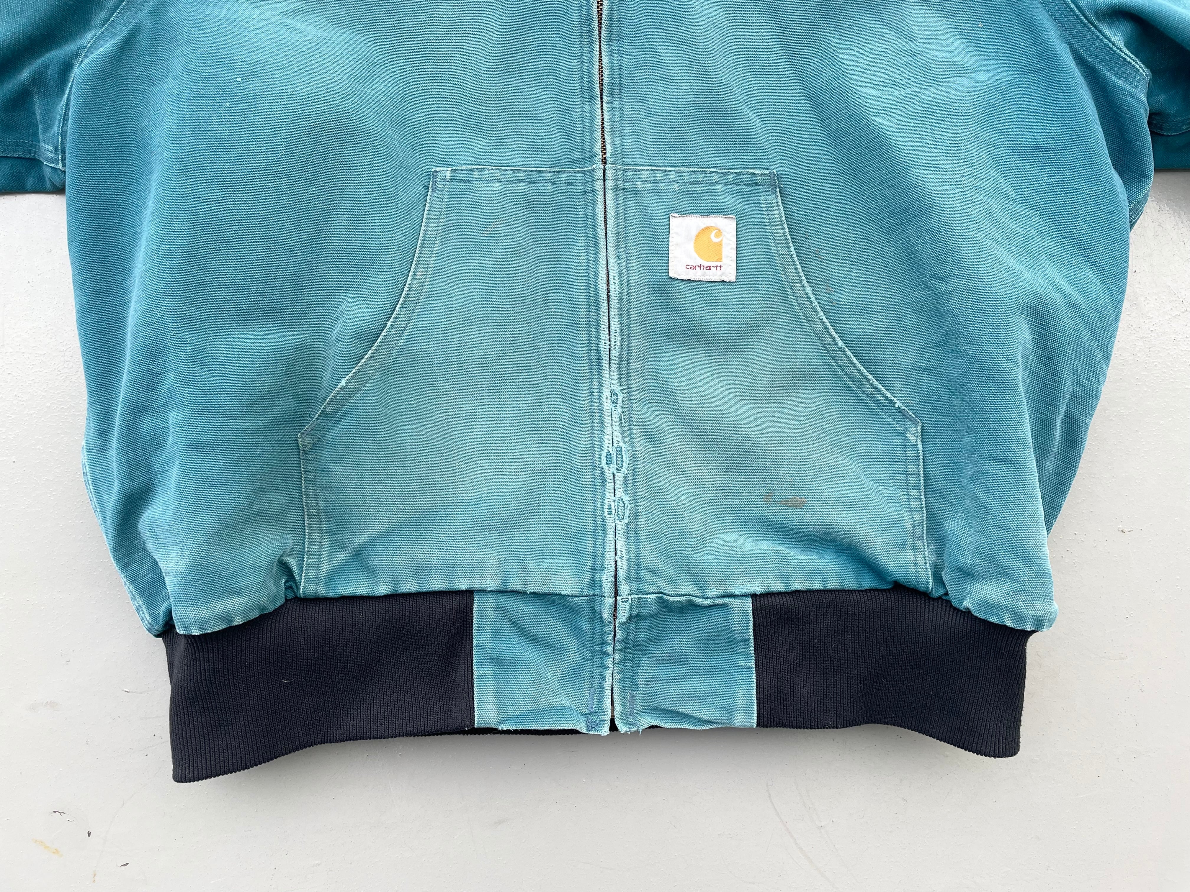 【商品詳細】カーハートのアクティブジャケット。サイズはXL。カラーはターコイズ。80-90年代頃USA製。人気のターコイズカラー物。ダック特有のフェード感が良い雰囲気出てます。袖にはハチノスもありこれも良い感じです。裏サーマルで春以降も活躍しそうです。
