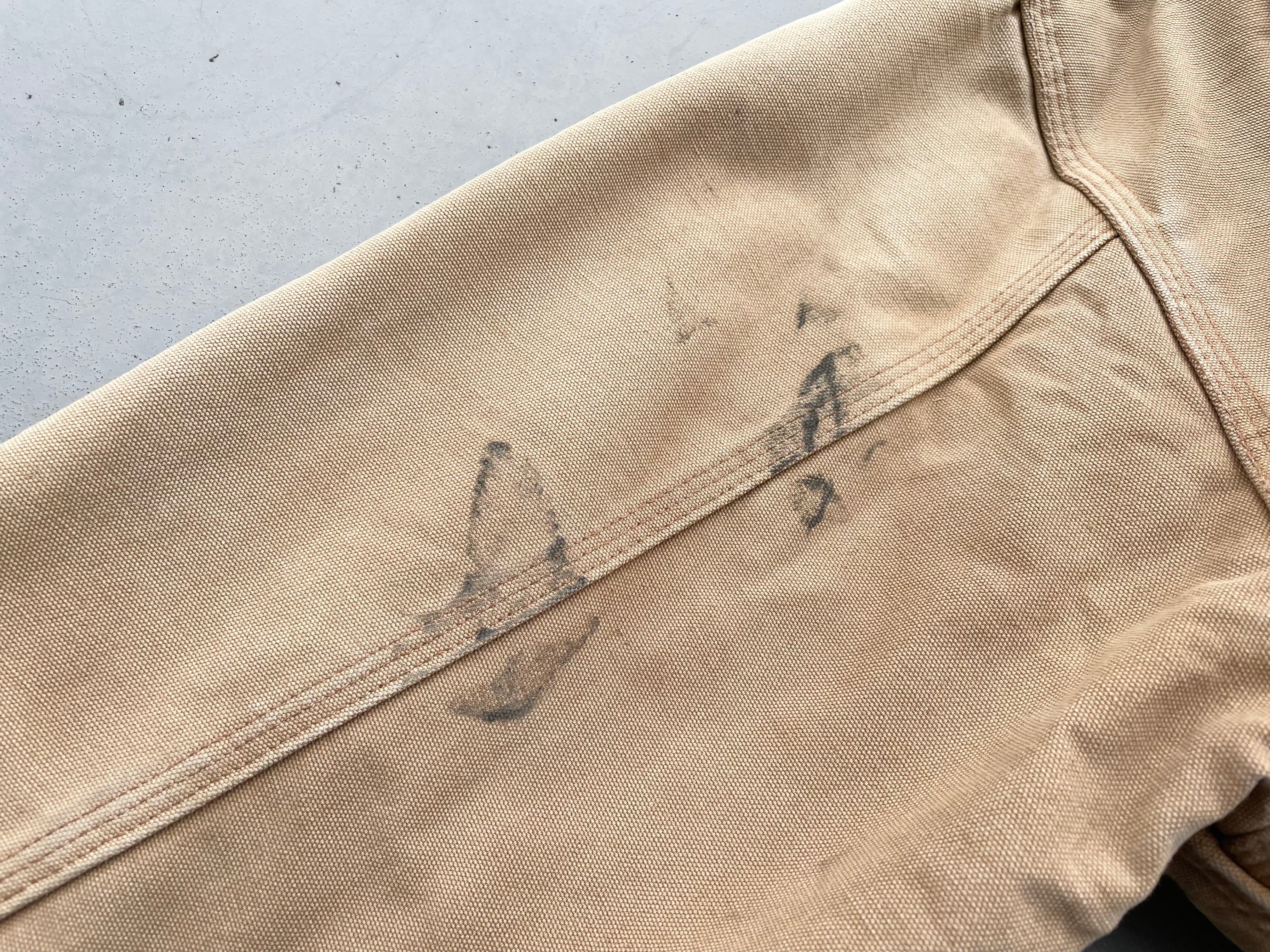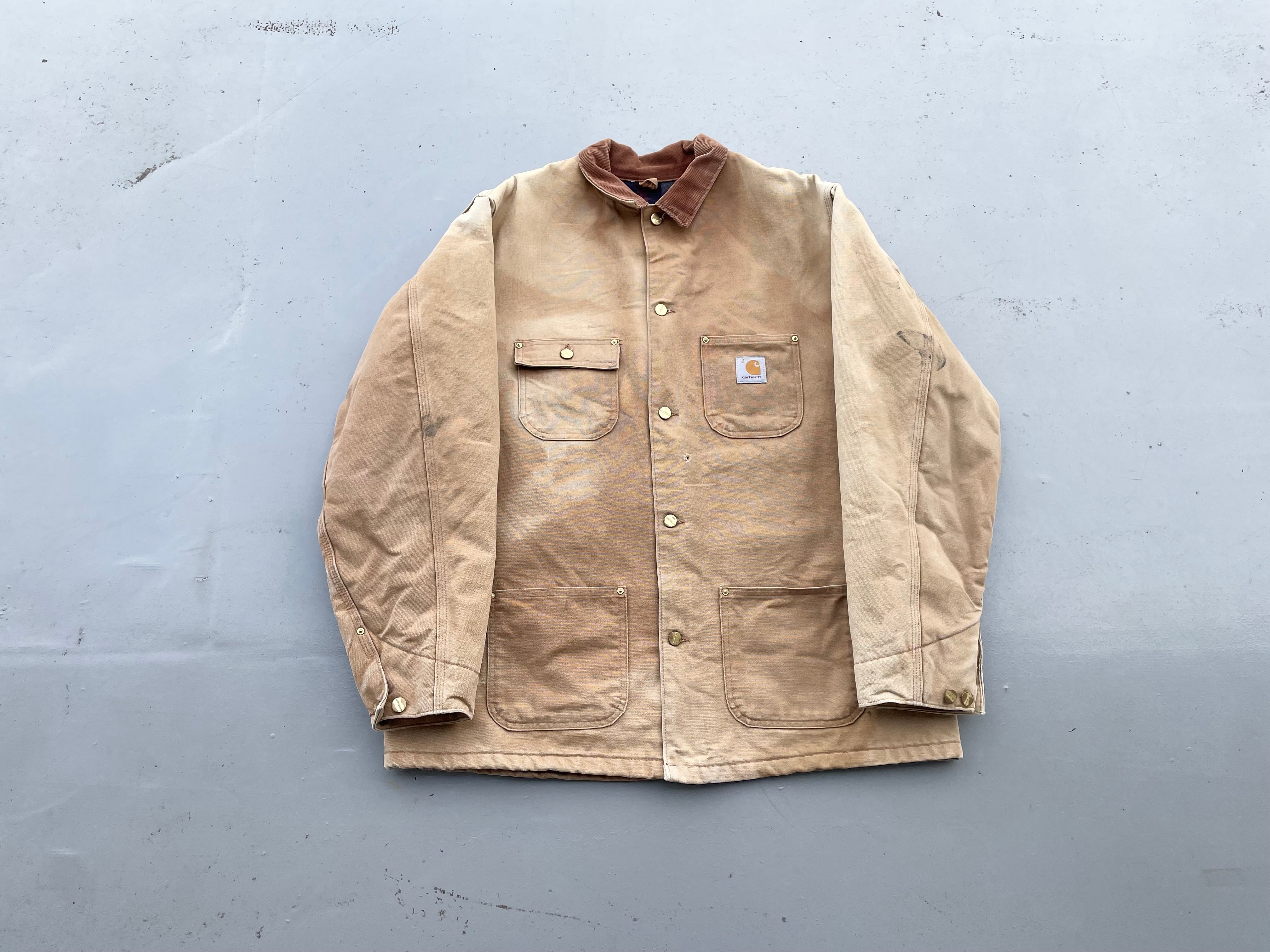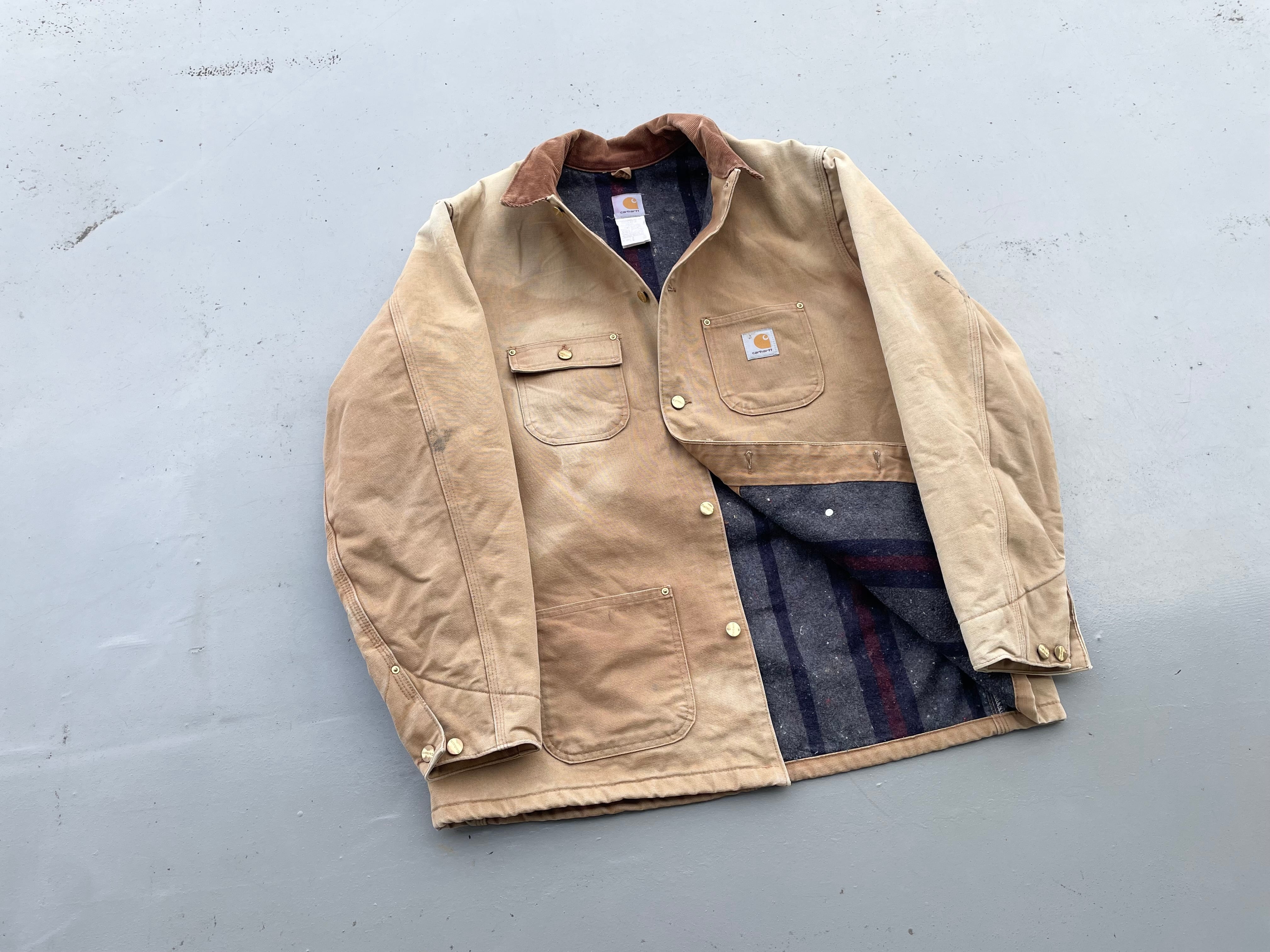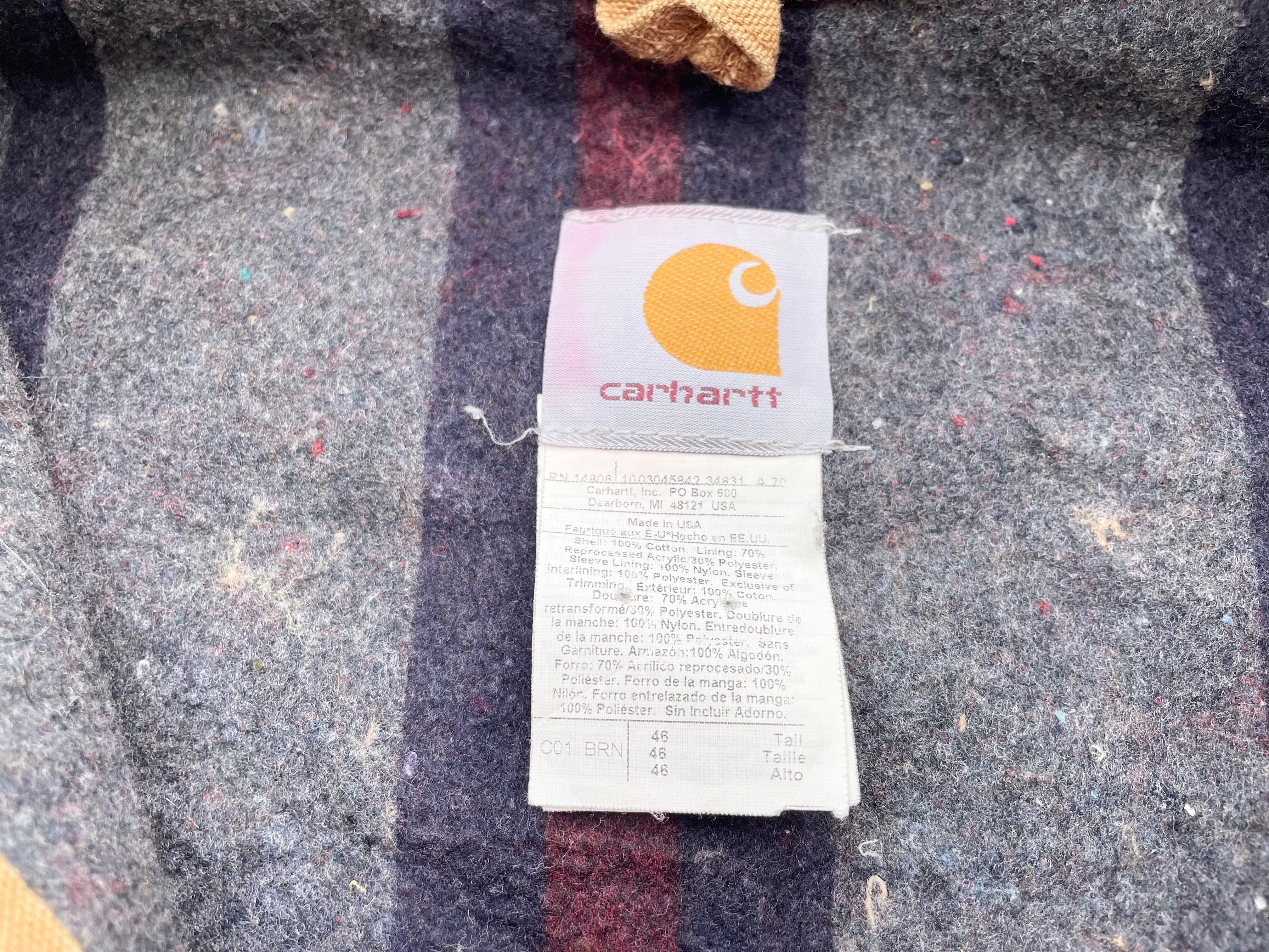 【商品詳細】カーハートのミシガンチョアコート。サイズは46。カラーはブラウン。03年USA製。カーハート定番モデルのミシガンチョアコート。ど真ん中カラーのブラウン。良い塩梅に使用感や汚れ等あり雰囲気あります。裏地ブランケット仕様で今時期活躍しそうです。