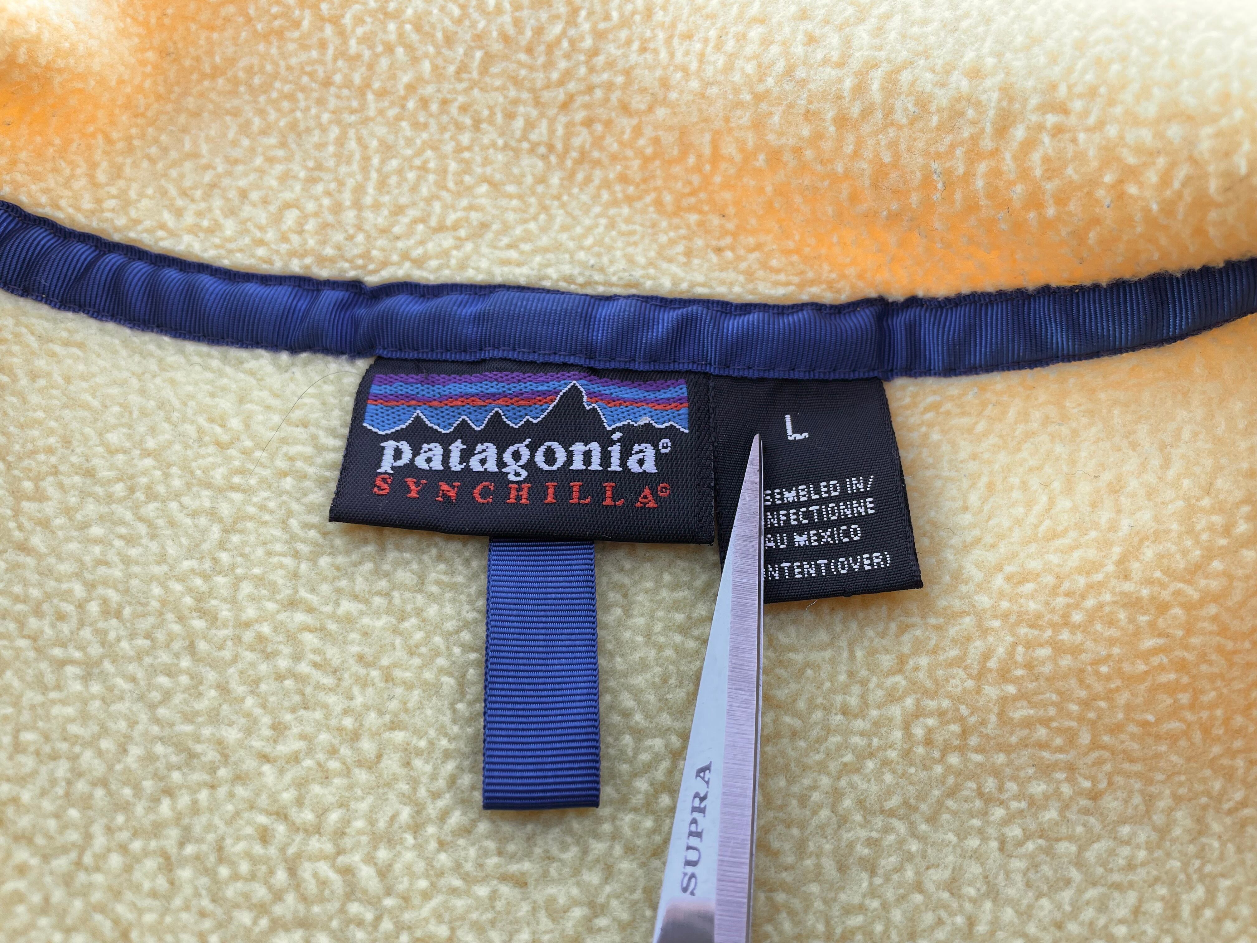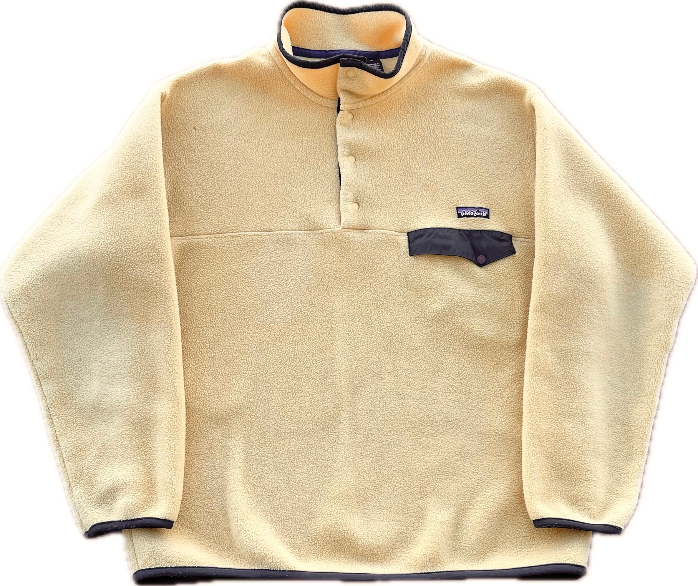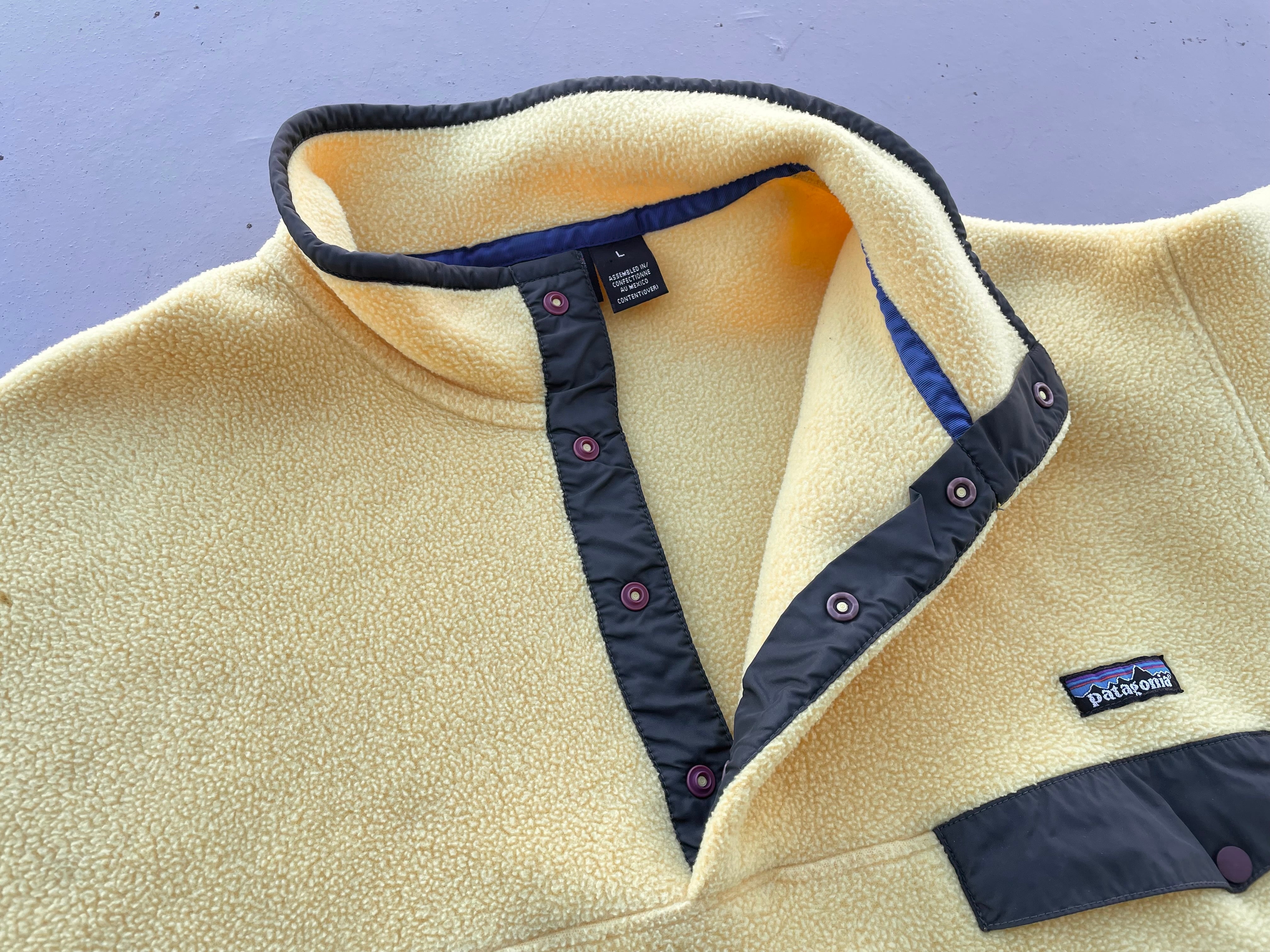 【商品詳細】パタゴニアのシンチラスナップT。サイズはL。カラーはポルーンイエロー。00年メキシコ製。ブラックに並んで人気の高いイエロー物。霞んだイエローカラーにブラックカラーのパイピング・ナイロン面が大人な一着。一部箇所にフリース抜けはございますが全体的なフリース地はフカフカでコンディションの良い一着です。