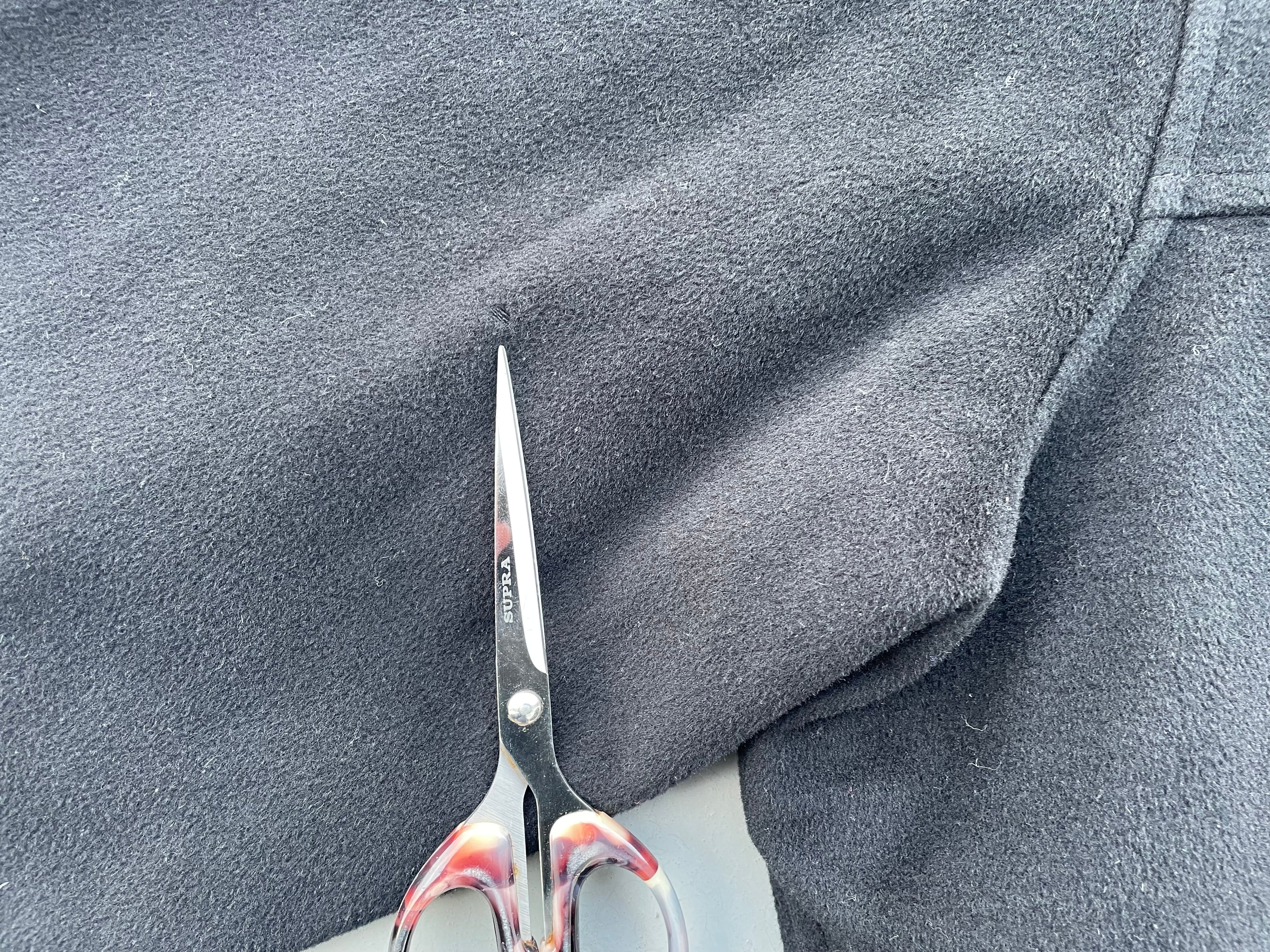 ・右袖脇付近(写真10・11枚目)、右袖先裏付近(写真12・13枚目)毛抜け