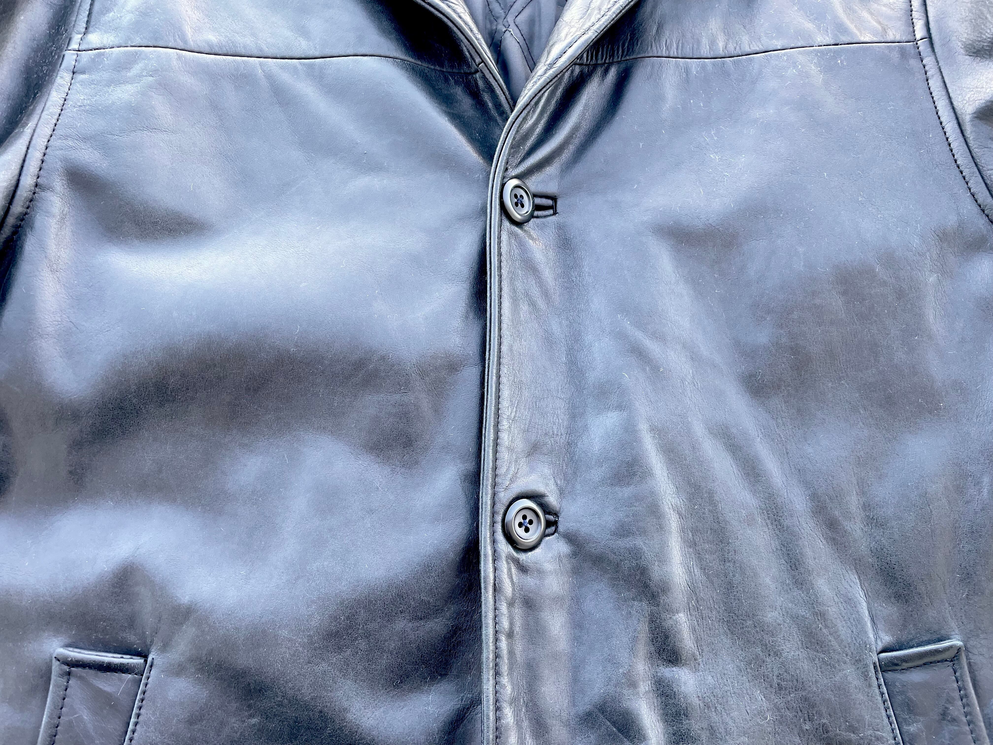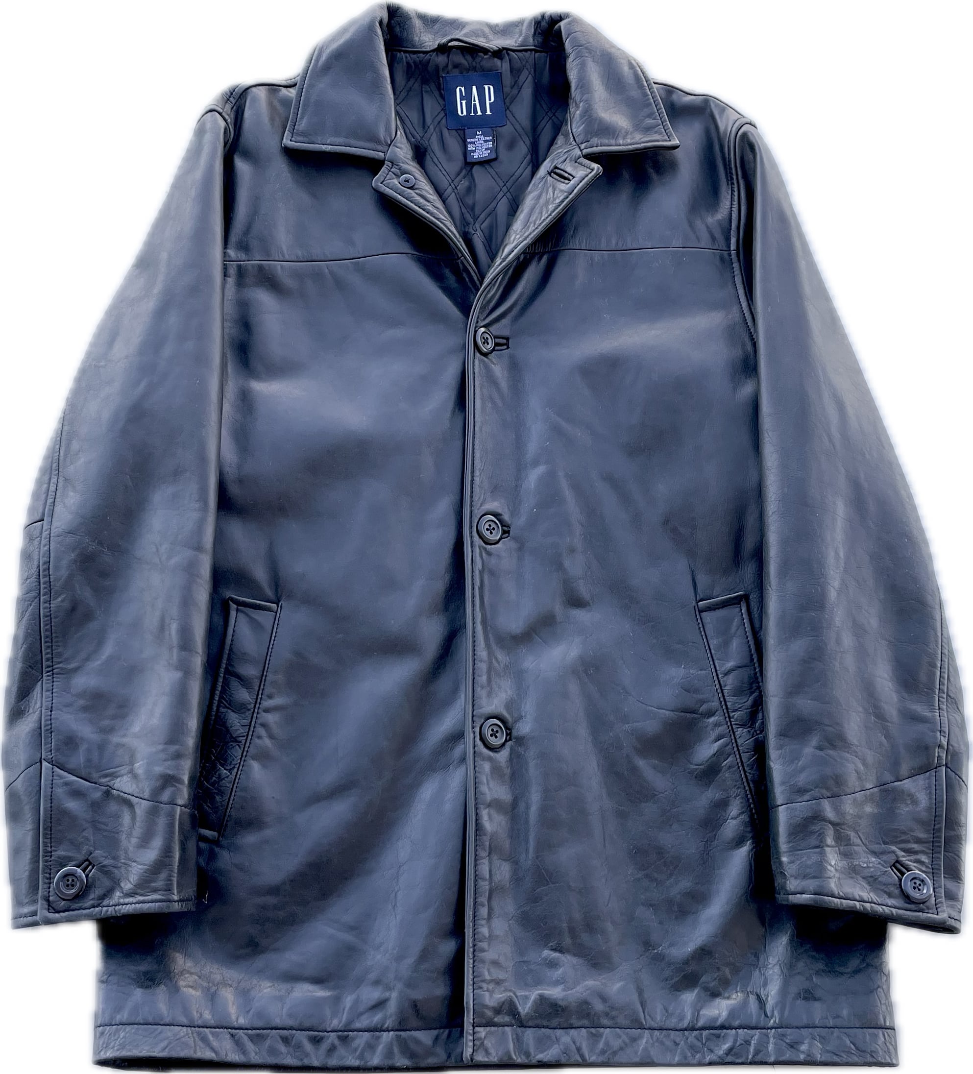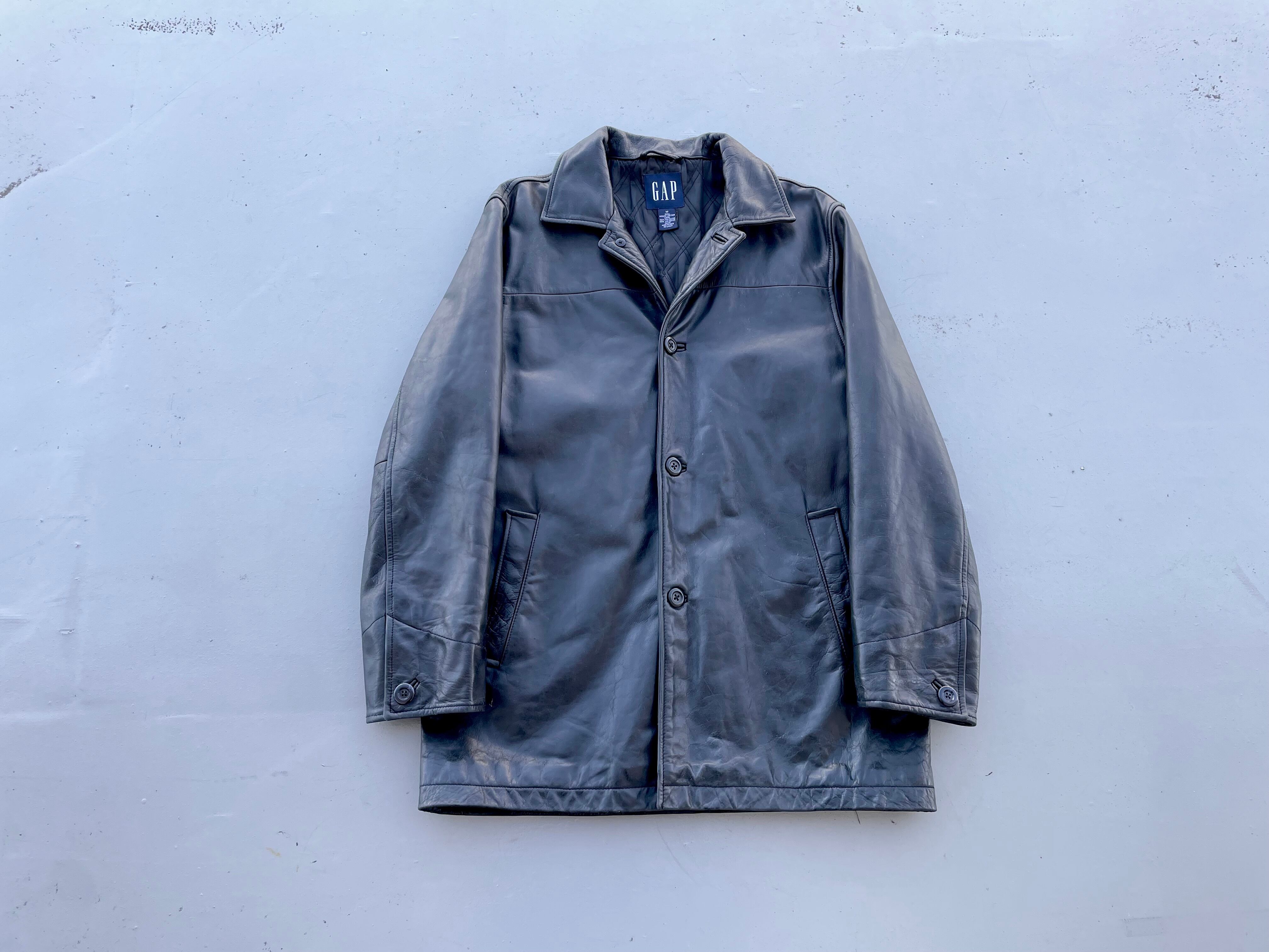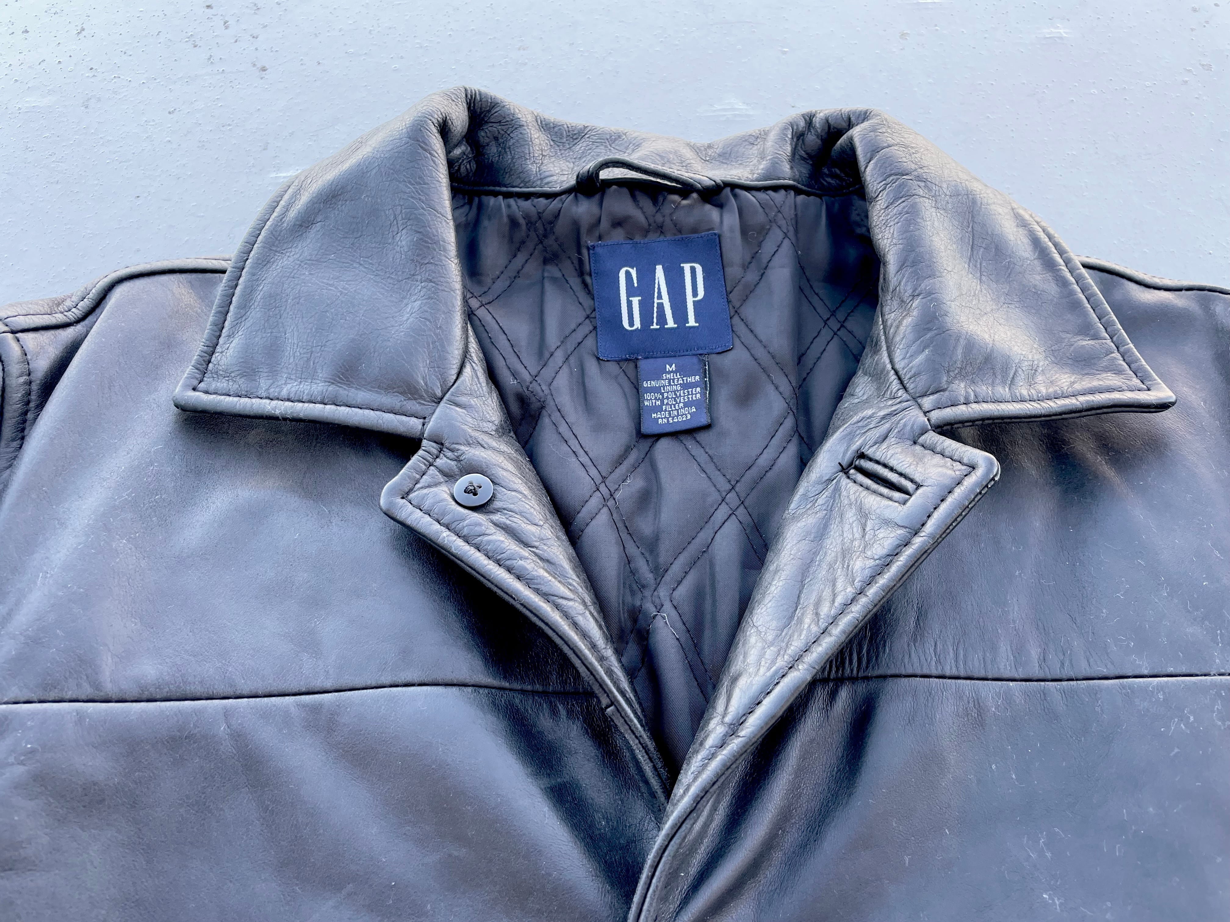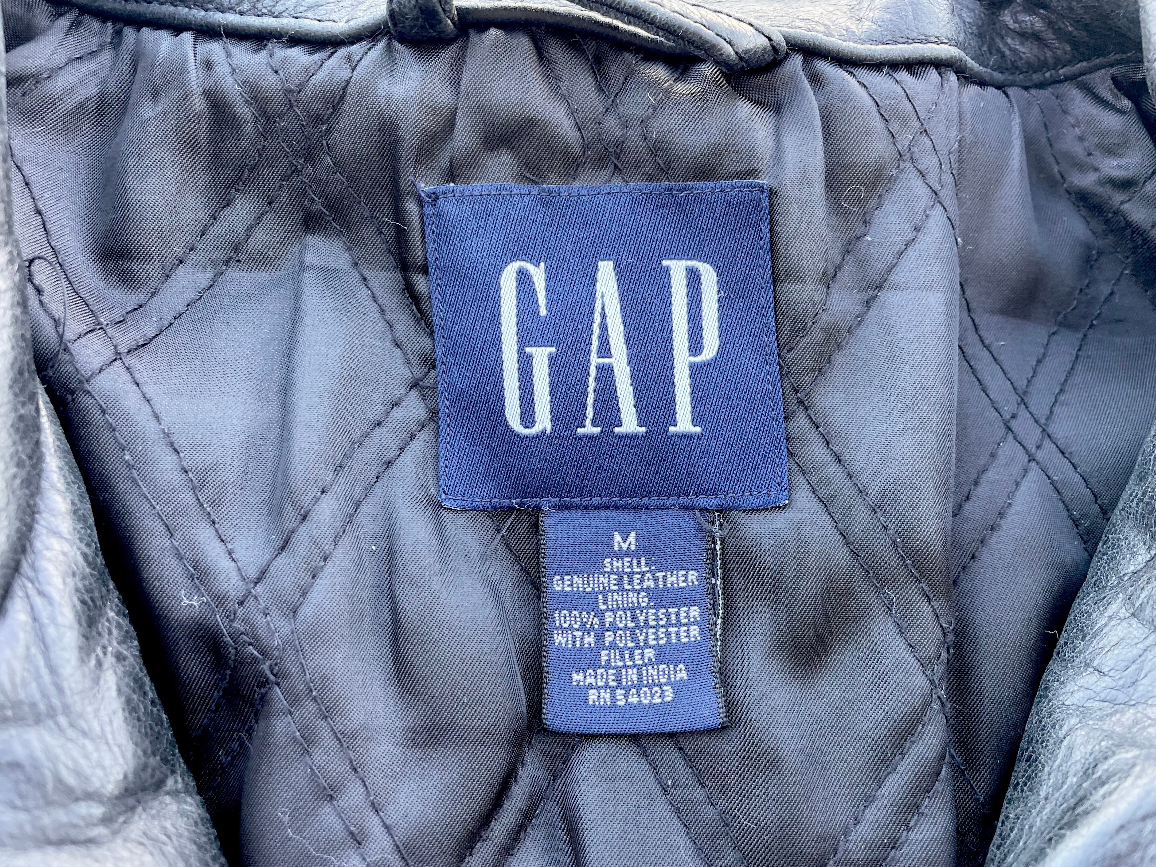 【商品詳細】ギャップのレザーカーコート。サイズはM。カラーはブラック。90-00年代インド製。ギャップのレザー物の中でも特に人気の高いカーコート。多少の経年劣化はございますが目立った傷や穴などなく前線で活躍する個体かと。