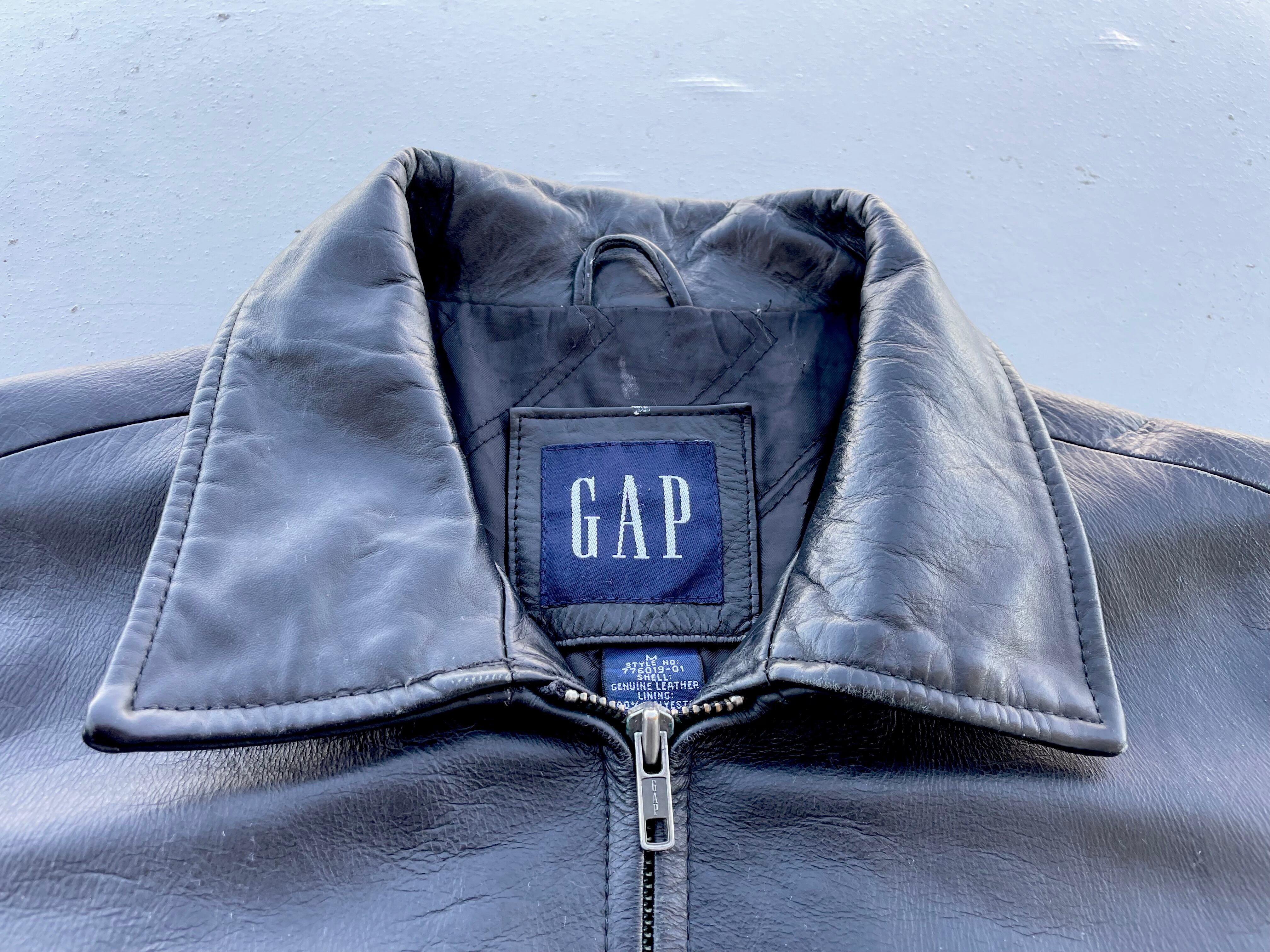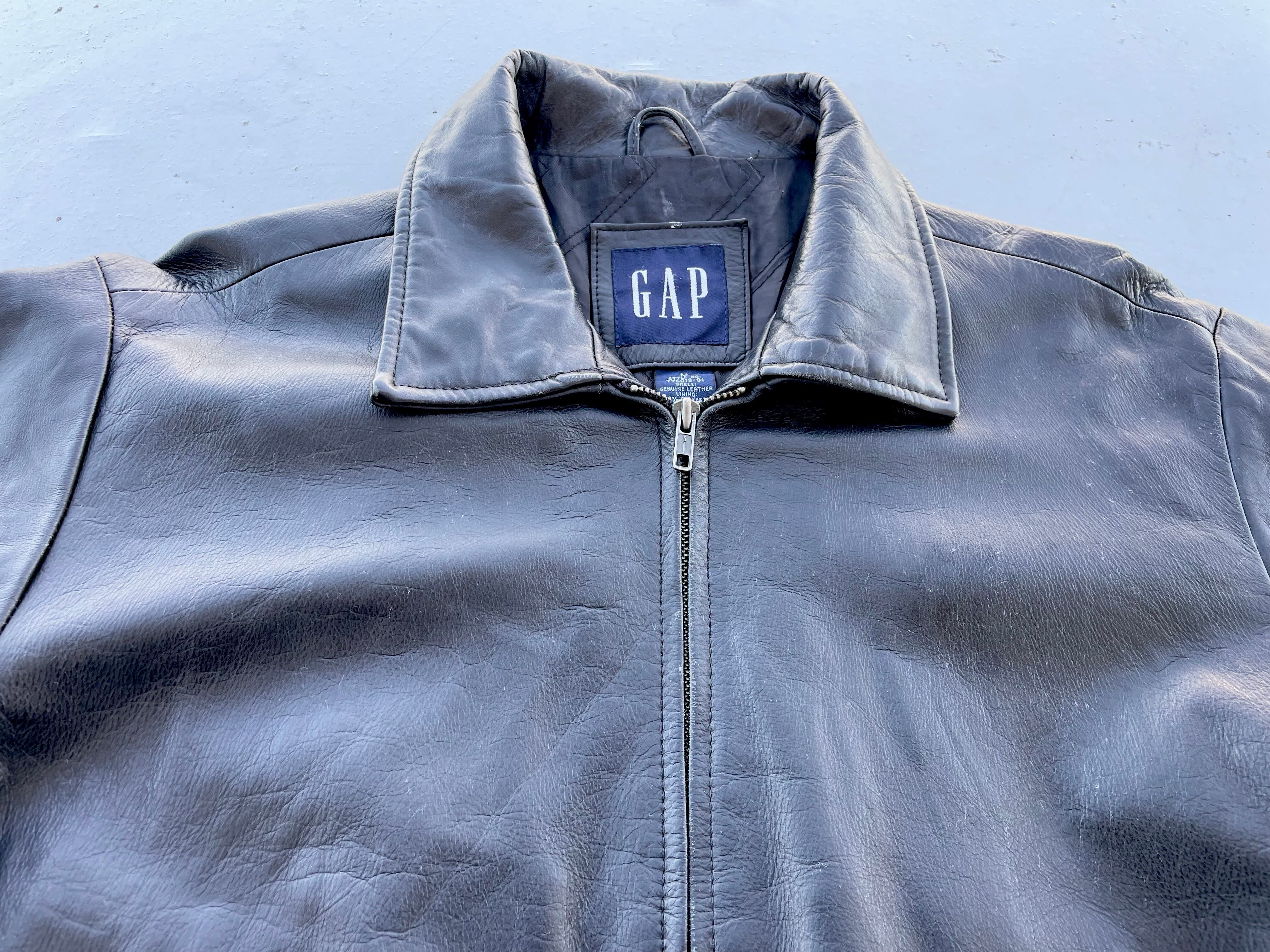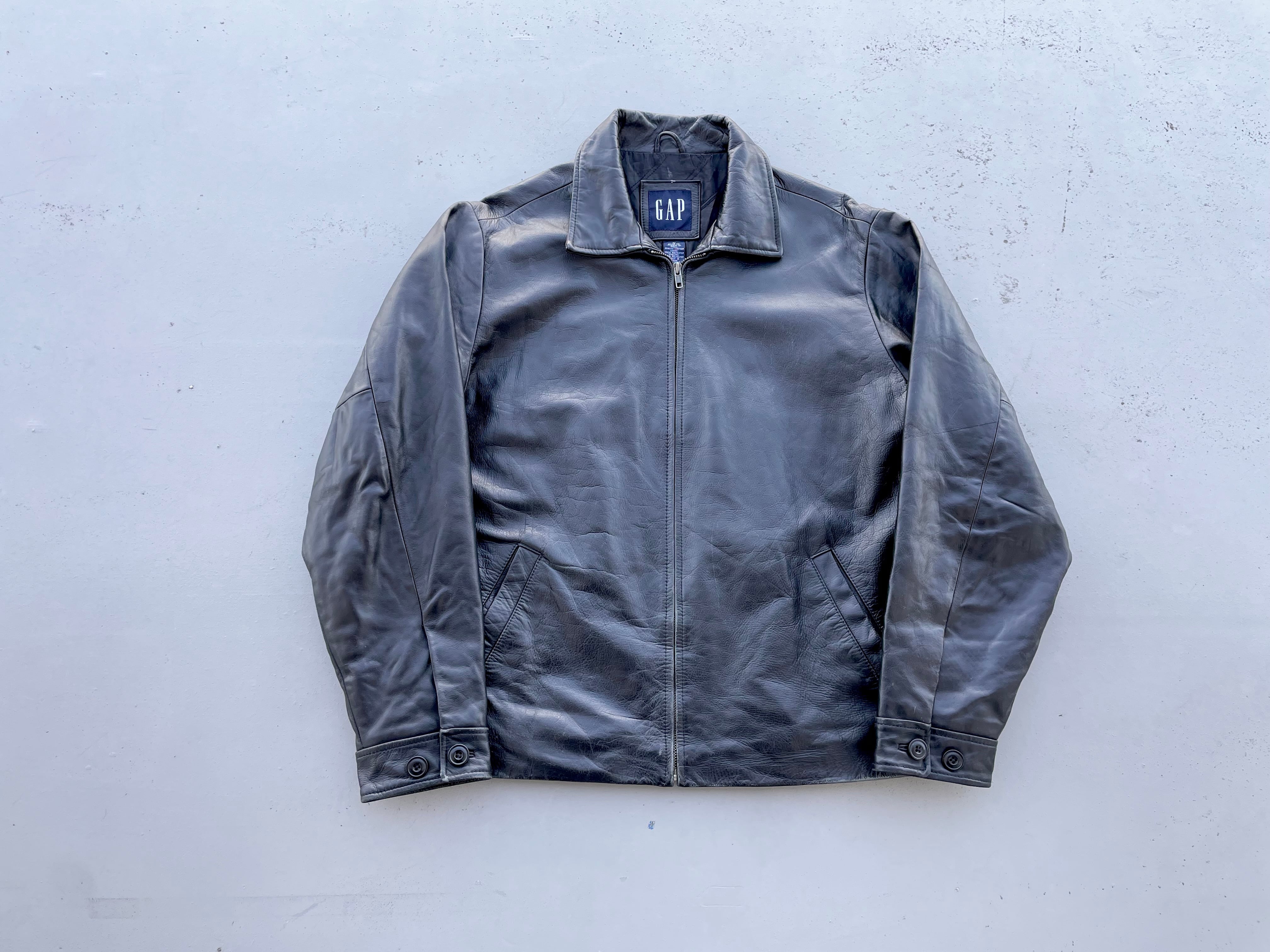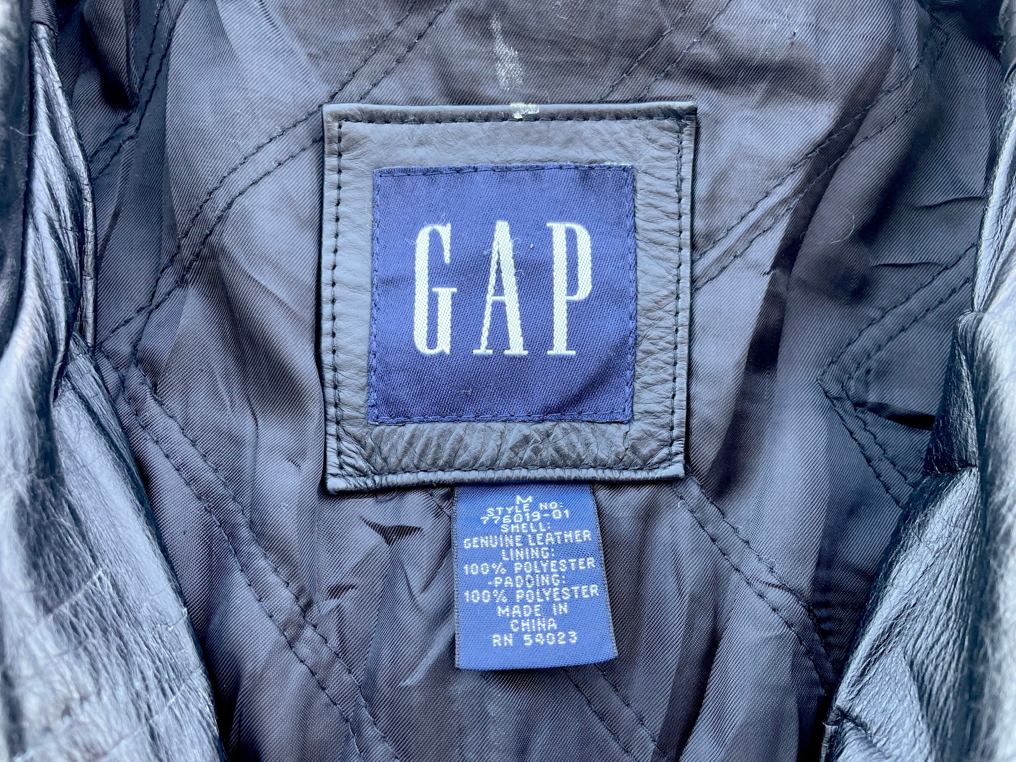 【商品詳細】ギャップのシングルレザージャケット。サイズはM。カラーはブラック。01年代中国製。ギャップ定番モデルのスポーツジャケットタイプのレザージャケット。ソリッドな装いで人気の高い一着。カウレザー+中綿仕様で一着でしっかり暖かいです。多少の使用感や傷はございますが、全体で見ると良い塩梅の経年劣化で雰囲気あります。他気になる傷や穴、レザー硬化等なく前線で活躍する個体かと。