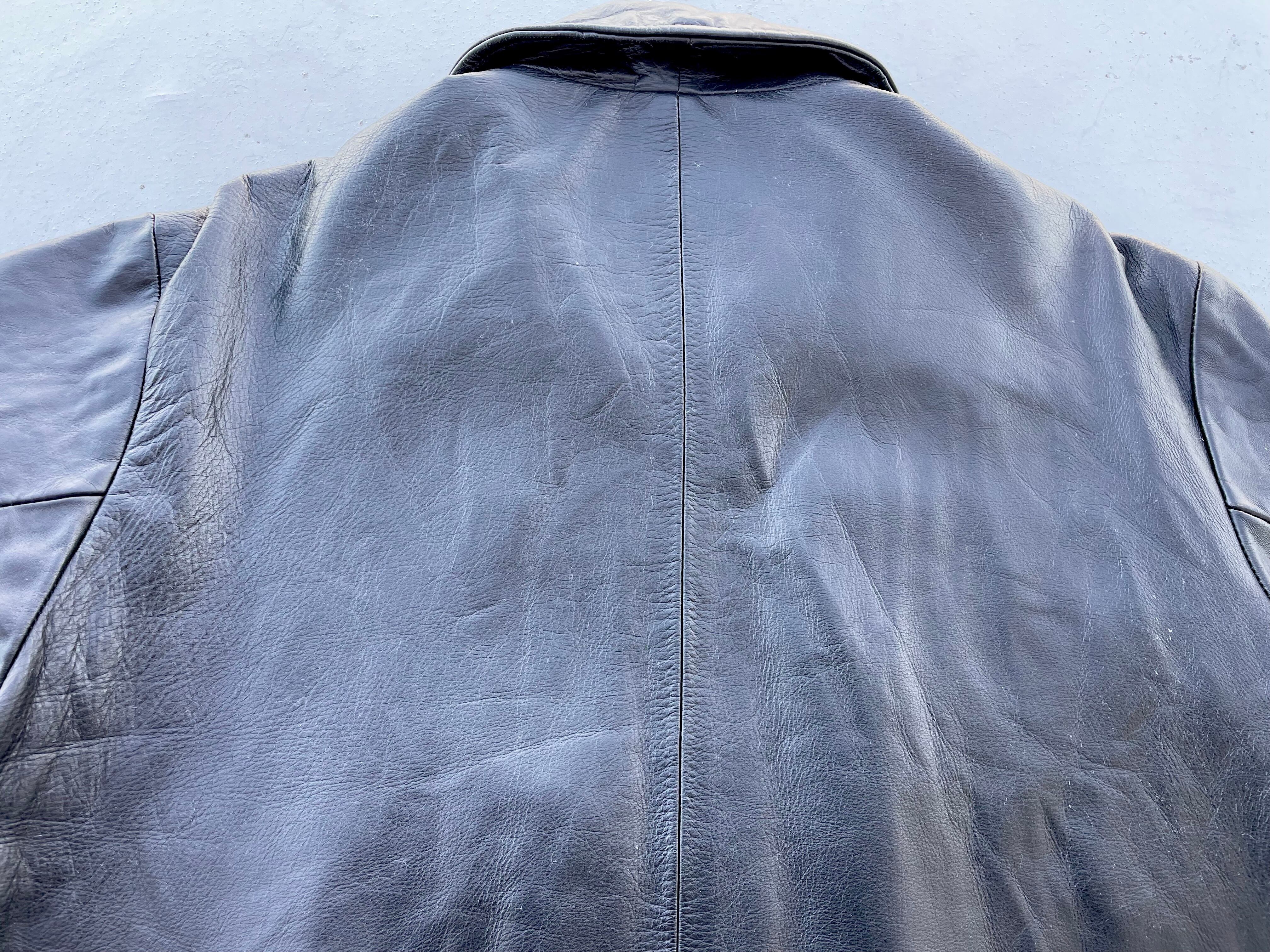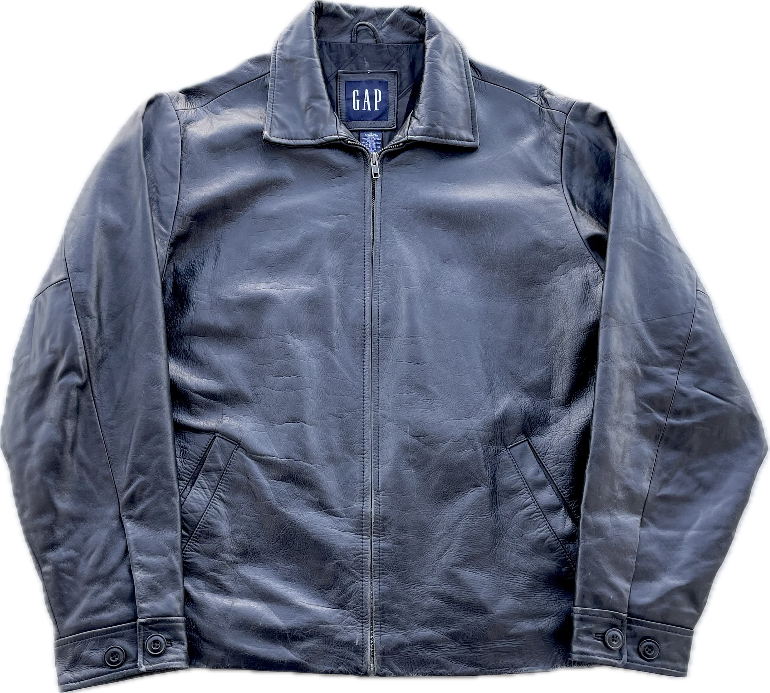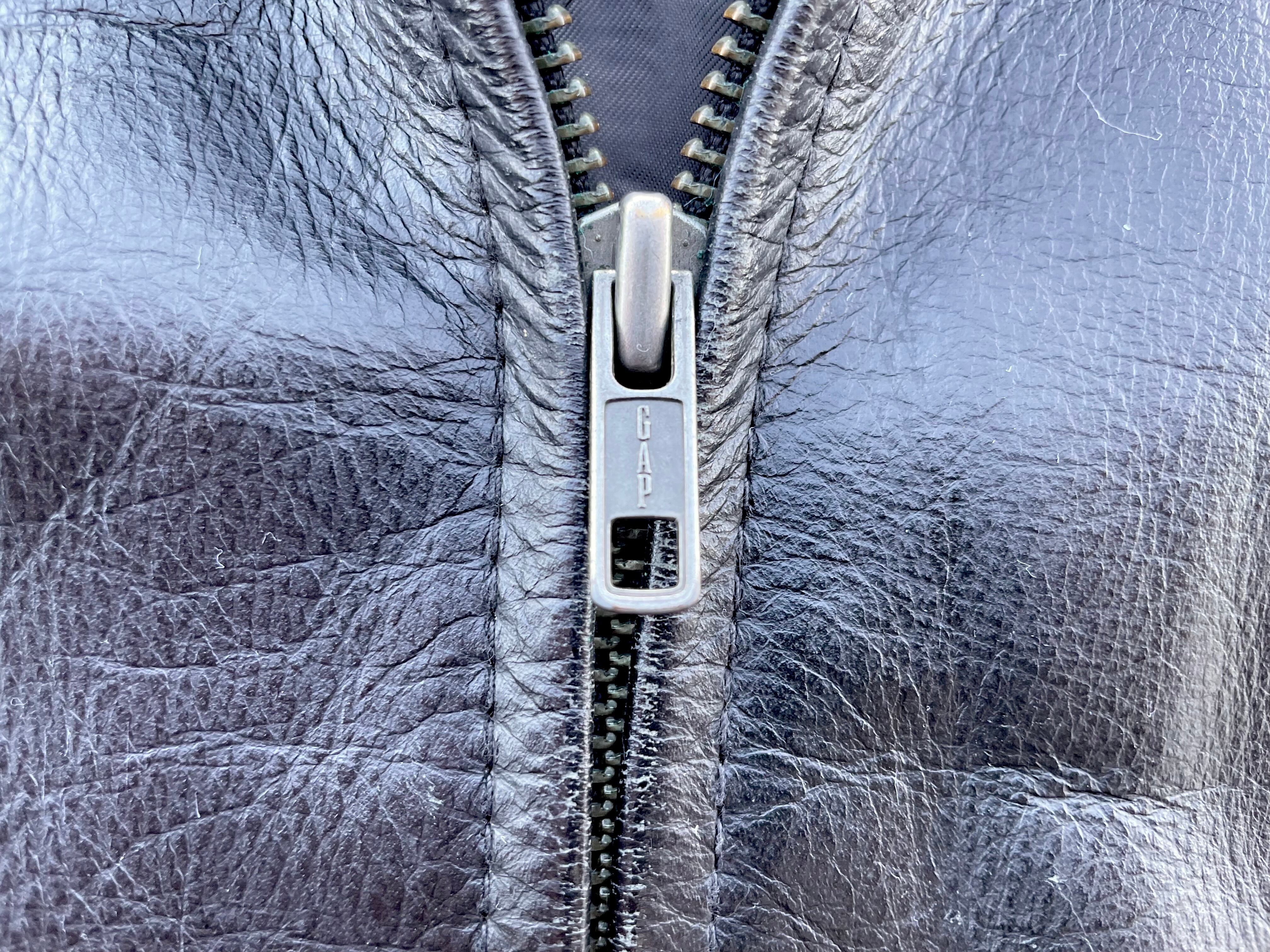 【商品詳細】ギャップのシングルレザージャケット。サイズはM。カラーはブラック。01年代中国製。ギャップ定番モデルのスポーツジャケットタイプのレザージャケット。ソリッドな装いで人気の高い一着。カウレザー+中綿仕様で一着でしっかり暖かいです。多少の使用感や傷はございますが、全体で見ると良い塩梅の経年劣化で雰囲気あります。他気になる傷や穴、レザー硬化等なく前線で活躍する個体かと。