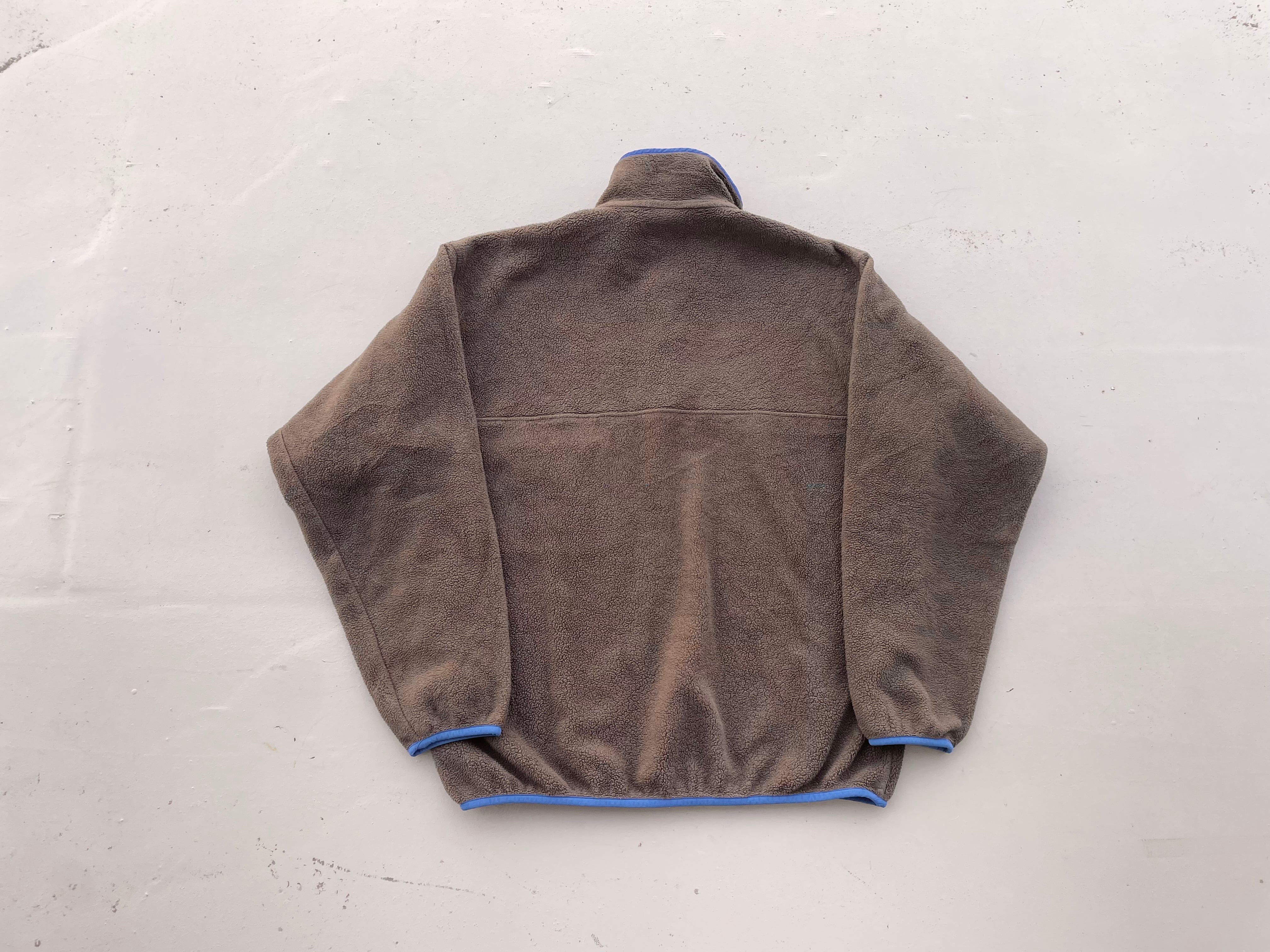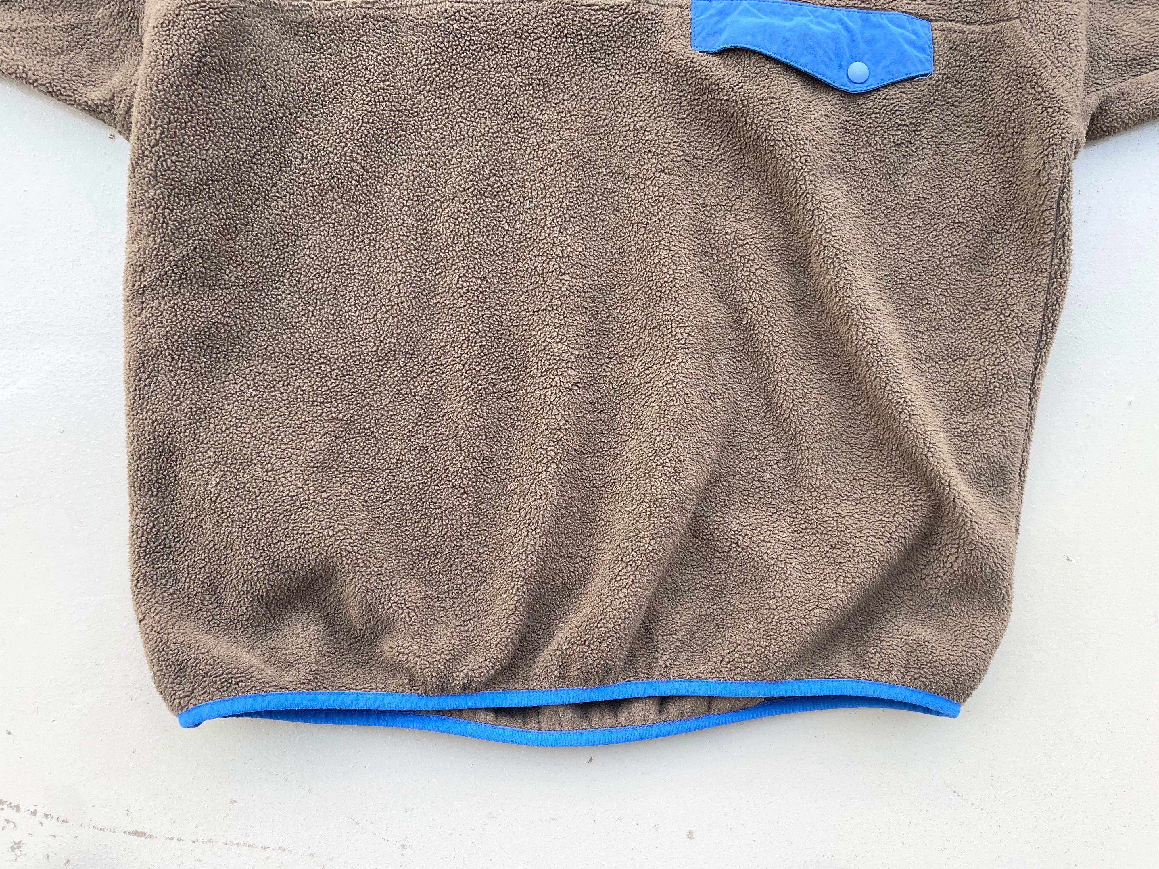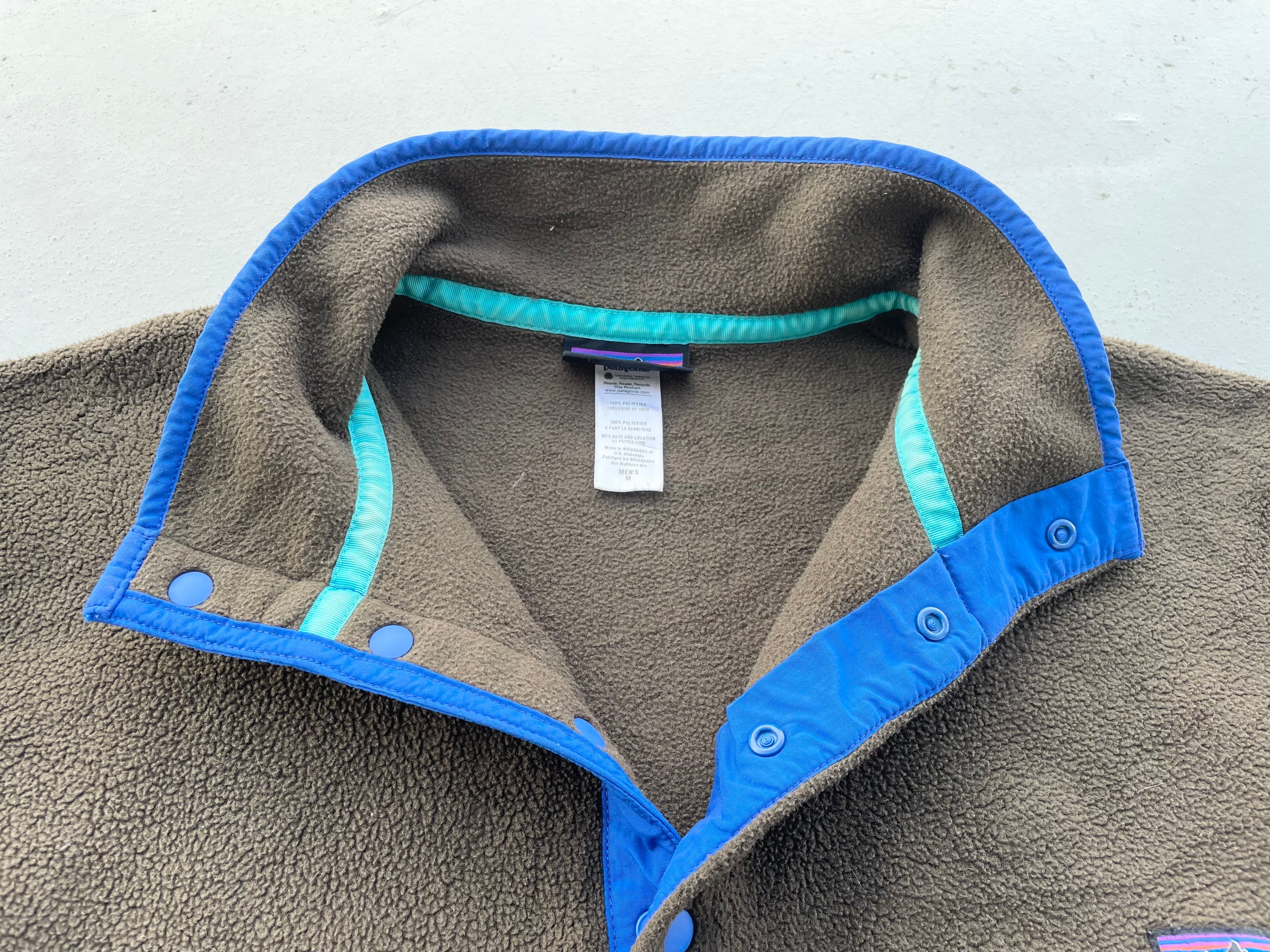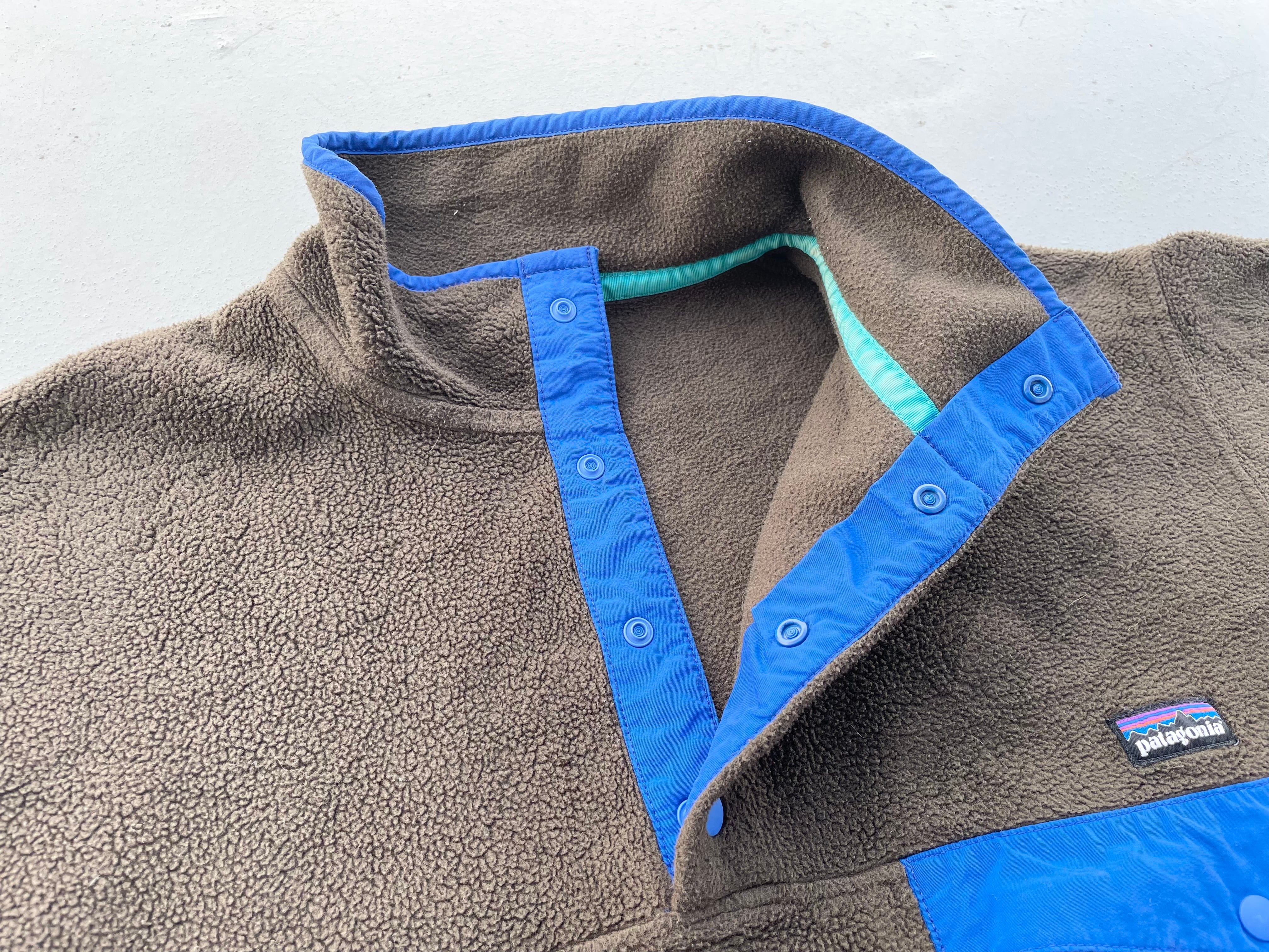 【商品詳細】パタゴニアのシンチラスナップT。サイズはM。カラーはブラウン。13年ニカラグア製。大人なブラウンカラー物。ナイロンとパイピングのブルーカラーも良い感じです。実寸の通り縮みのない大きめサイズ。