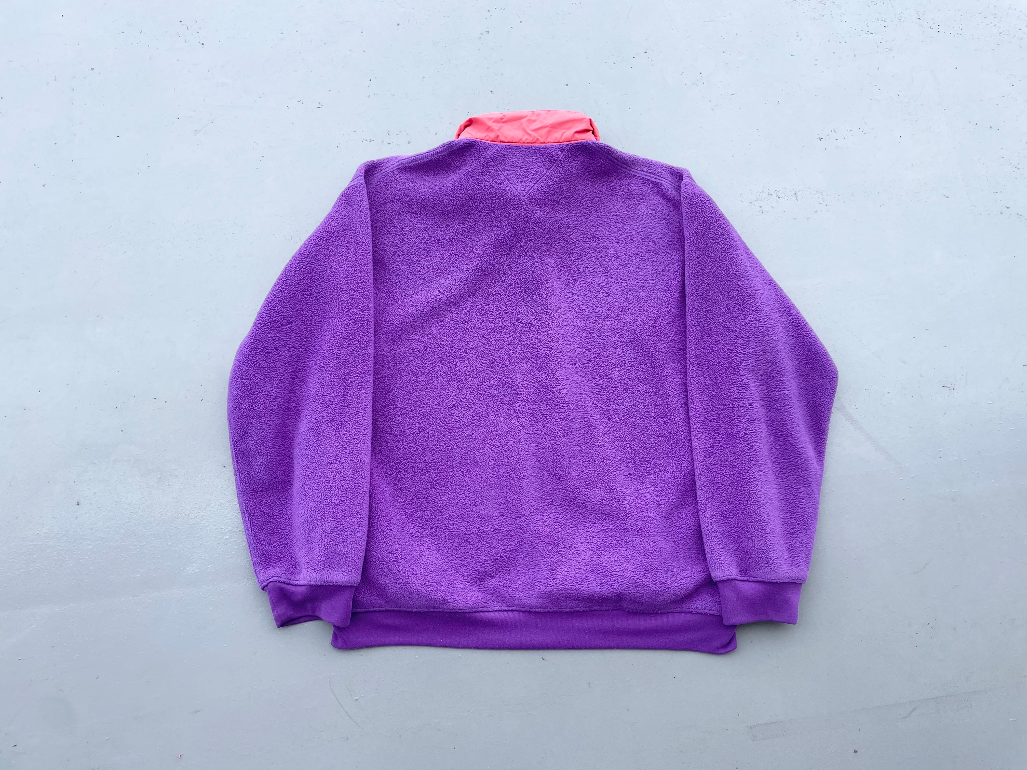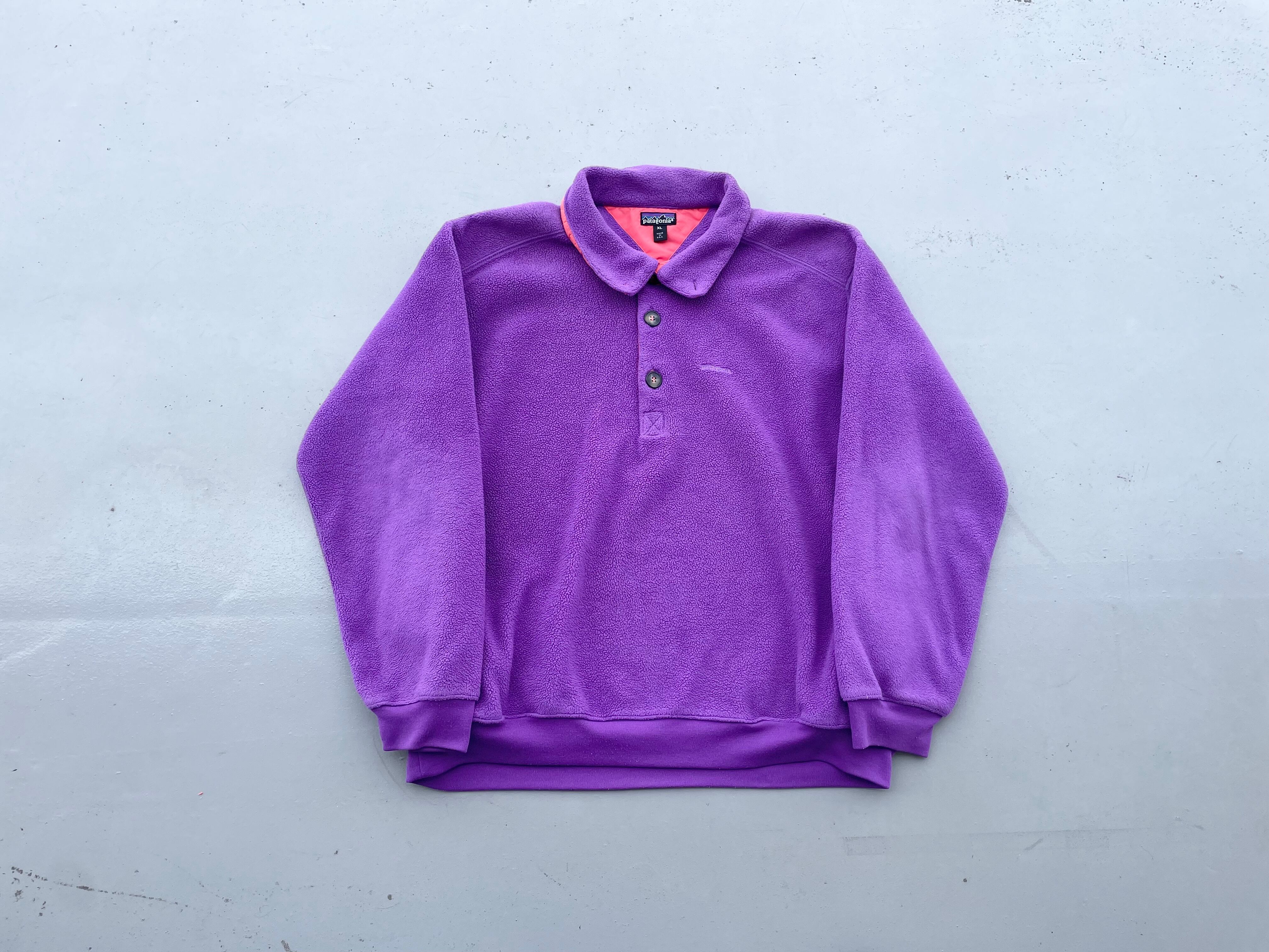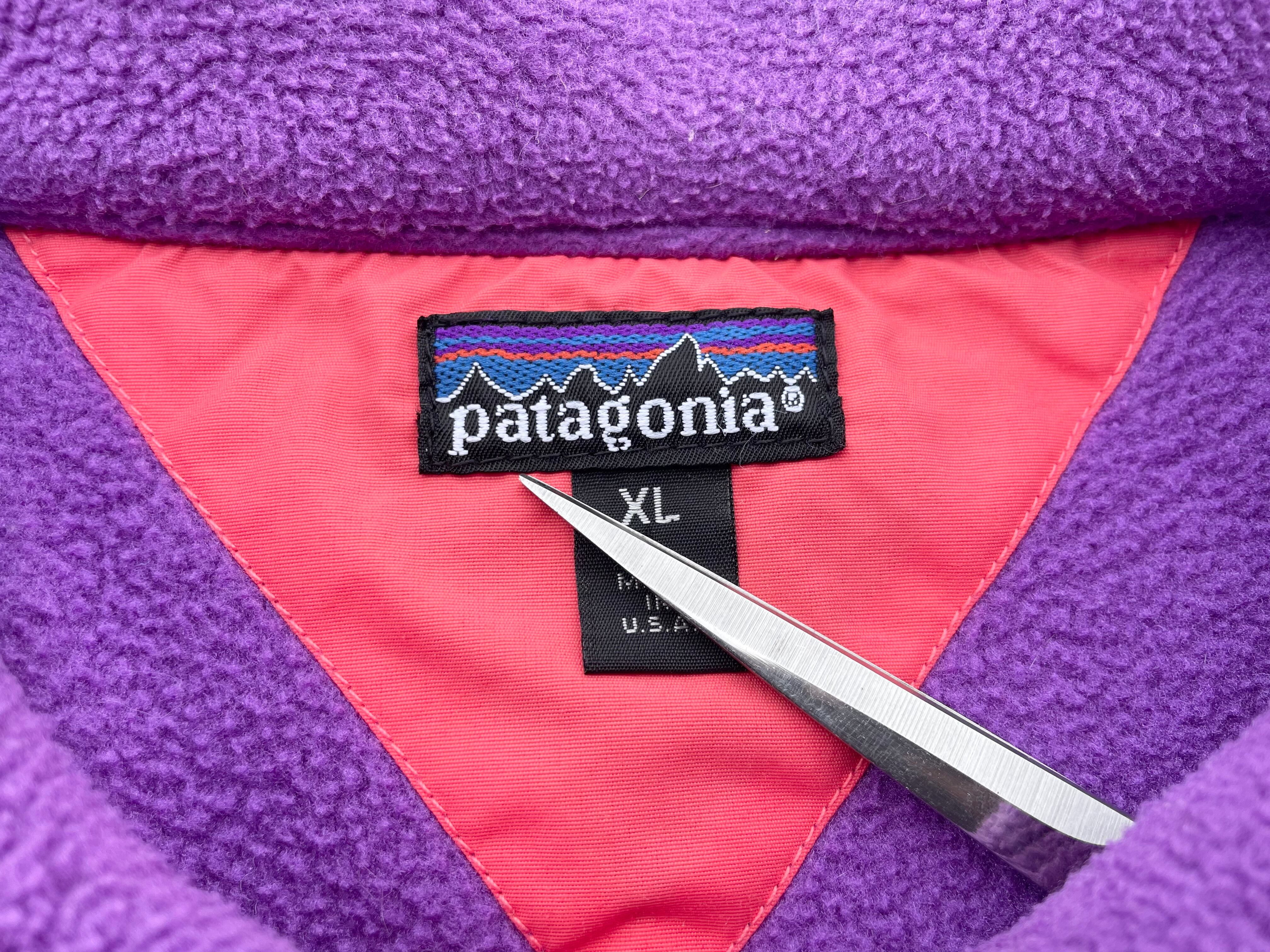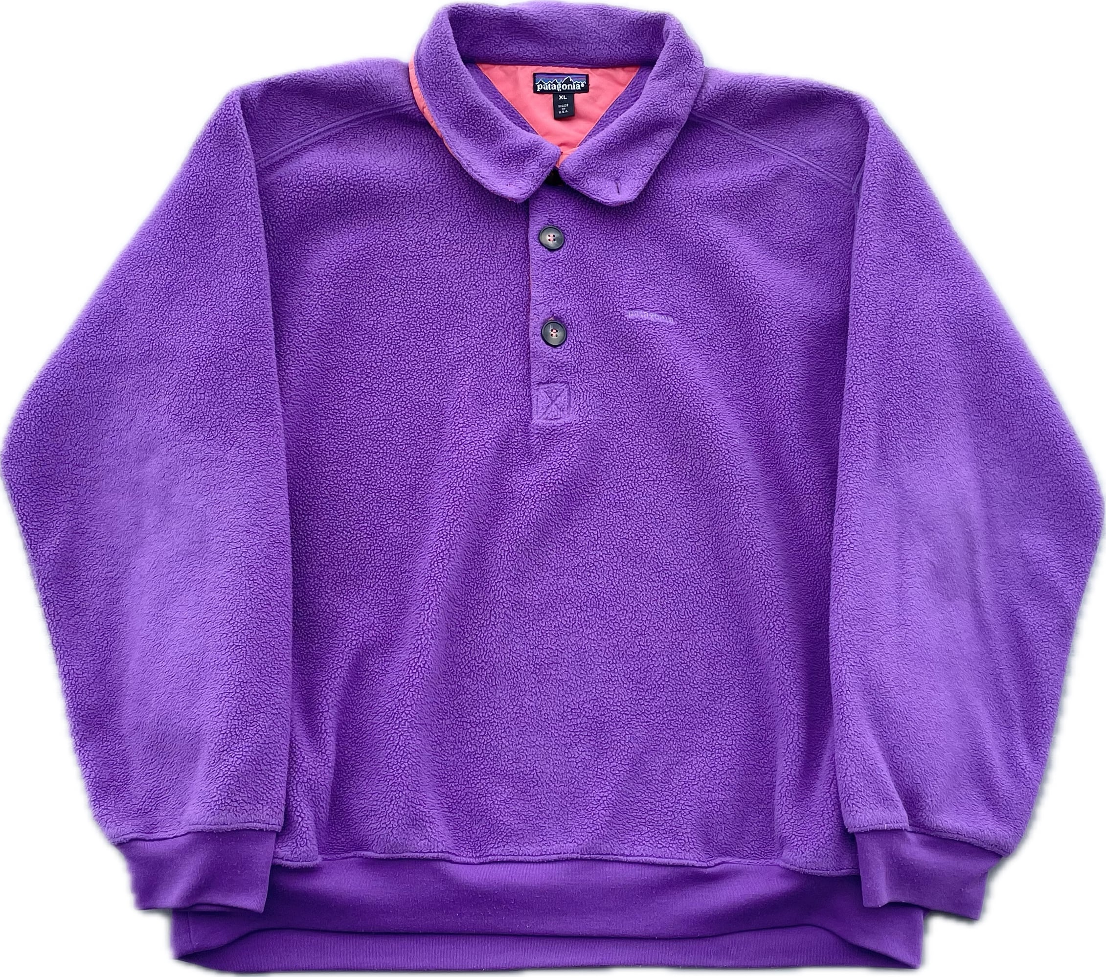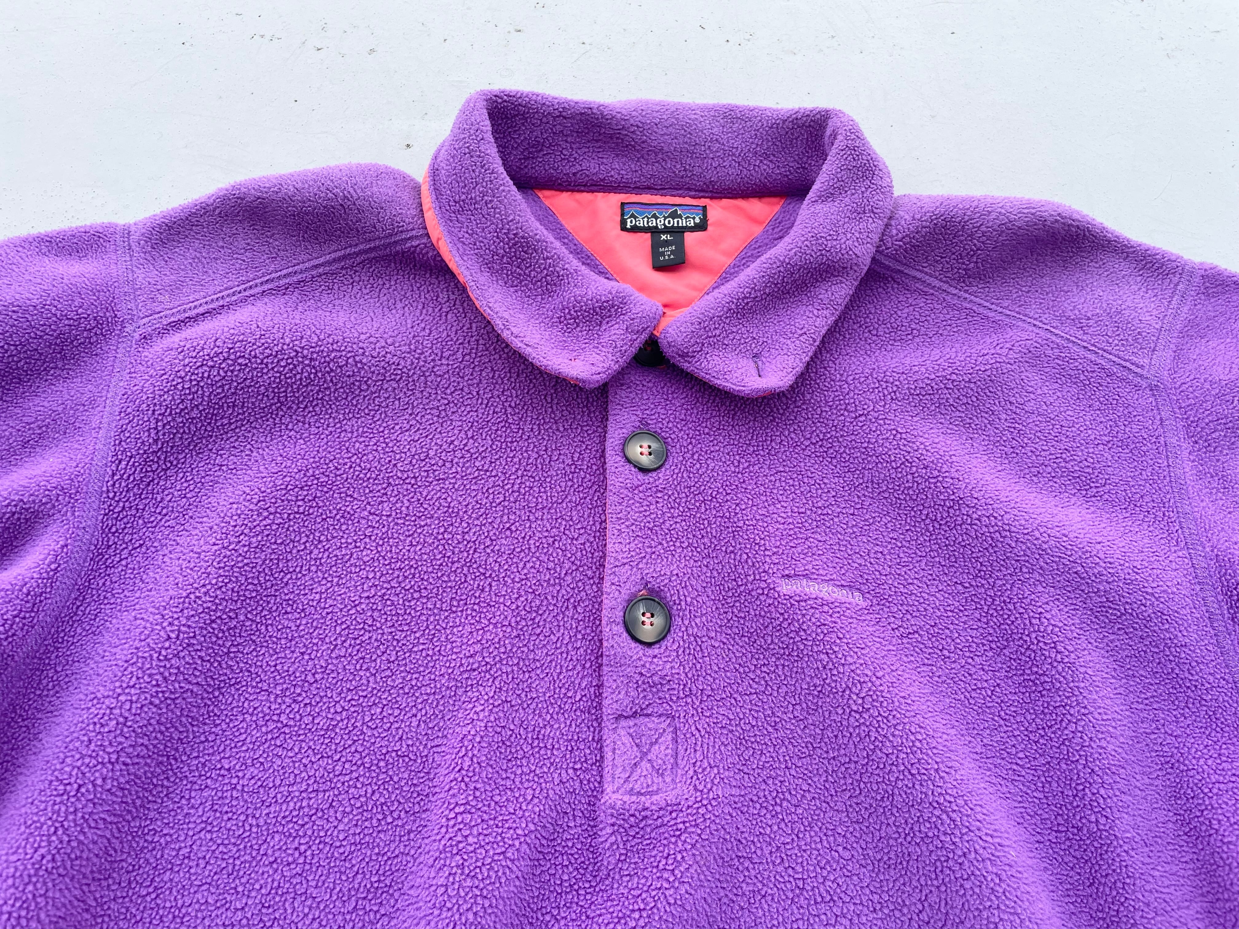 【商品詳細】パタゴニアのライトウェイトシンチラプルオーバー。サイズはXL。カラーはパープル。91年USA製。ライトウェイトシンチラプルオーバーの襟付きの珍品モデル。着丈短めのモデルですが嬉しいしっかり着丈のある個体◎身幅もたっぷりのバルーンシルエットで今っぽくご着用いただけるかと。ブライトパープルみのあるカラーで良い調子です。