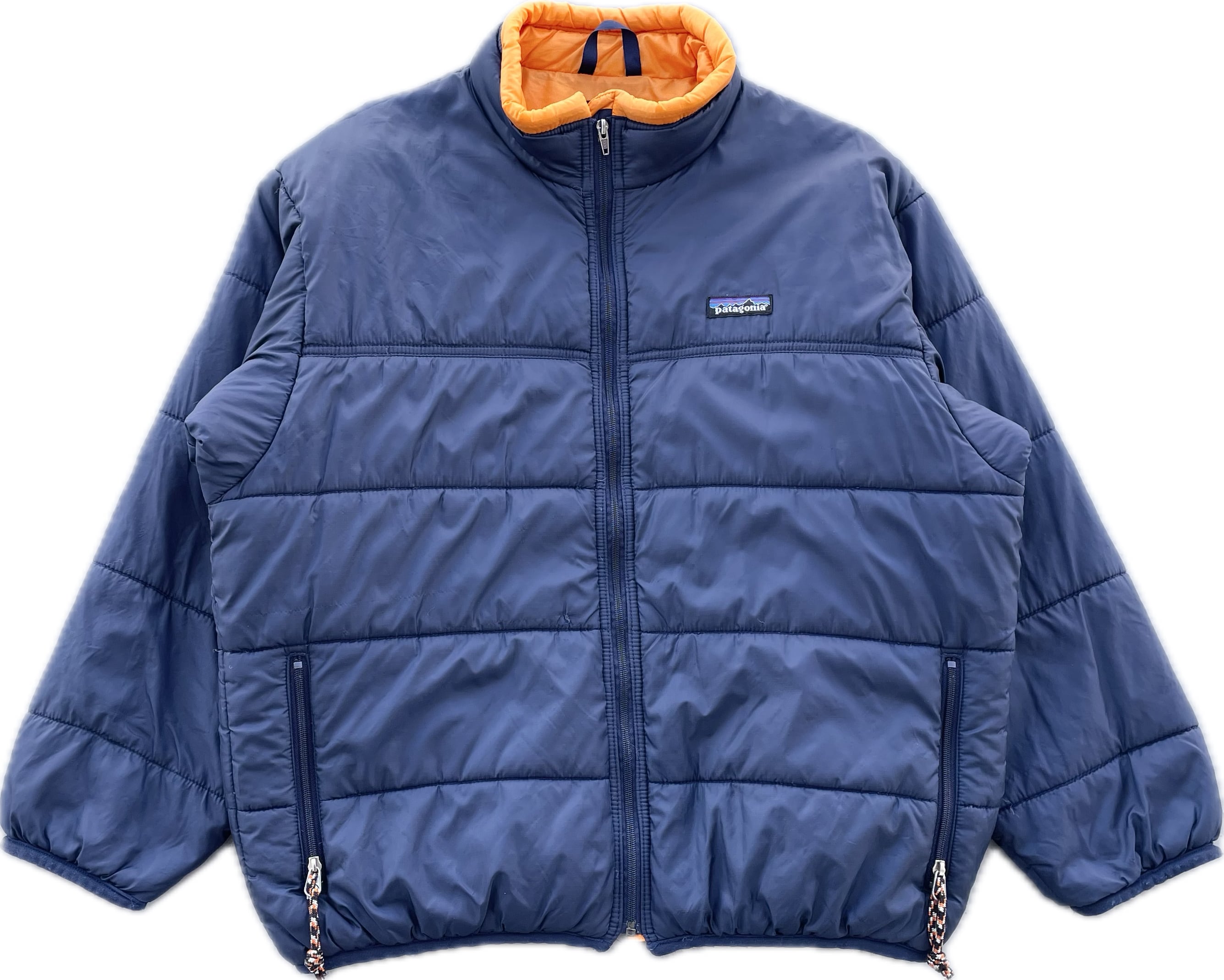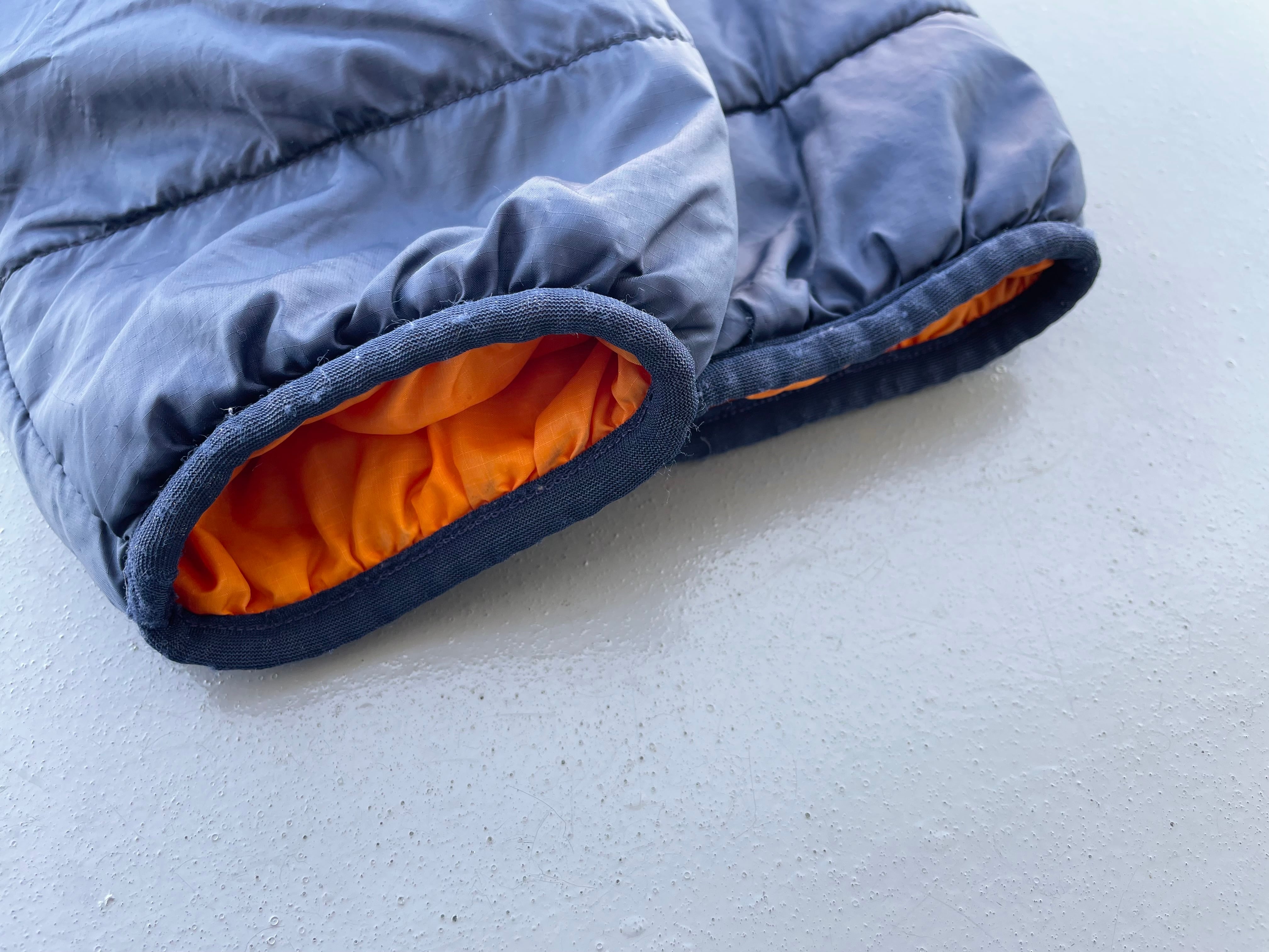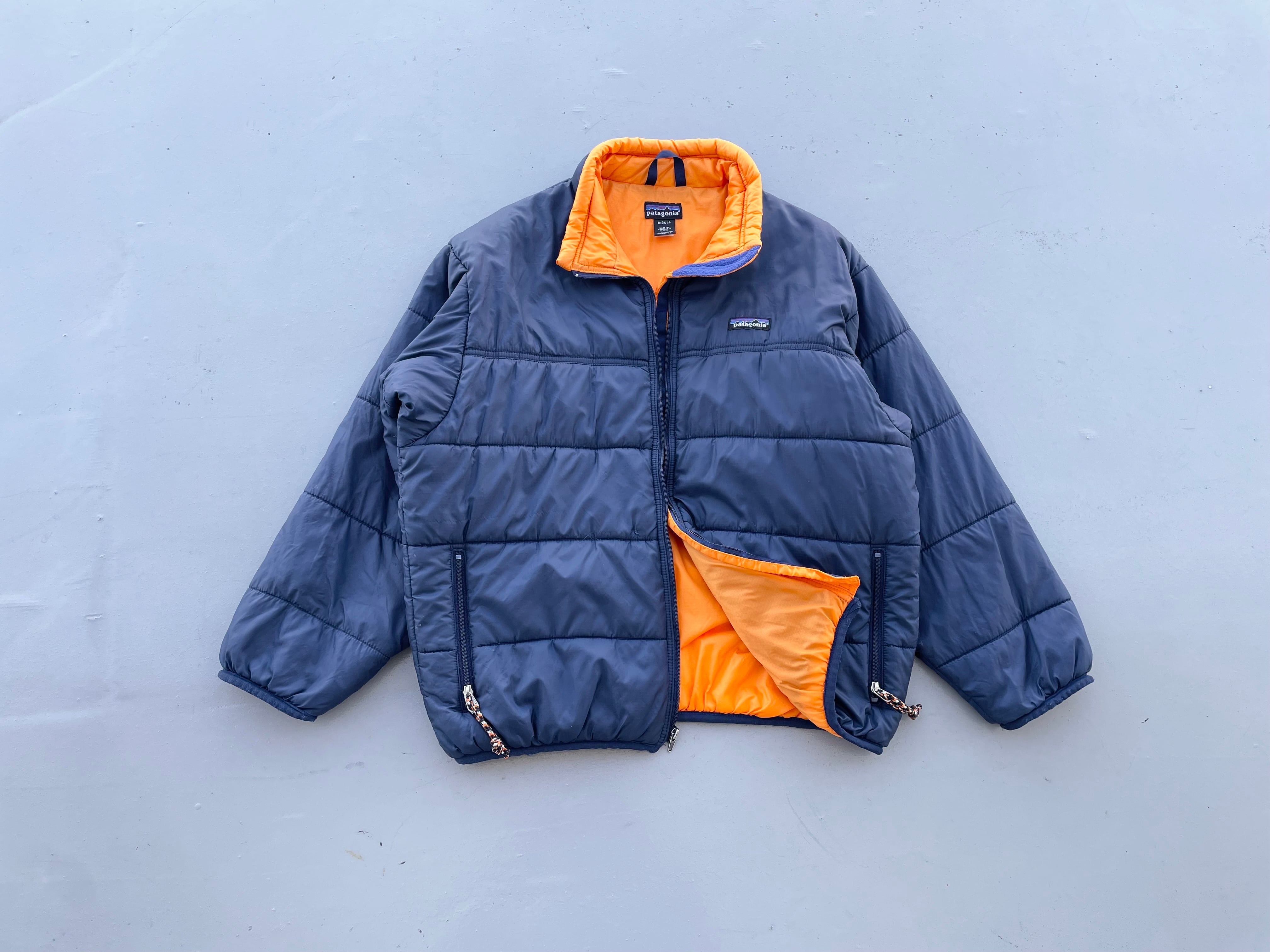 【商品詳細】パタゴニアのファイヤーボールジャケット。サイズはKIDS'14。カラーはネイビー。99年USA製。人気上昇中のファイヤーボール。落ち着いたネイビーカラーにマンゴーカラーを合わせたグッド配色。キッズ物ですが大きめの作りなので男性でもご着用いただけるサイズ感かと。一部箇所に補修跡やツリありますがあまり気にならないと思います。