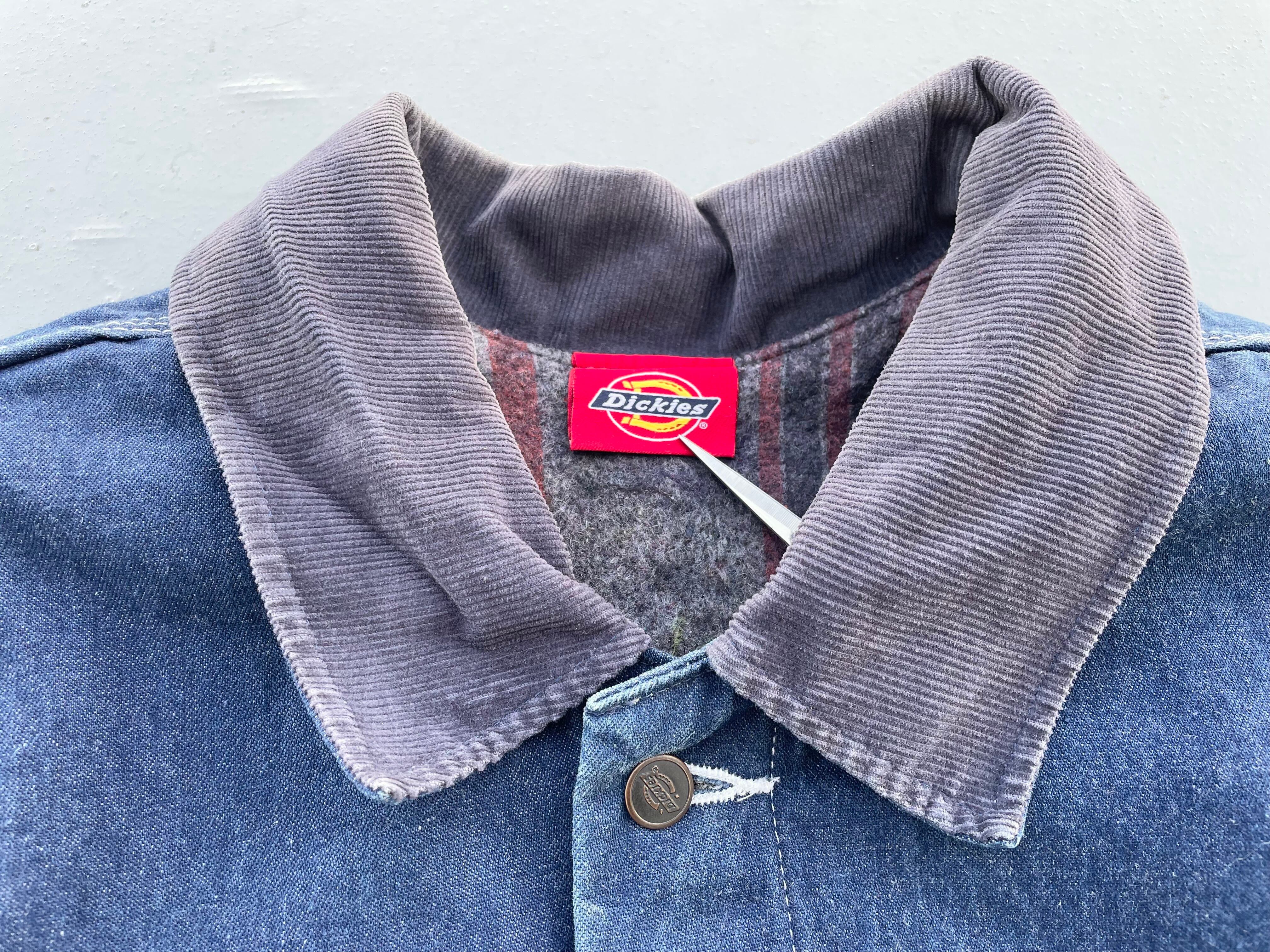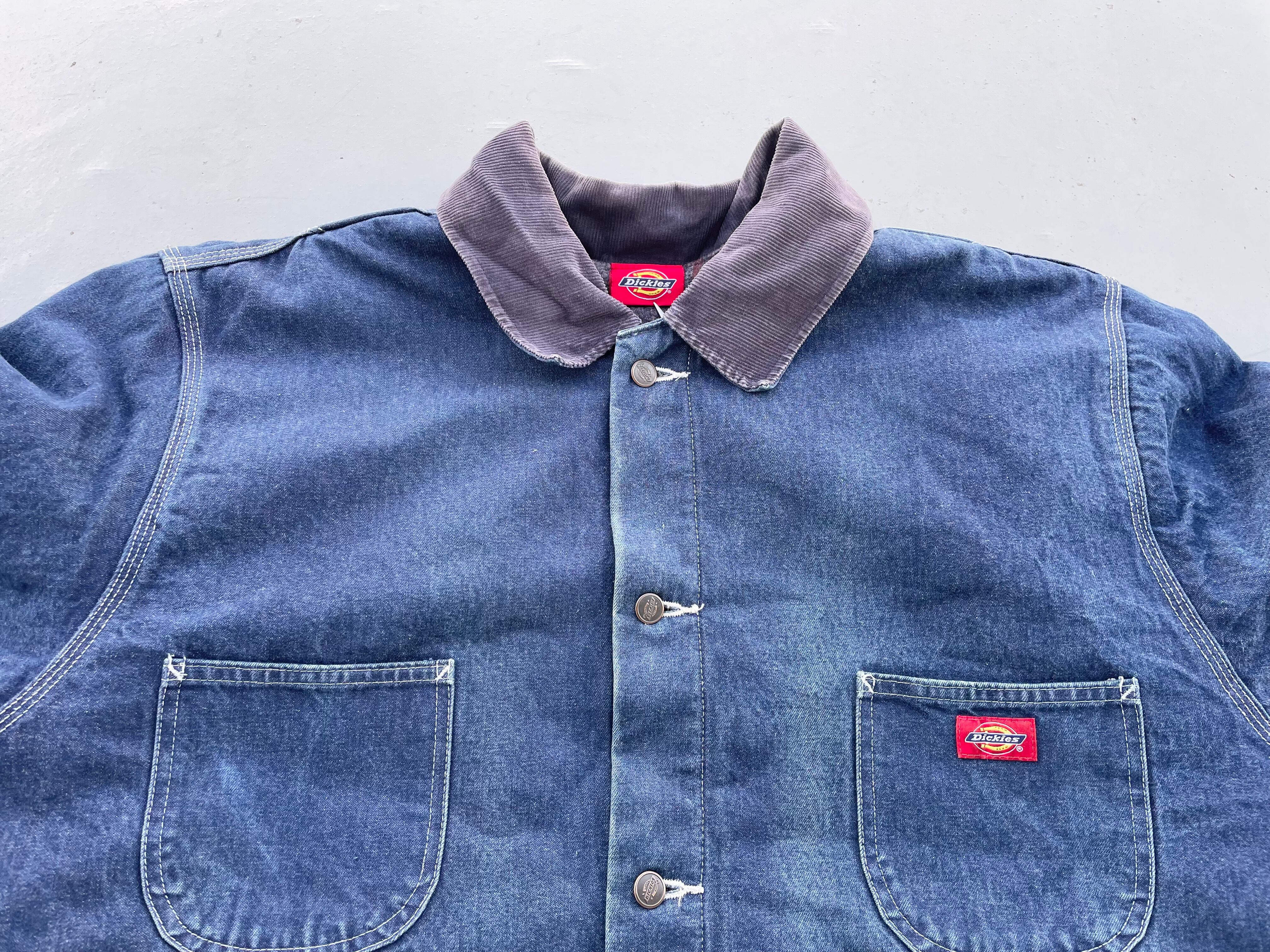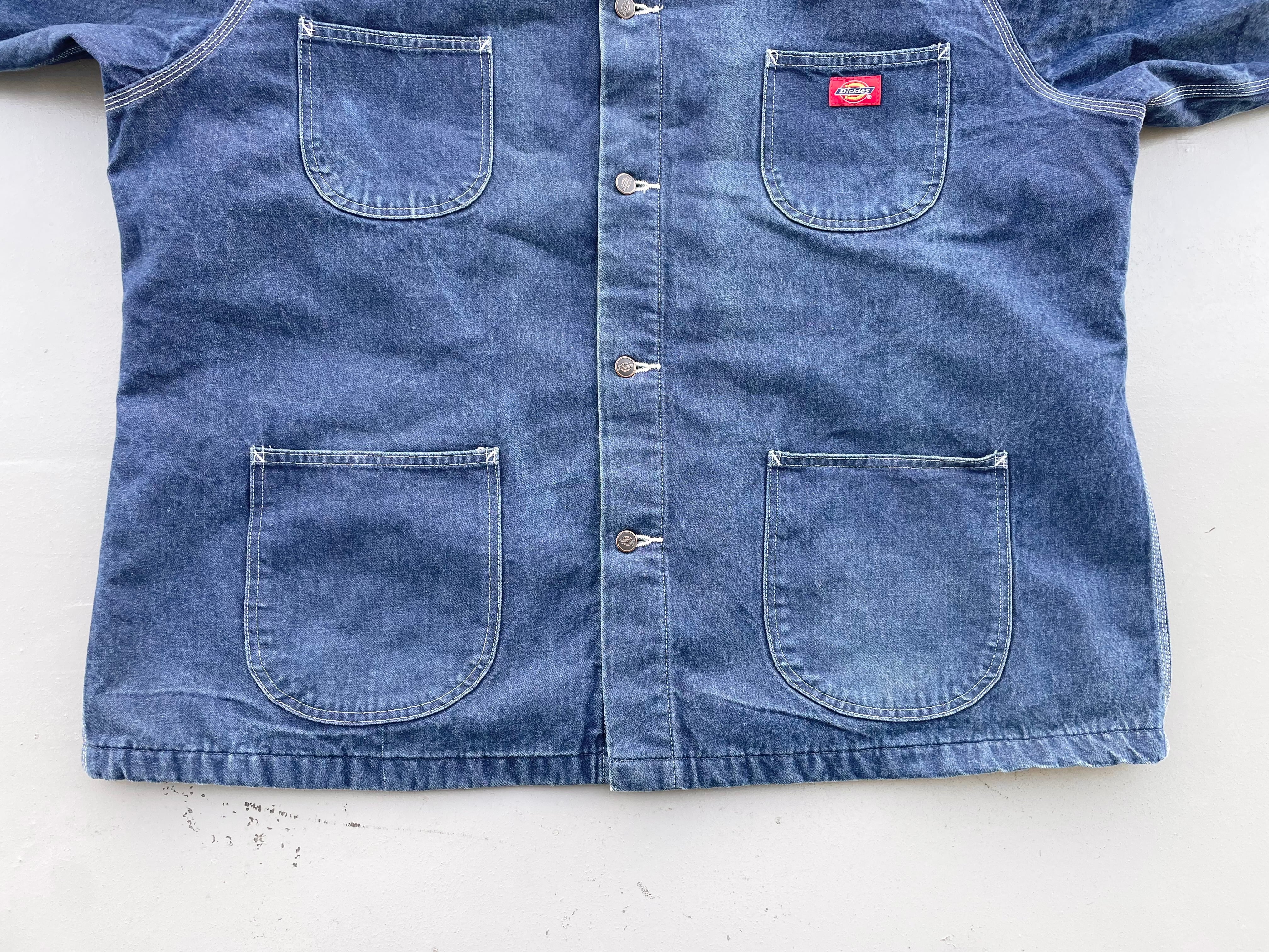 【商品詳細】ディッキーズのデニムチョアコート。サイズは実寸XL-2XL程。カラーはインディゴ。90年代製。デニム地ならではのフェードやハチノスがクールな個体。大きめサイズでしっかり中に着込めます。