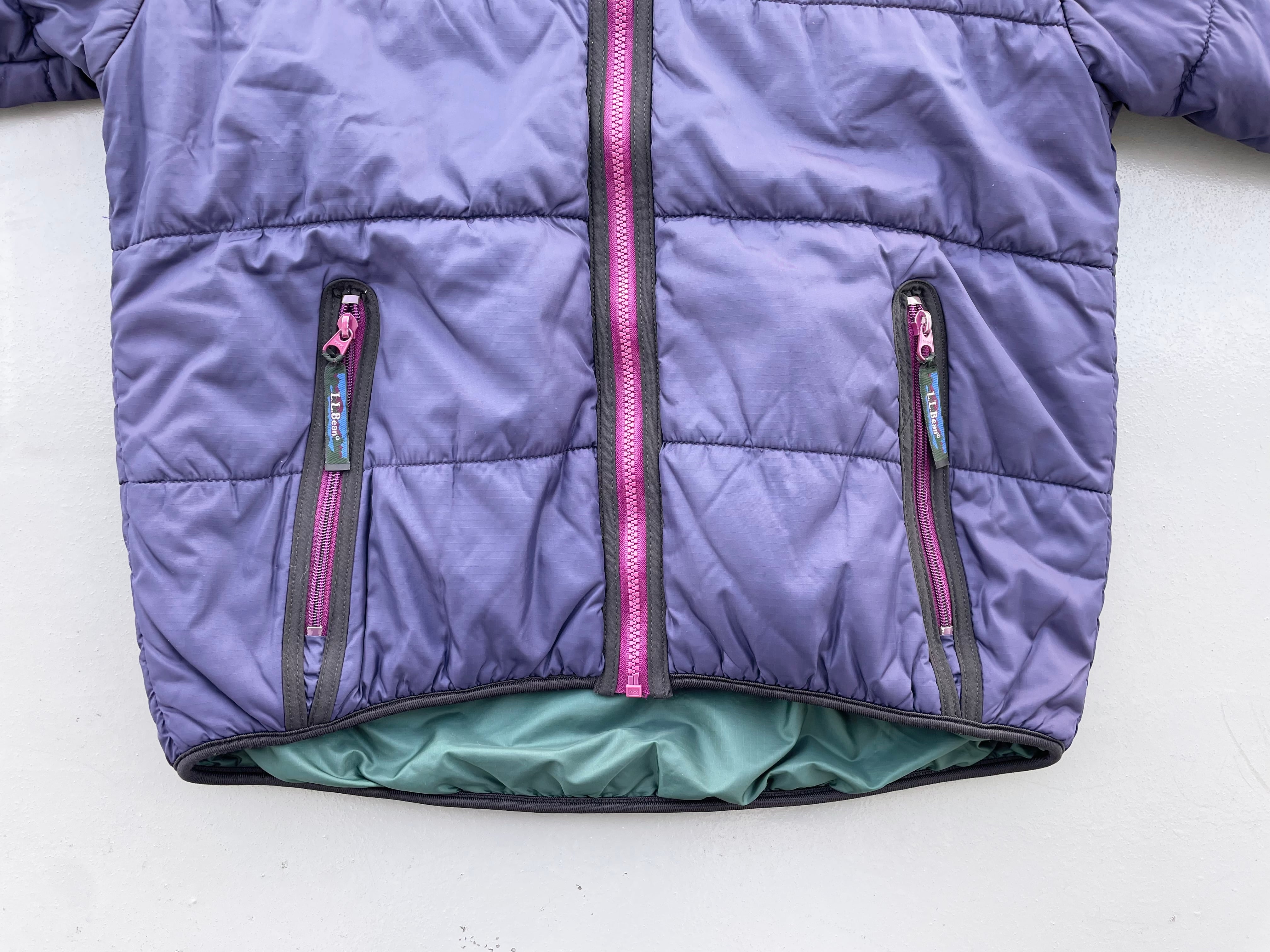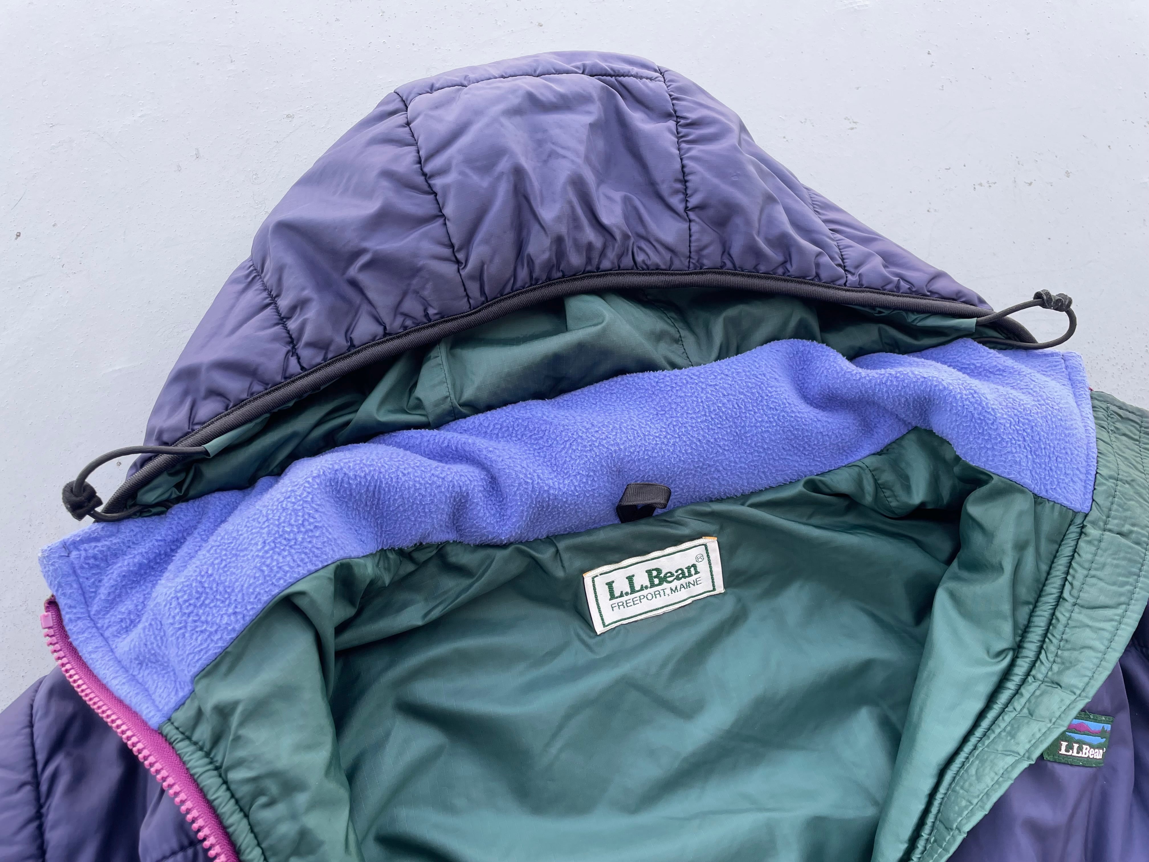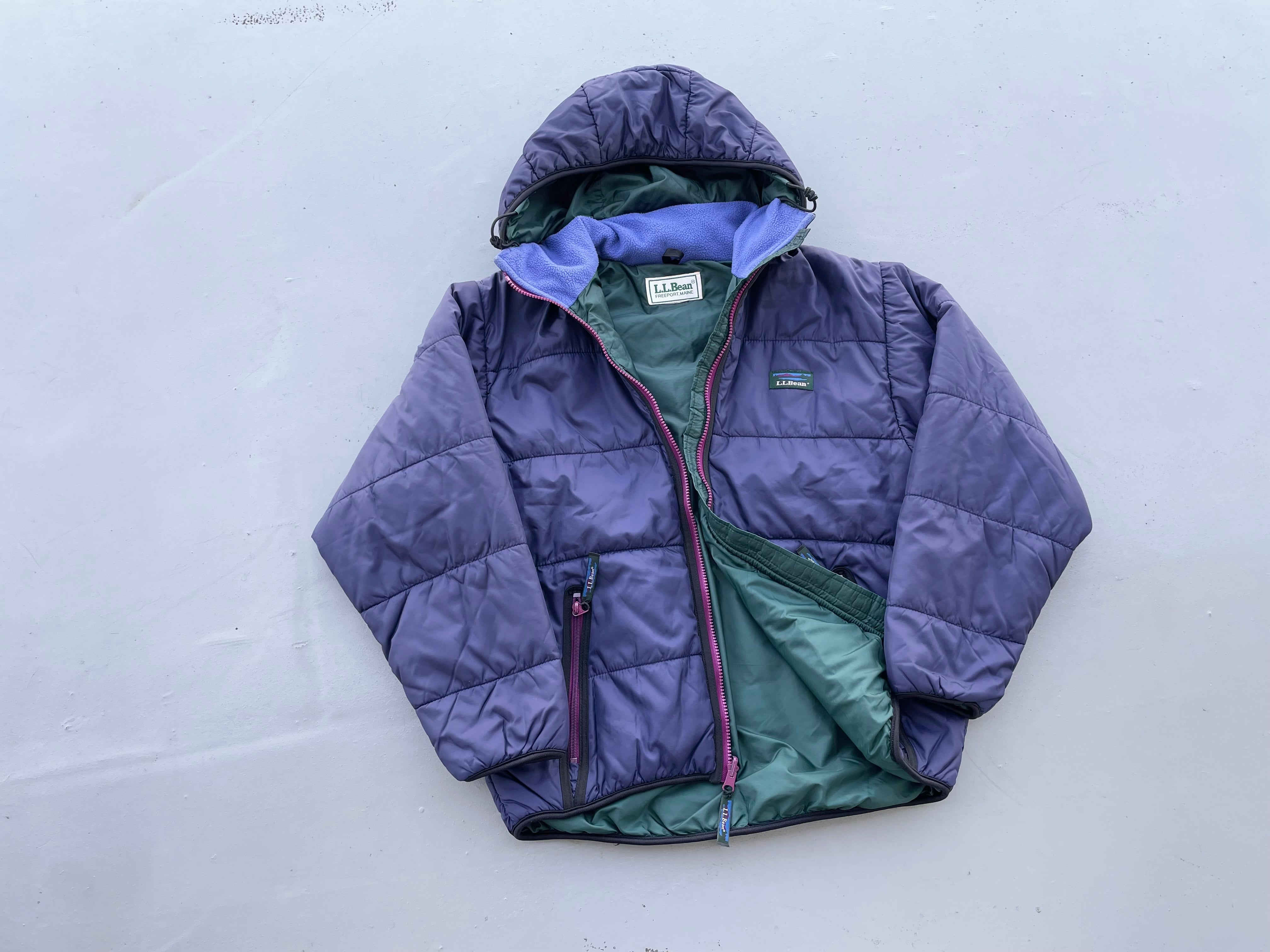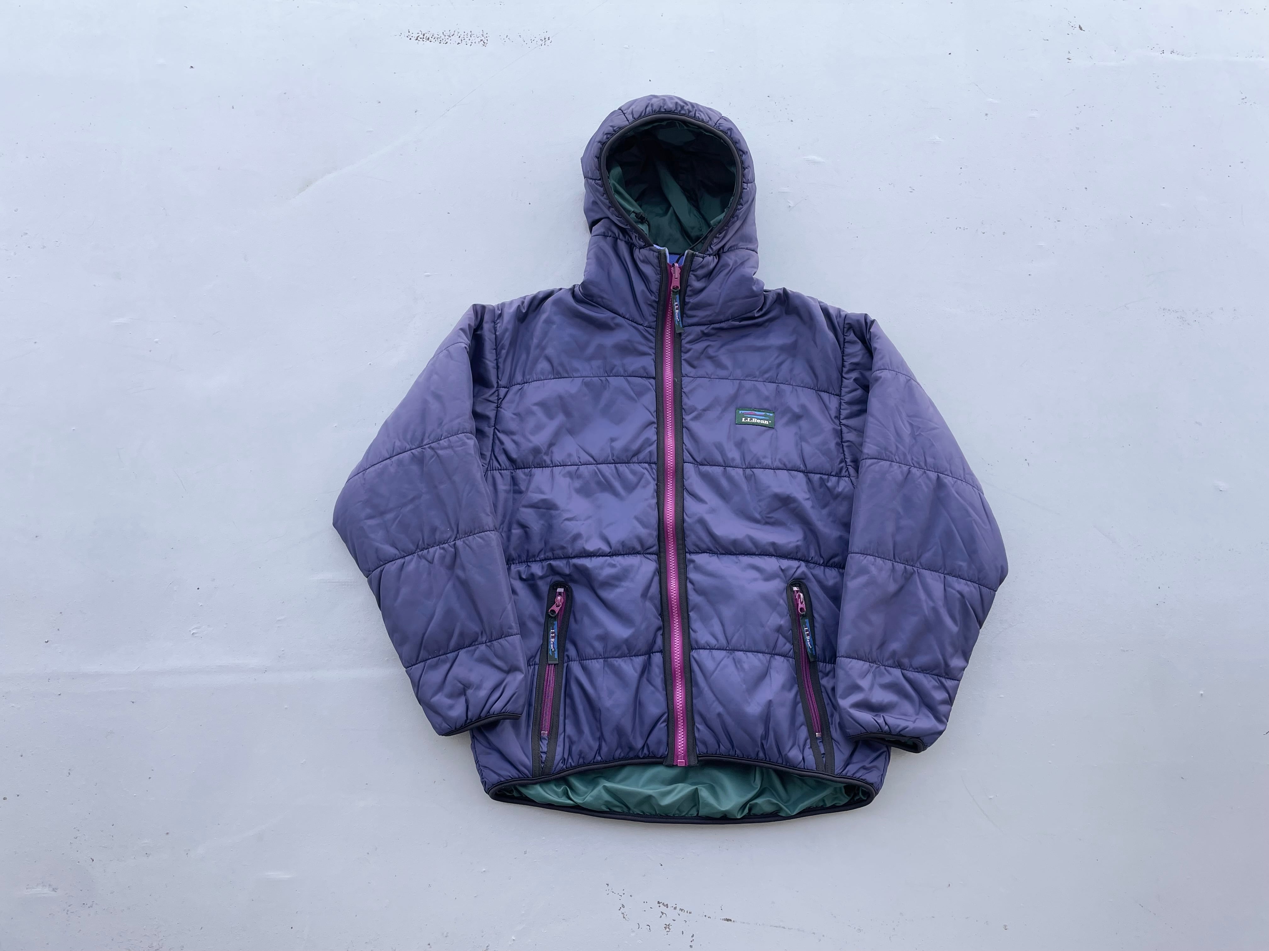 【商品詳細】エルエルビーンのプリマロフトアノラックフーディジャケット。サイズは実寸M程。カラーはパープル。80年代製。人気のプリマロフト物。復刻もされた人気カラー。年代物ですがシェルにはハリ艶あり、コンディション良いです。