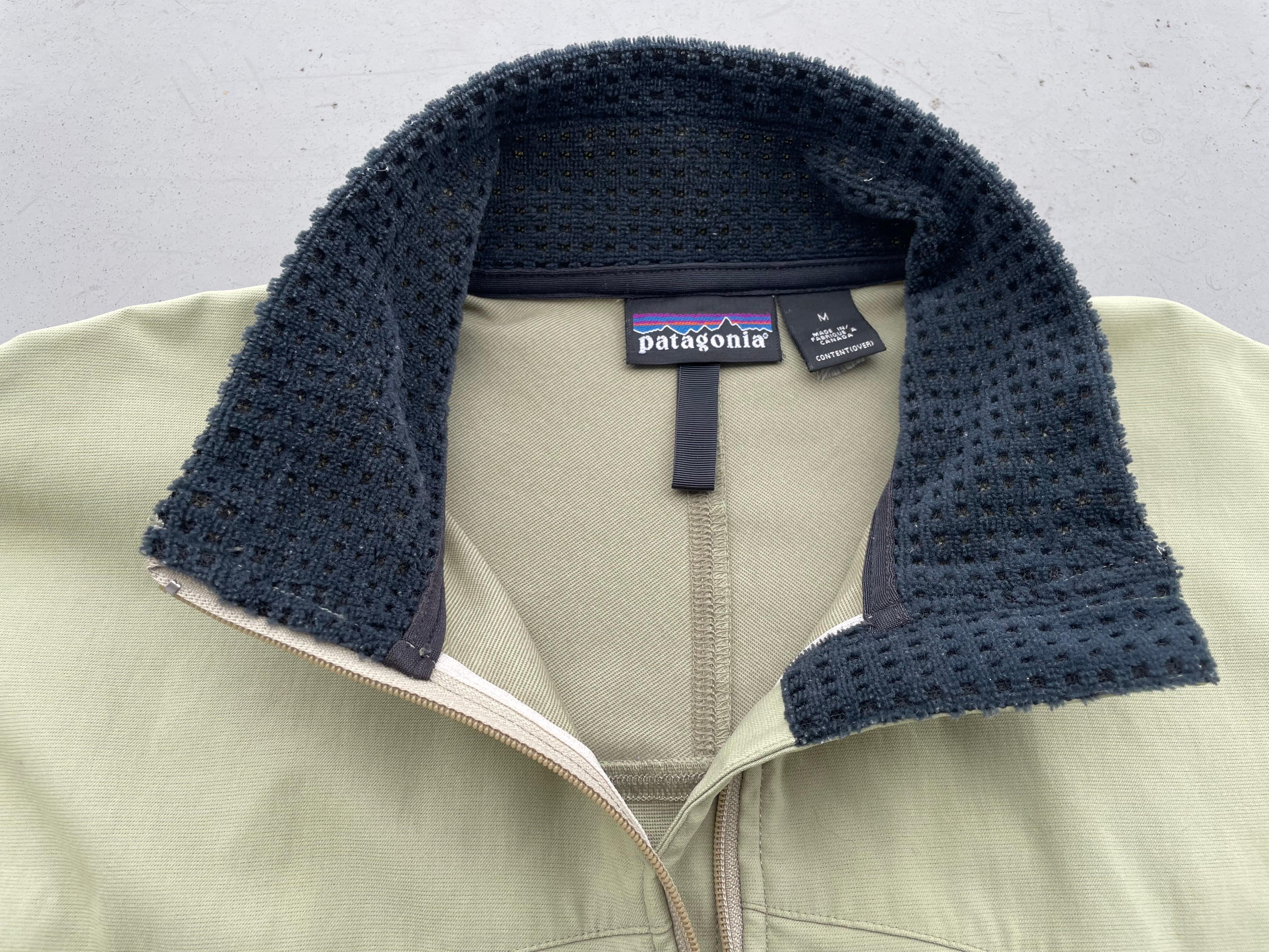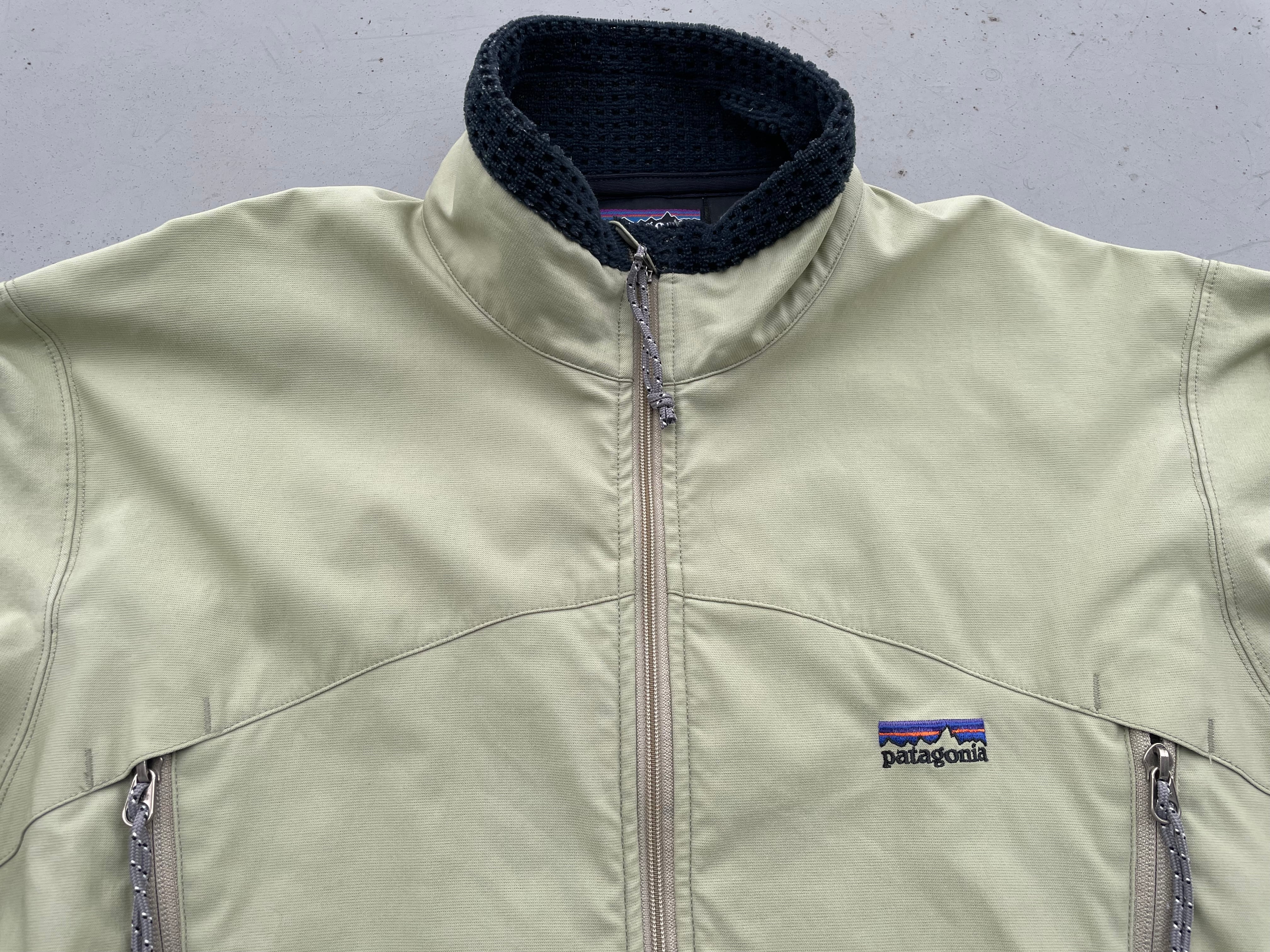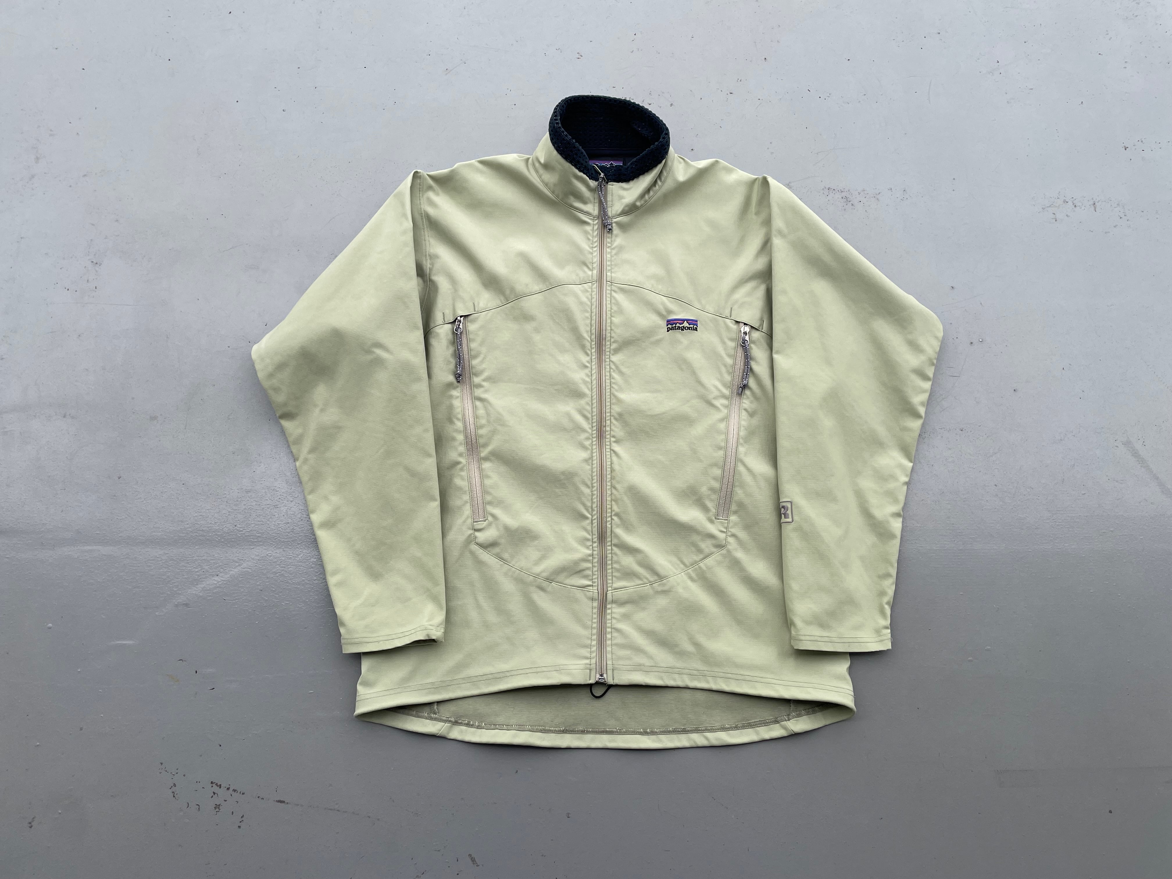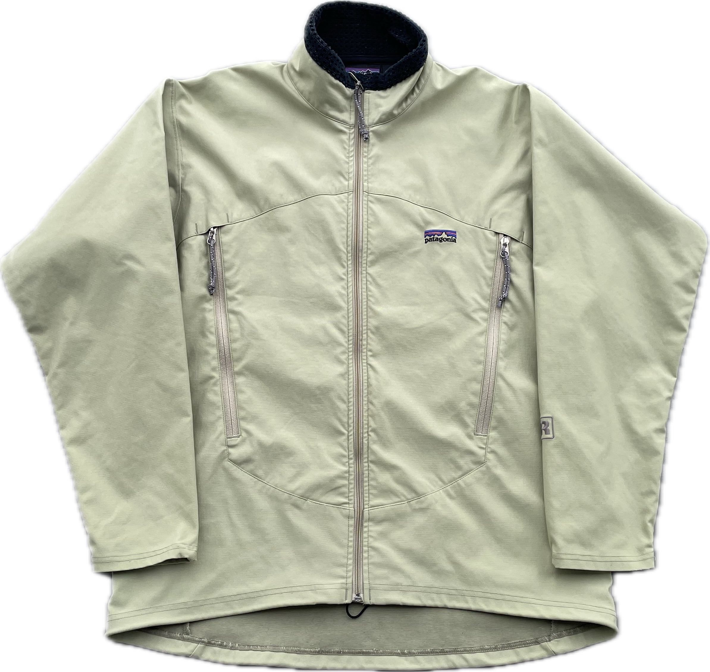 【商品詳細】パタゴニアのスリングショットジャケット。サイズはL。カラーはライムストーン。03年カナダ製。パタゴニア定番のR1ソフトシェルを使用したジャケット。ミリタリールックなカラーでありながらアーバンな香りがする一着。Marsでも採用されたモデルでこちらは両袖にポケットが付かないソリッドなデザイン。ほんのりライムグリーンカラーが入る洒落たカラー◎