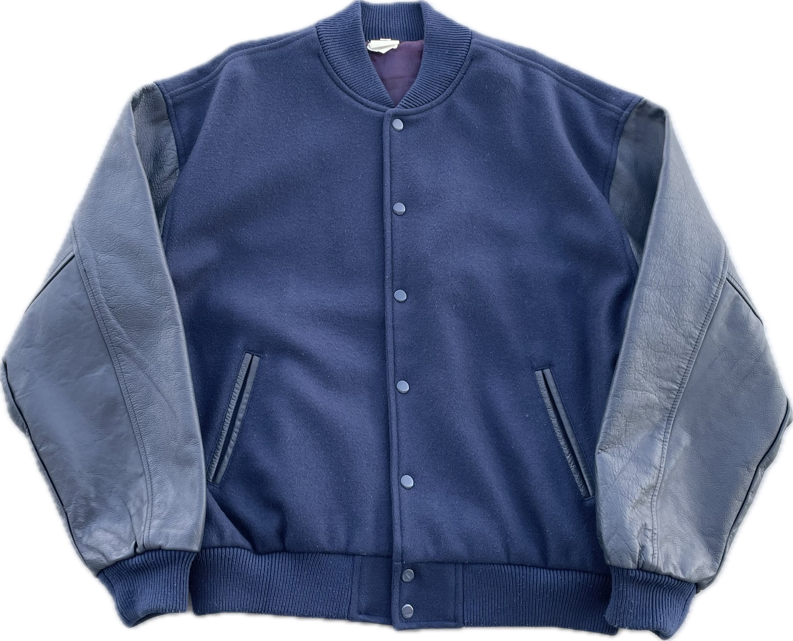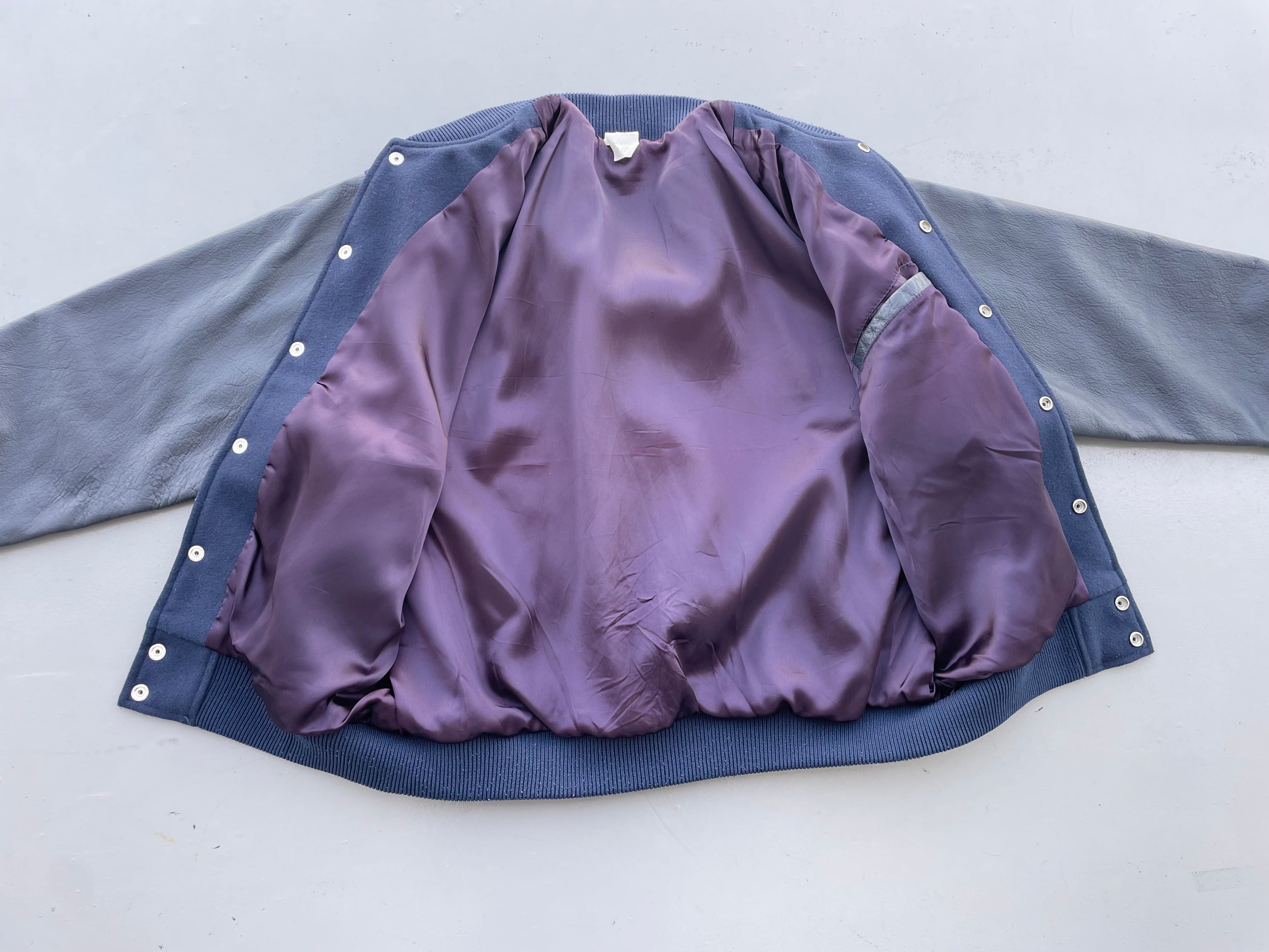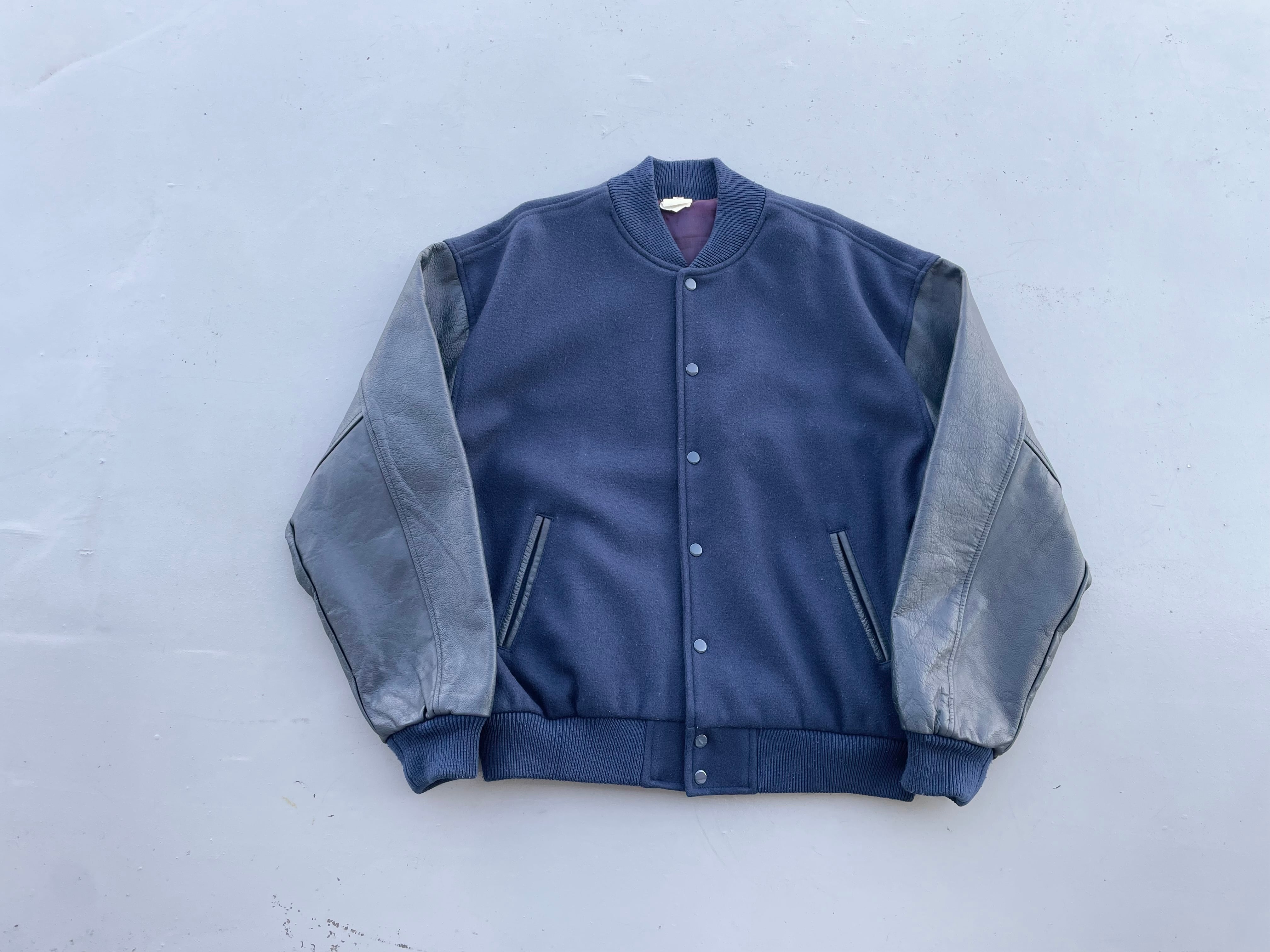 【商品詳細】ビンテージのスタジアムジャンパー。サイズはL。カラーはネイビー。80-90年代USA製。お探しの方も多い完全無地のスタジャン。ボディはウール、スリーブはレザー仕様ながら柔らかく軽い仕上がりでデイリーに着回しやすそうです。ライニングはスリーブやポケット裏も含めパープルカラーのサテン仕様の豪華な作り。