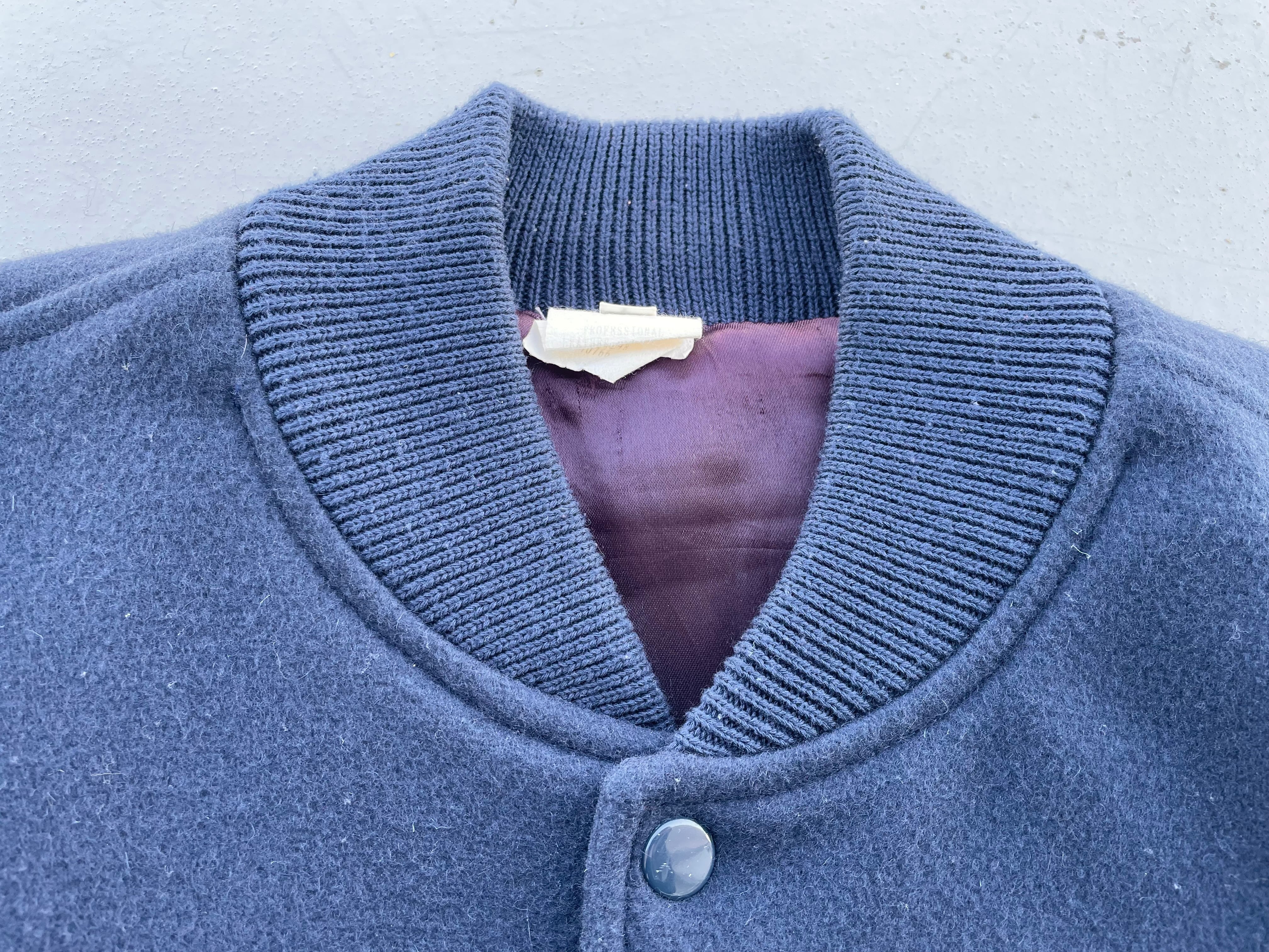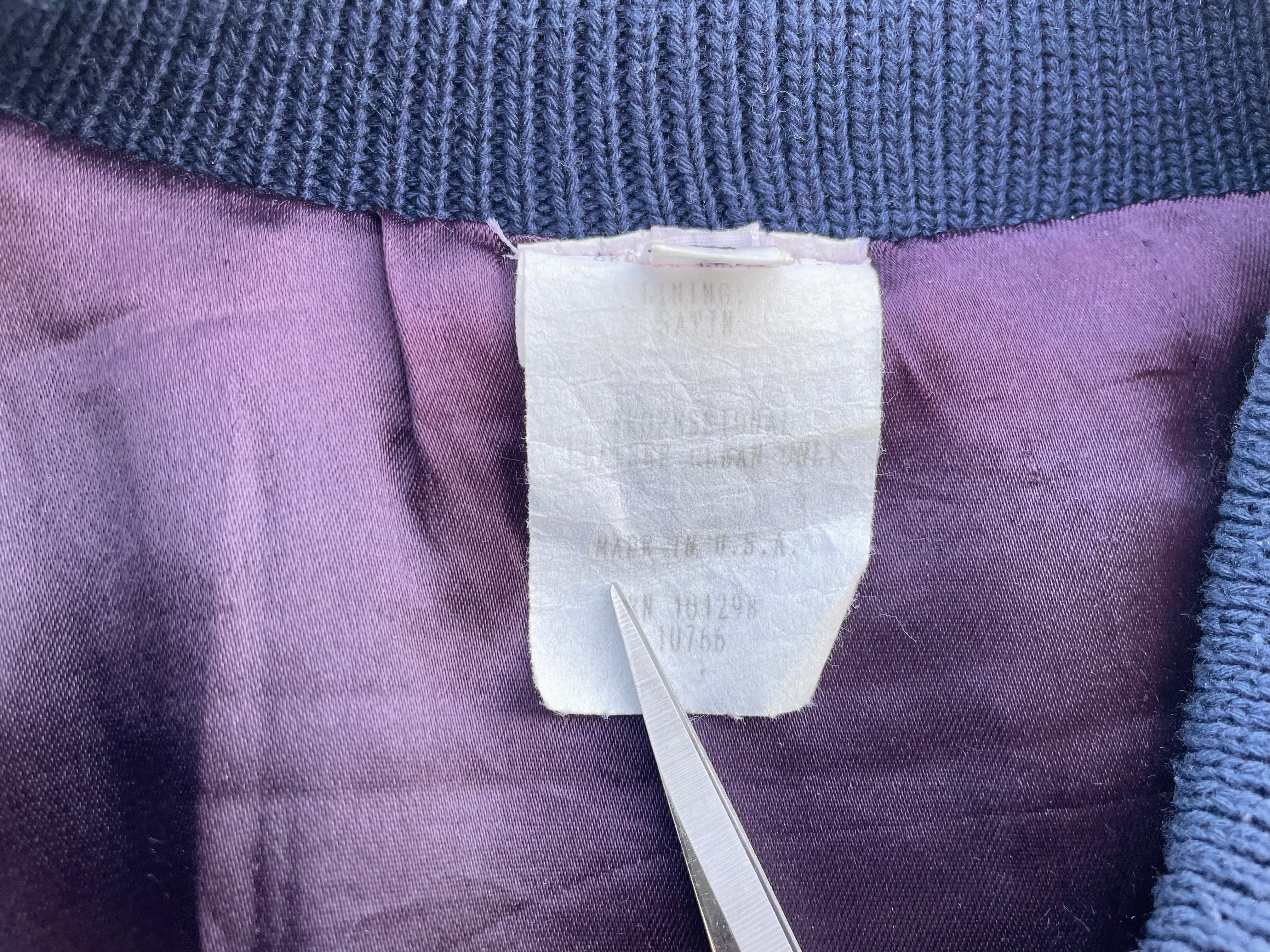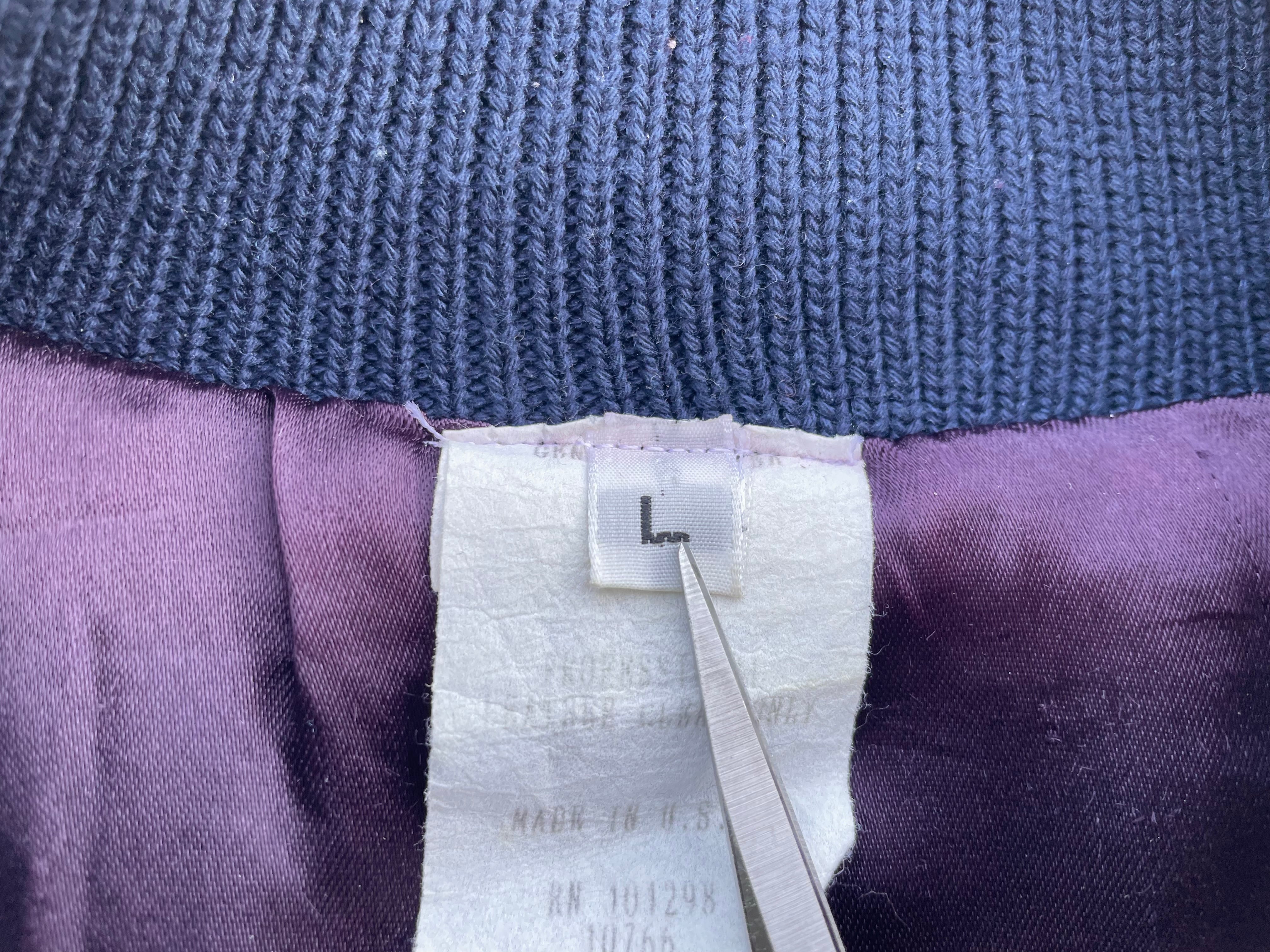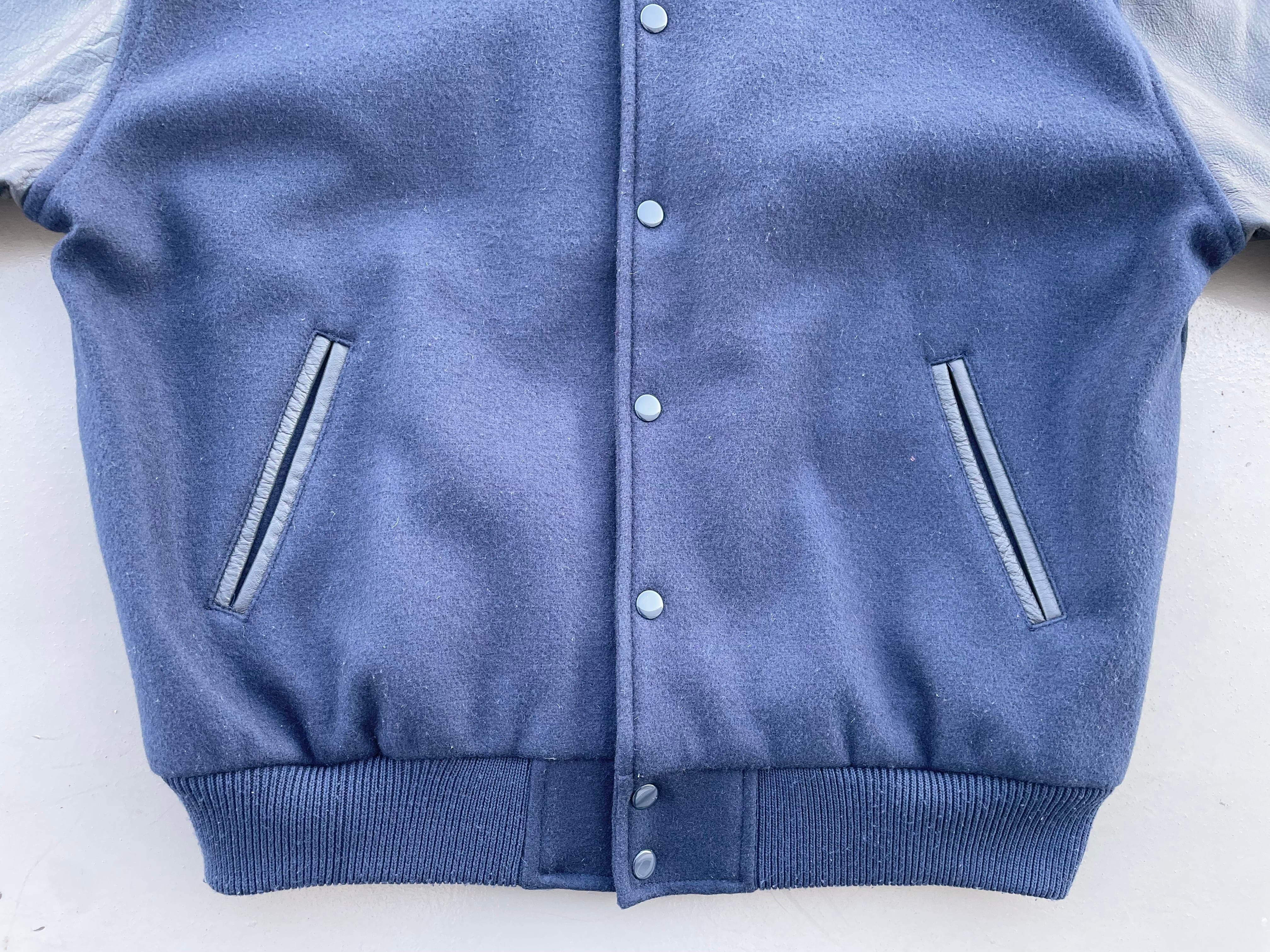 【商品詳細】ビンテージのスタジアムジャンパー。サイズはL。カラーはネイビー。80-90年代USA製。お探しの方も多い完全無地のスタジャン。ボディはウール、スリーブはレザー仕様ながら柔らかく軽い仕上がりでデイリーに着回しやすそうです。ライニングはスリーブやポケット裏も含めパープルカラーのサテン仕様の豪華な作り。