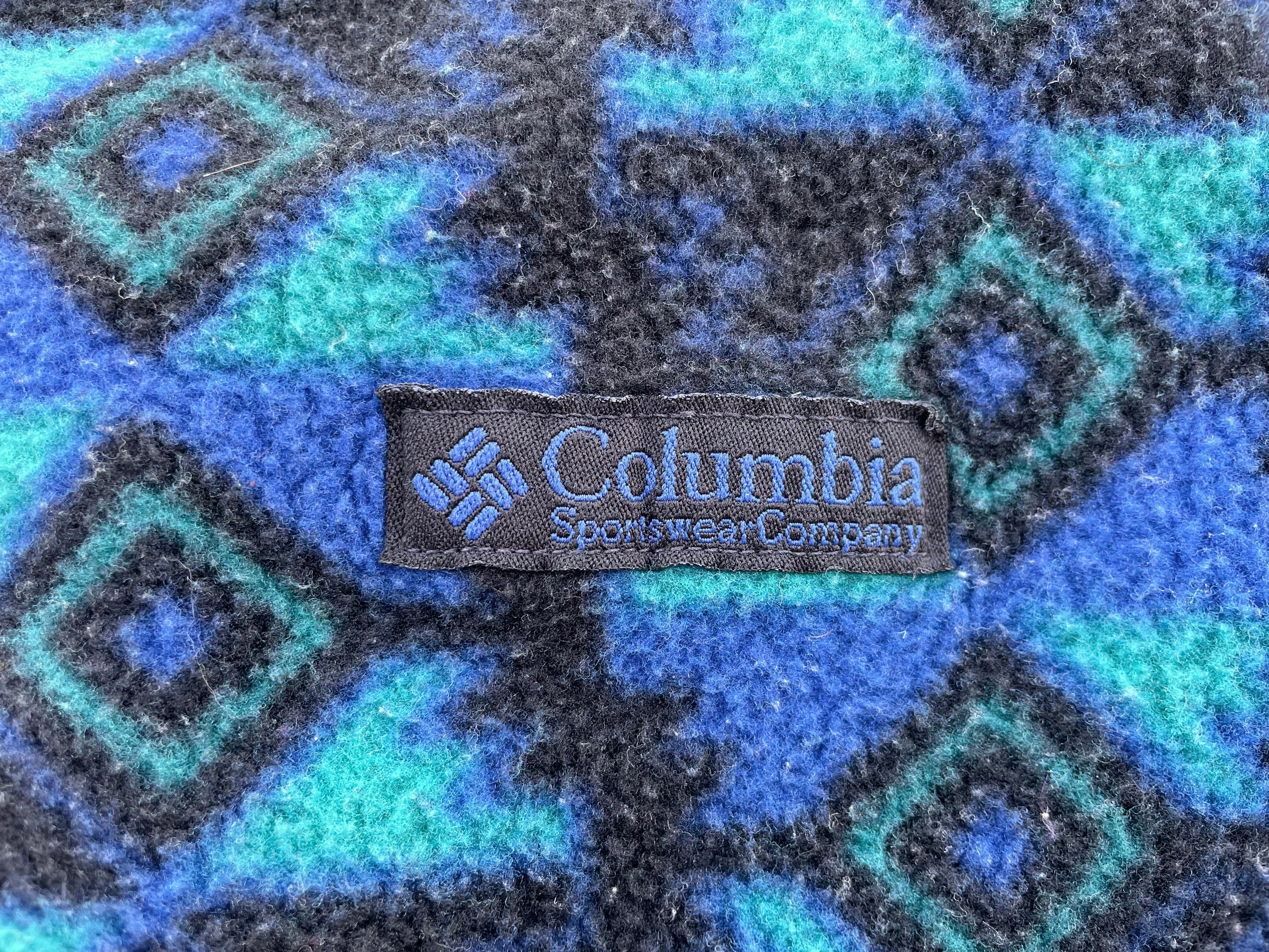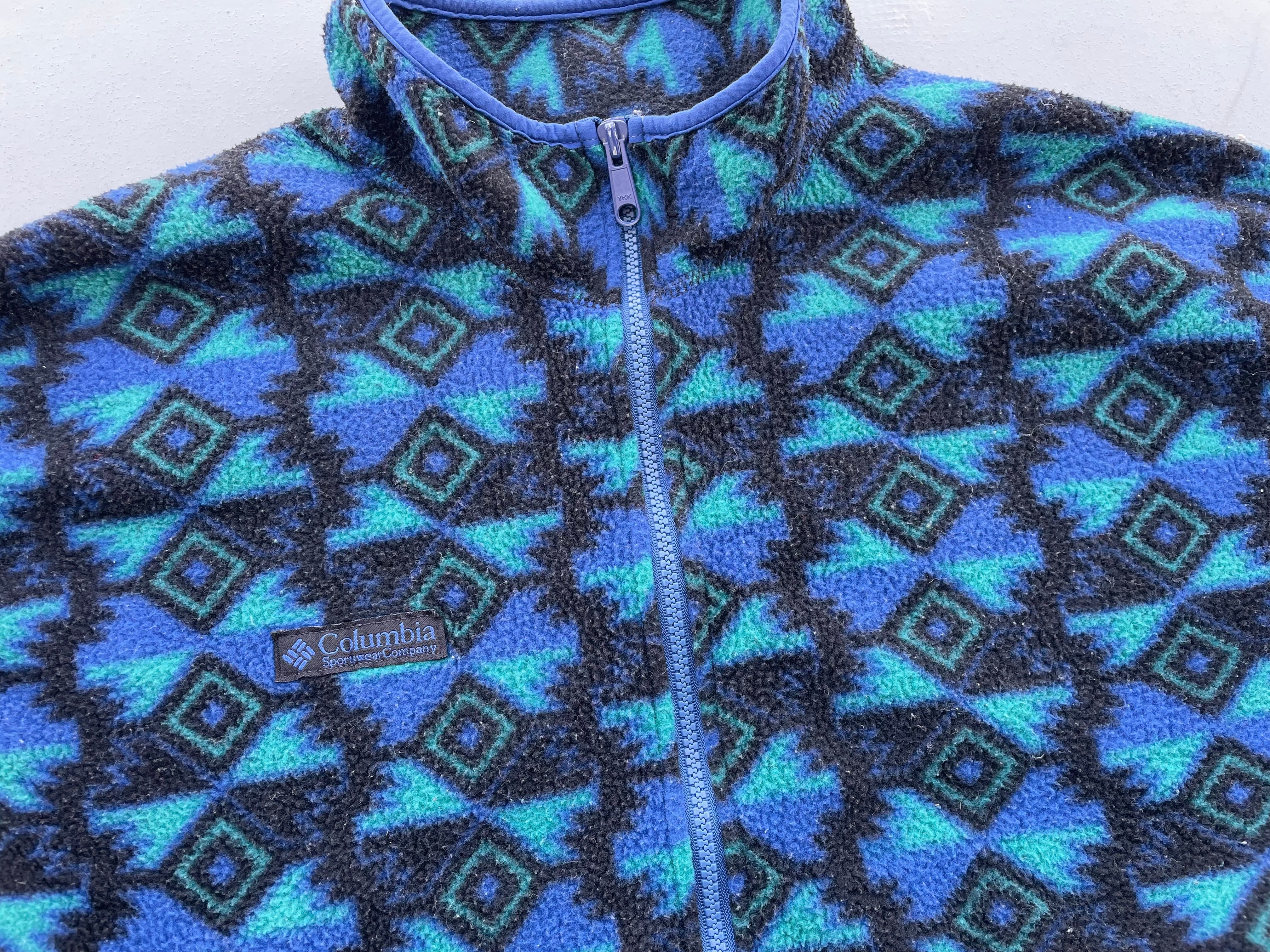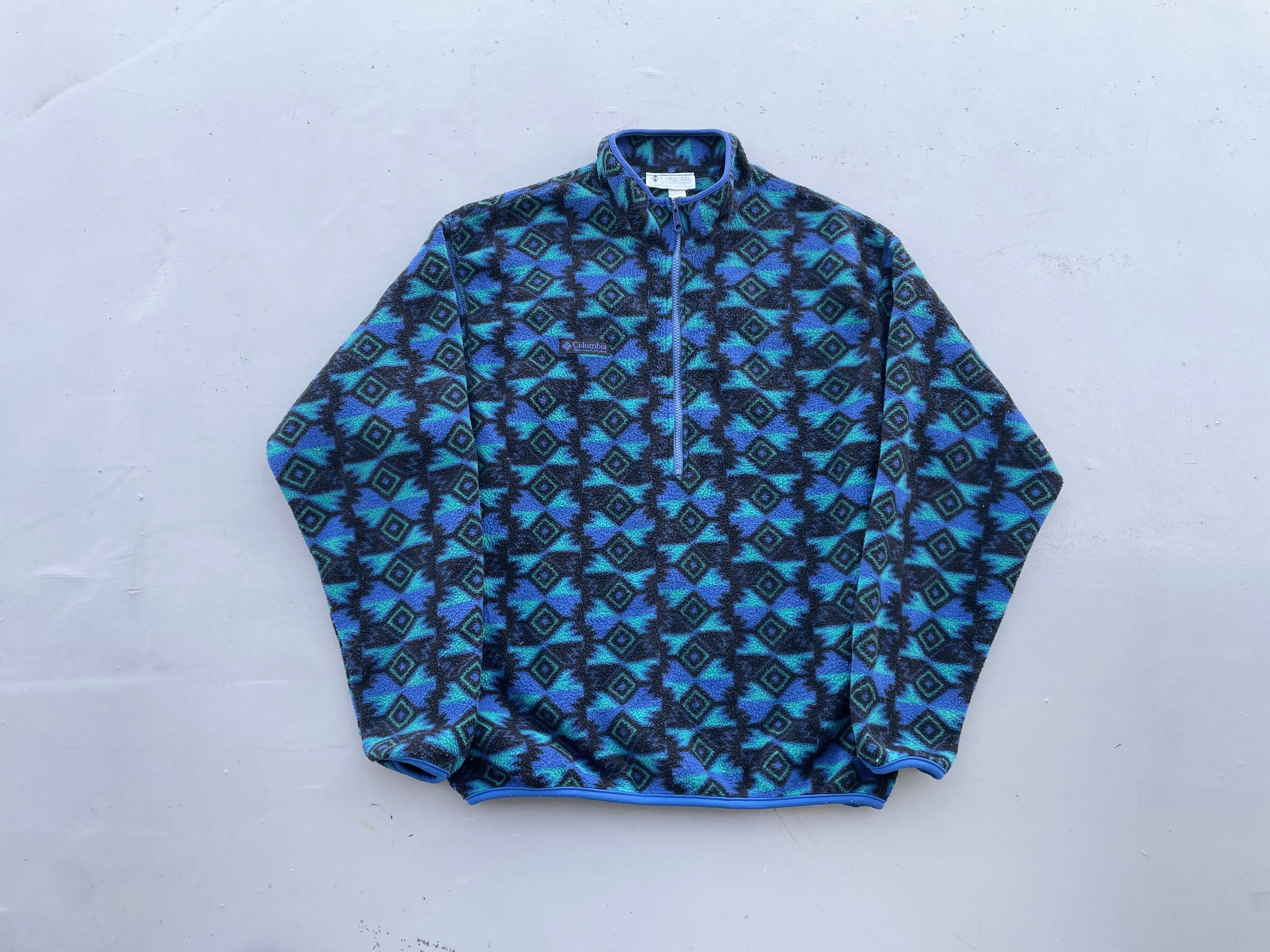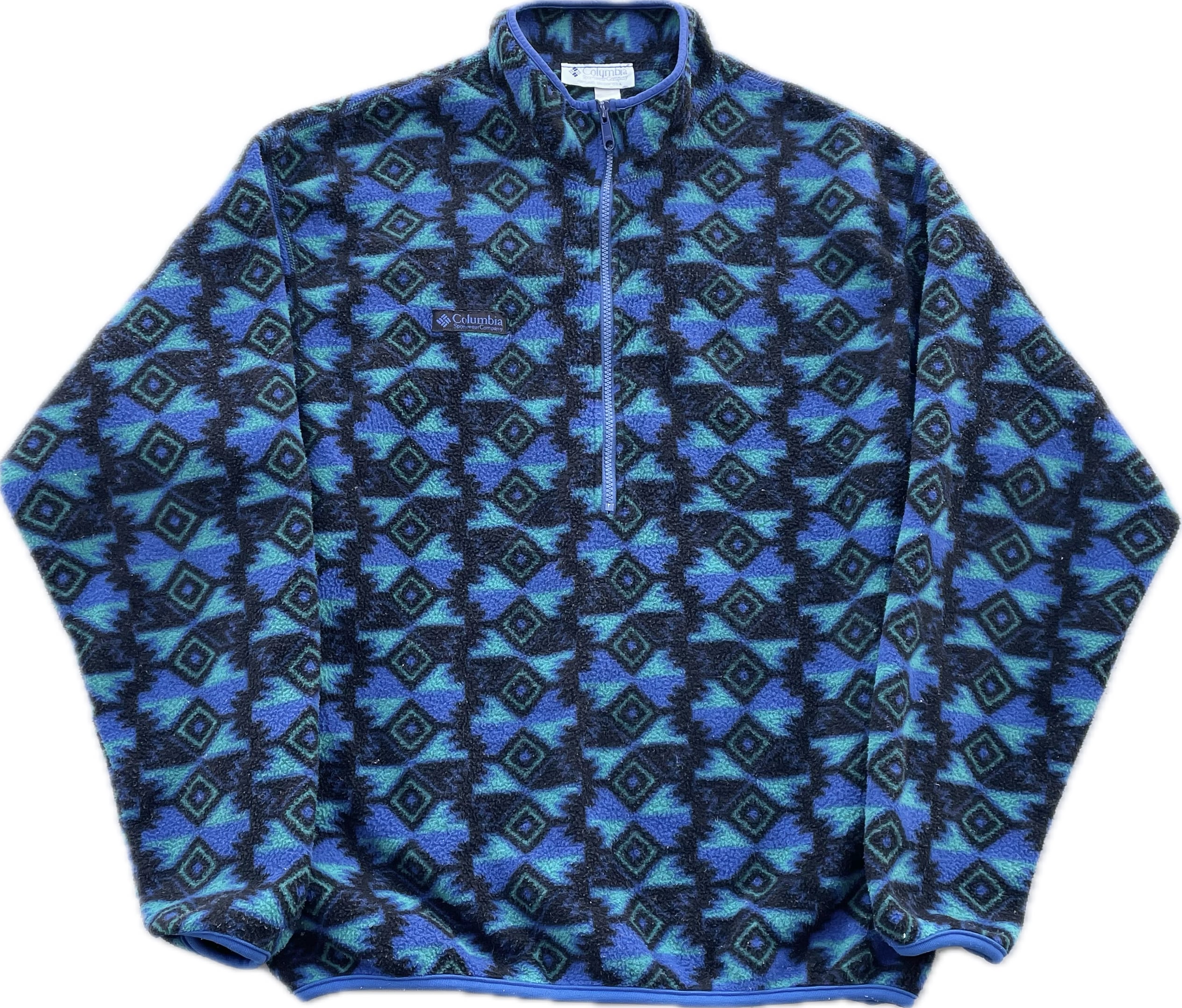 【商品詳細】コロンビアのプルオーバーハーフジップフリースシャツ。サイズはL。カラーはブルーベースの総柄パターン。90年代USA製。全面にブルズアイ模様がプリントされた尖ったデザインの一着。カラーも独特で個性強めの一着。サイズも大きめで良い調子です。