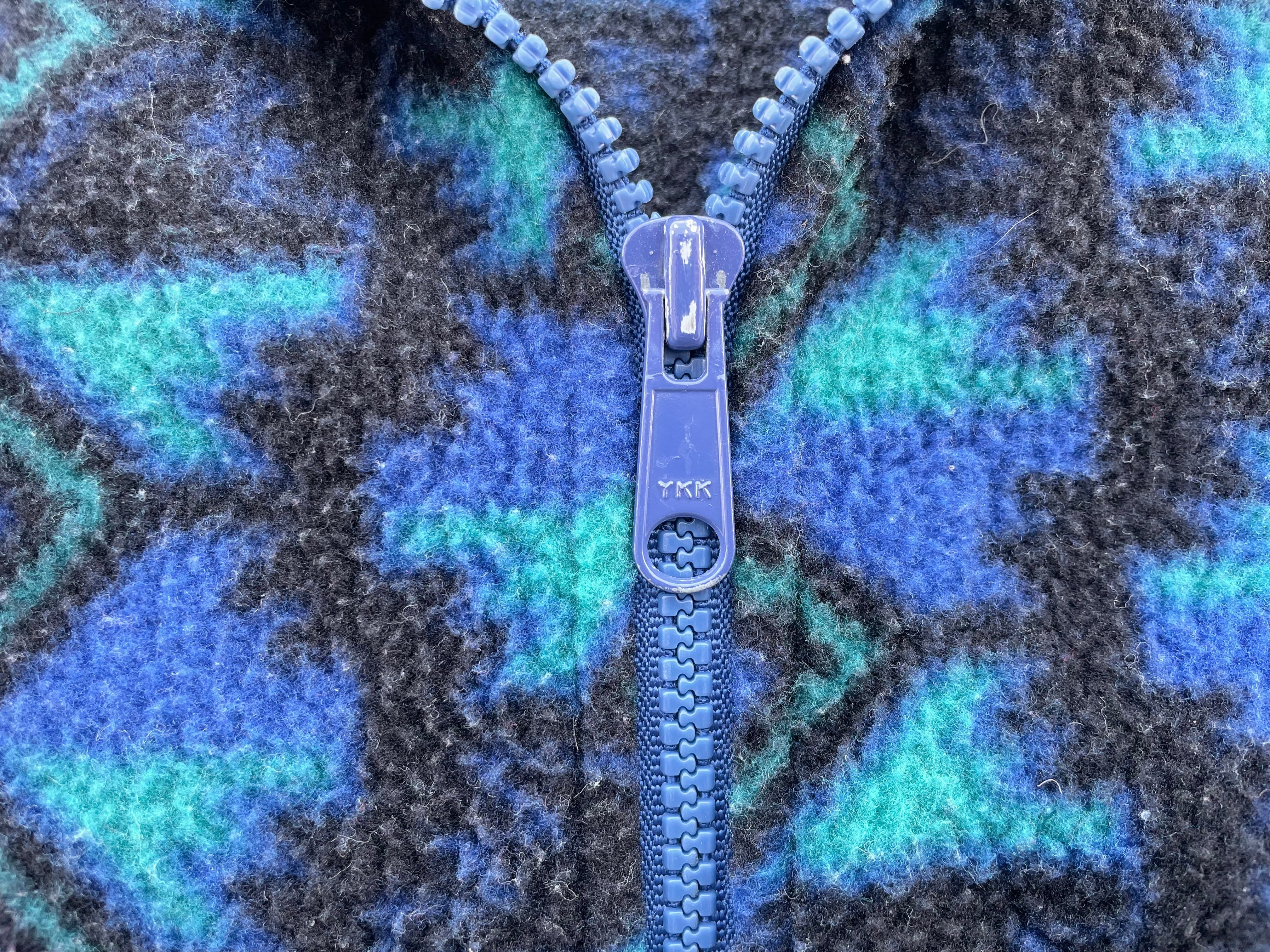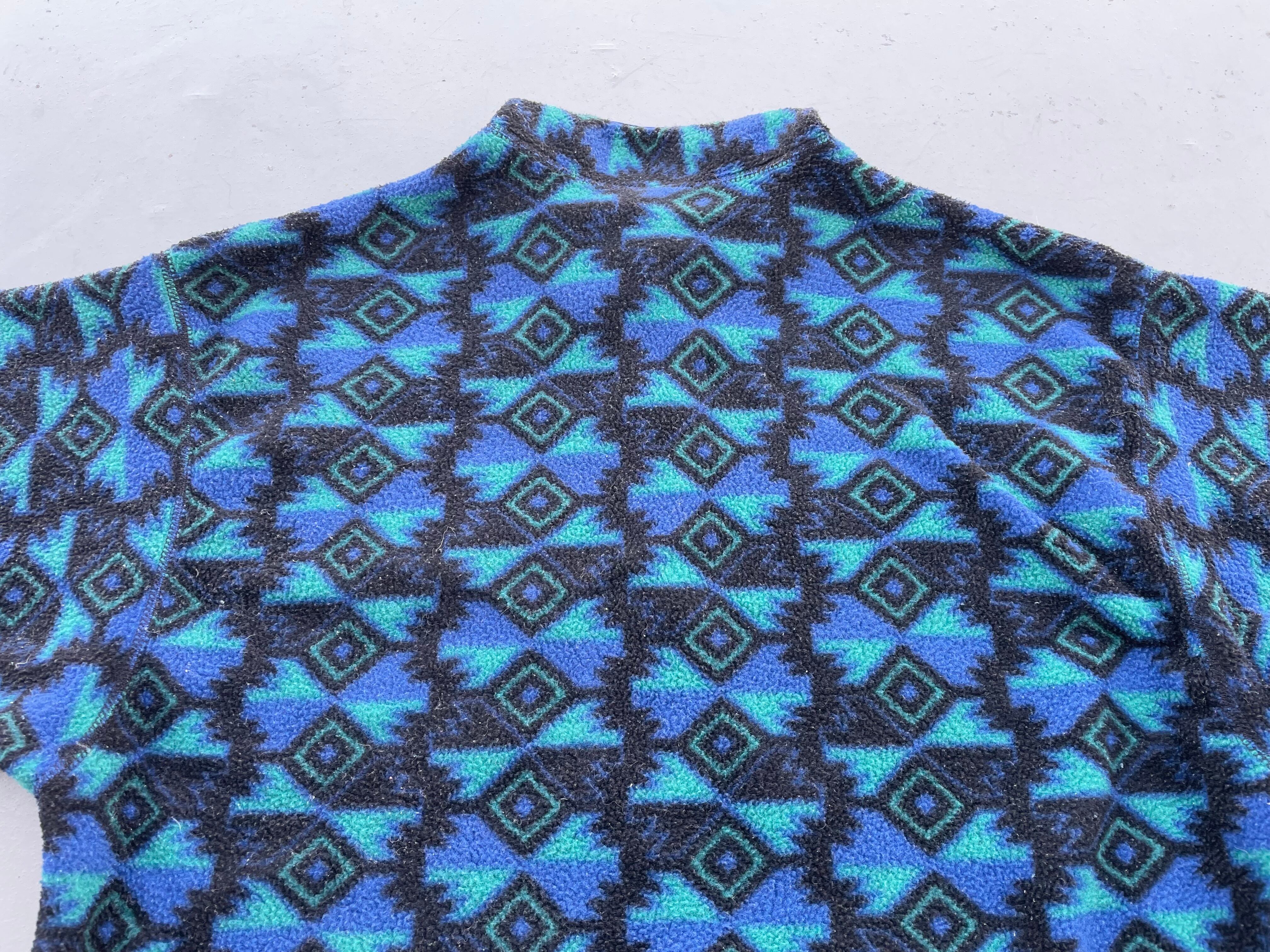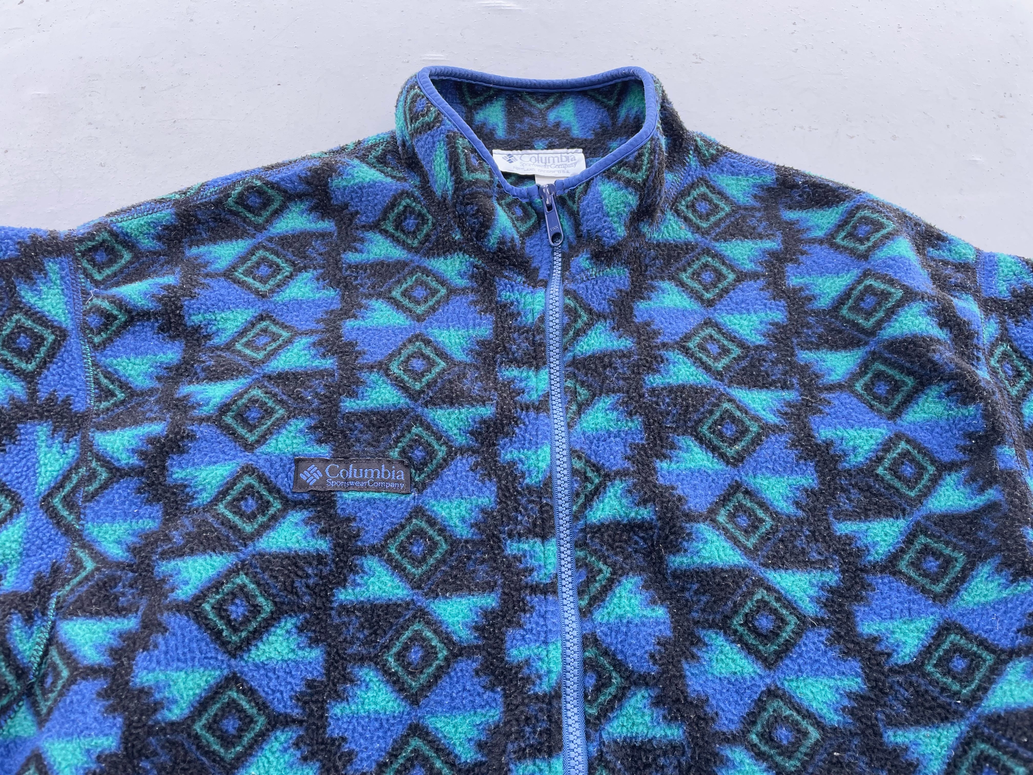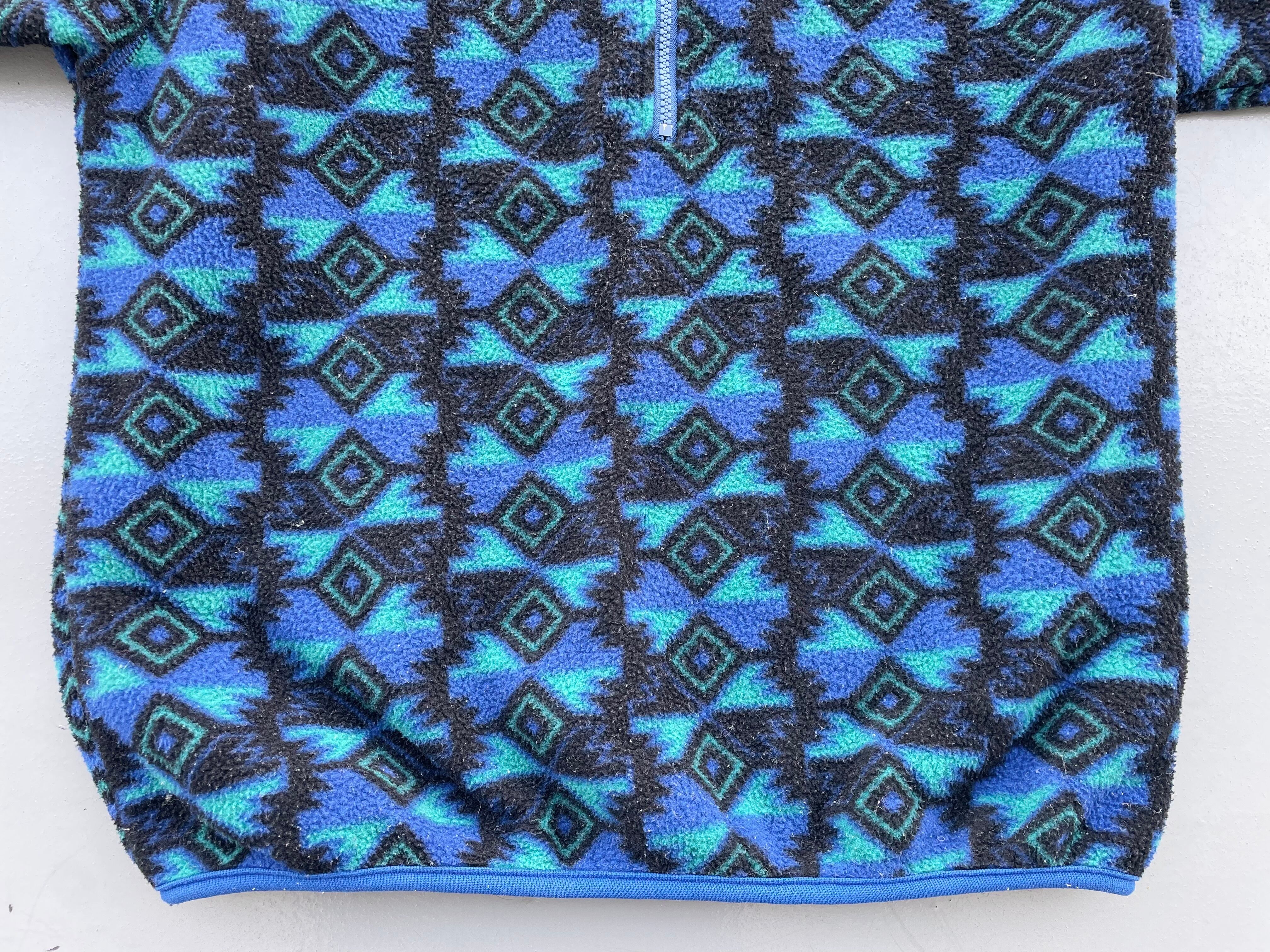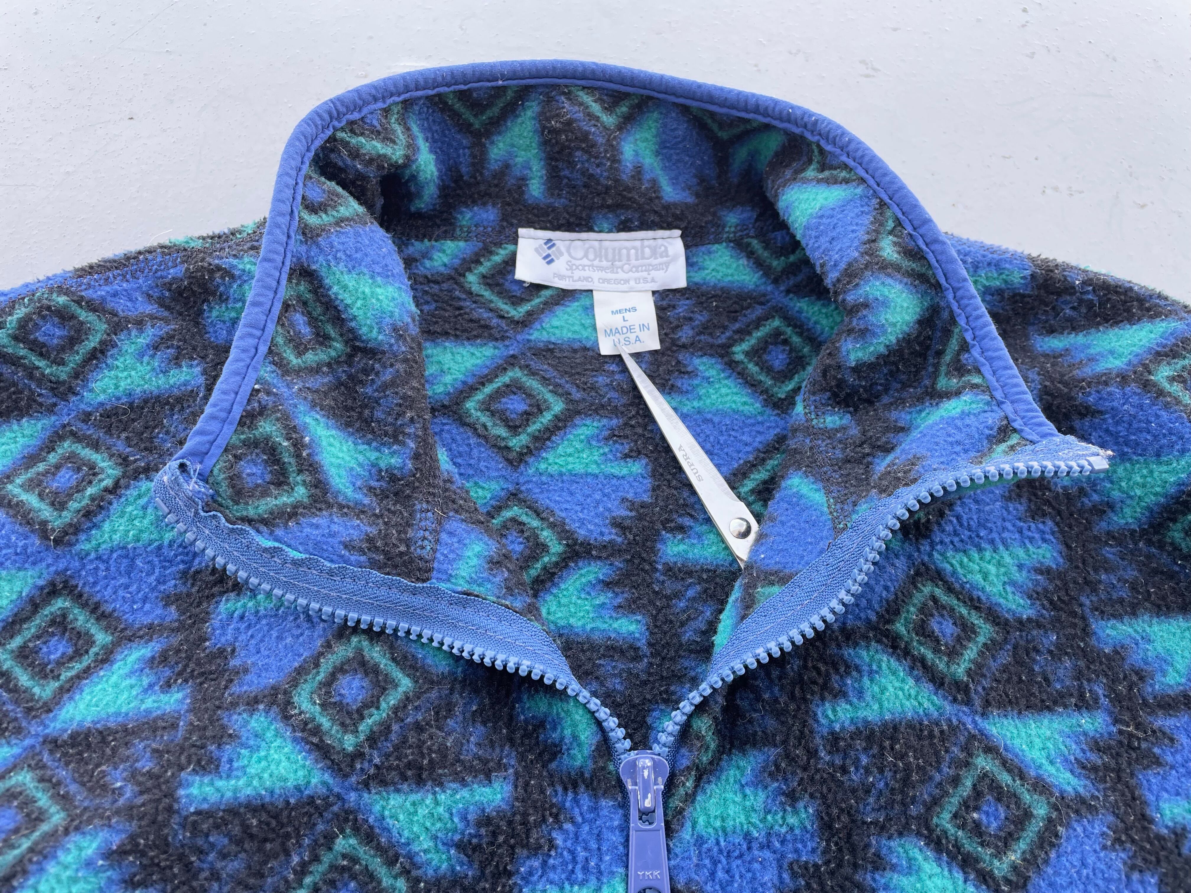 【商品詳細】コロンビアのプルオーバーハーフジップフリースシャツ。サイズはL。カラーはブルーベースの総柄パターン。90年代USA製。全面にブルズアイ模様がプリントされた尖ったデザインの一着。カラーも独特で個性強めの一着。サイズも大きめで良い調子です。