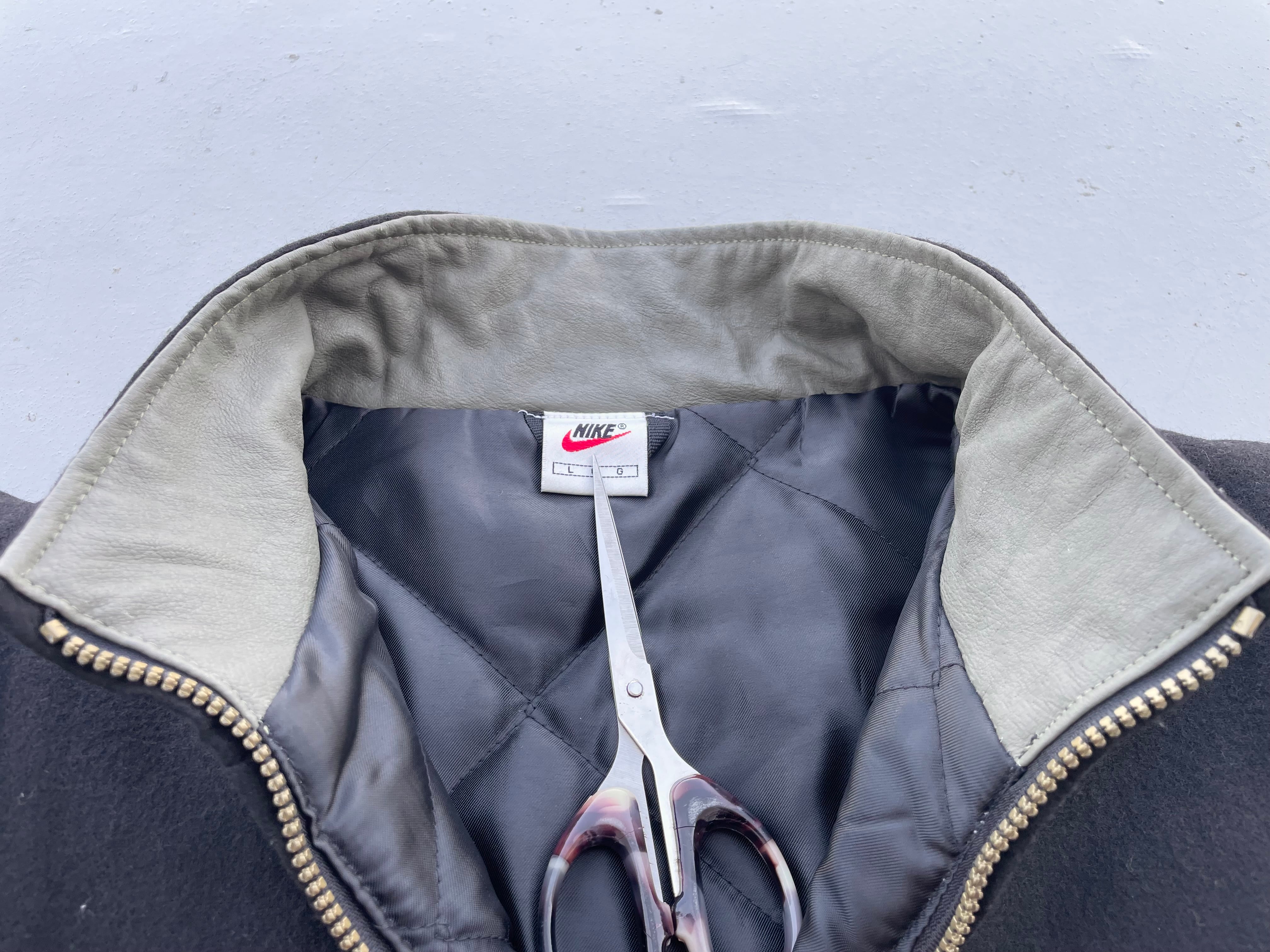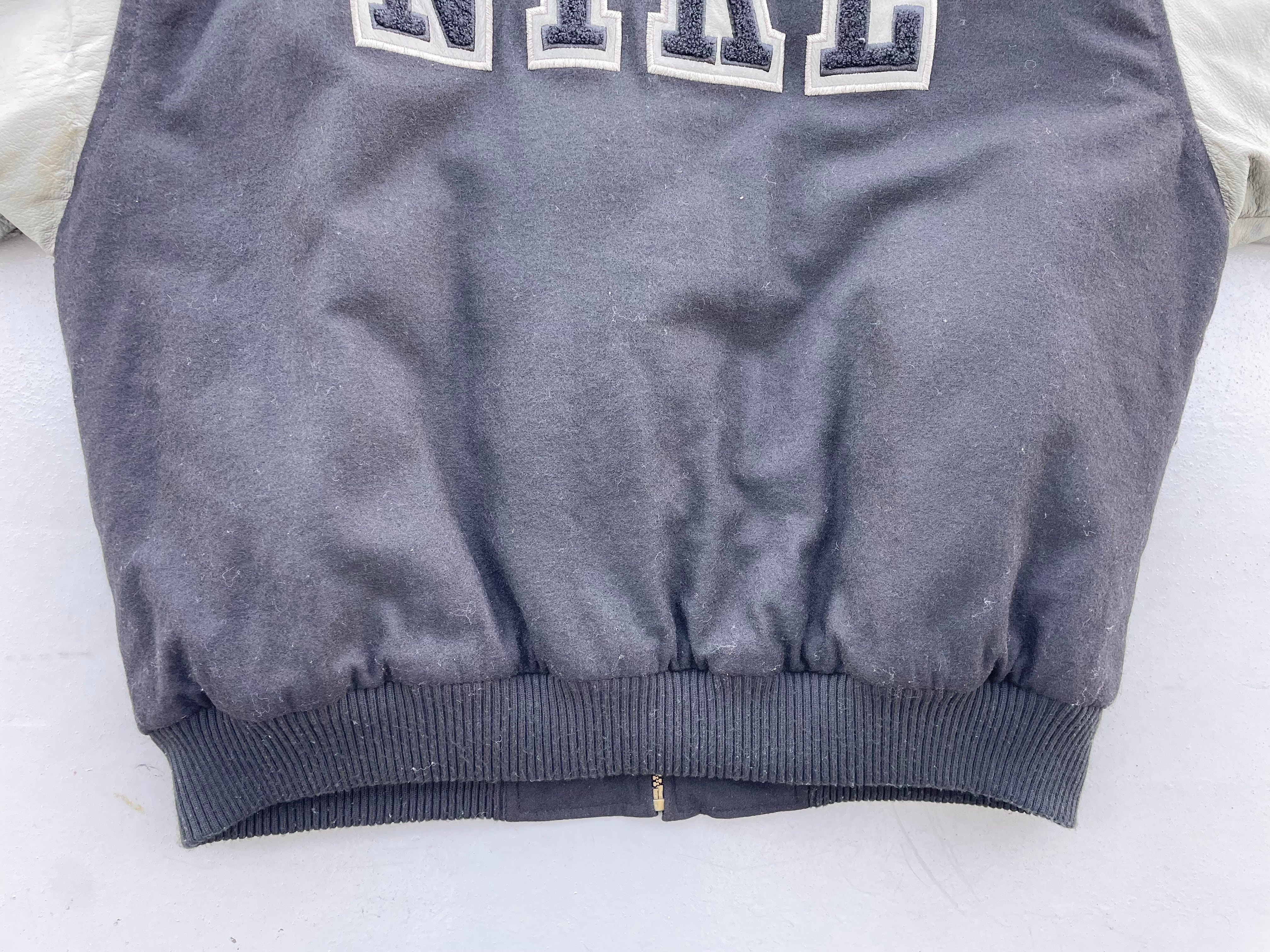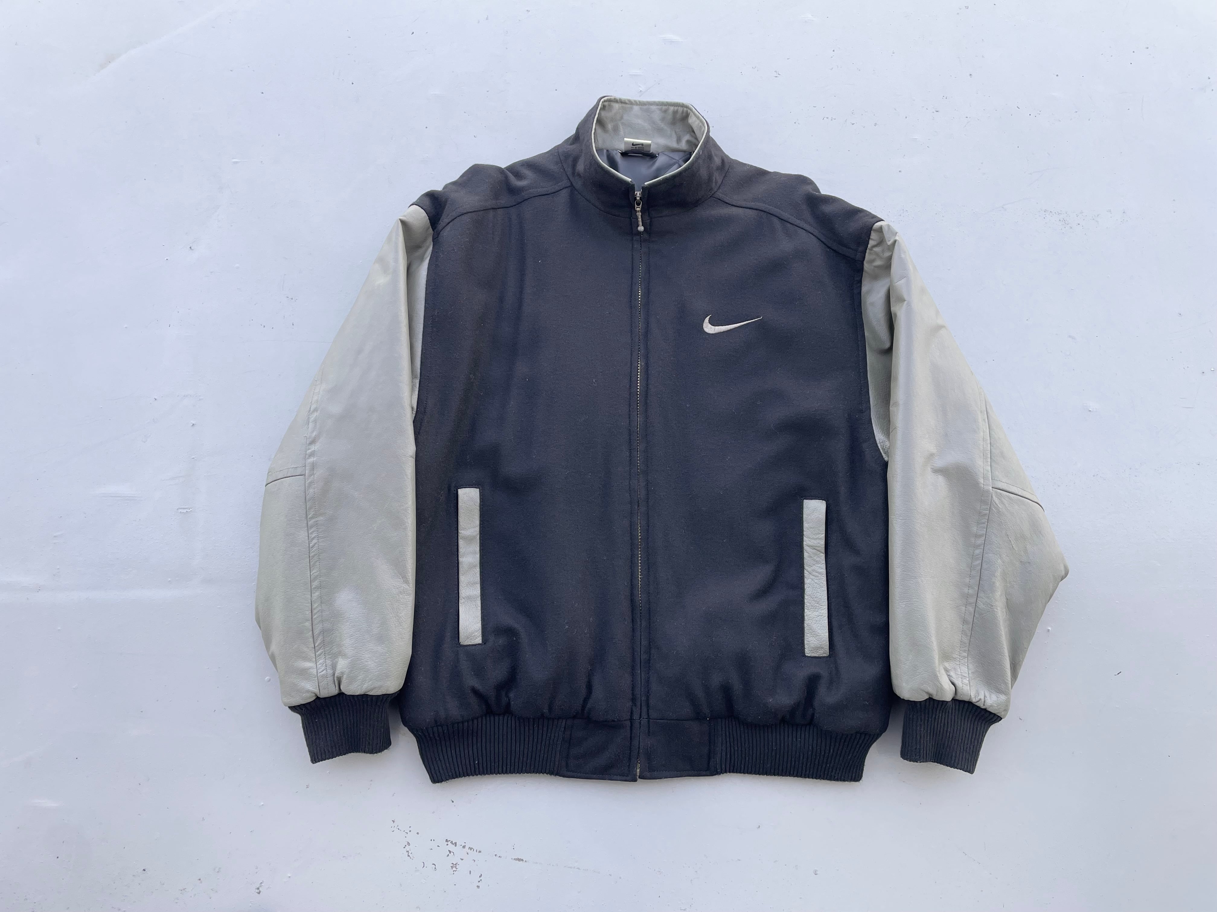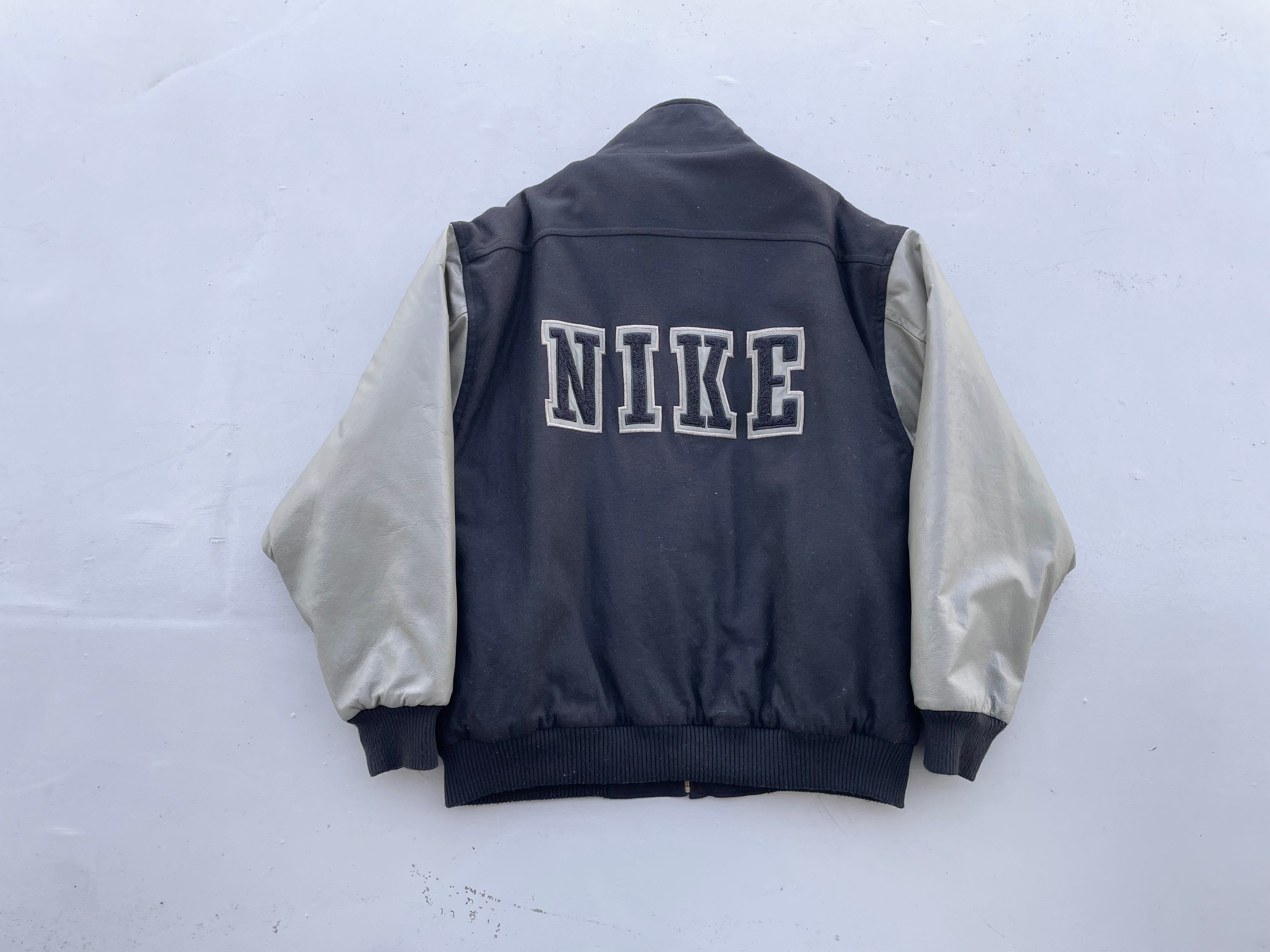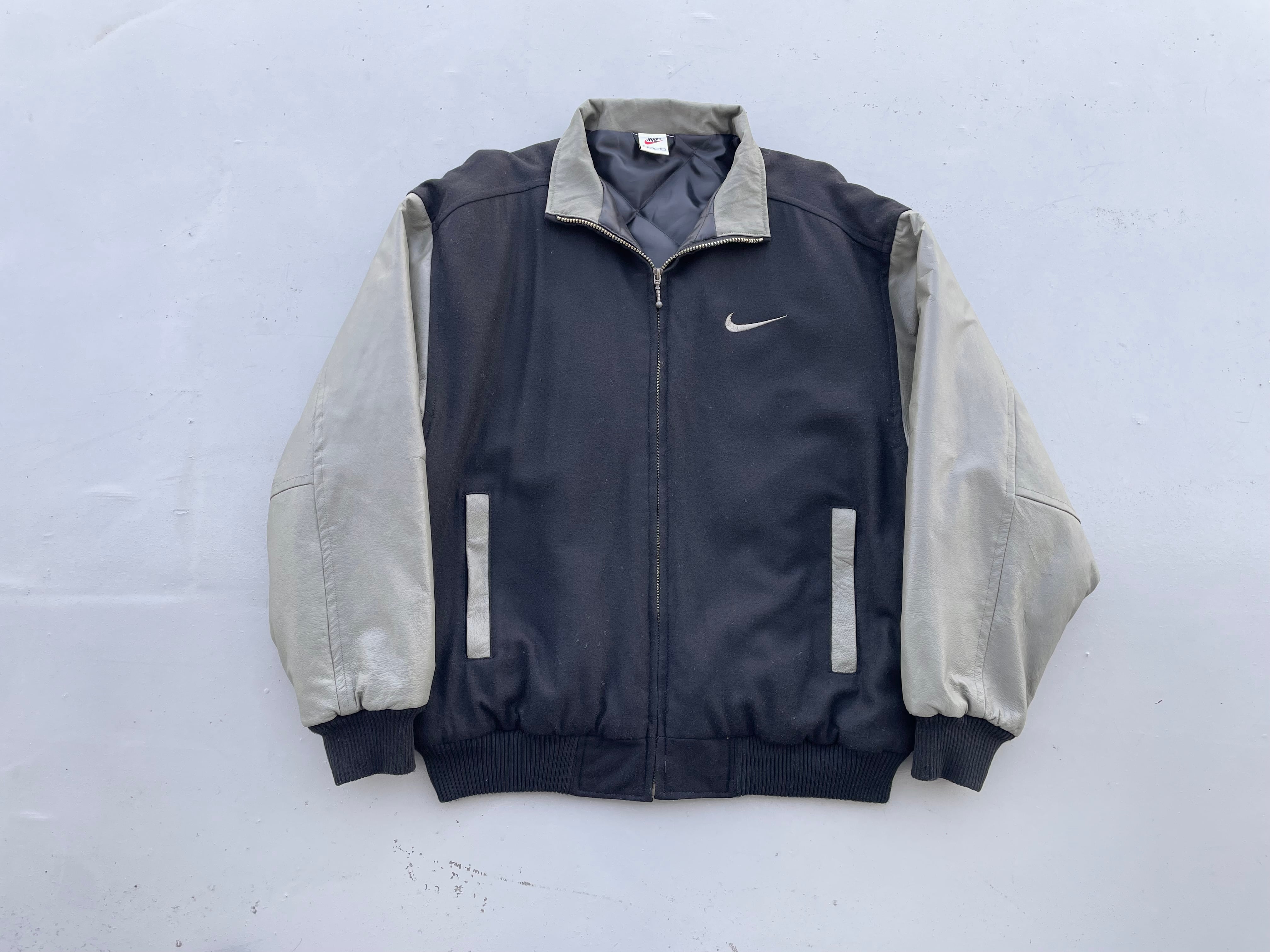 【商品詳細】ナイキのスタジアムジャンパー。サイズはL。カラーはブラック。90年代中国製。珍しいフルジップ仕様のスタンドカラータイプのスタジャン。ボディはウール、スリーブはレザー仕様でありながら軽い仕上がりでデイリーに着回しやすそうです。レザーがオリーブカラーなのがクールです。