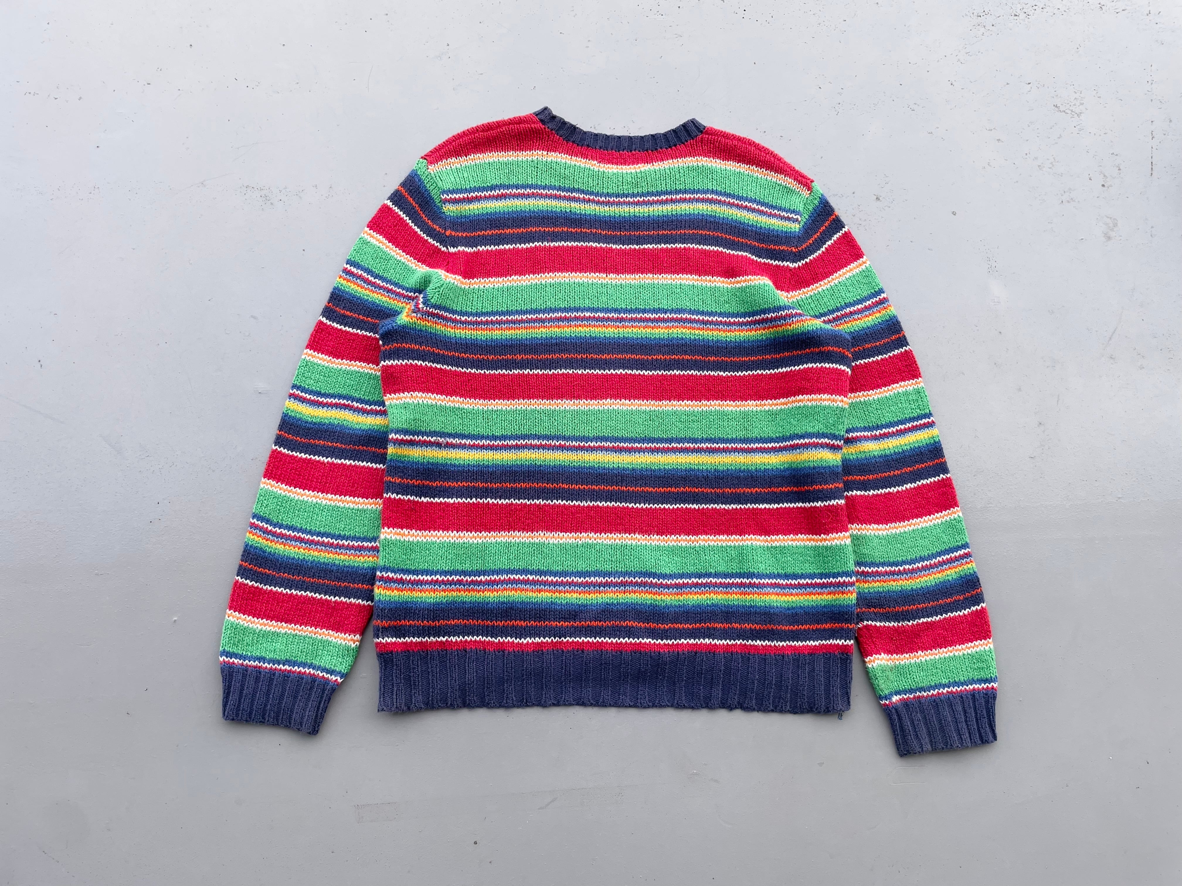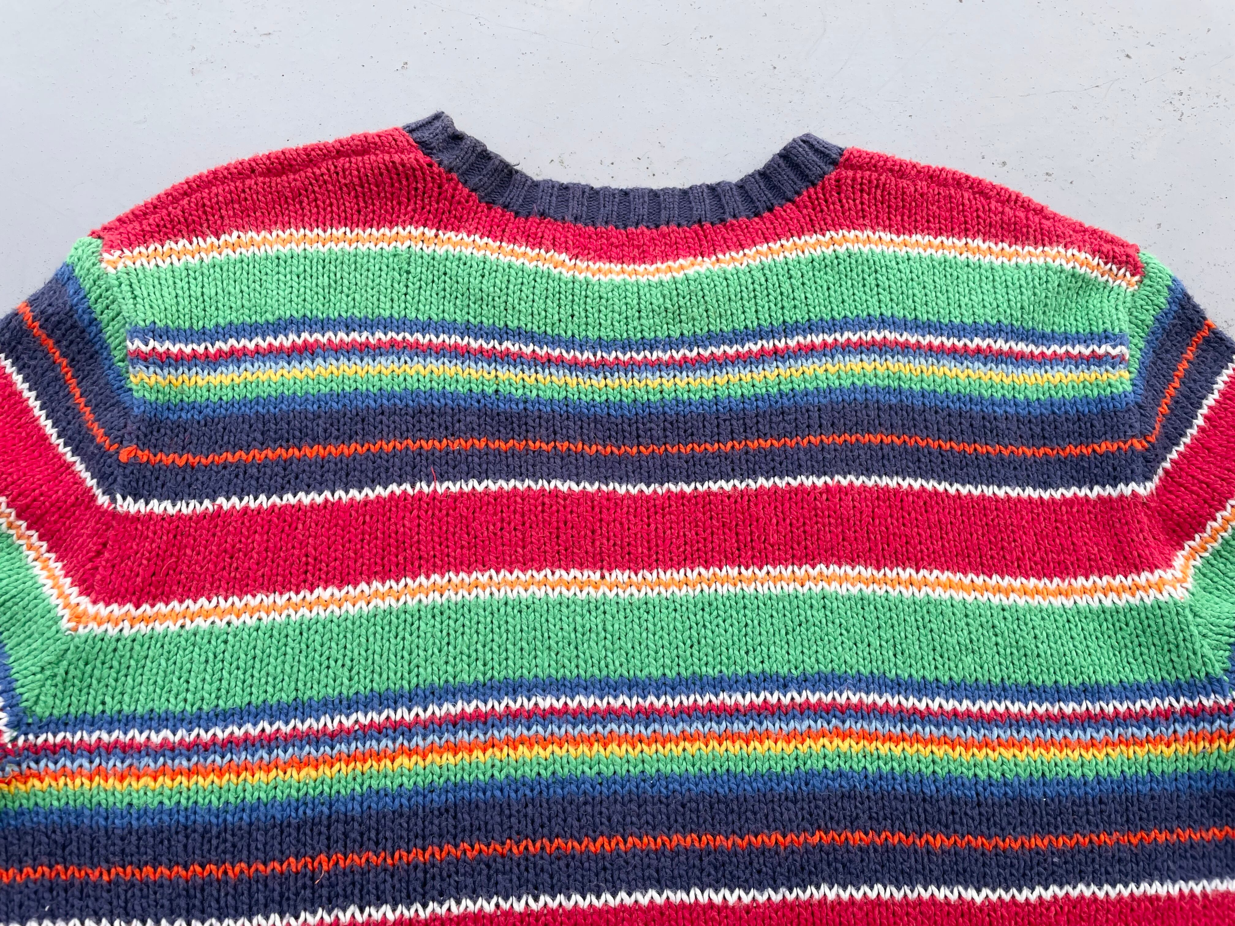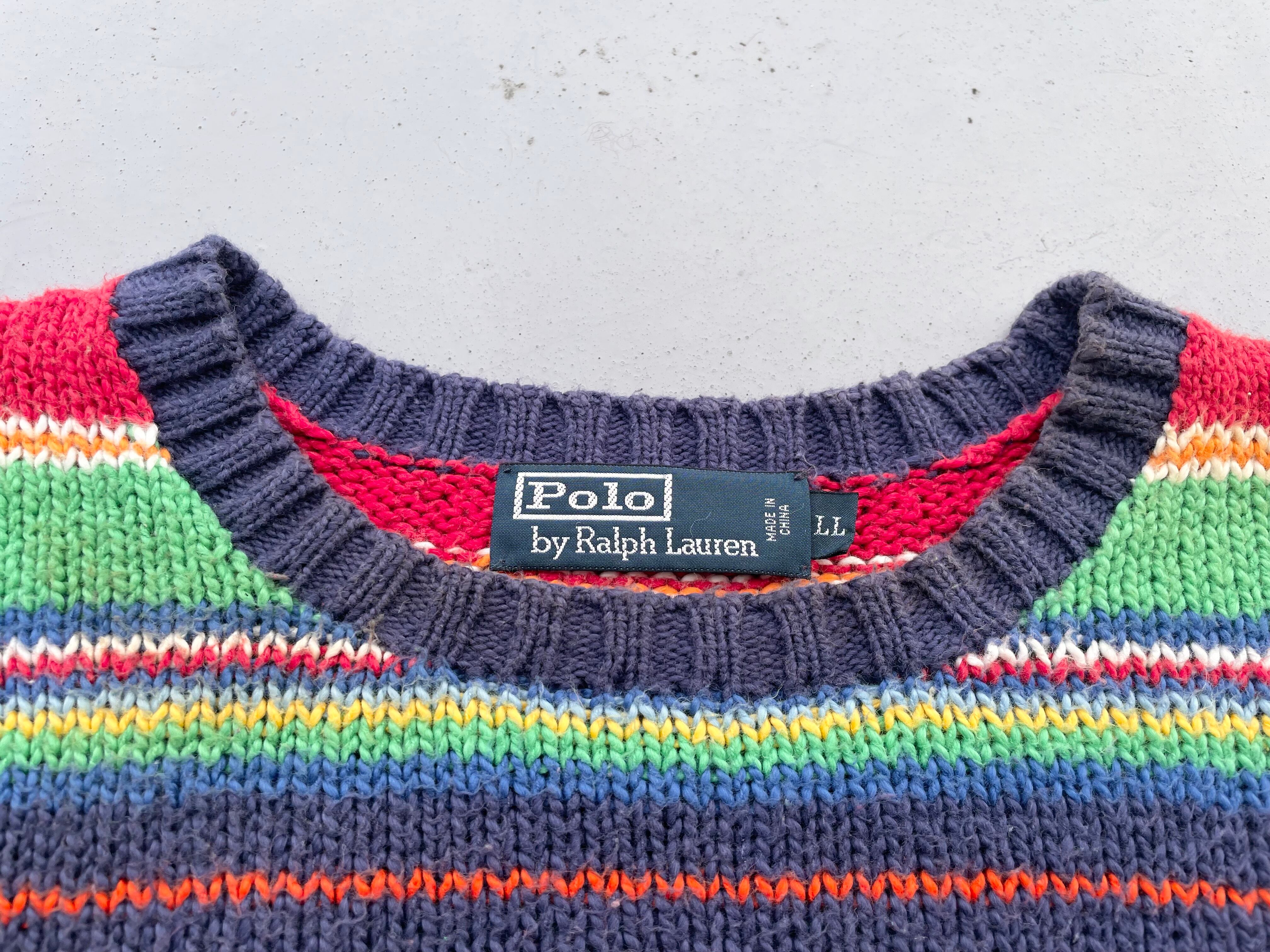 【商品詳細】ラルフローレンのコットンニット。サイズはLL(XL)。カラーはマルチカラー。90-00年代中国製。多彩な色使いと様々なピッチのボーダーが入る洒落た一着。意外と着やすい配色で重宝するかと。LLですが大きすぎず着れるサイズ感かと。