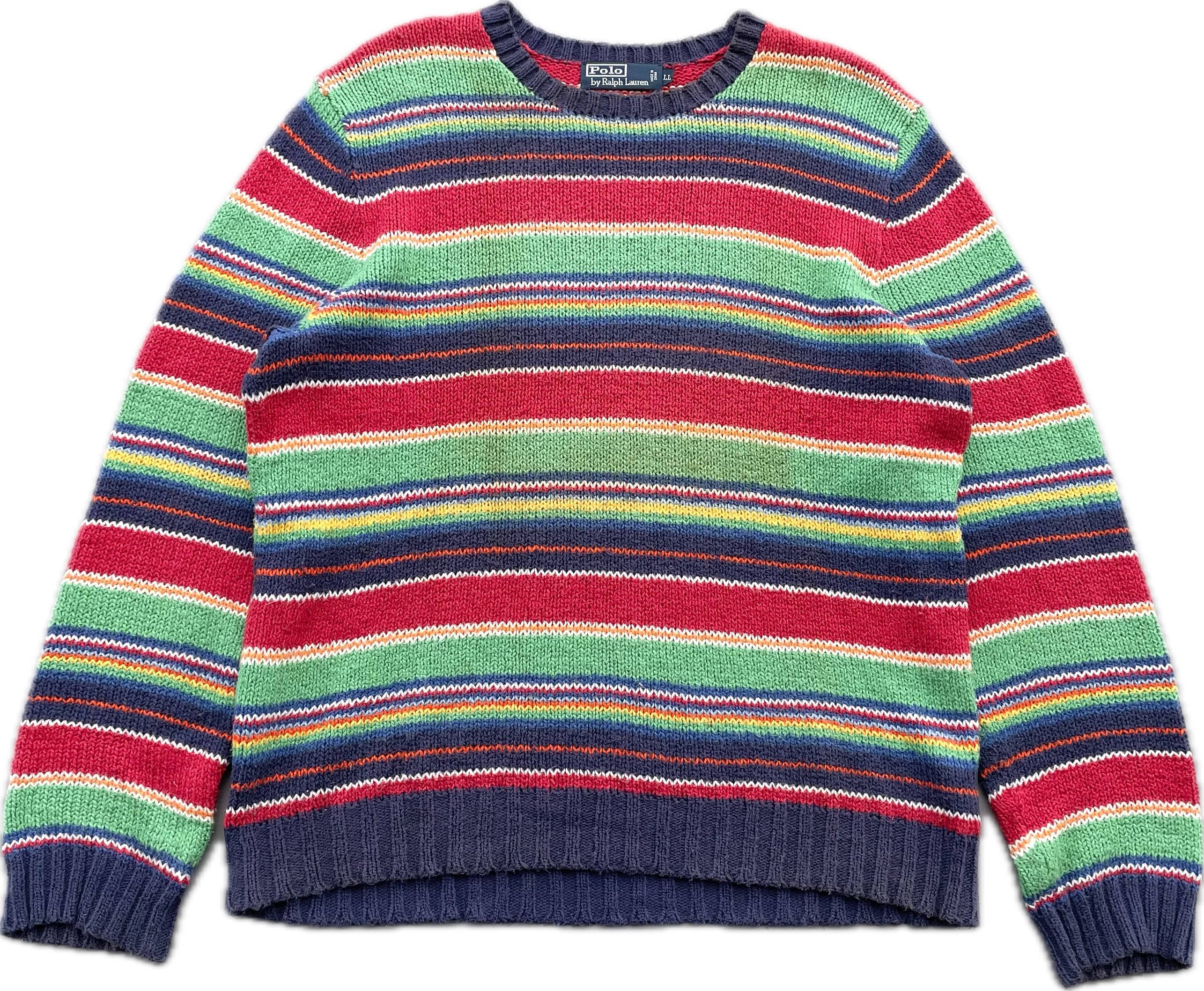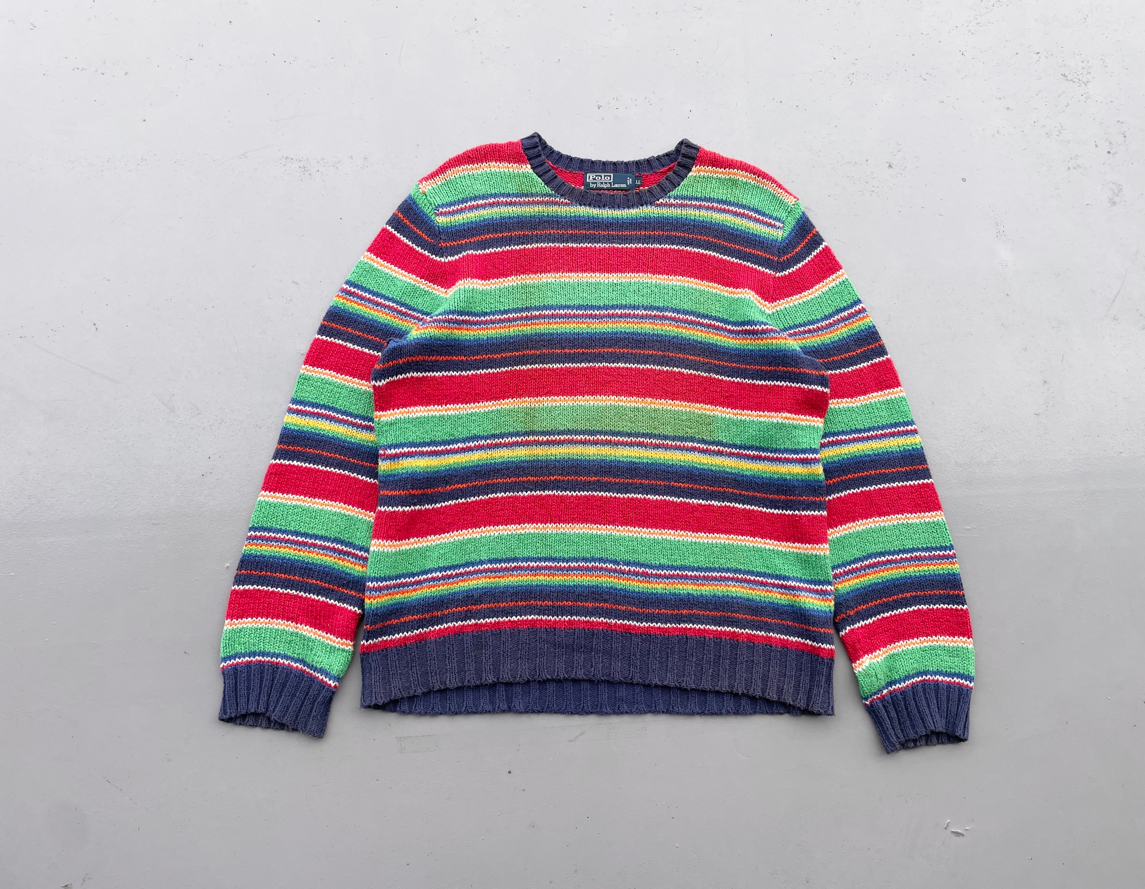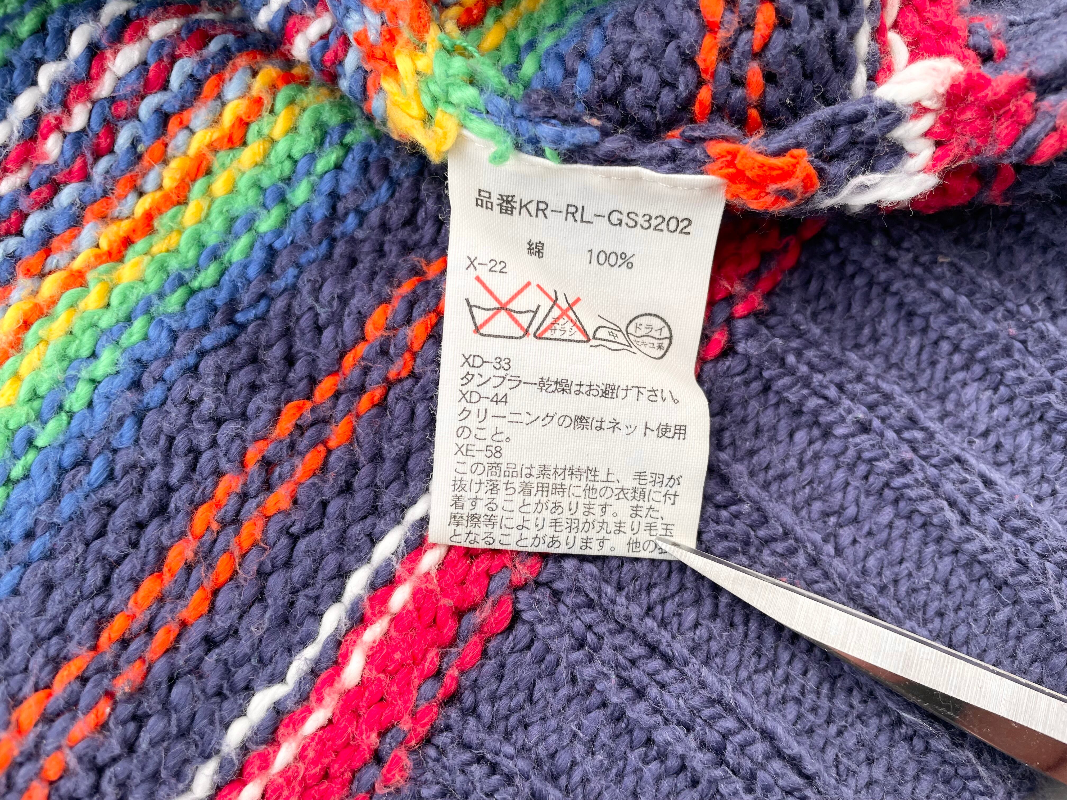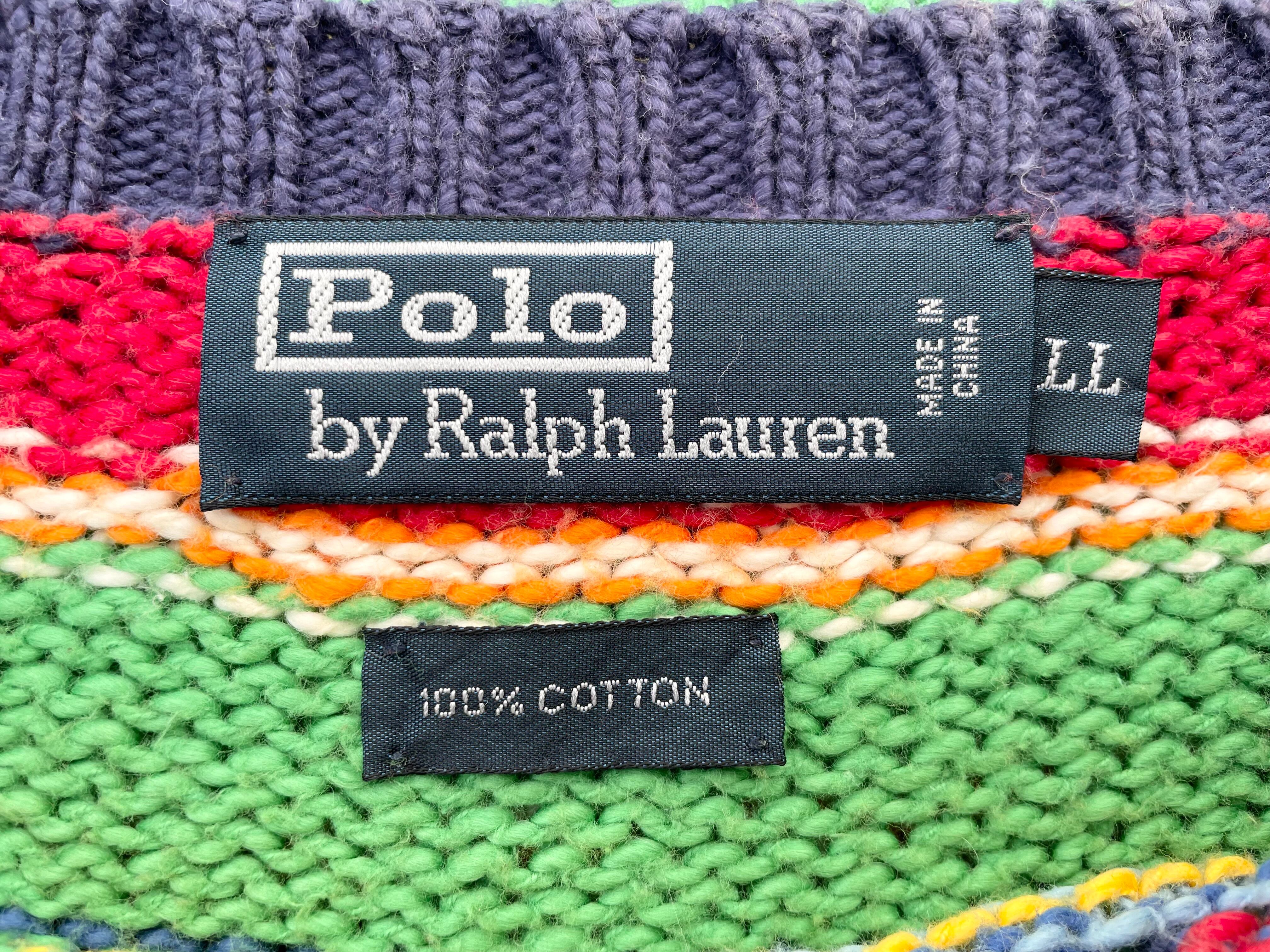 【商品詳細】ラルフローレンのコットンニット。サイズはLL(XL)。カラーはマルチカラー。90-00年代中国製。多彩な色使いと様々なピッチのボーダーが入る洒落た一着。意外と着やすい配色で重宝するかと。LLですが大きすぎず着れるサイズ感かと。