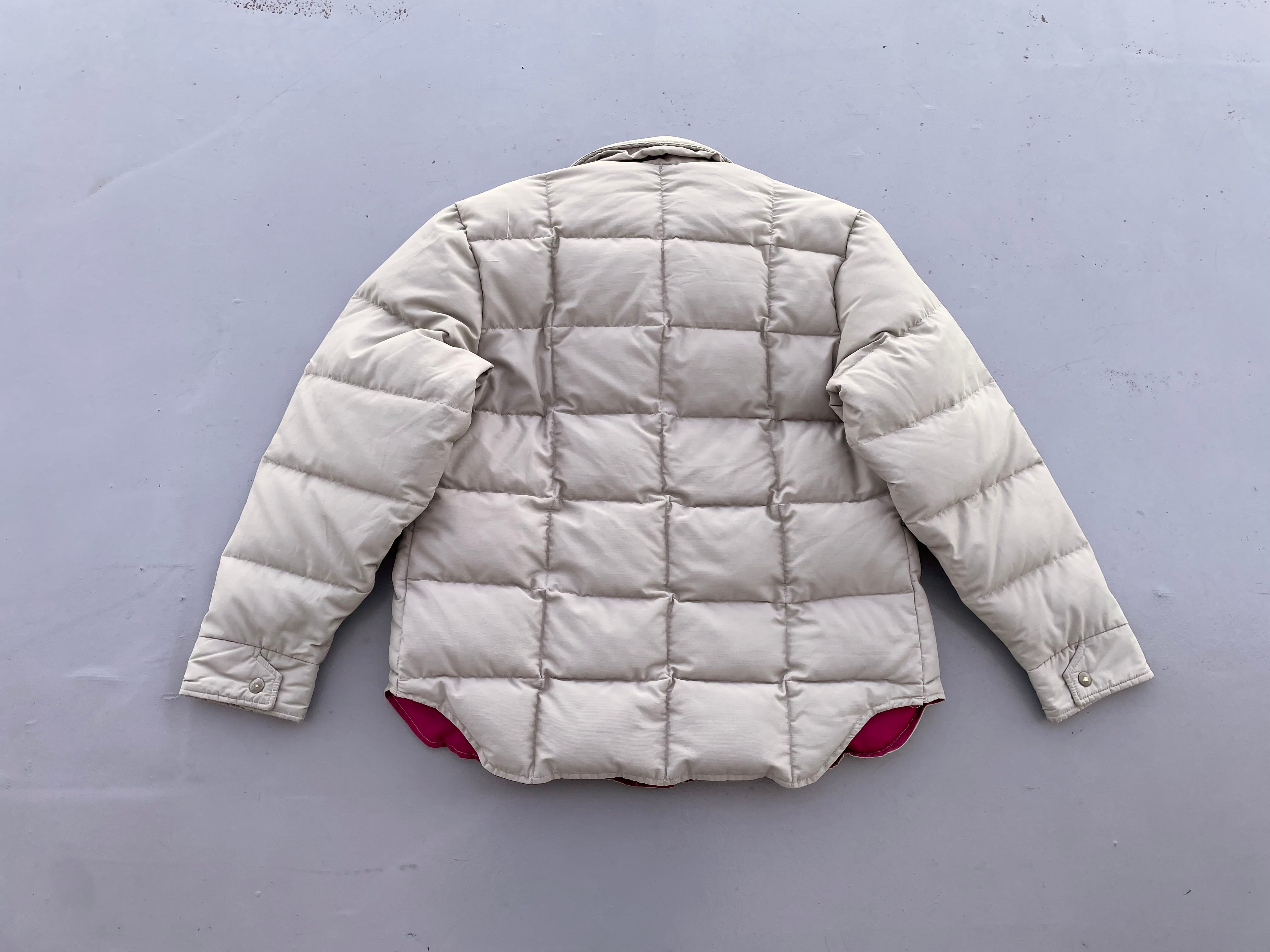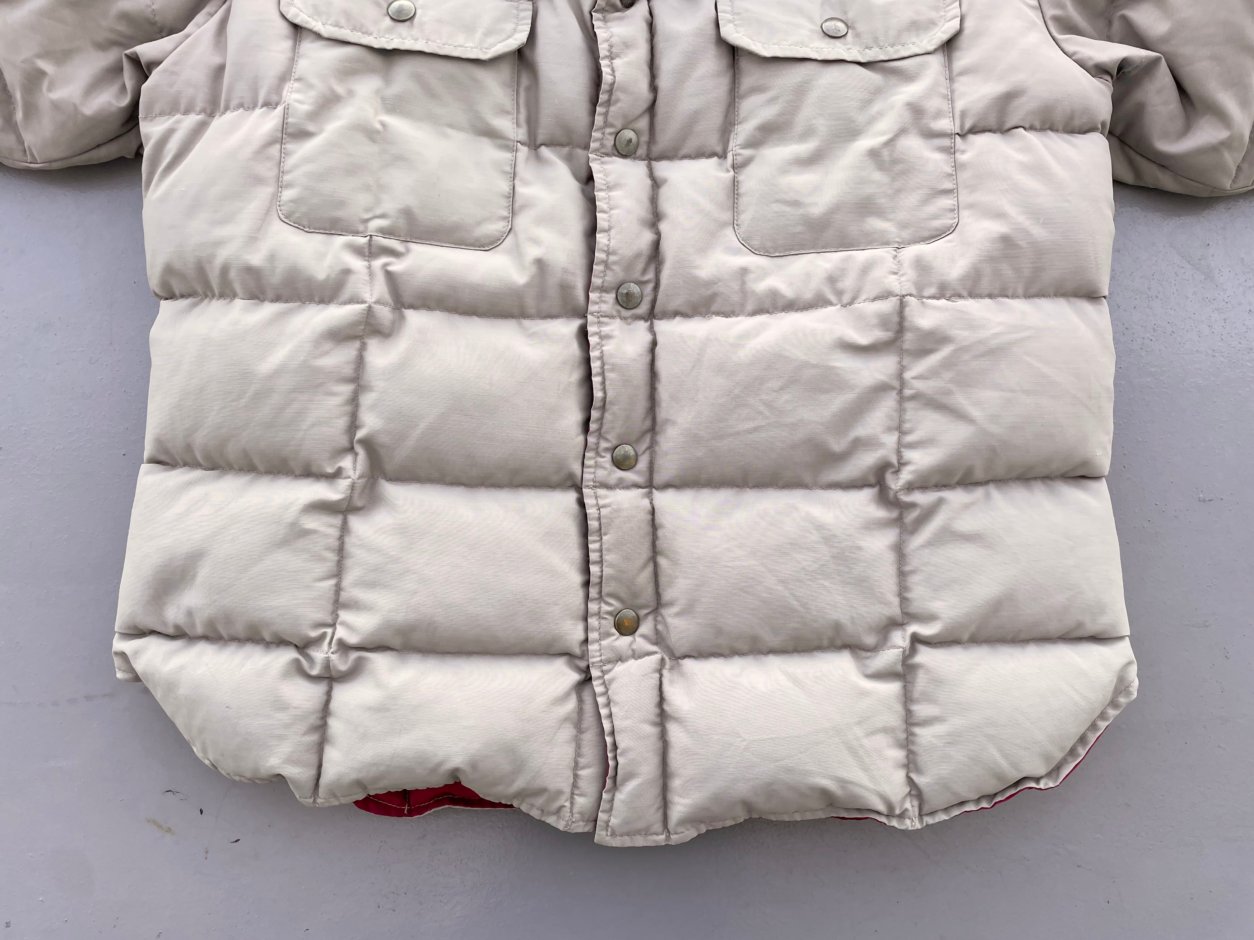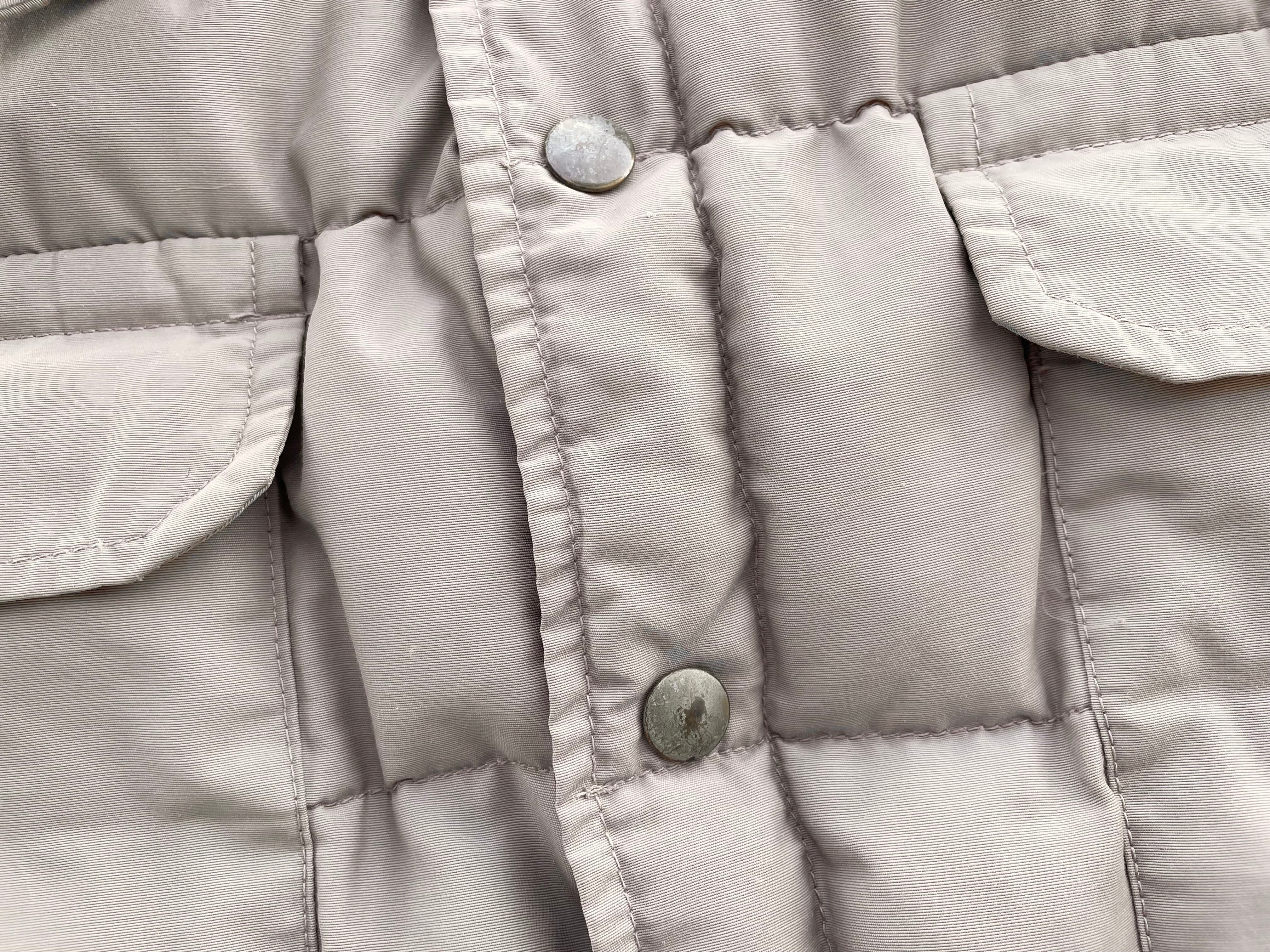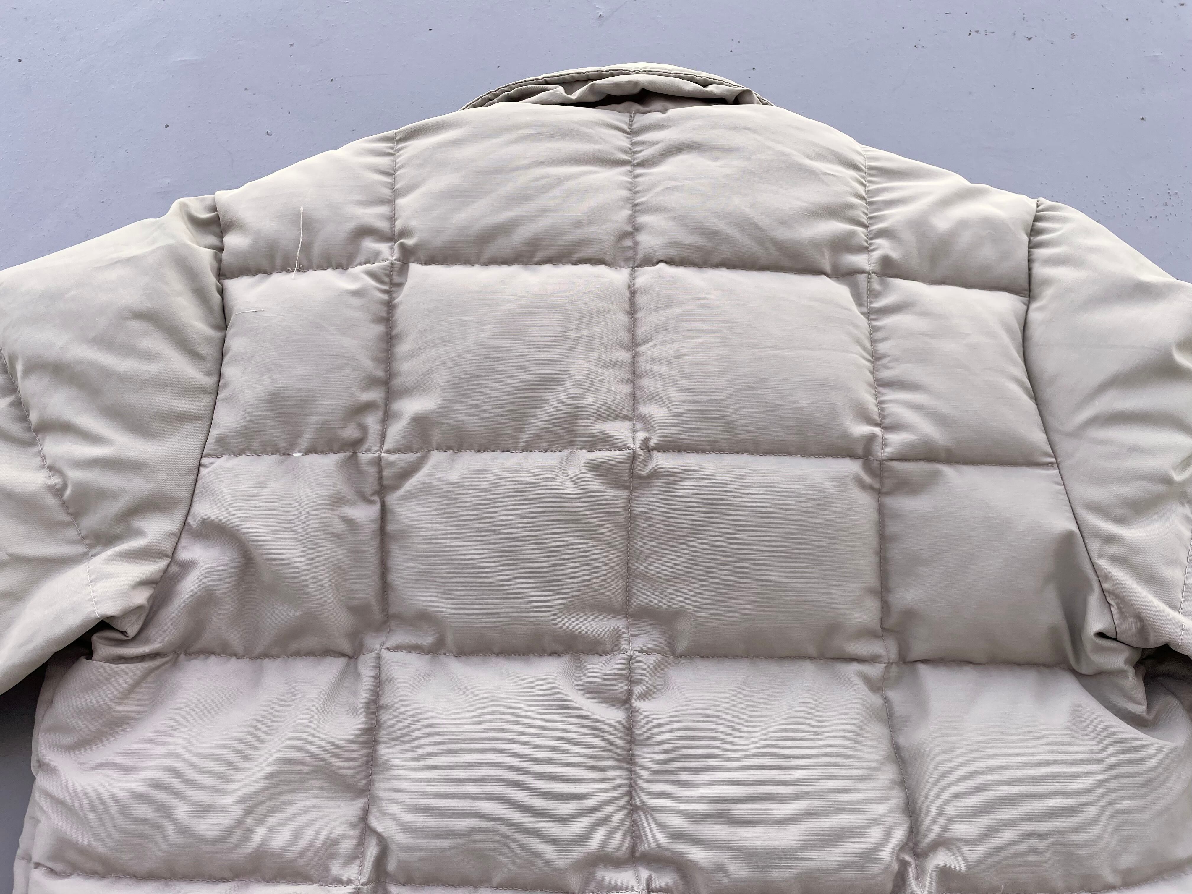 【商品詳細】オービスのダウンシャツジャケット。サイズはLARGE。カラーはベージュ。90年代USA製。珍しいダウン入りのシャツジャケット物。コットンポリ混紡のハリのある生地にダウンが入るディテールで今時期重宝しそうです。他マス目状縫製やバイカラーなライニング等手が凝ってます。