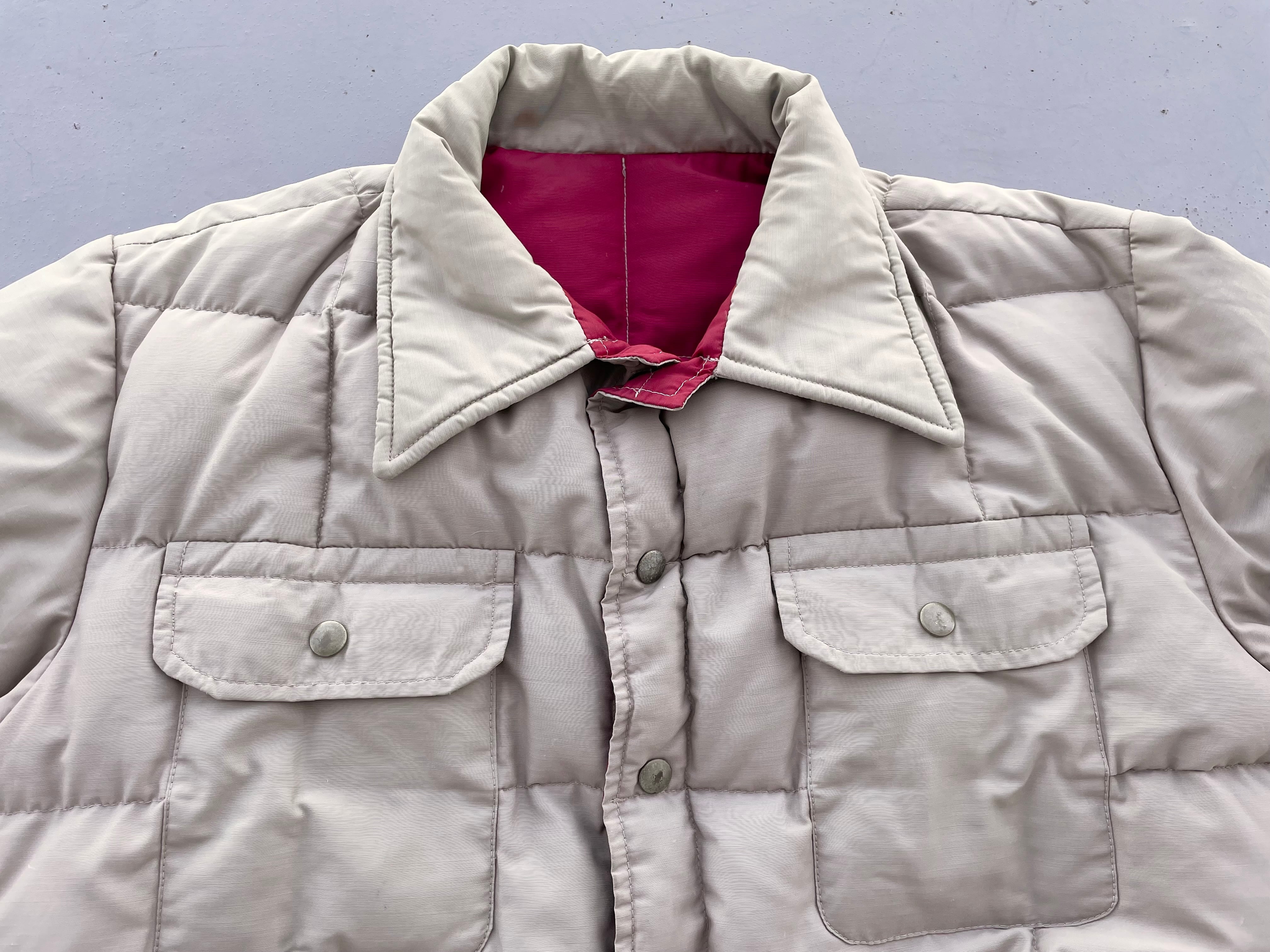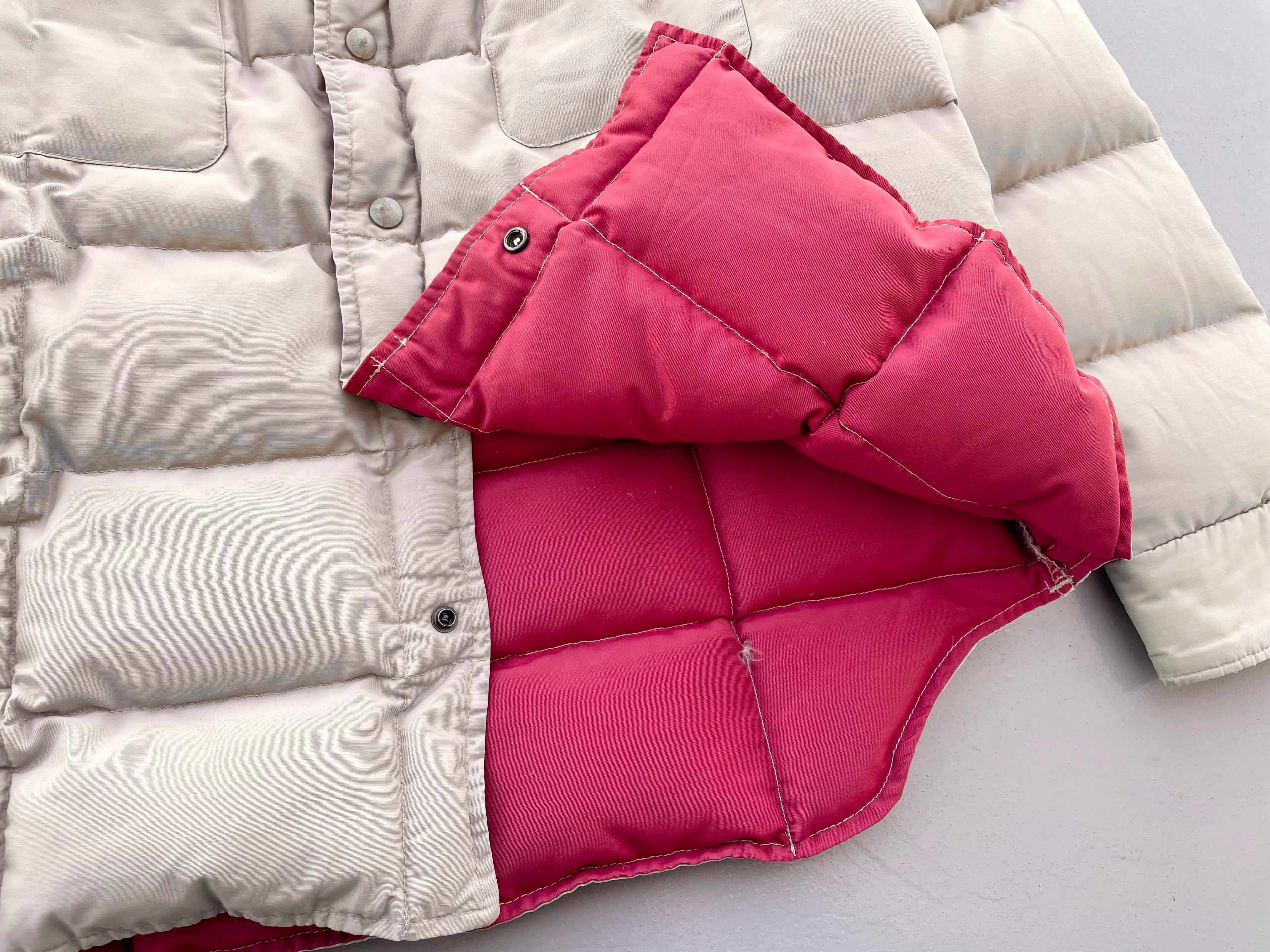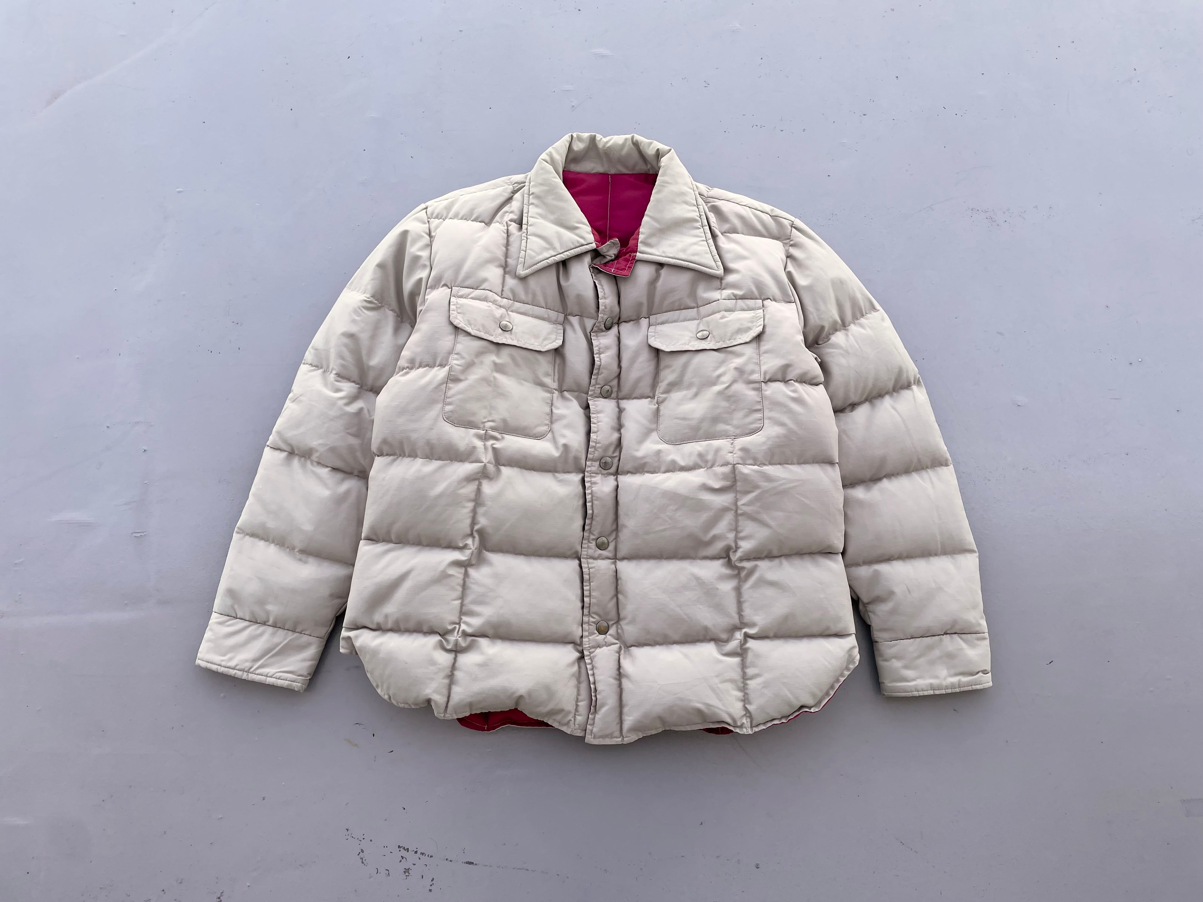 【商品詳細】オービスのダウンシャツジャケット。サイズはLARGE。カラーはベージュ。90年代USA製。珍しいダウン入りのシャツジャケット物。コットンポリ混紡のハリのある生地にダウンが入るディテールで今時期重宝しそうです。他マス目状縫製やバイカラーなライニング等手が凝ってます。