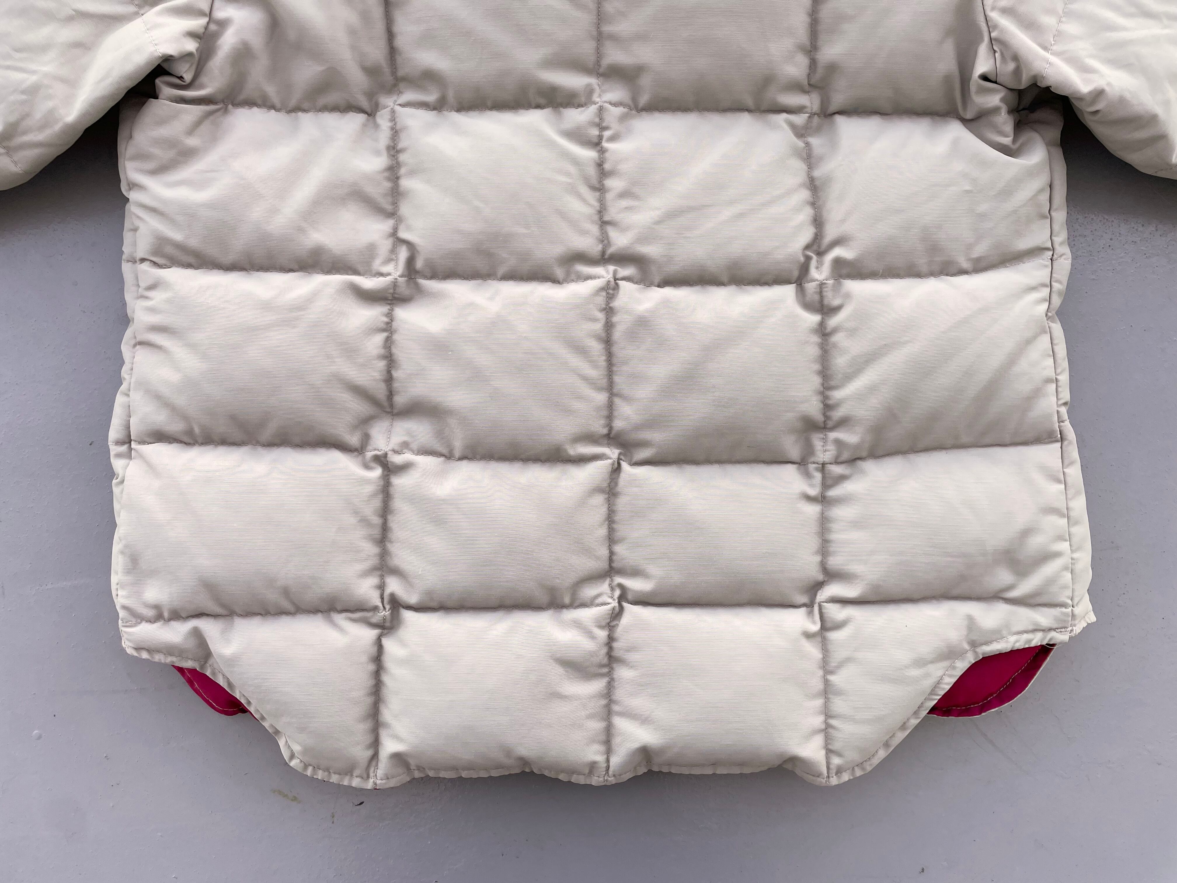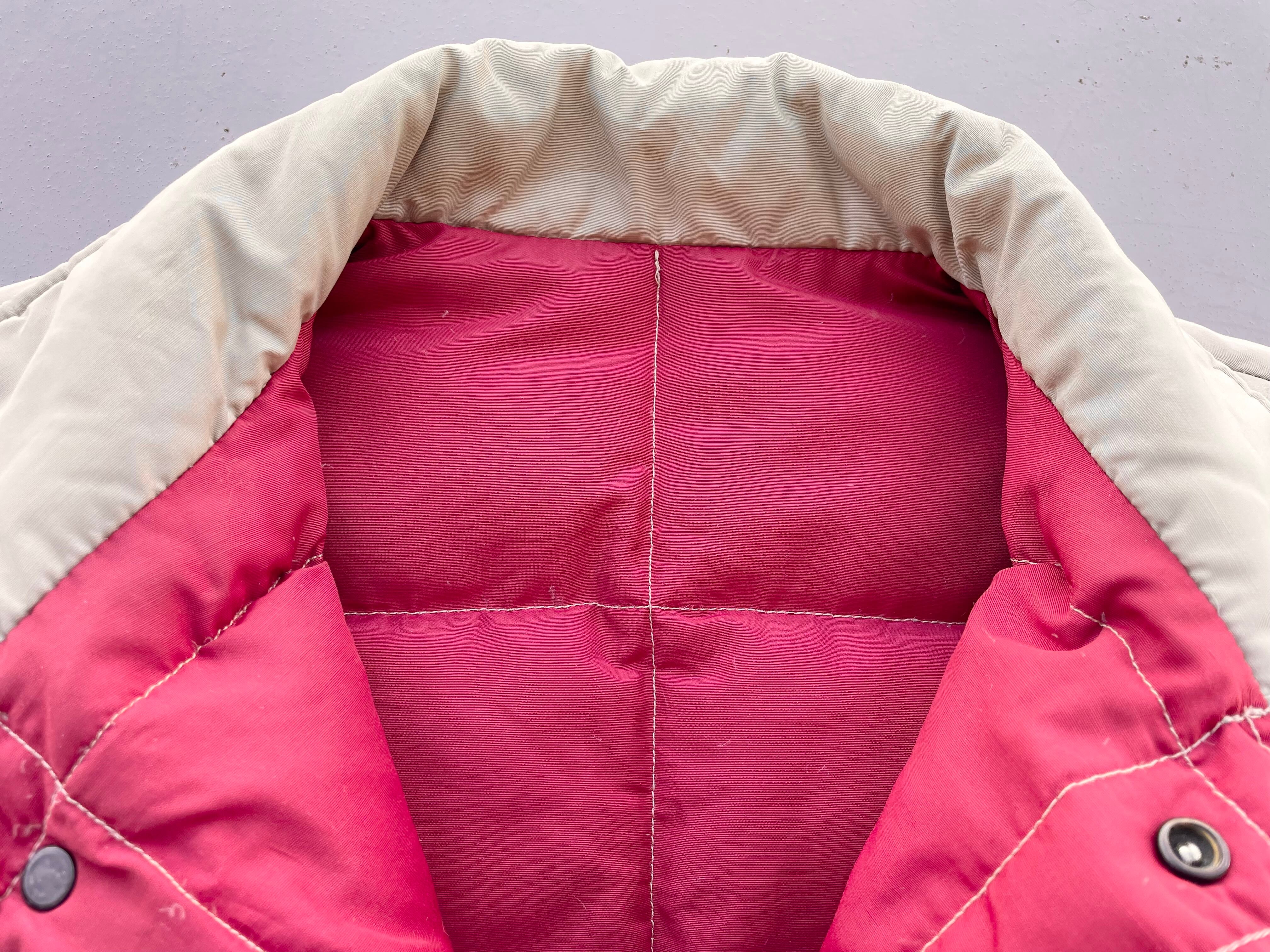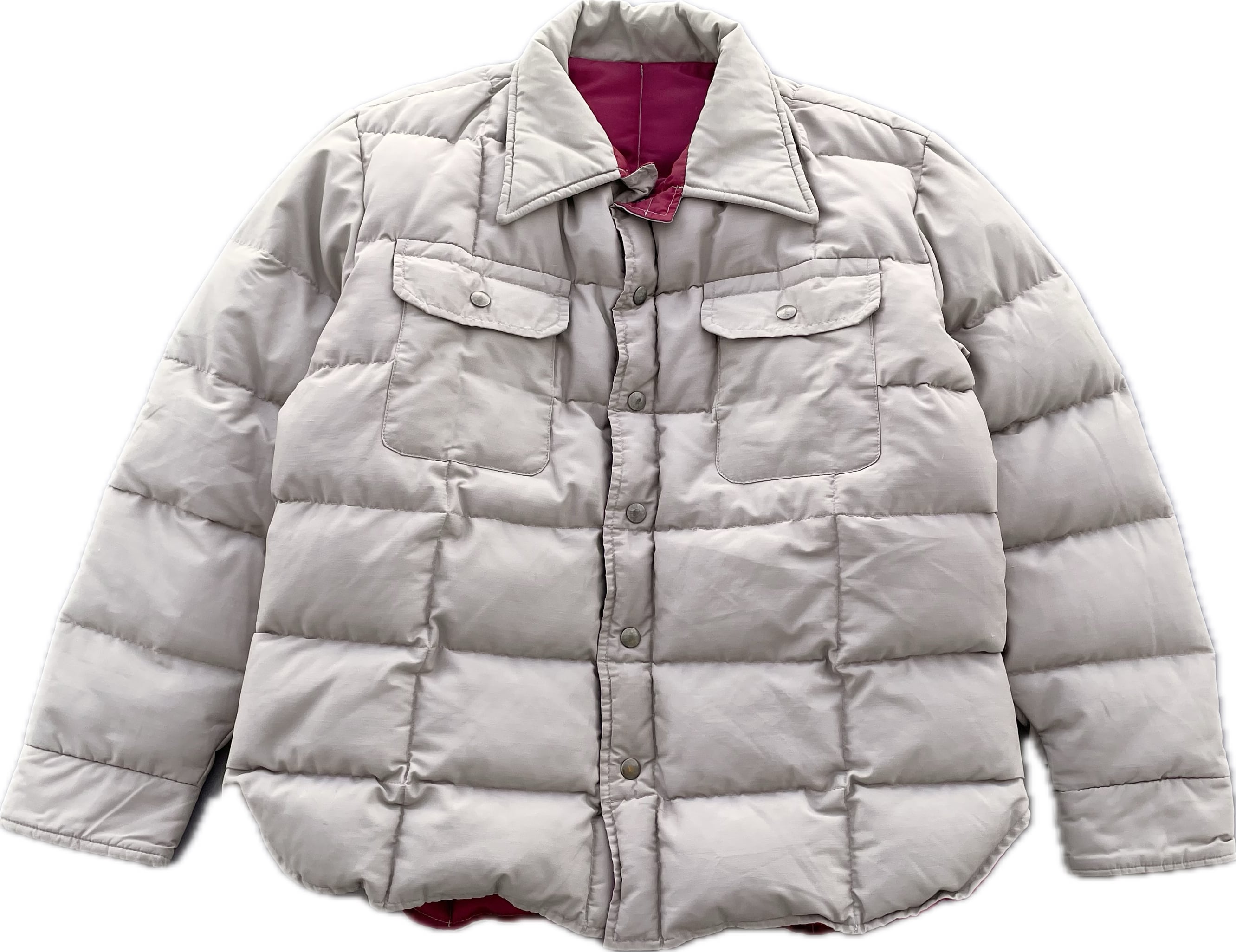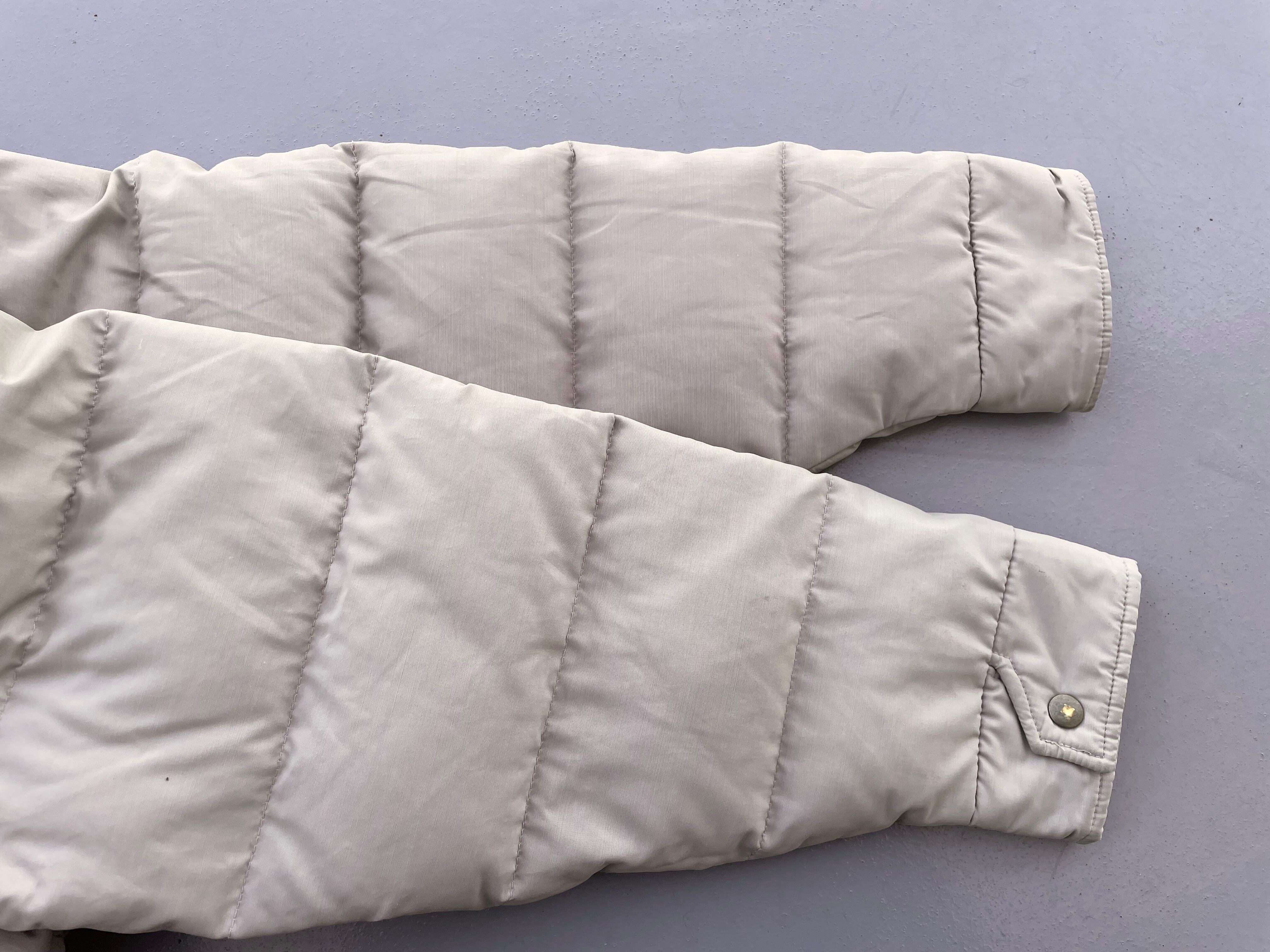 【商品詳細】オービスのダウンシャツジャケット。サイズはLARGE。カラーはベージュ。90年代USA製。珍しいダウン入りのシャツジャケット物。コットンポリ混紡のハリのある生地にダウンが入るディテールで今時期重宝しそうです。他マス目状縫製やバイカラーなライニング等手が凝ってます。