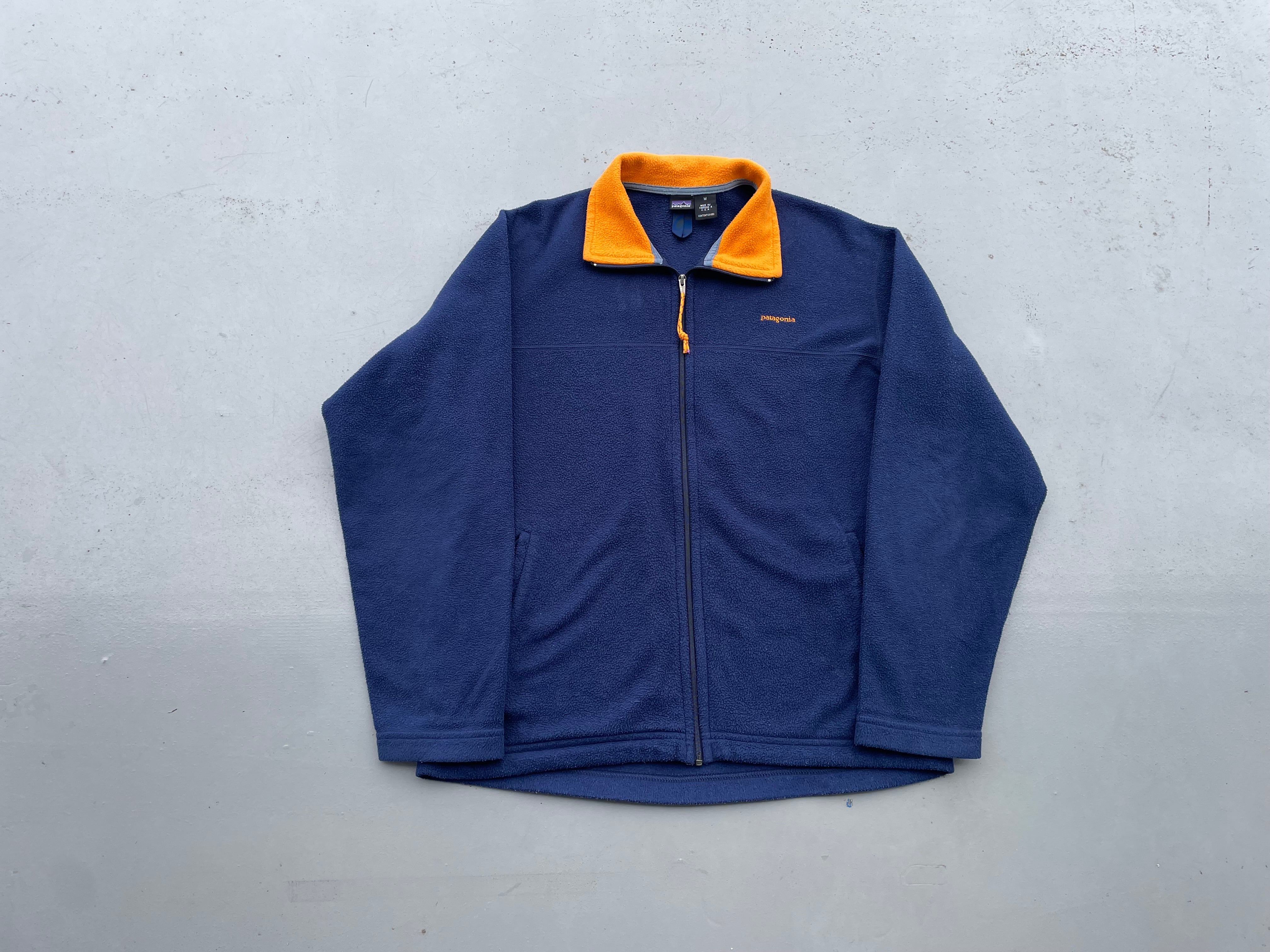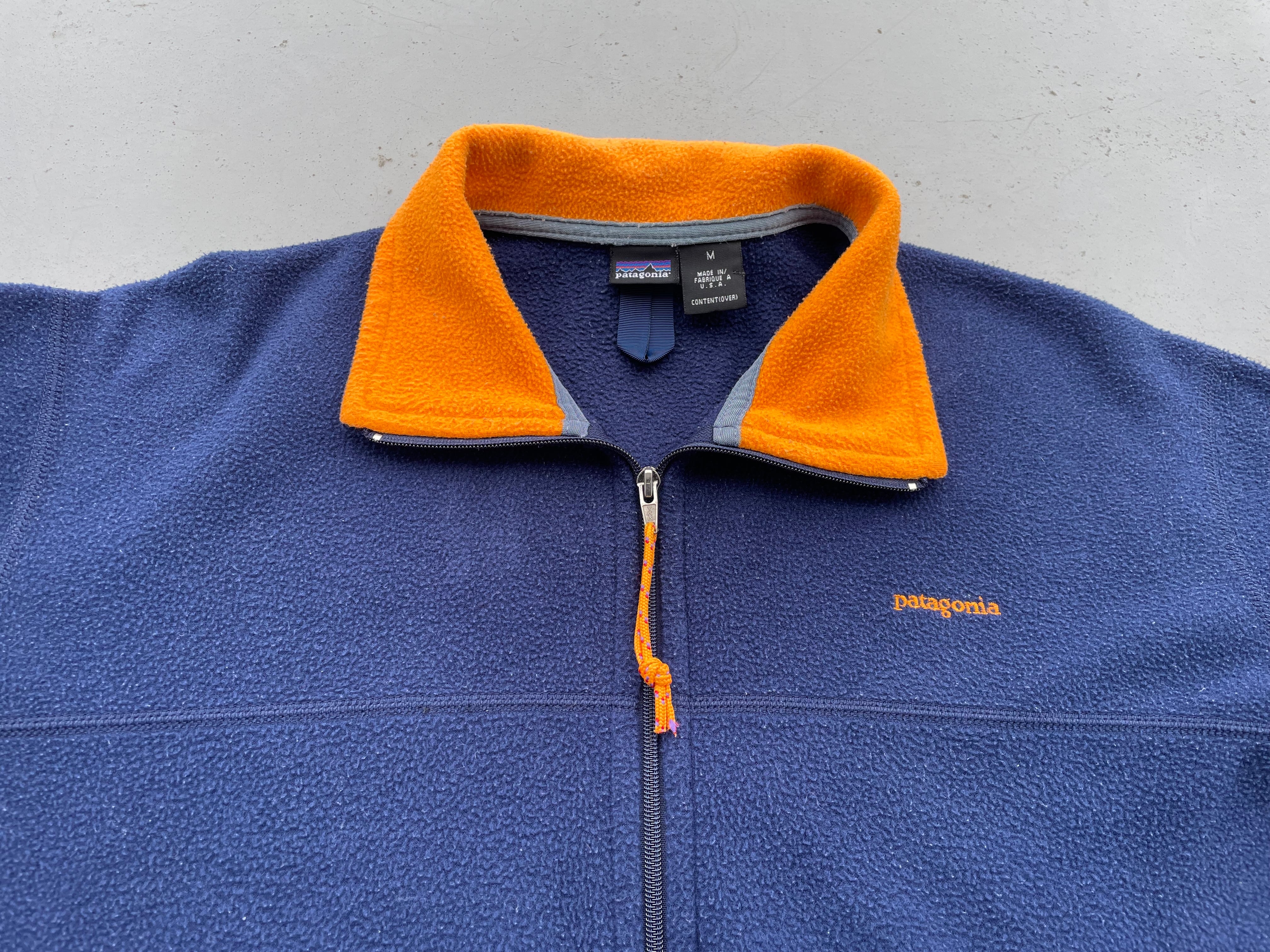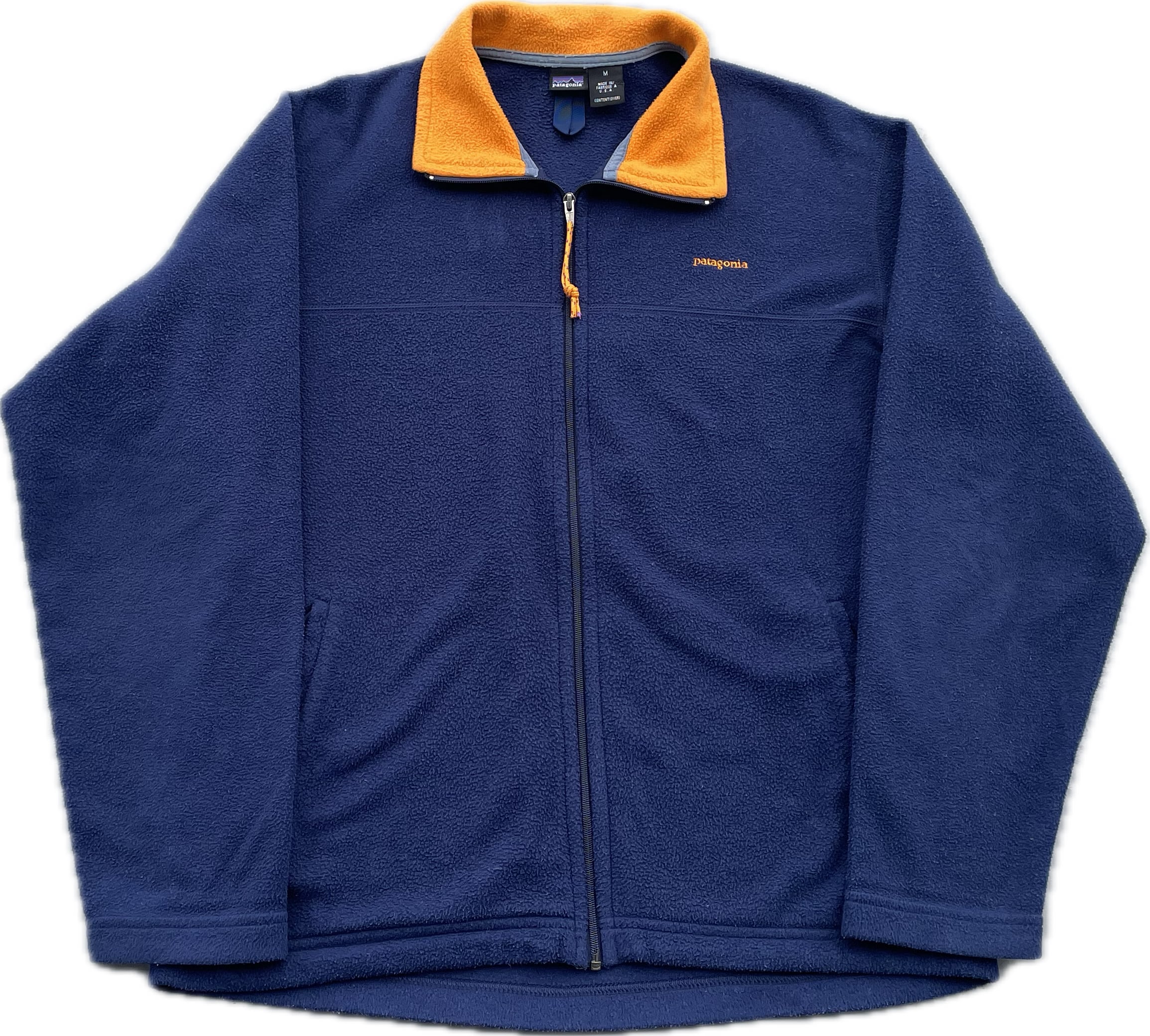 【商品詳細】パタゴニアのエルキャプリーンフリースジャケット。サイズはM。カラーはネイビー。00年USA製。定番のキャプリーン地を使用したフルジップジャケット。毛足の短いフリース地を採用しており、ライトアウターとして活躍しそうです。軽い仕上がりなので今時期はバッグインして持ち歩いても良さそうですね。オレンジカラーが映える良い色合わせです。