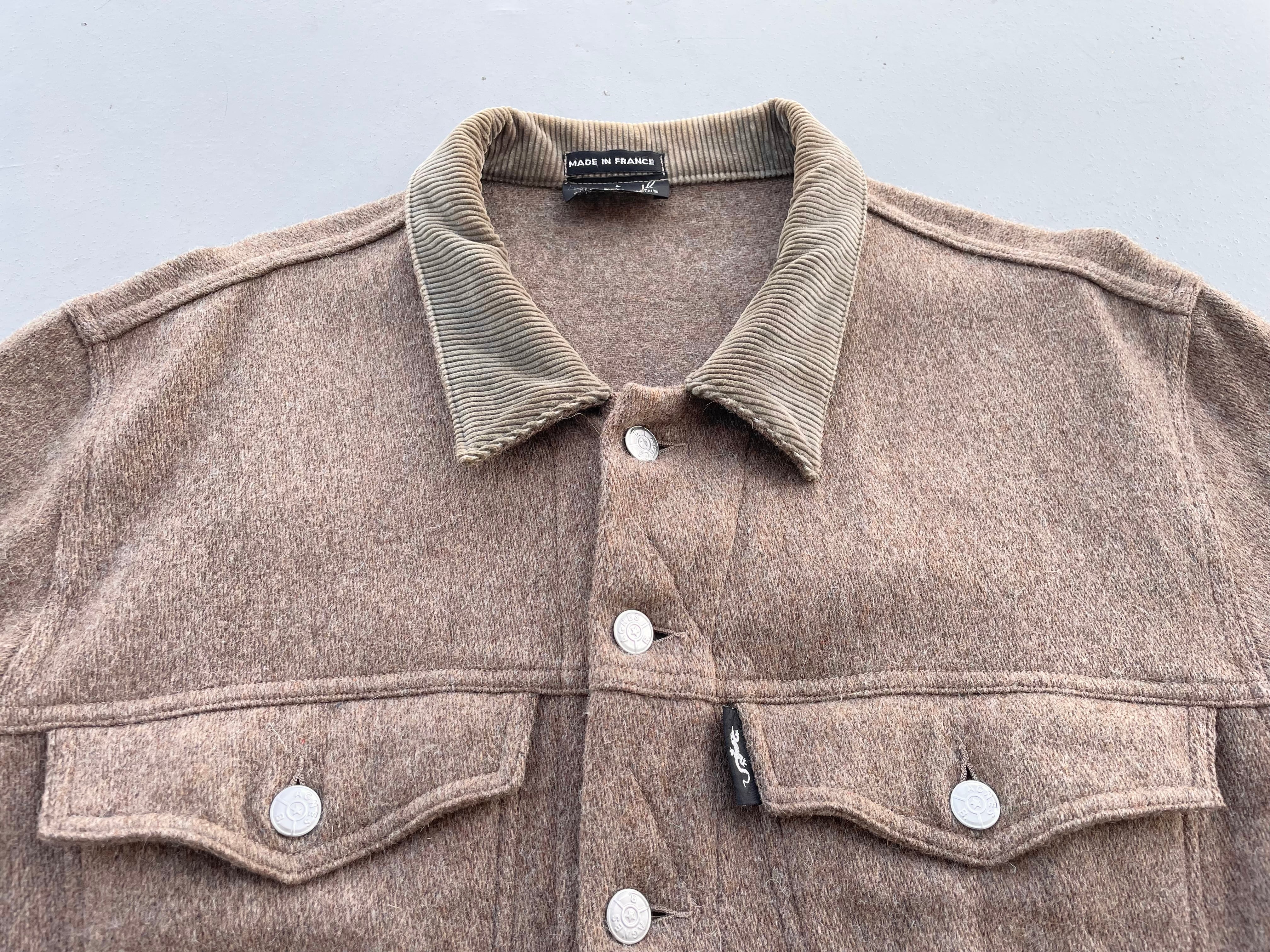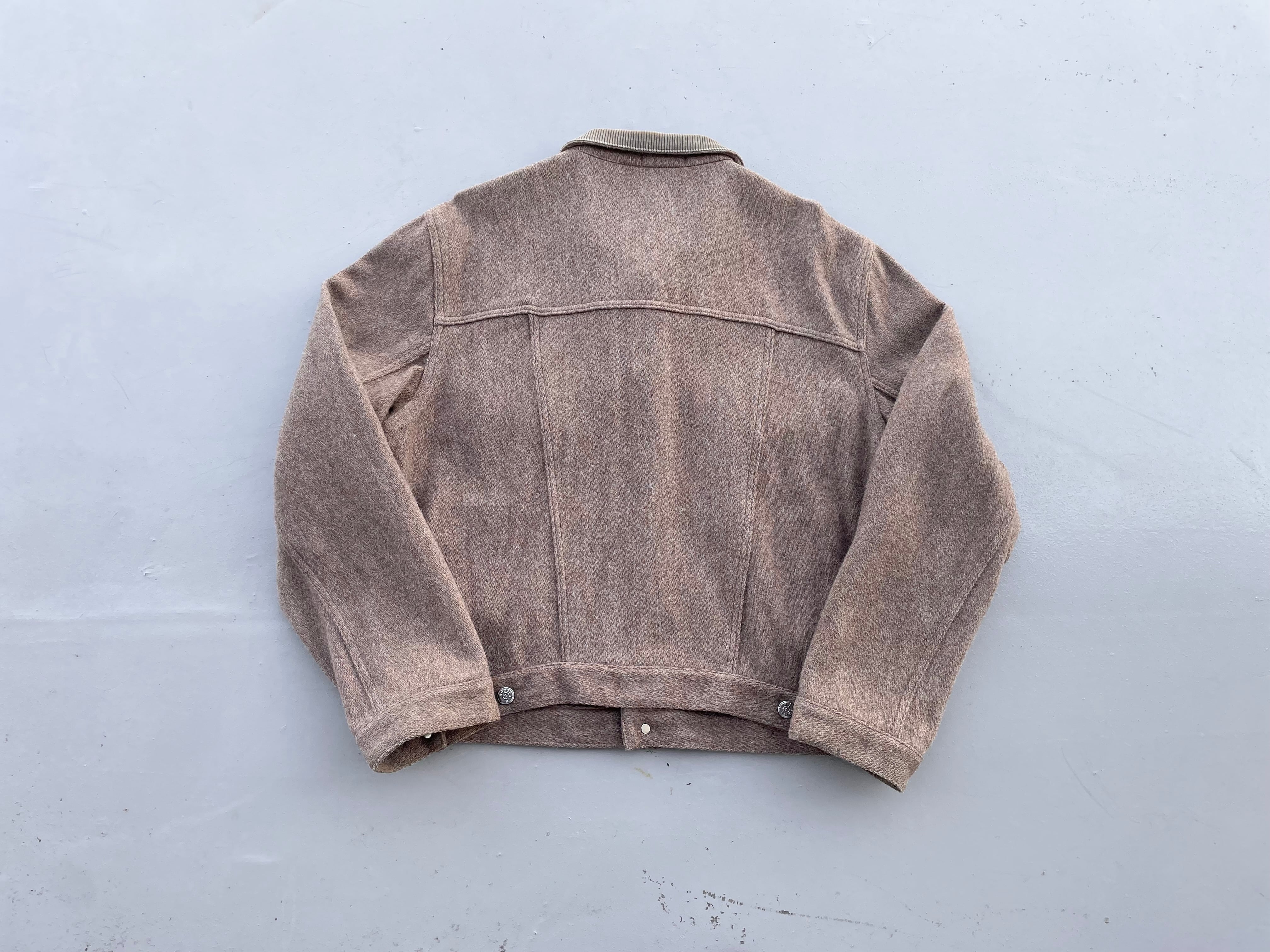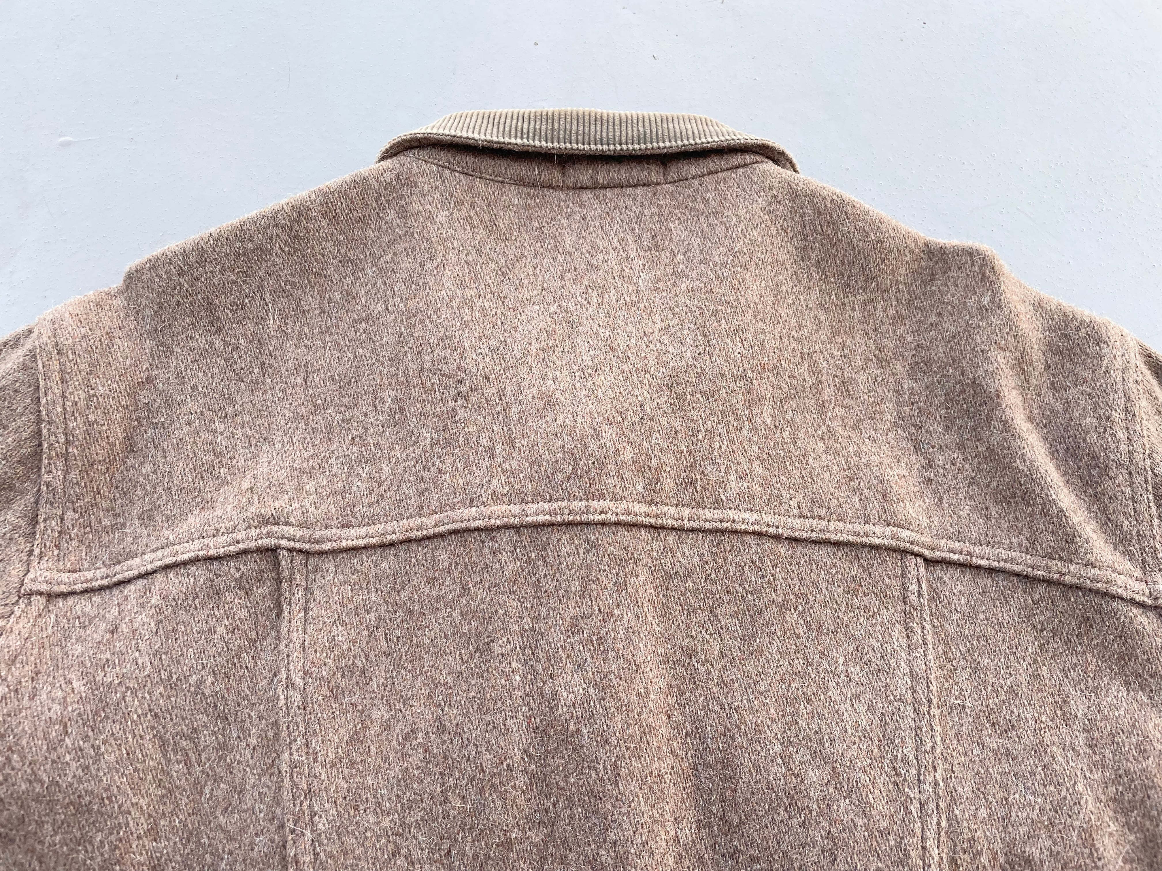 【商品詳細】アニエスベーのウールトラッカージャケット。サイズは実寸M程。カラーはキャメル。90年代フランス製。アニエスベー定番のトラッカージャケットのウール物。襟はコーデュロイ仕様の洒落た作り。身幅しっかりあるので中にも着込めそうです。ウール地は柔らかく軽い仕上がりで今時期から春先以降も重宝しそうです。