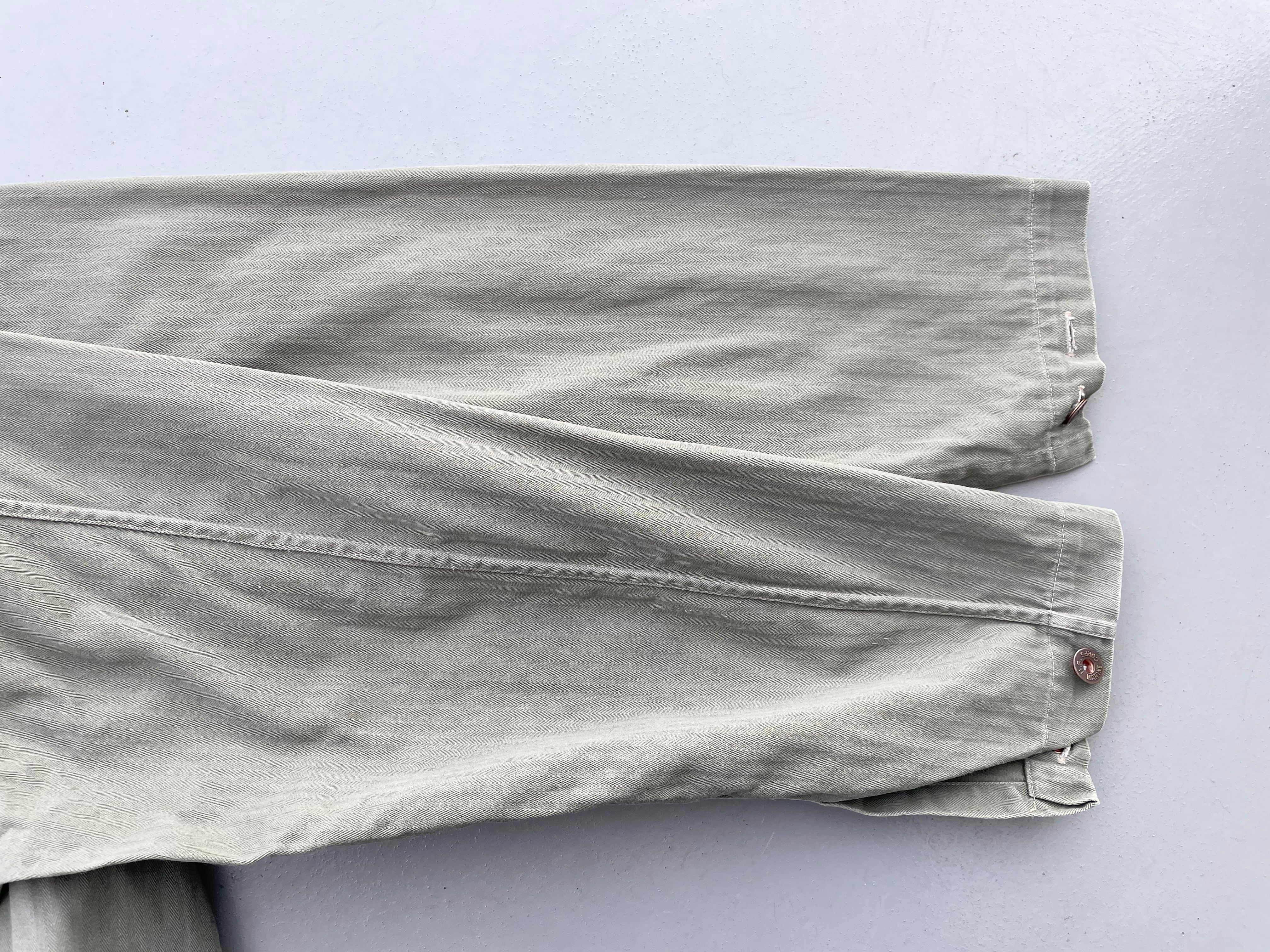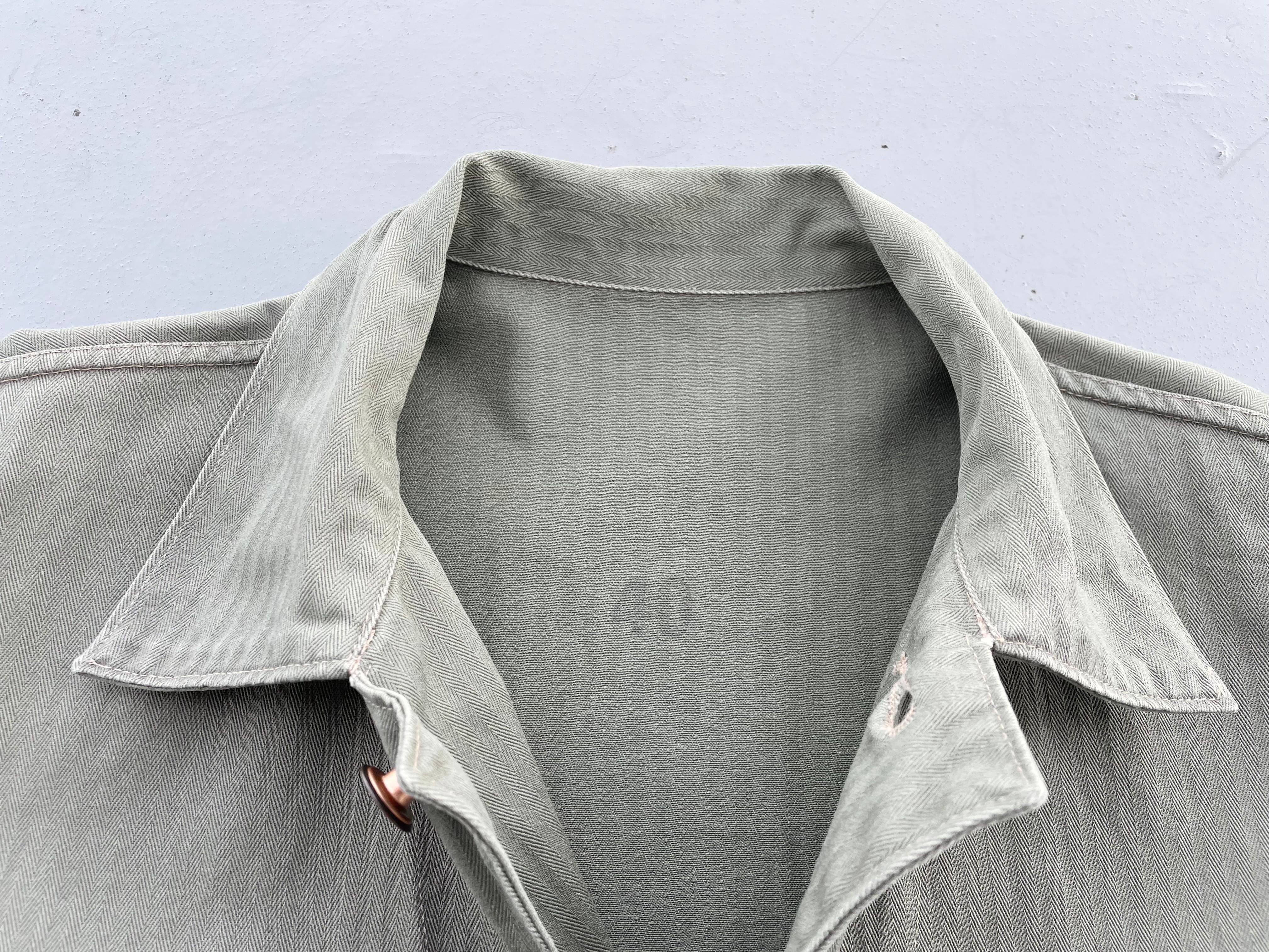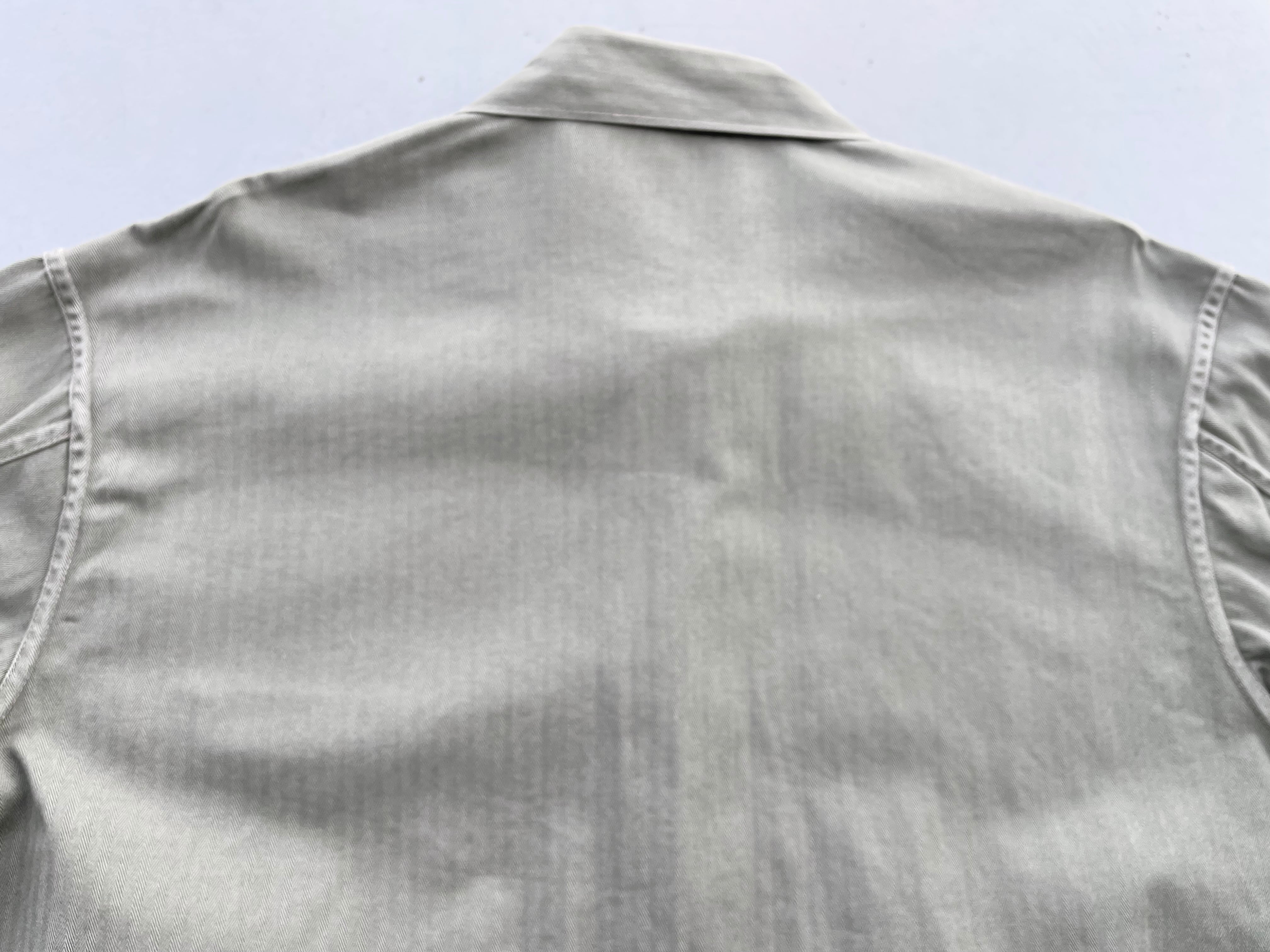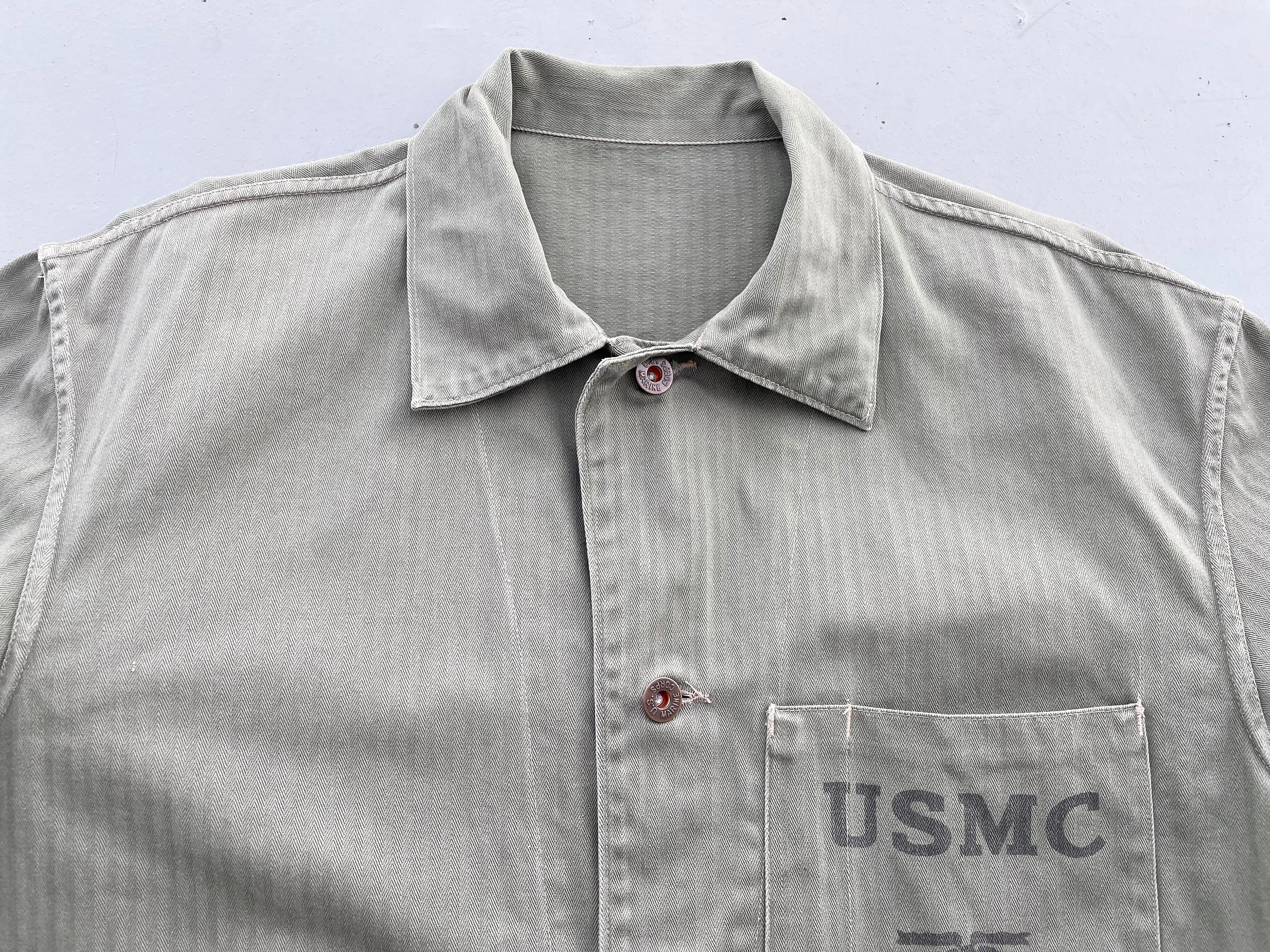 【商品詳細】U.S.M.C P-47 HBT Utility Jacket。カラーはオリーブ。40年代USA製。P-41の後期モデルP-47。ボタンは全てオリジナルのU.S.M.C刻印入りのドーナツ型メタルボタン。胸ポケやサイズスタンプ、ツイル地の色も残っており約80年以上前の物ですが良好と言って良いコンディションかと。