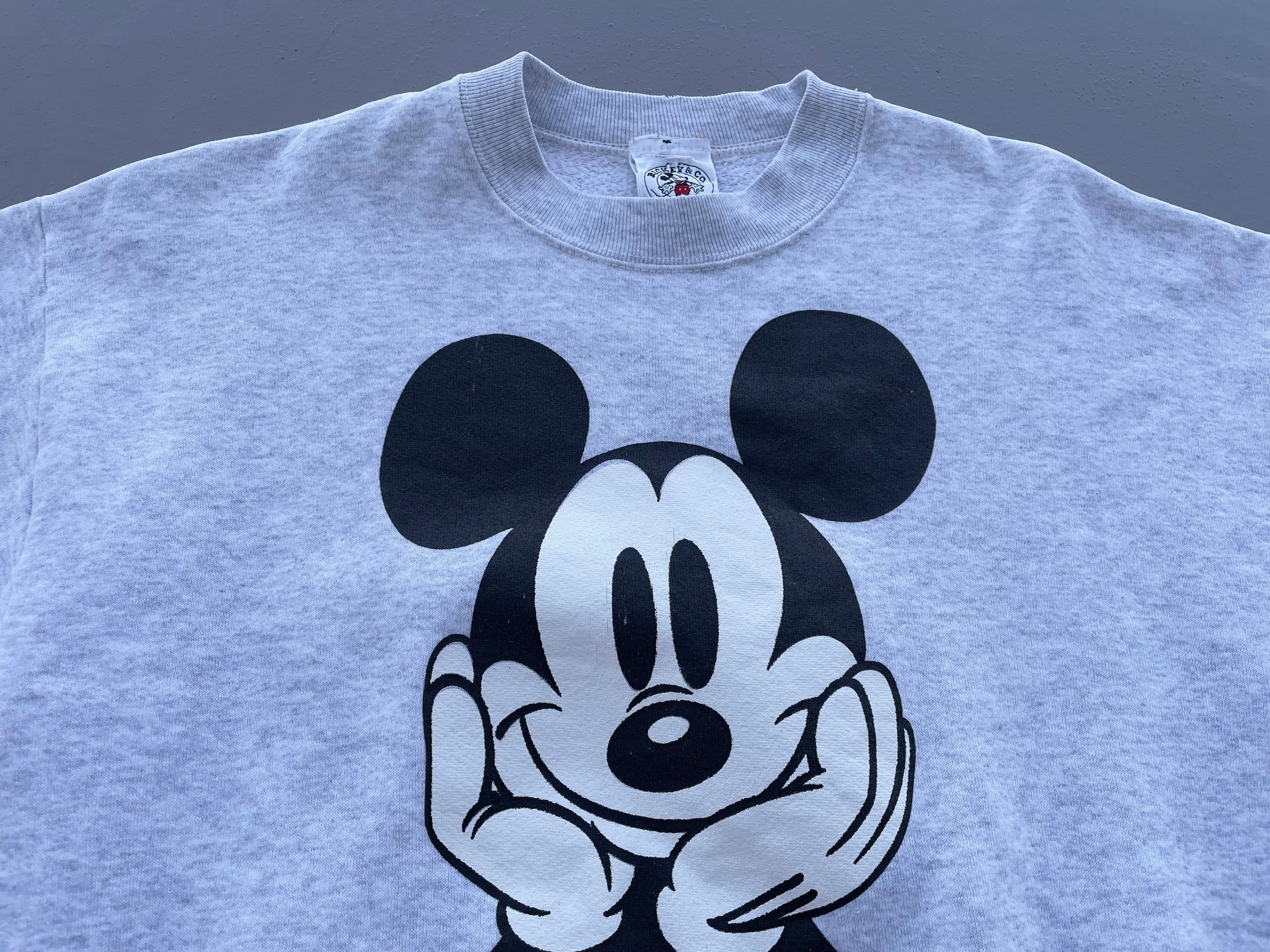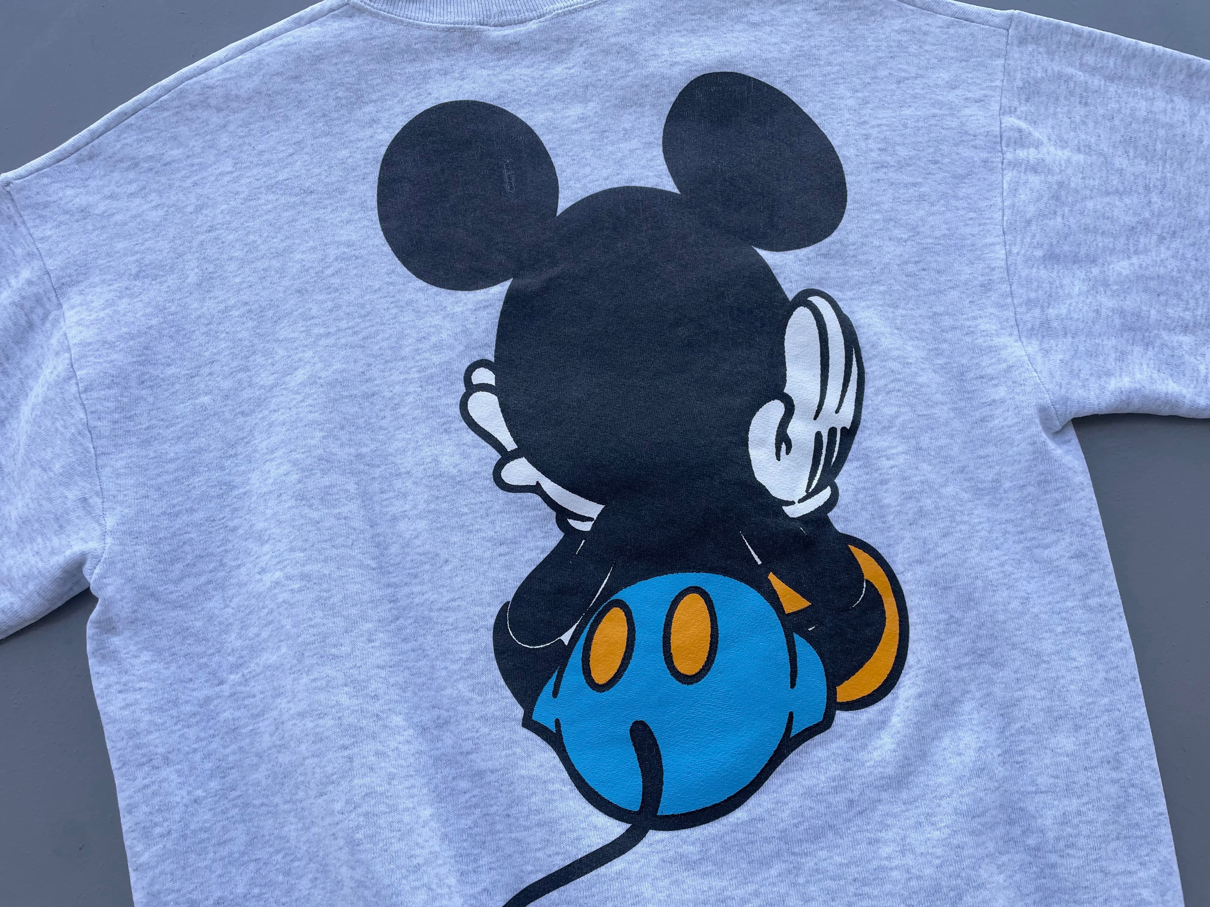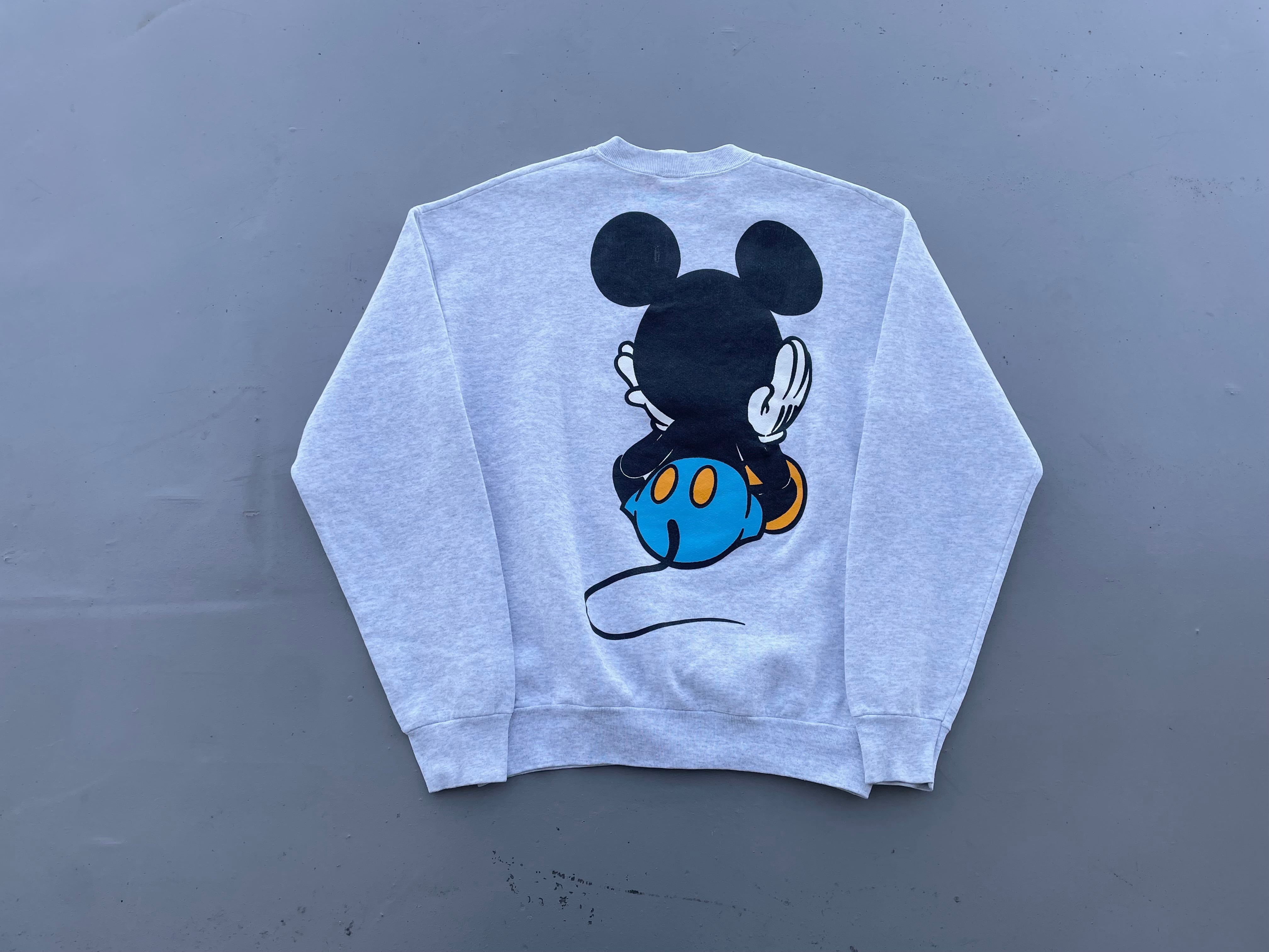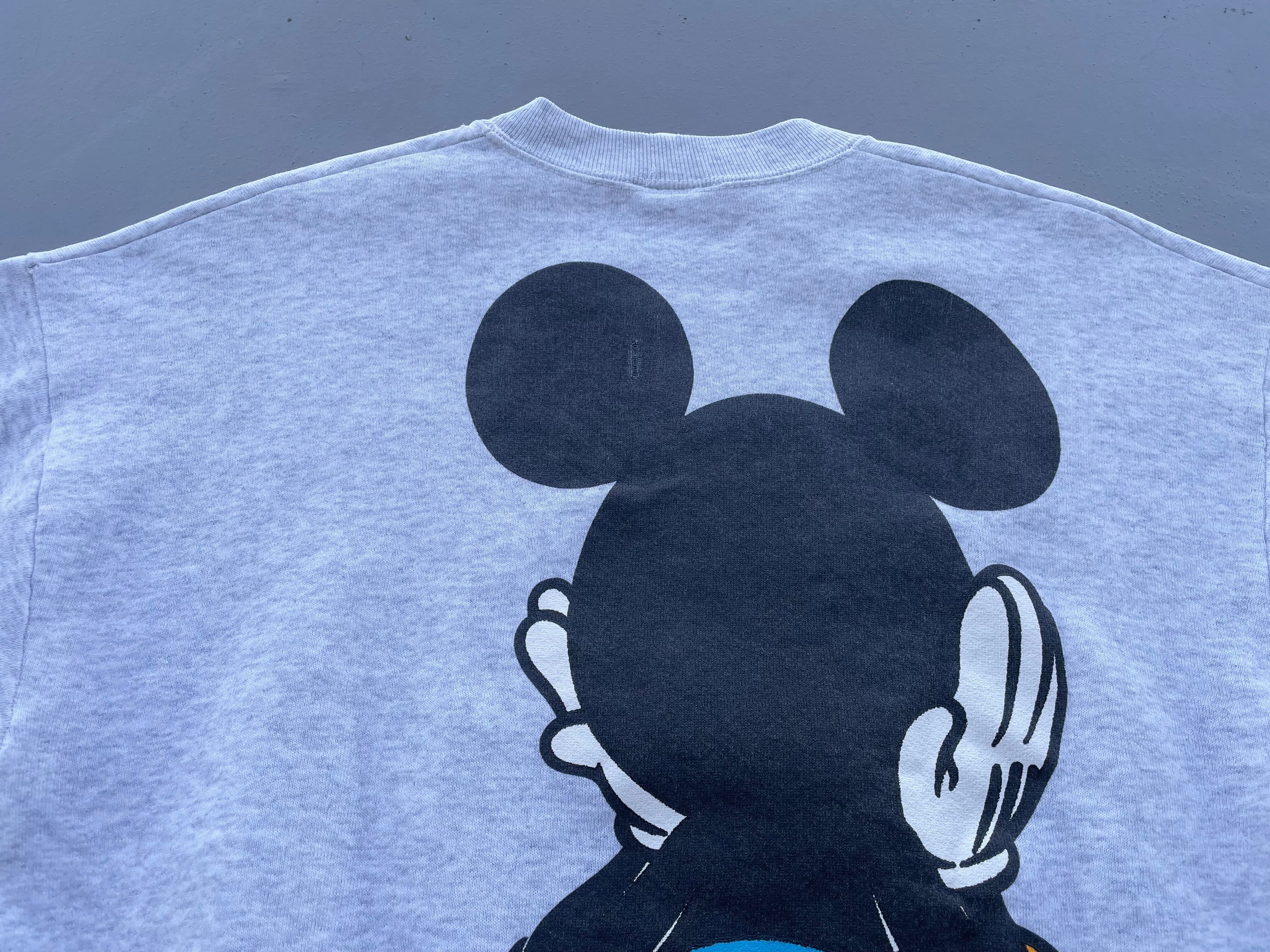 【商品詳細】ディズニーデザインズの長袖スウェット。サイズは実寸L-XL程。カラーはヘザーグレー。 90年代製。人気の青パンミッキープリント物。豪華な両面プリント仕様。程良くプリントも擦れておりいい雰囲気です。