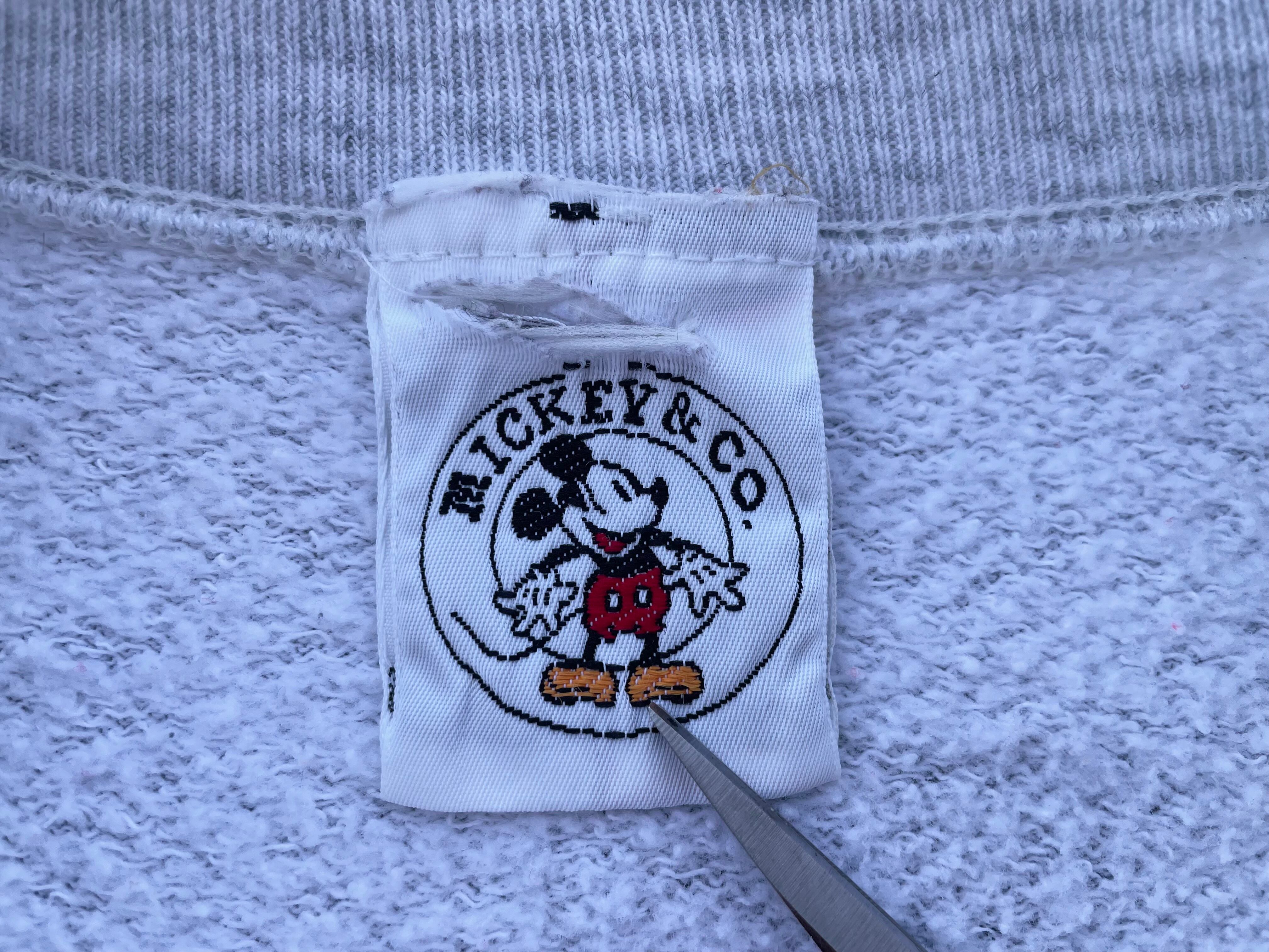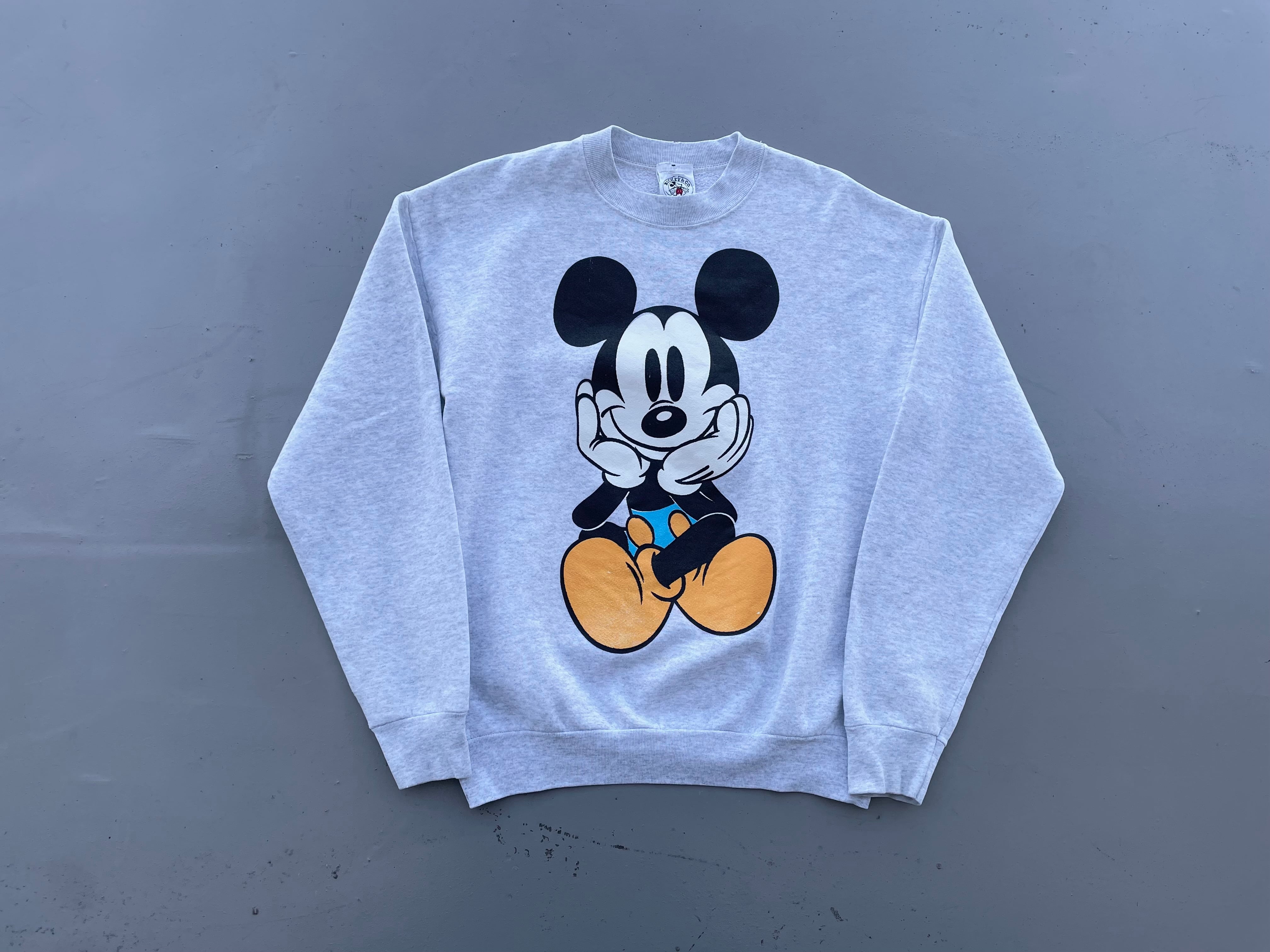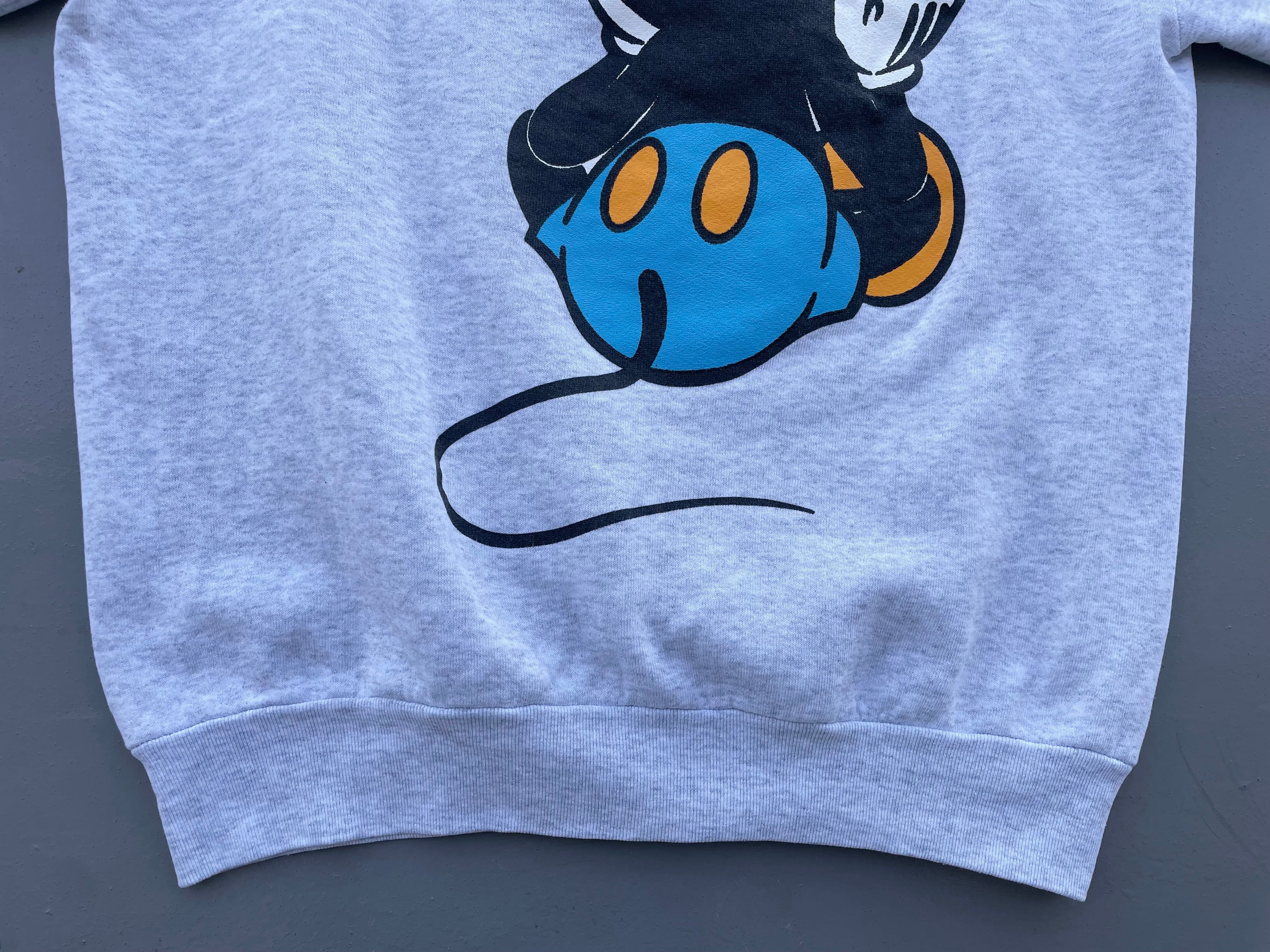 【商品詳細】ディズニーデザインズの長袖スウェット。サイズは実寸L-XL程。カラーはヘザーグレー。 90年代製。人気の青パンミッキープリント物。豪華な両面プリント仕様。程良くプリントも擦れておりいい雰囲気です。