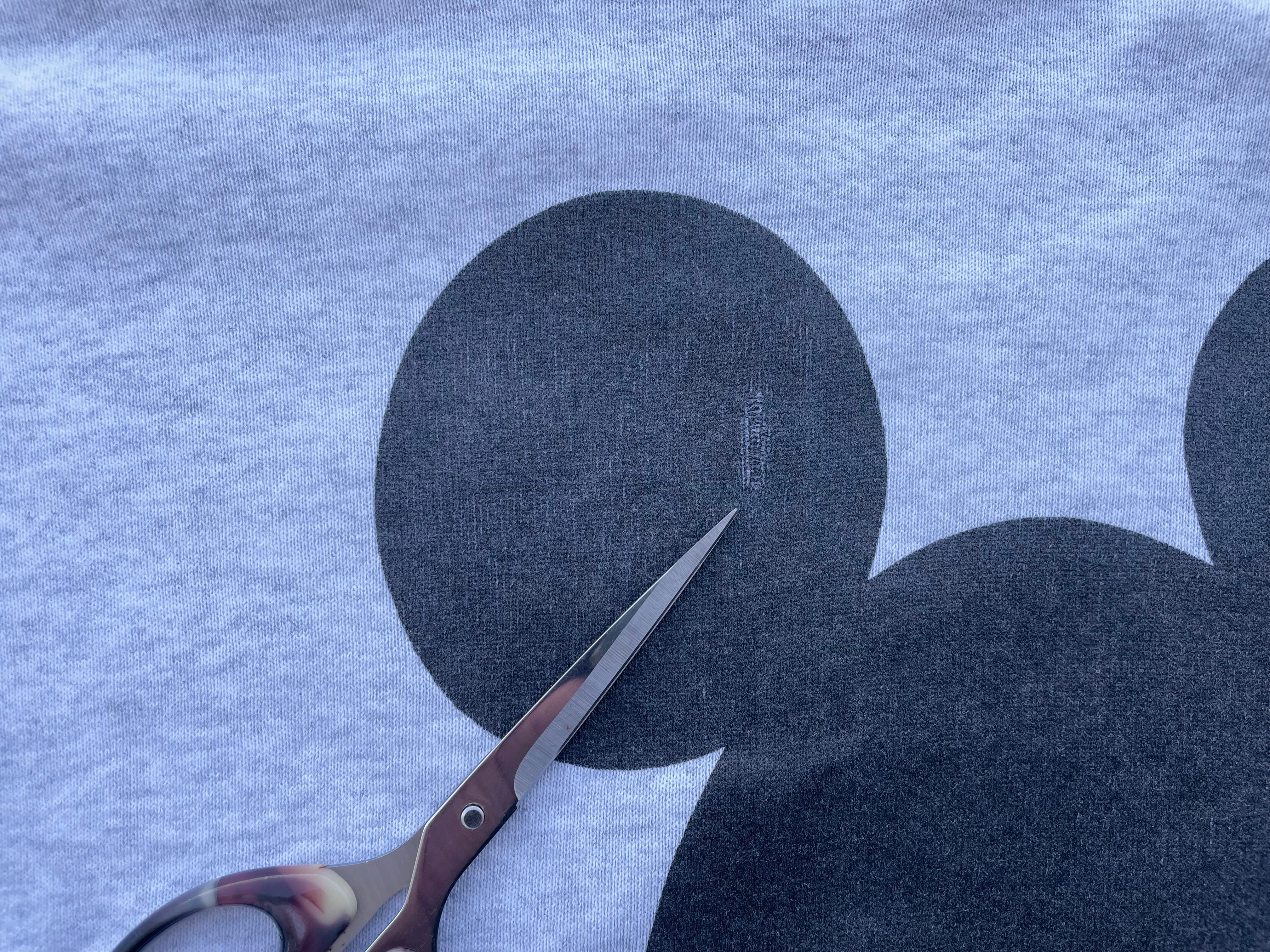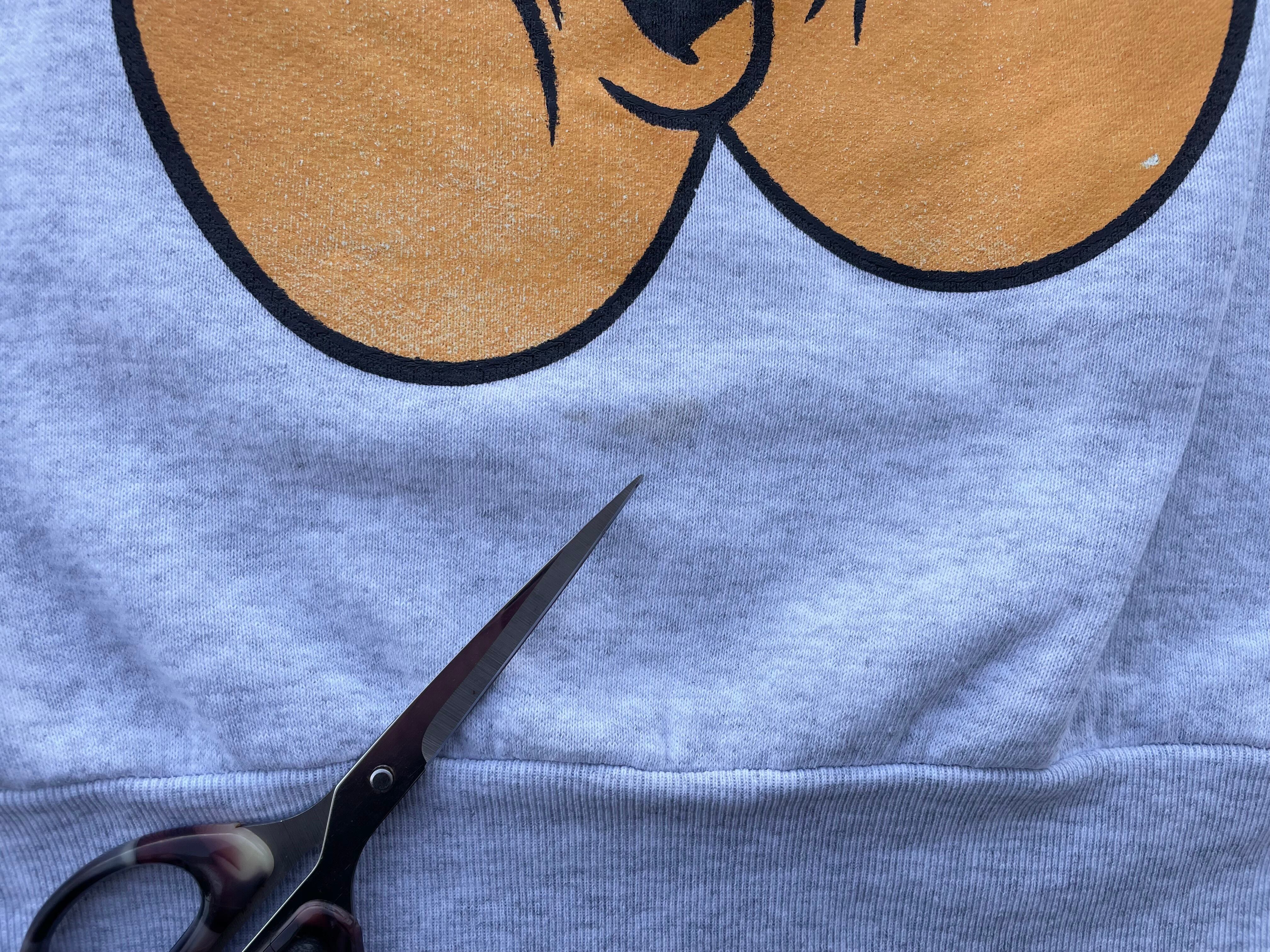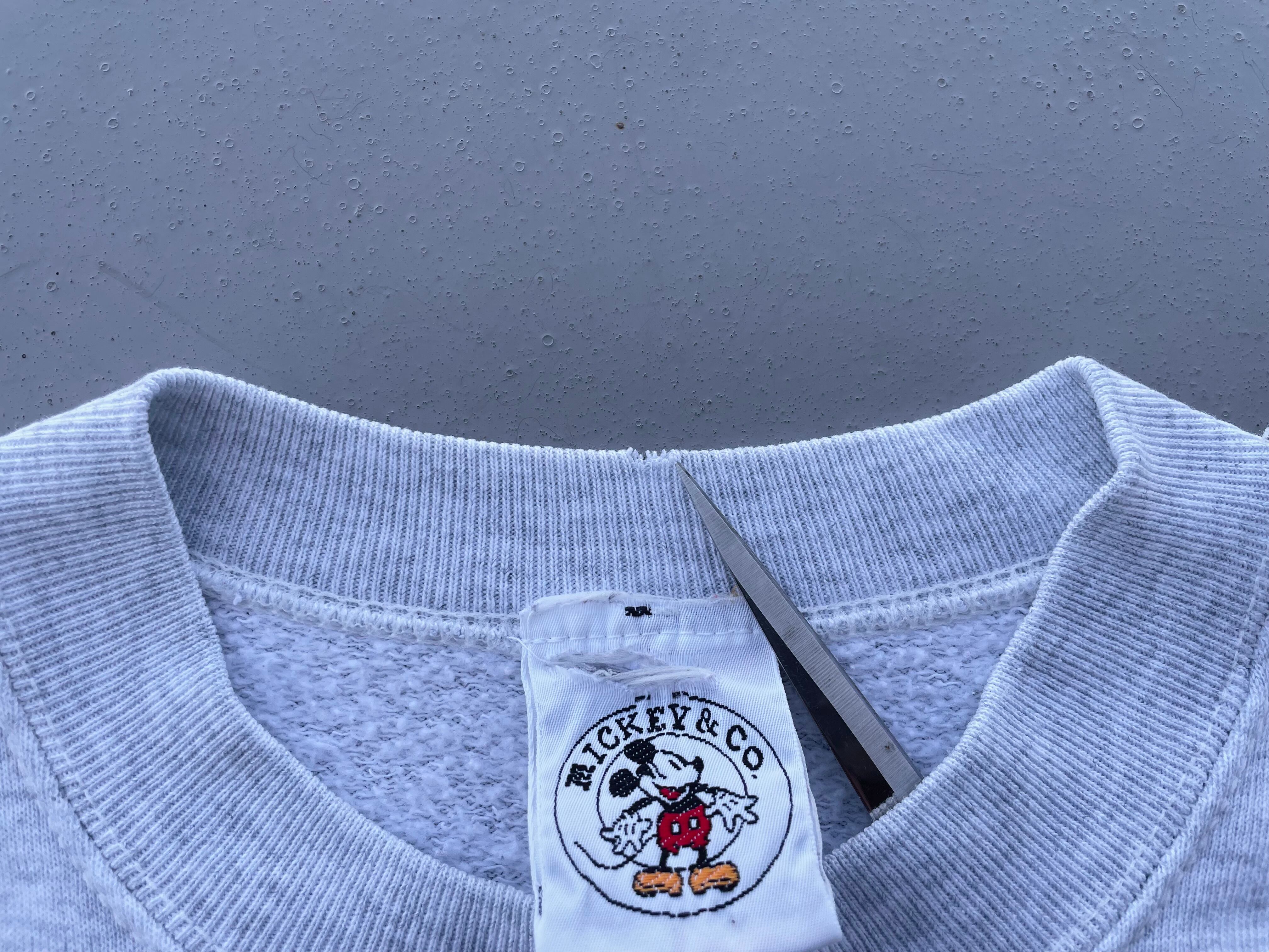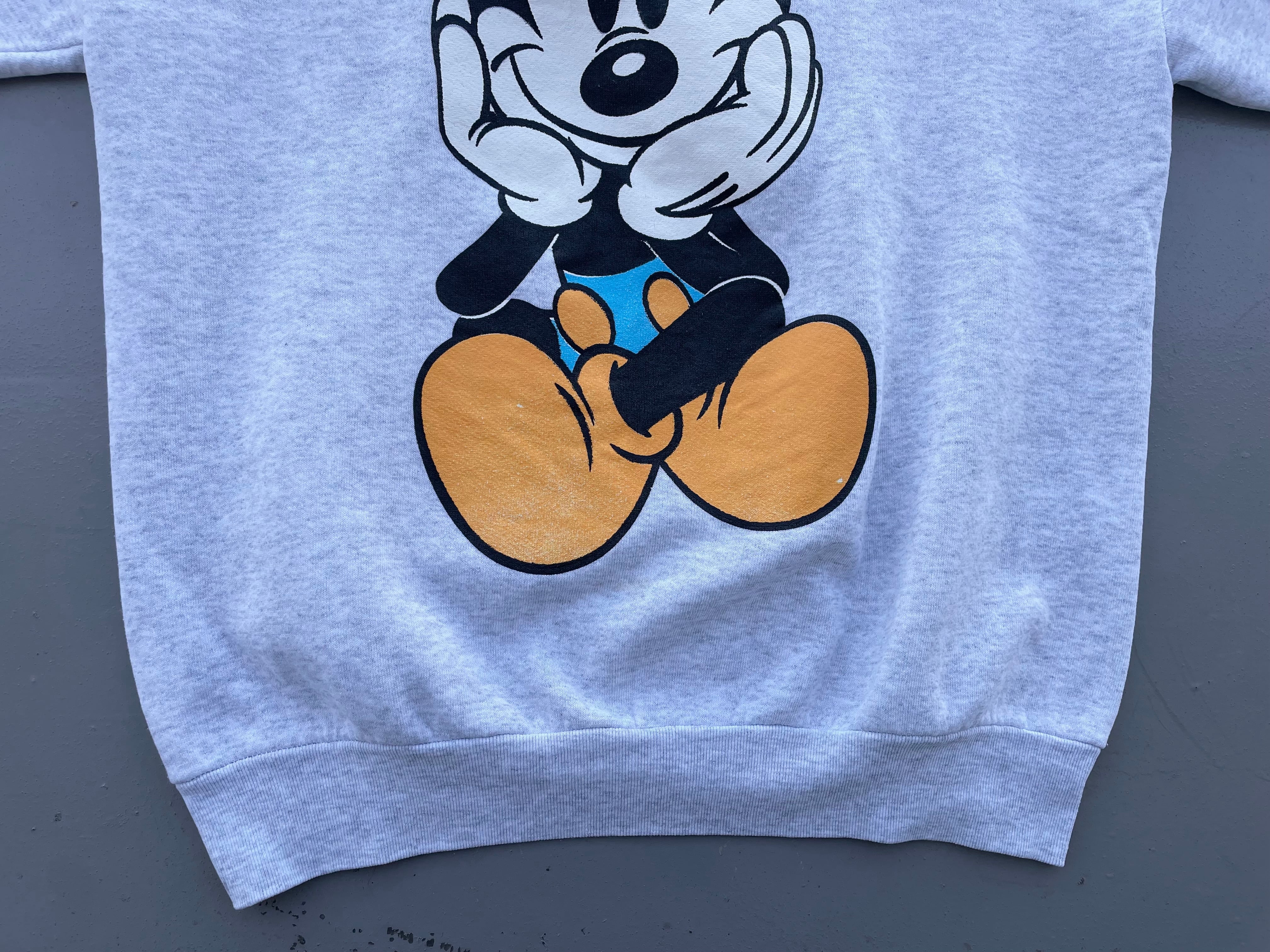 【商品詳細】ディズニーデザインズの長袖スウェット。サイズは実寸L-XL程。カラーはヘザーグレー。 90年代製。人気の青パンミッキープリント物。豪華な両面プリント仕様。程良くプリントも擦れておりいい雰囲気です。