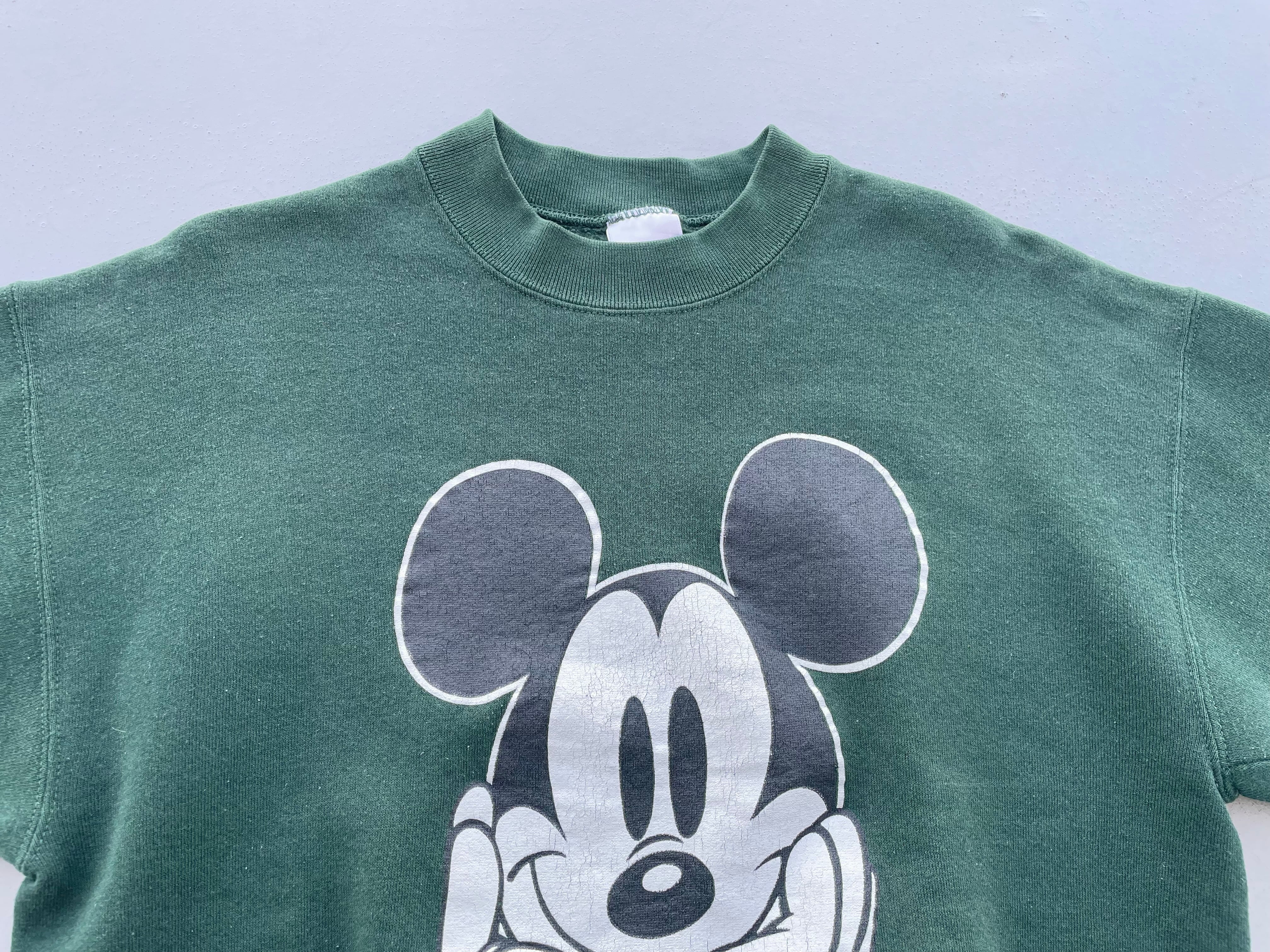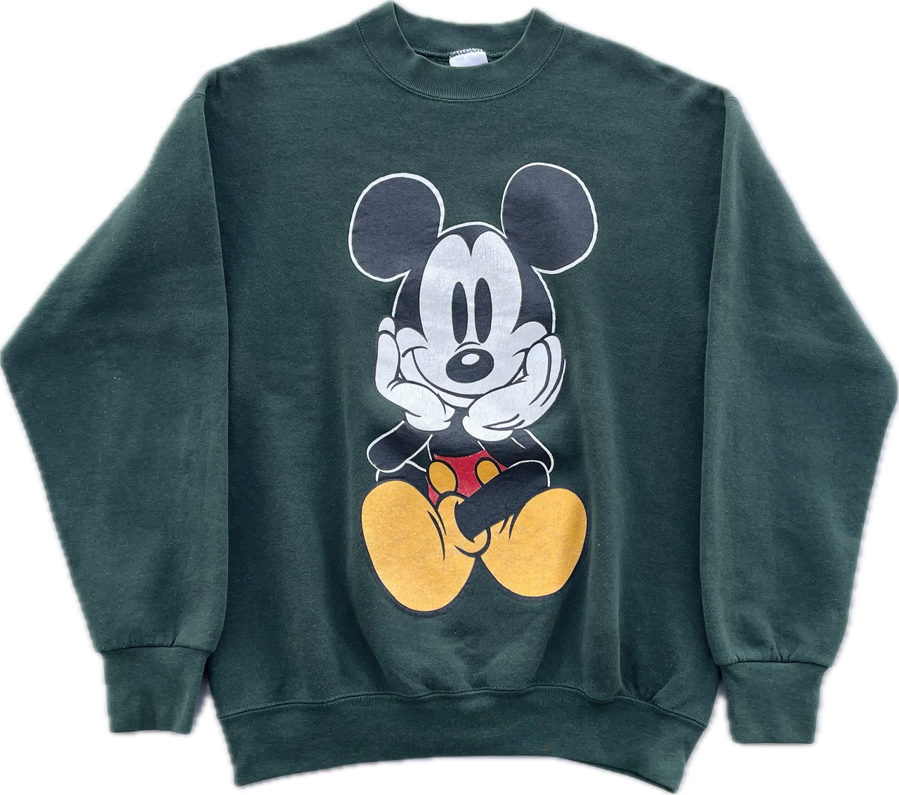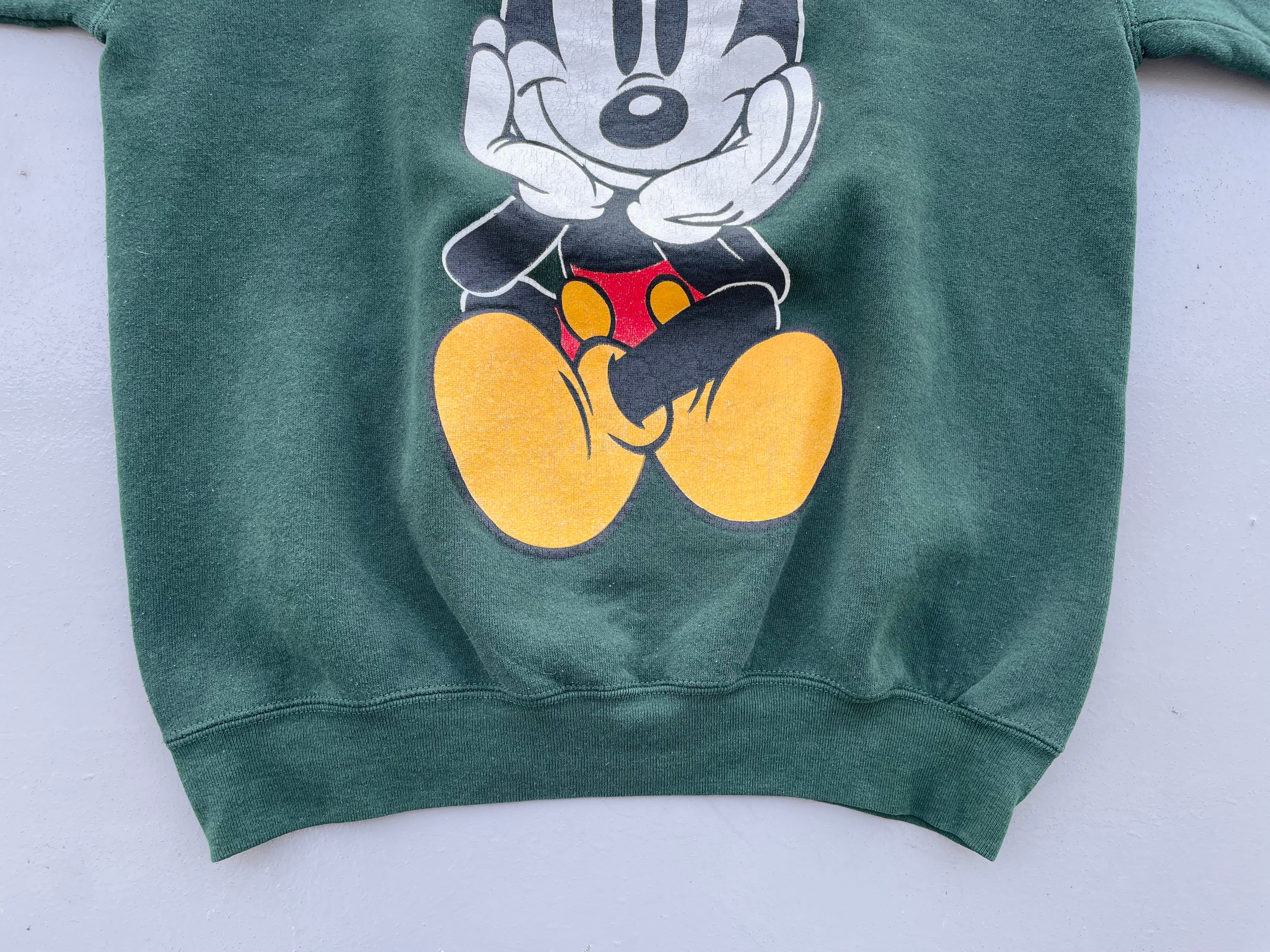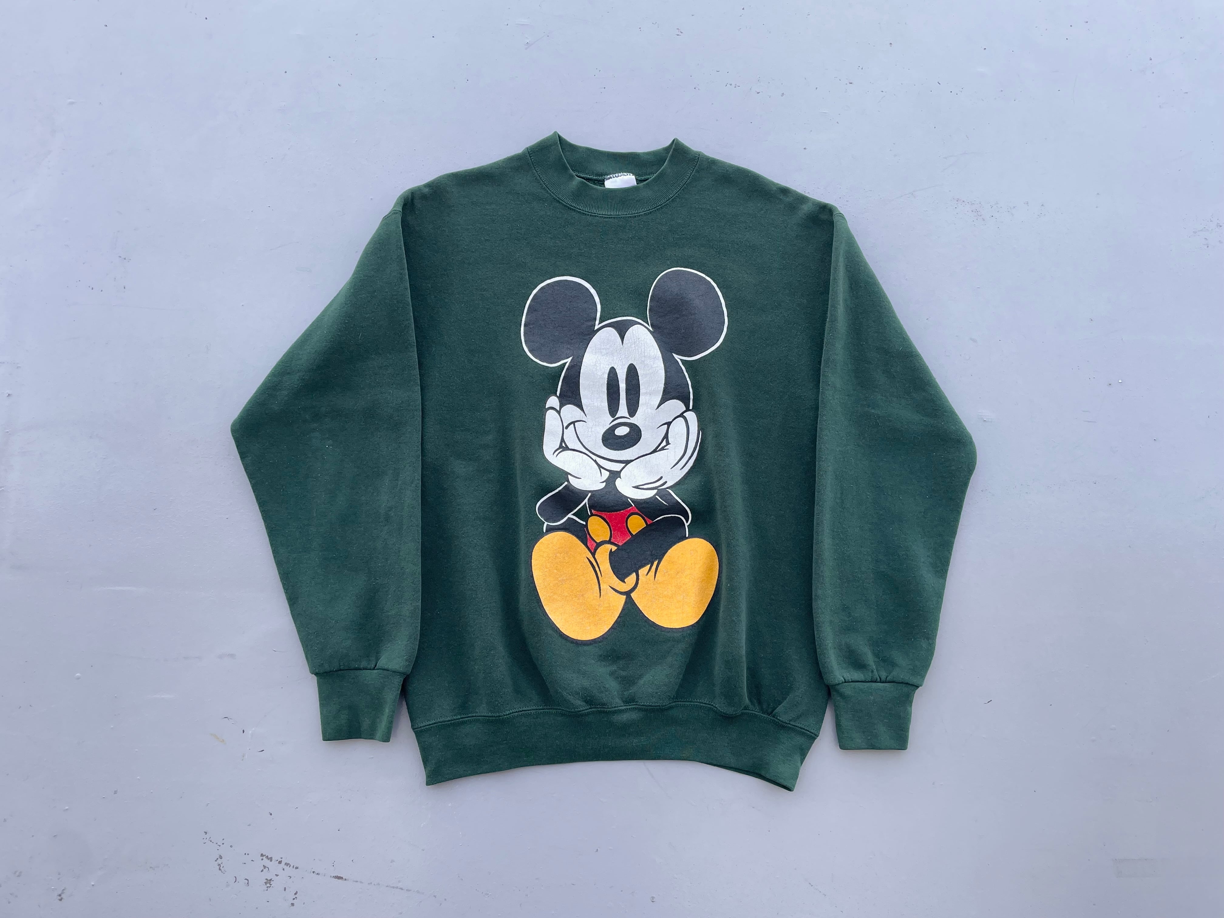 【商品詳細】ディズニーデザインズの長袖スウェット。サイズはL。90年代USA製。カラーはグリーン。人気の座り込みパターン。フロントに大きくプリントされたミッキーがインパクトあります。ディープグリーンな色味で洒落てます。
