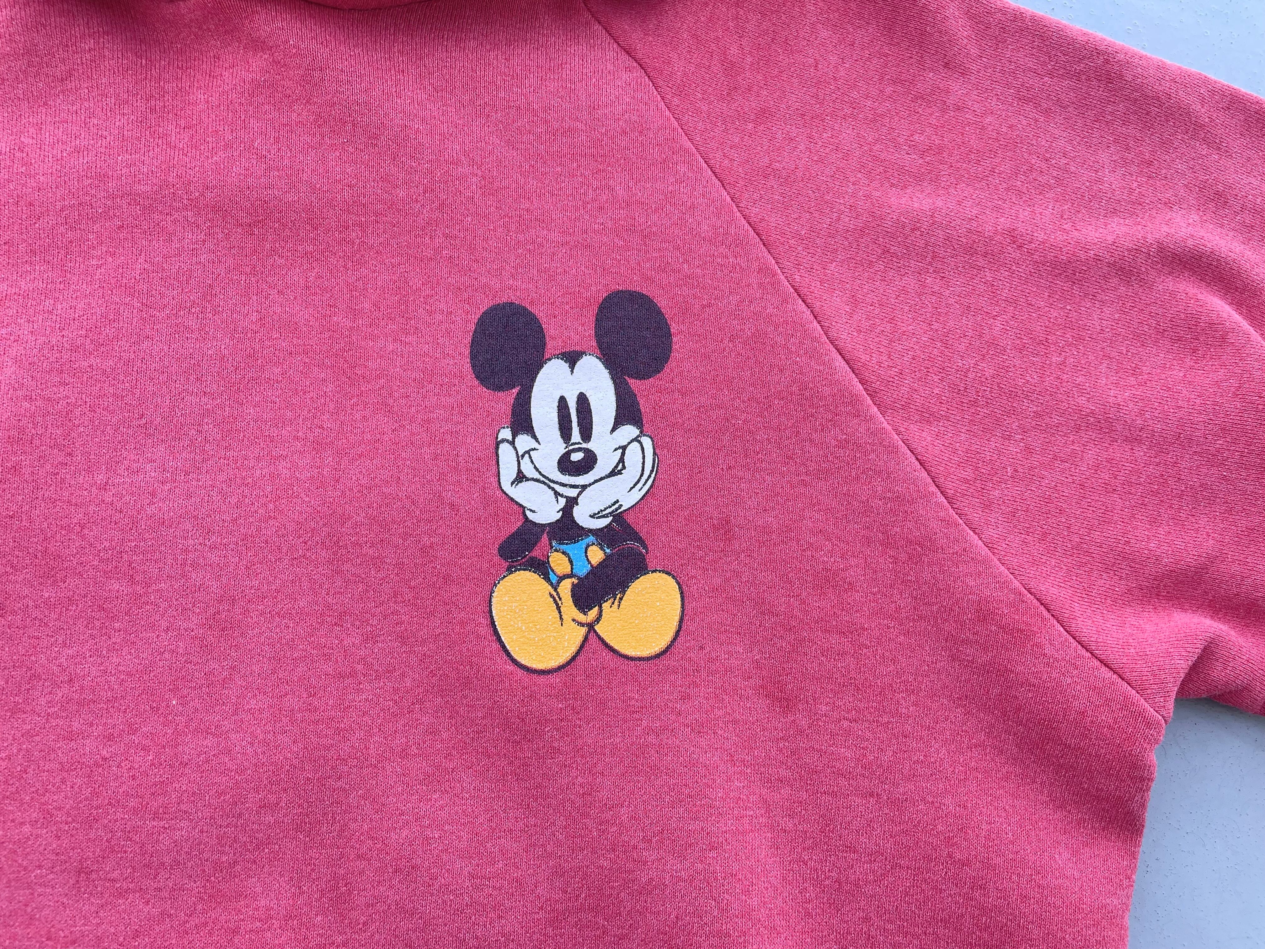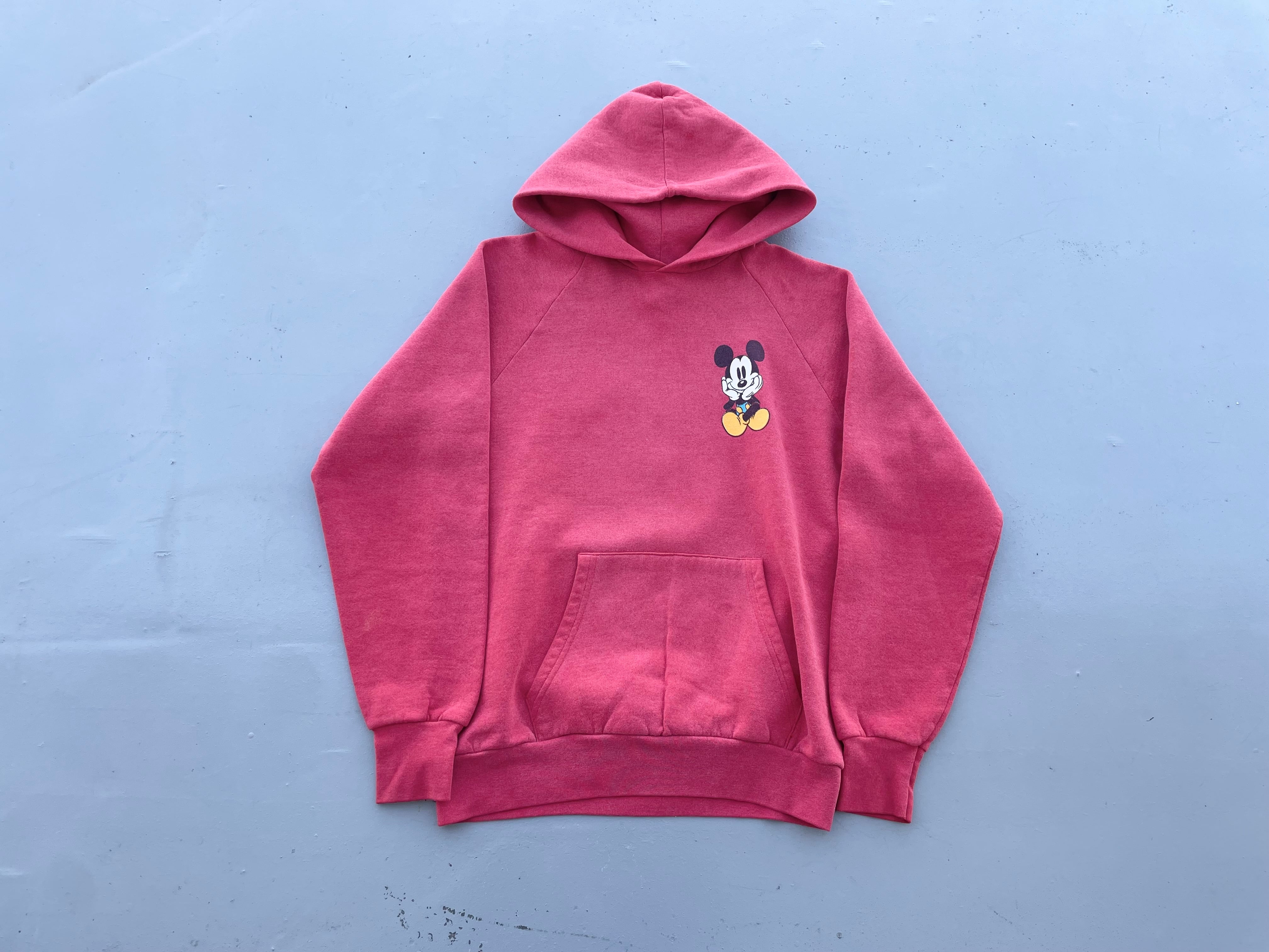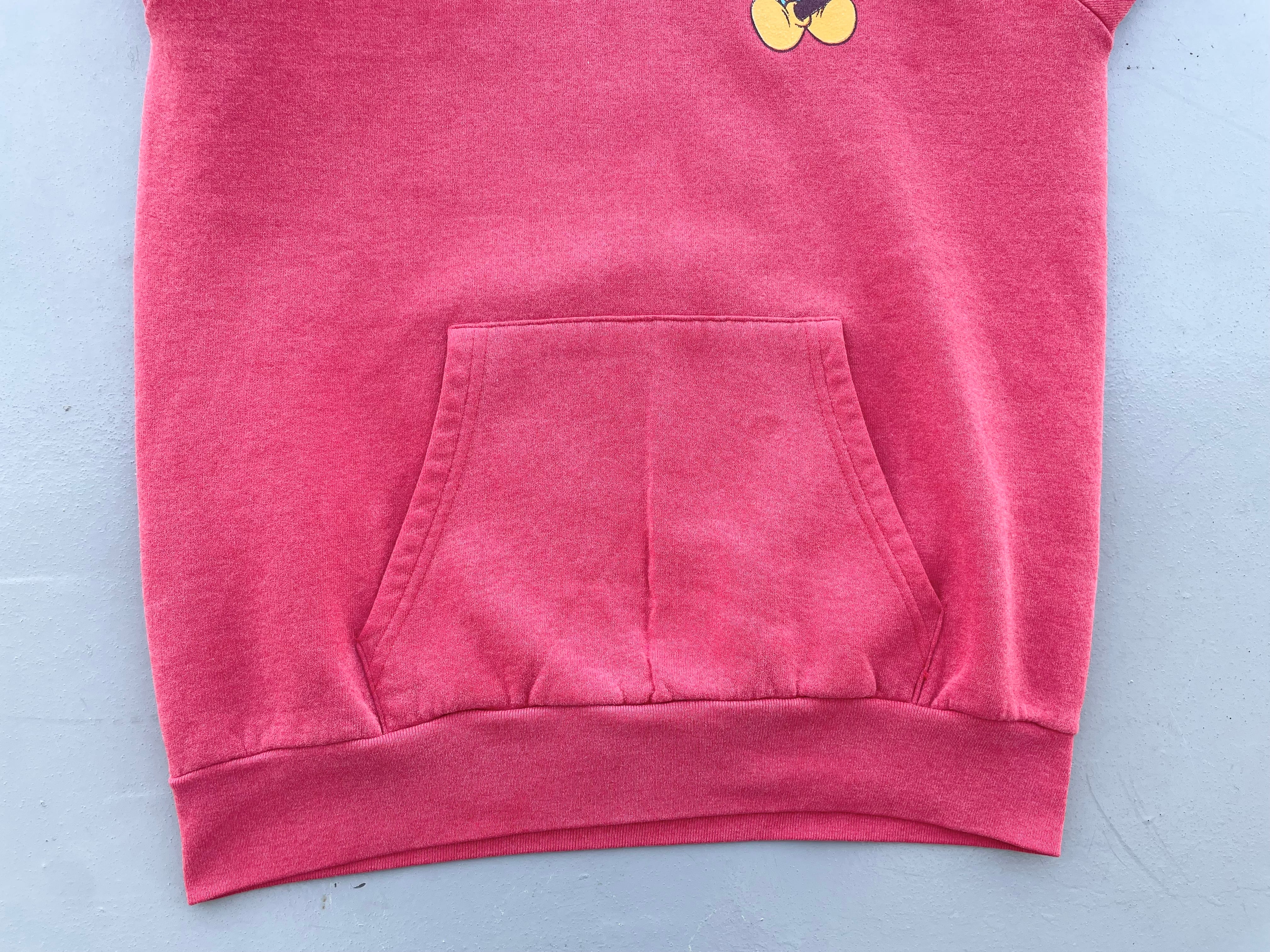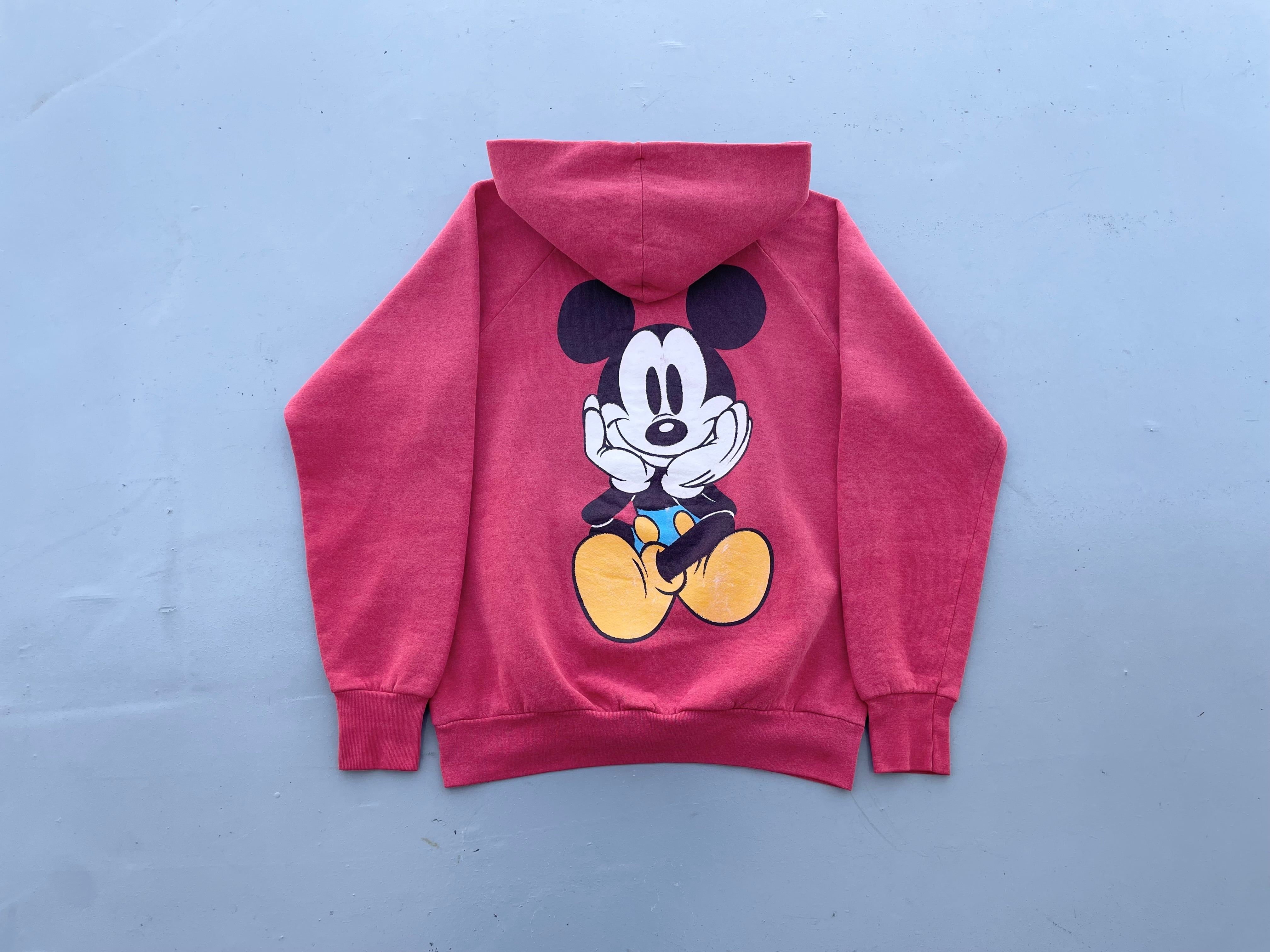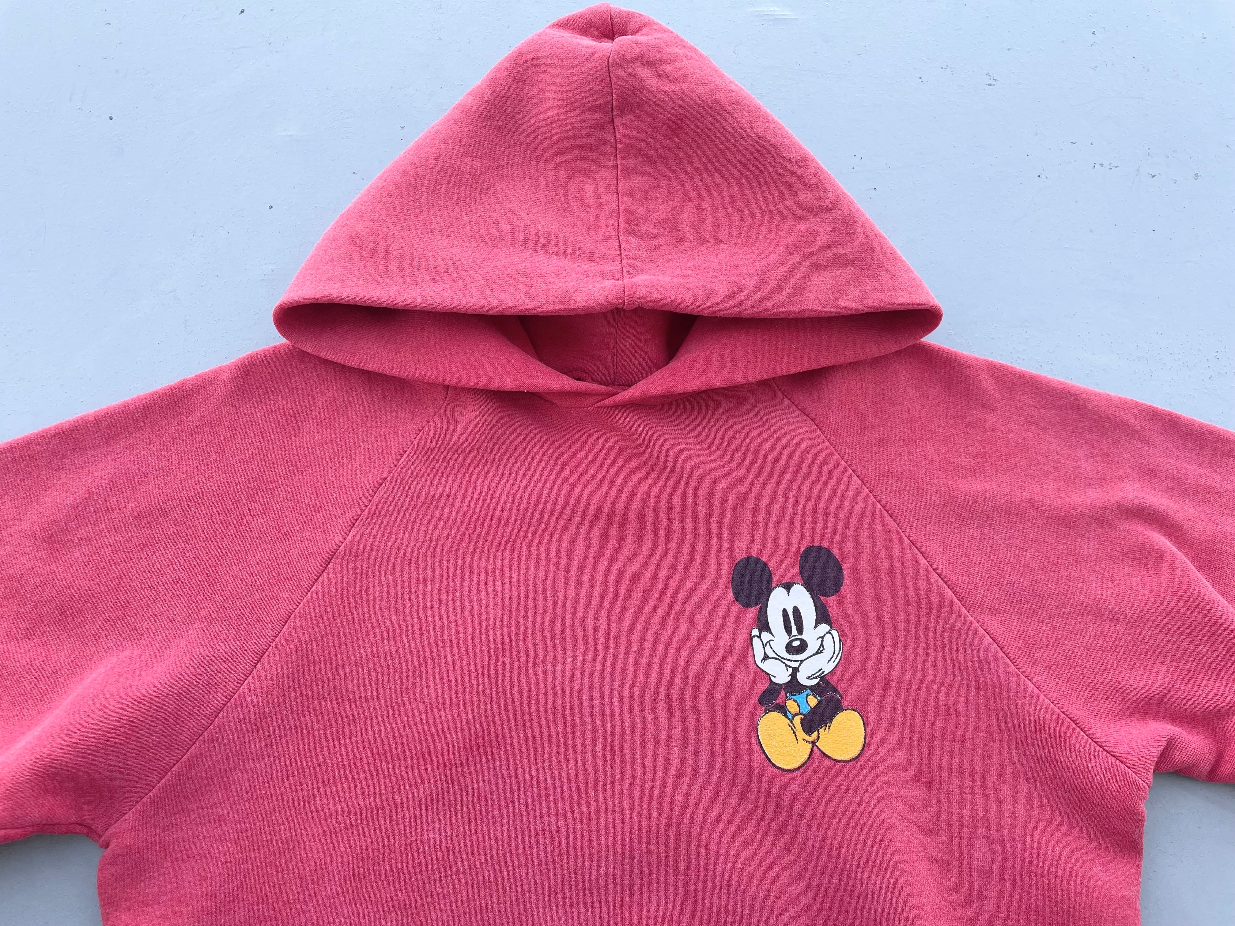 【商品詳細】ディズニーデザインズのプルオーバーパーカー。サイズはXL。カラーはレッド。90年代インド製。個人的に初見パターンの座り込み物。フロントのチビミッキー◎スウェットやTシャツに比べるとパーカー物は出ないです。