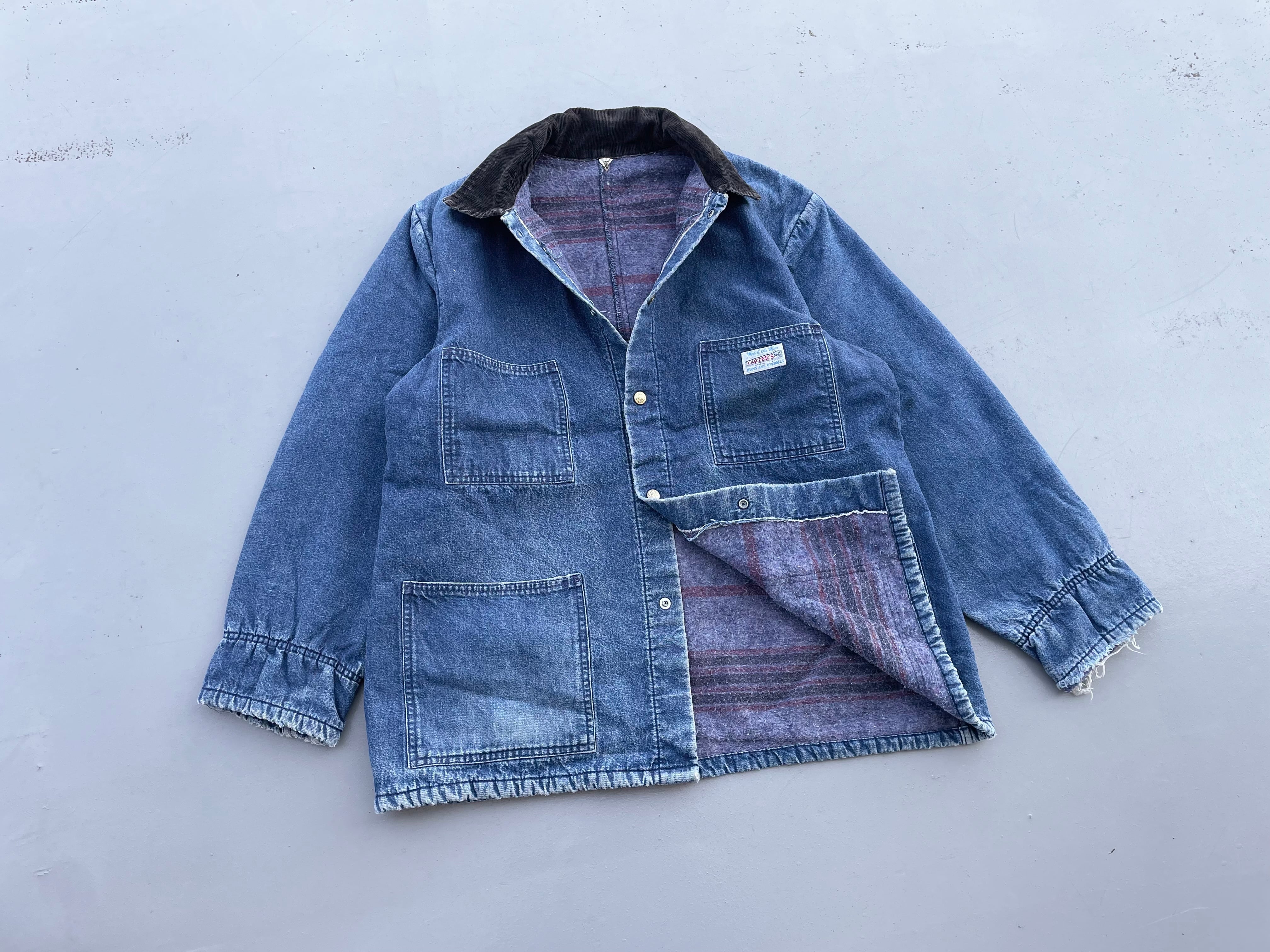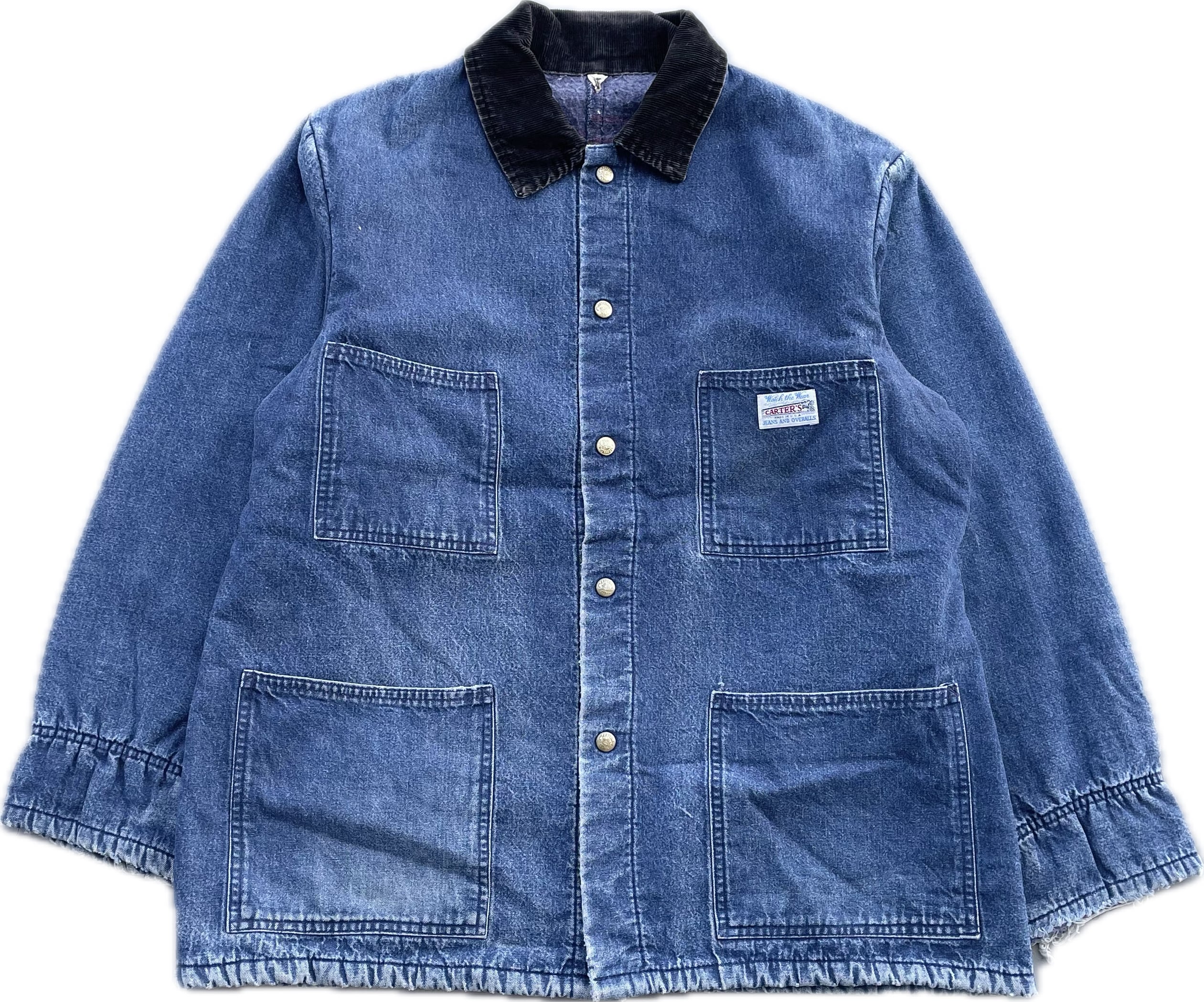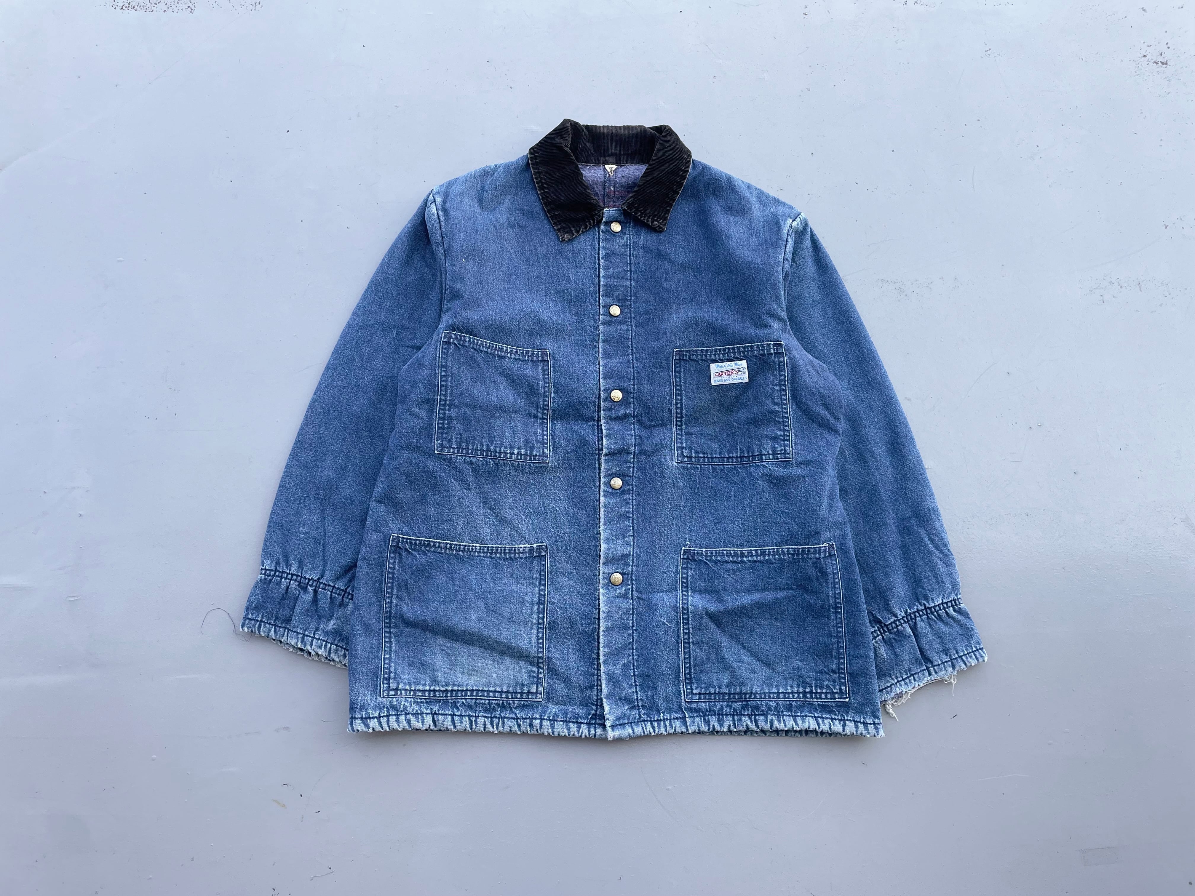 【商品詳細】カーターズのデニムカバーオール。サイズは実寸XL程。カラーはインディゴ。70-80年代USA製。ワークウェアの老舗ブランドのカーターズ。こちらの個体は全体的に使用感はございますが良い雰囲気に仕上がっており、まだまだ現役でご着用いただけます。色も残っておりこれからエイジングも楽しめそうです。
