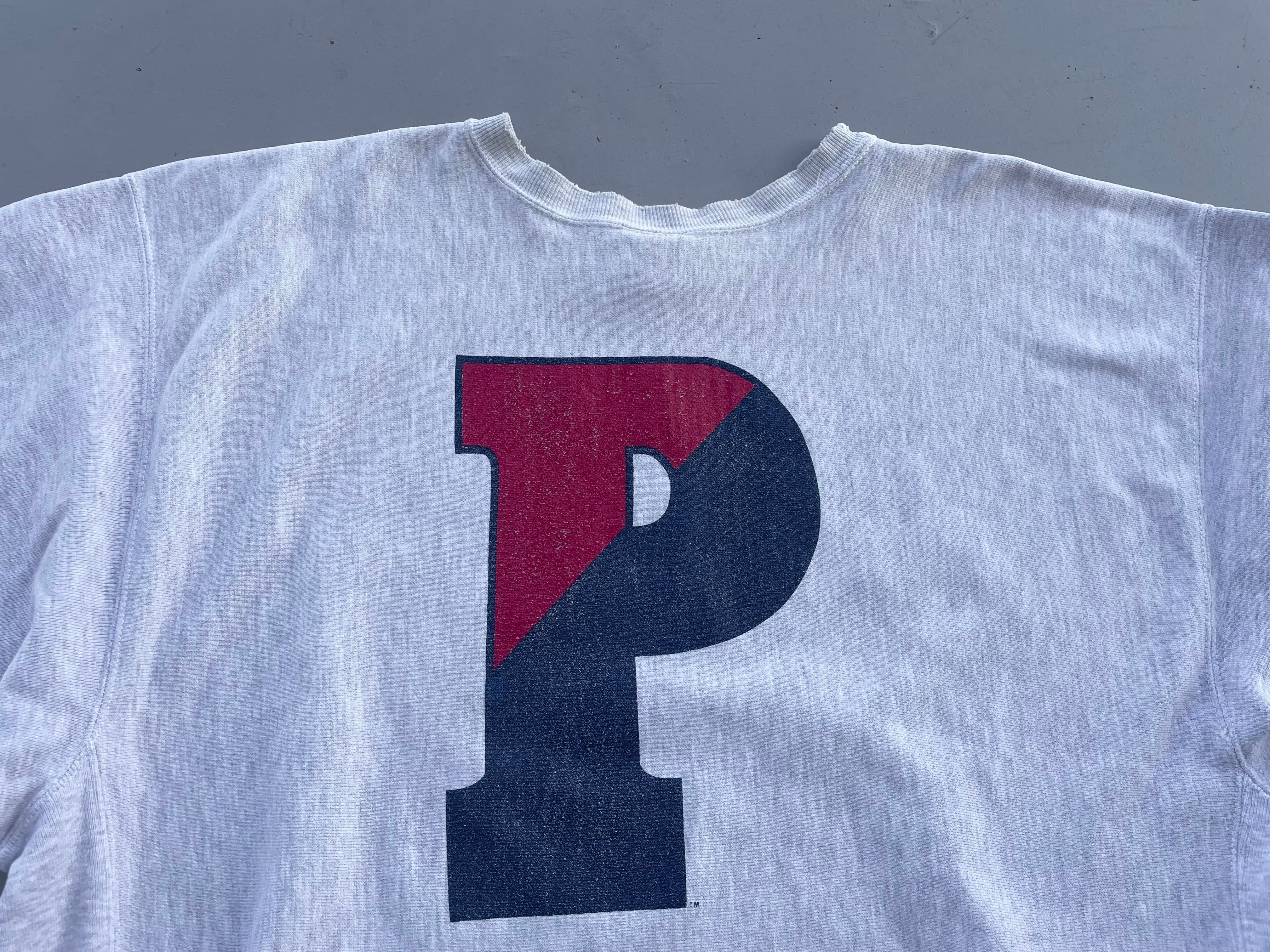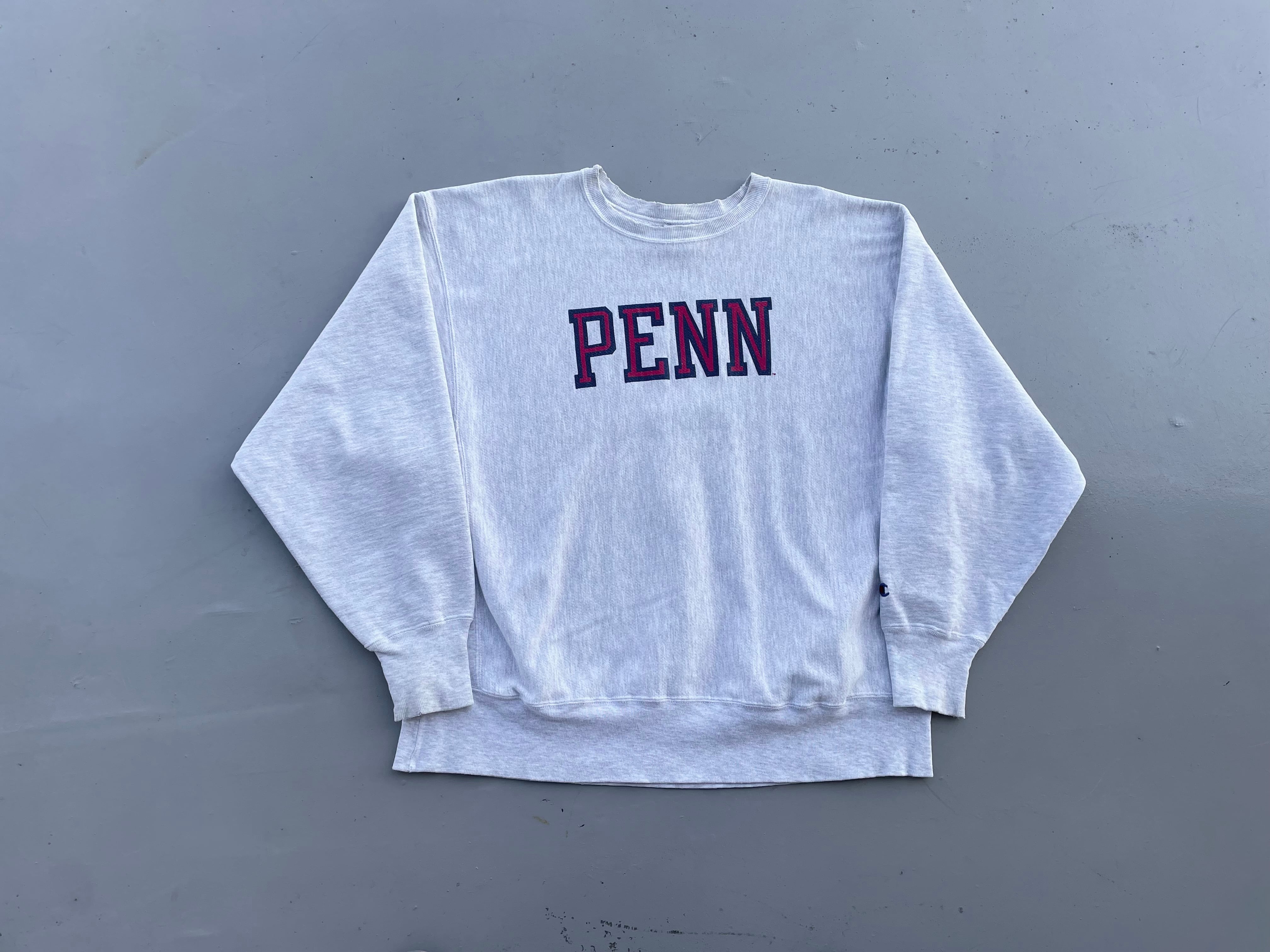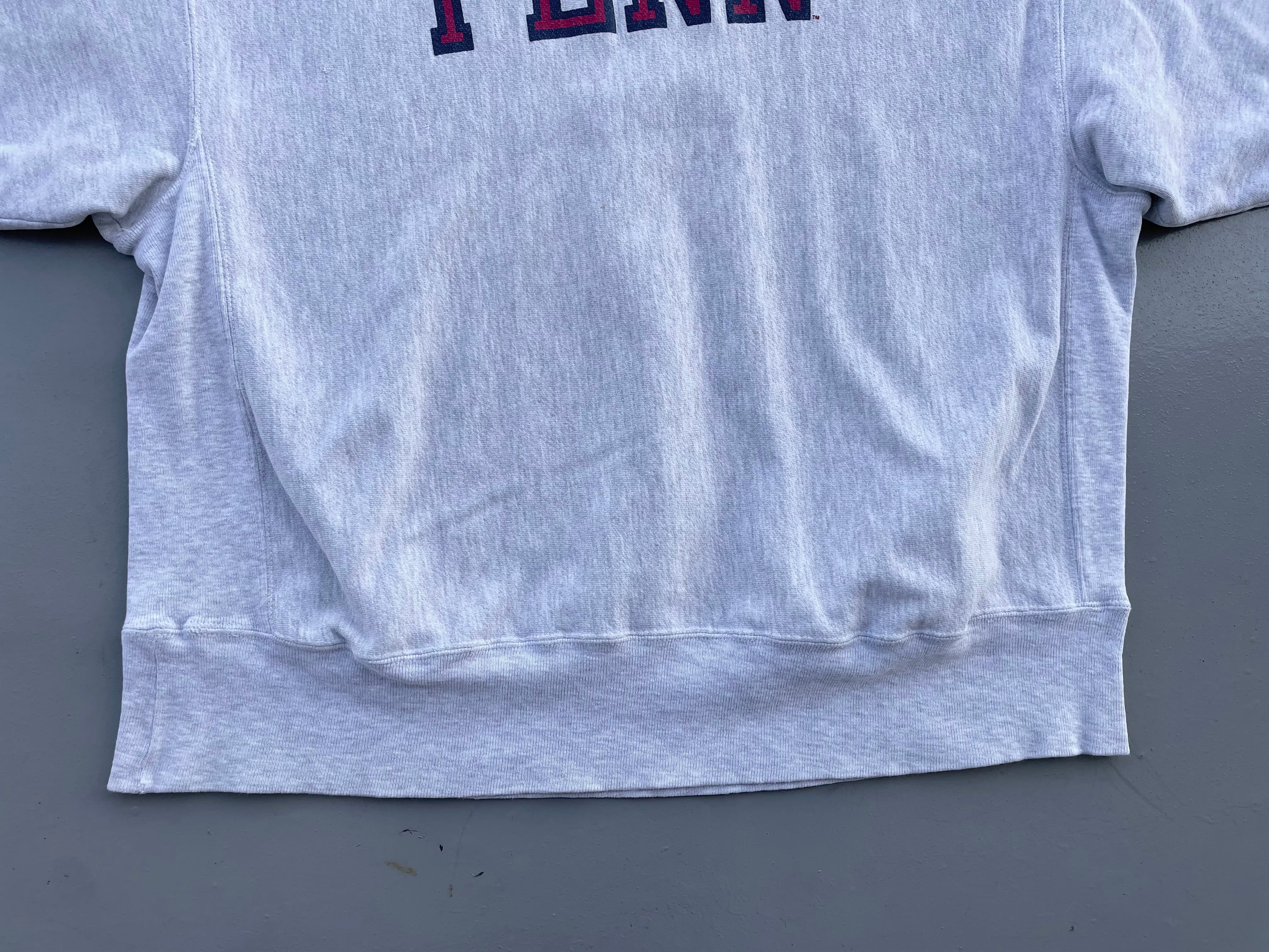 【商品詳細】チャンピオンのリバースウィーブ。サイズは実寸XL程。カラーはヘザーグレー。90年代製。定番ペンシルバニア大学物。サイズ大きめでざっくり着れる個体。