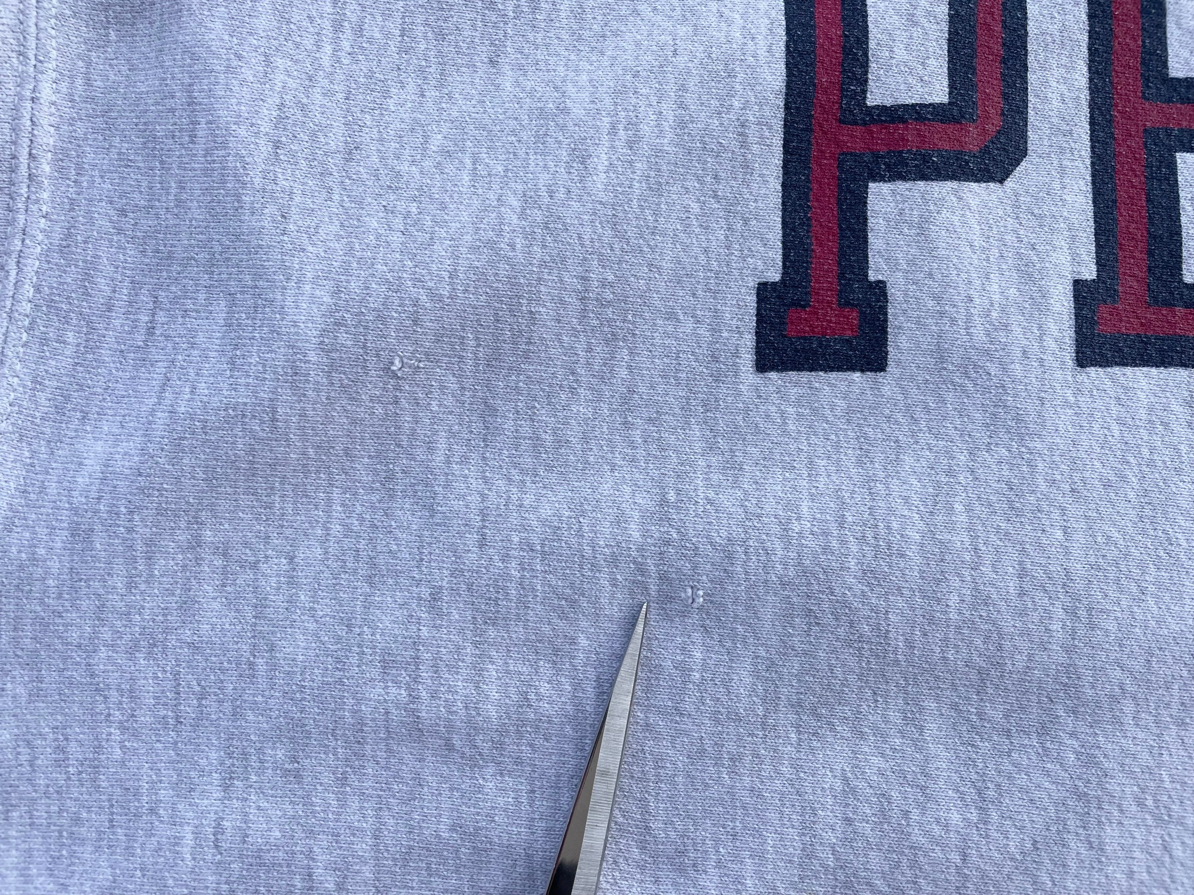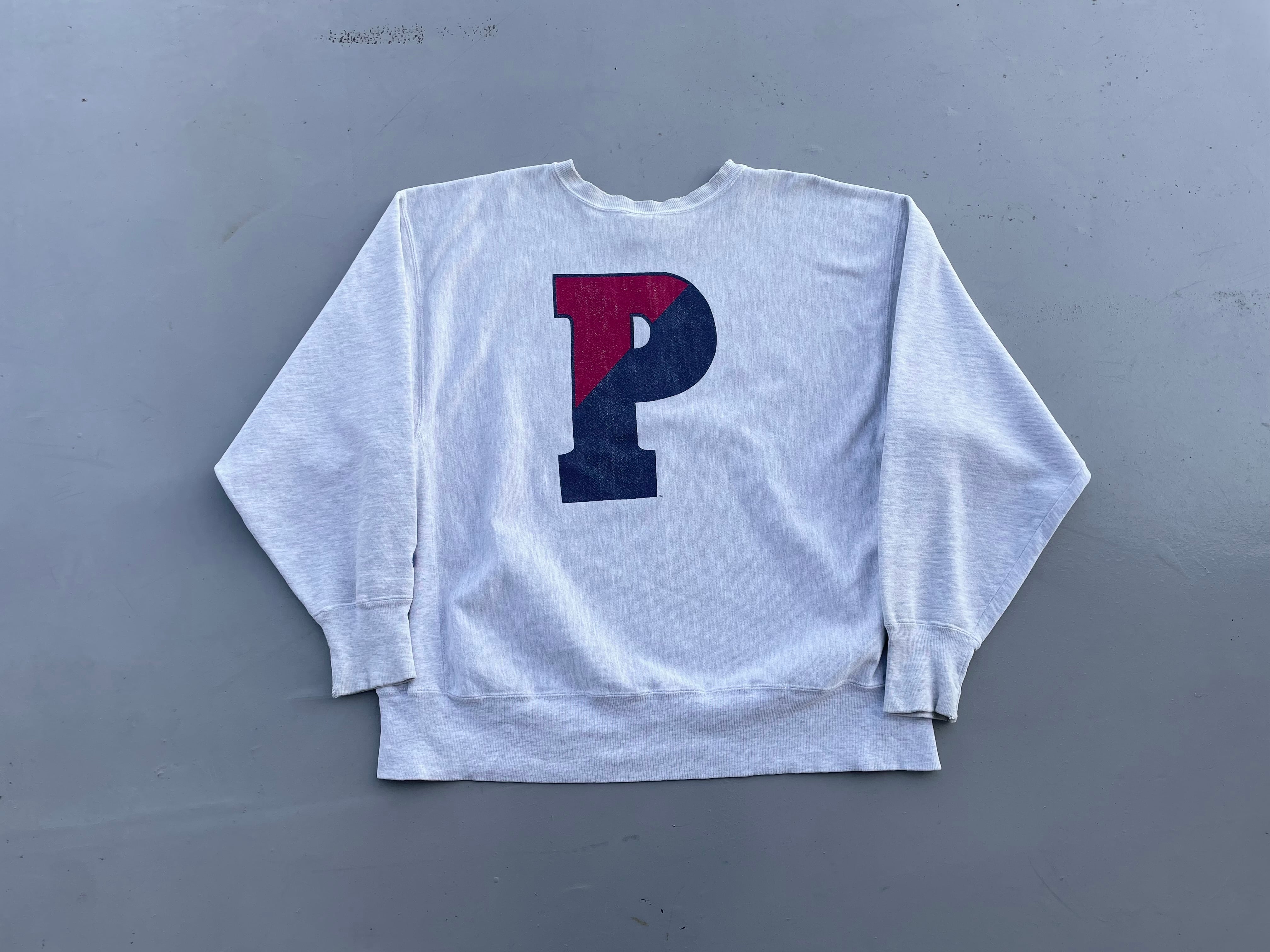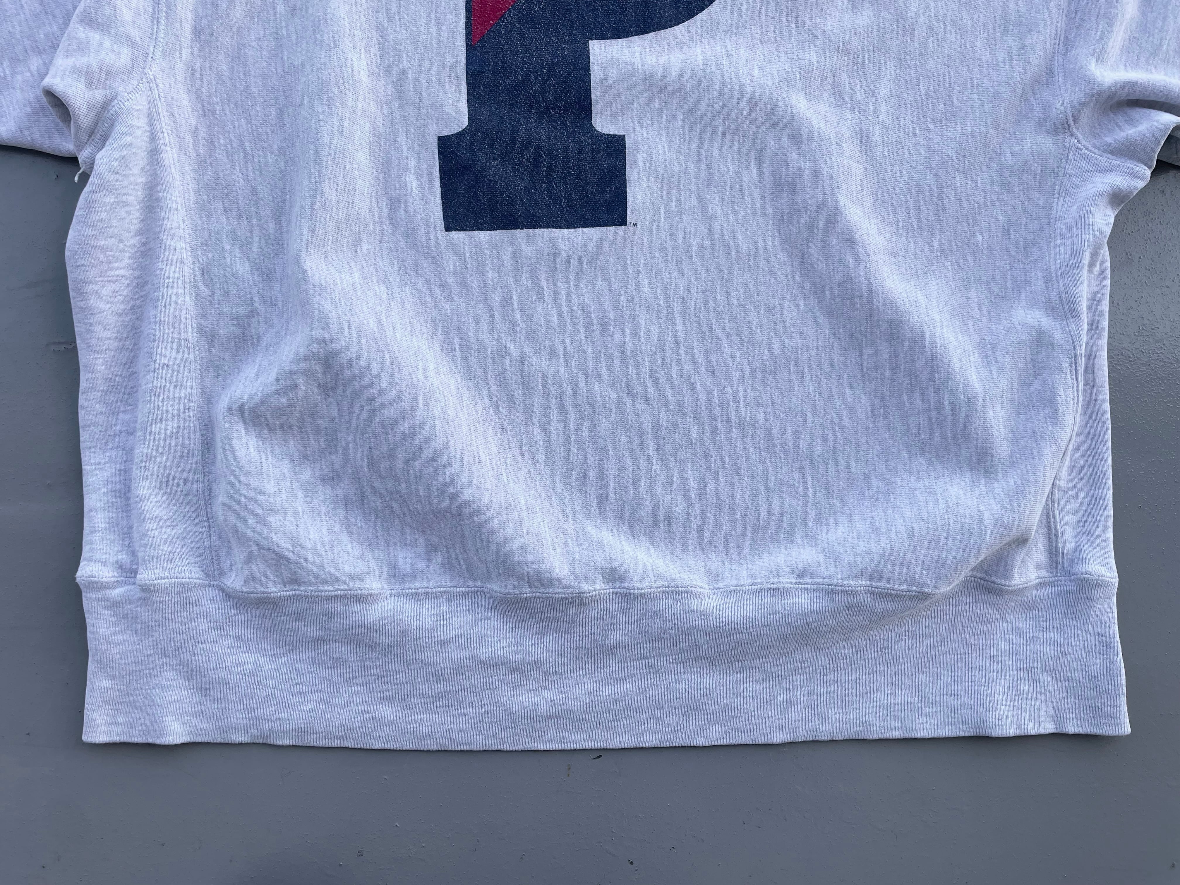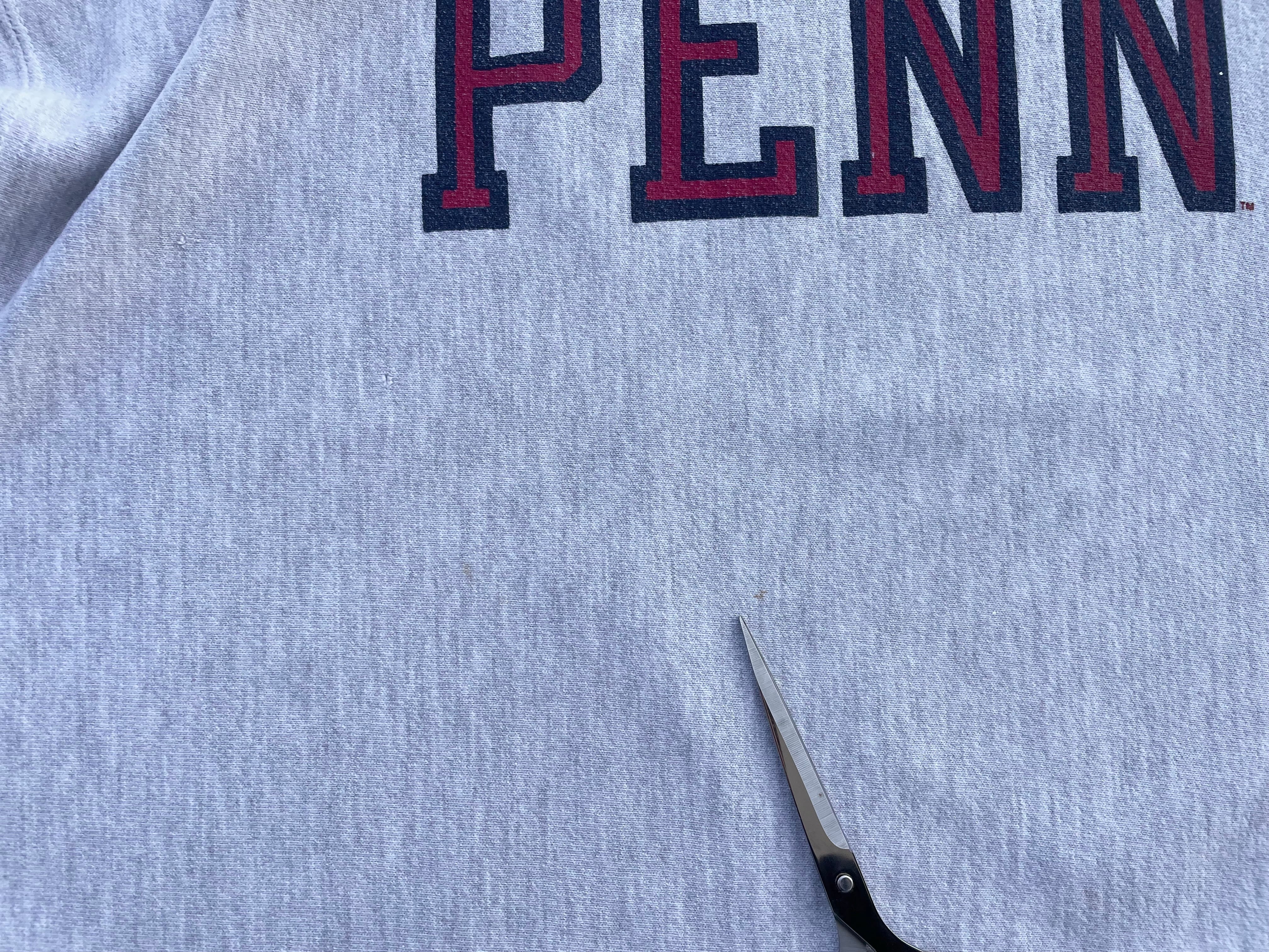 【商品詳細】チャンピオンのリバースウィーブ。サイズは実寸XL程。カラーはヘザーグレー。90年代製。定番ペンシルバニア大学物。サイズ大きめでざっくり着れる個体。
