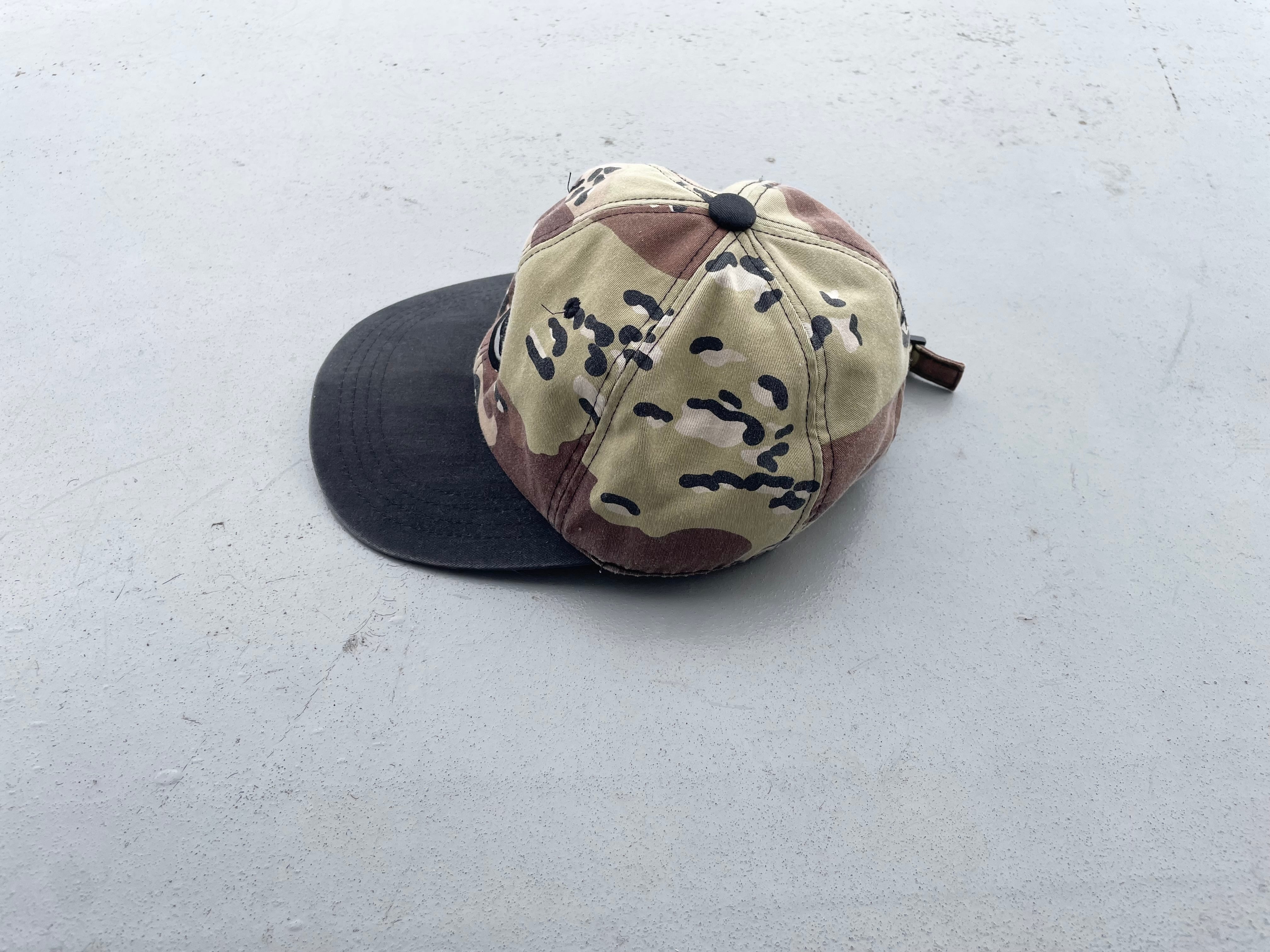 【商品詳細】STUSSYの6パネルキャップ。サイズはL。カラーはチョコチップカモフラージュデザイン。90年代中国製。人気のシャネルロゴのキャップ。チョコチップカモデザインの洒落たデザイン。丸っこいディテールで可愛いです。程良く使用感あり雰囲気のある個体です。