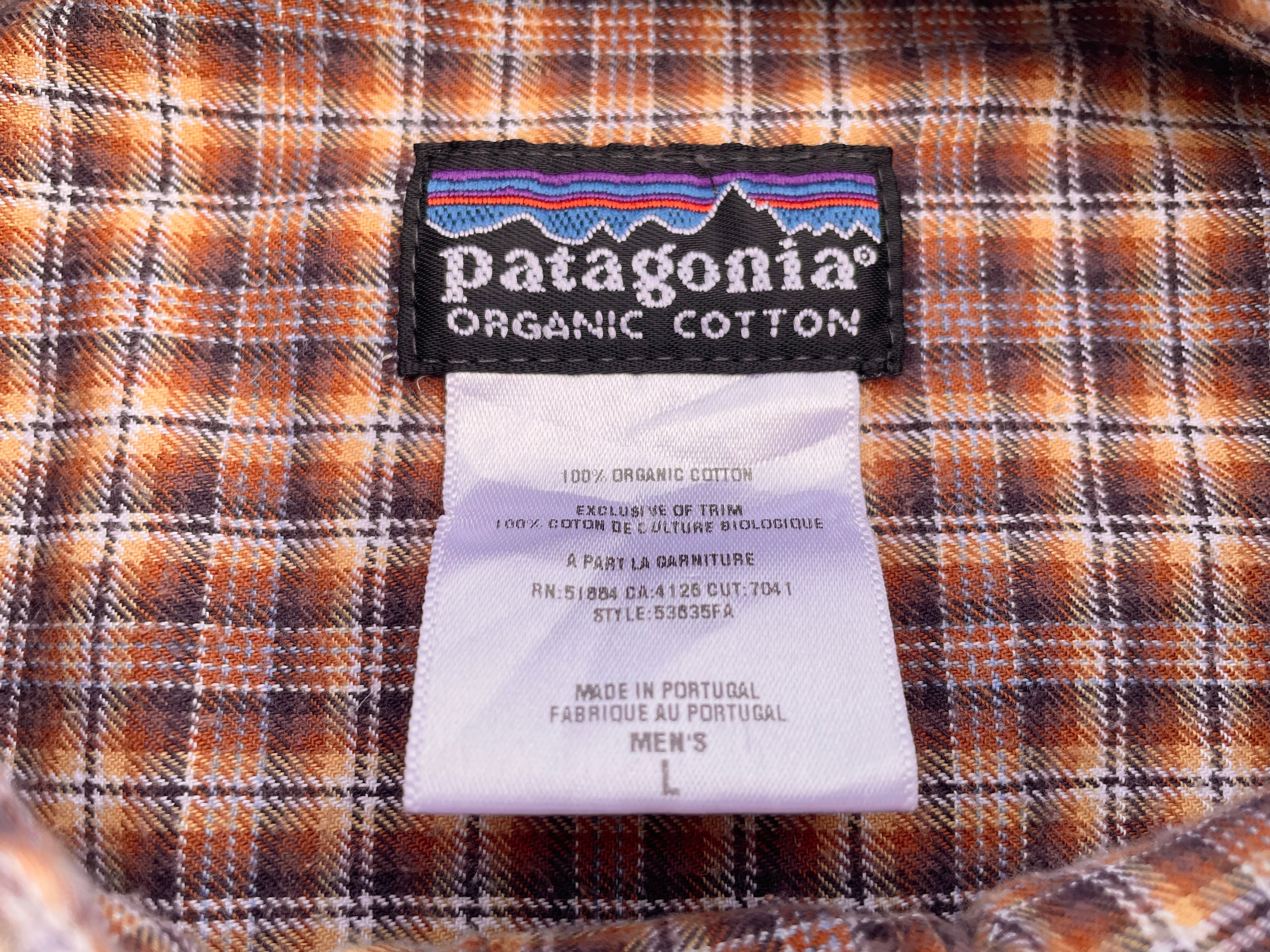 【商品詳細】パタゴニアの長袖シャツ。サイズはL。カラーはブラウン×オレンジベースのオンブレチェックパターン。05年ポルトガル製。人気のポルトガル物。着回しやすいスモールチェックなオンブレパターン。大きめサイズのギャルソンシルエット。