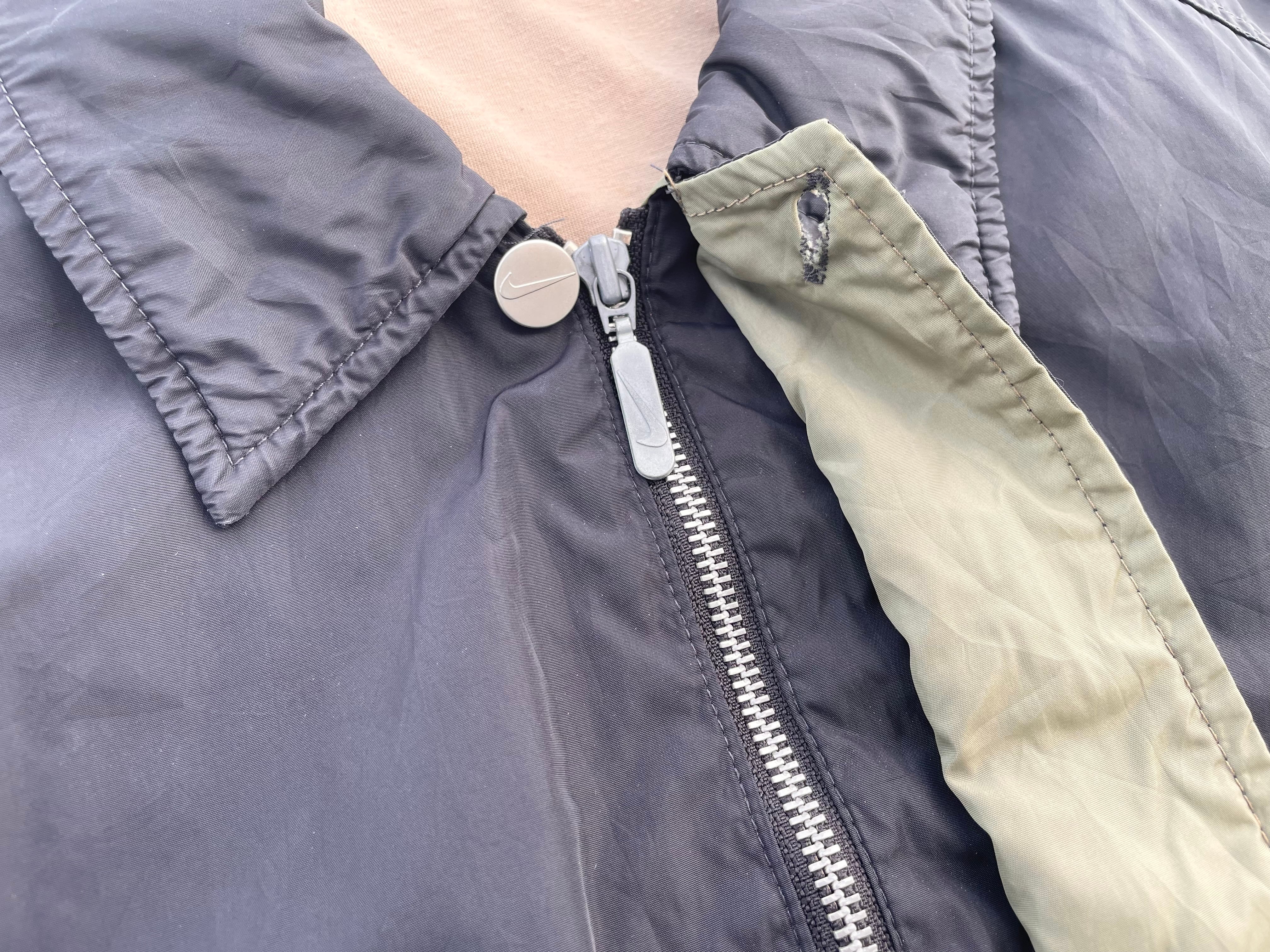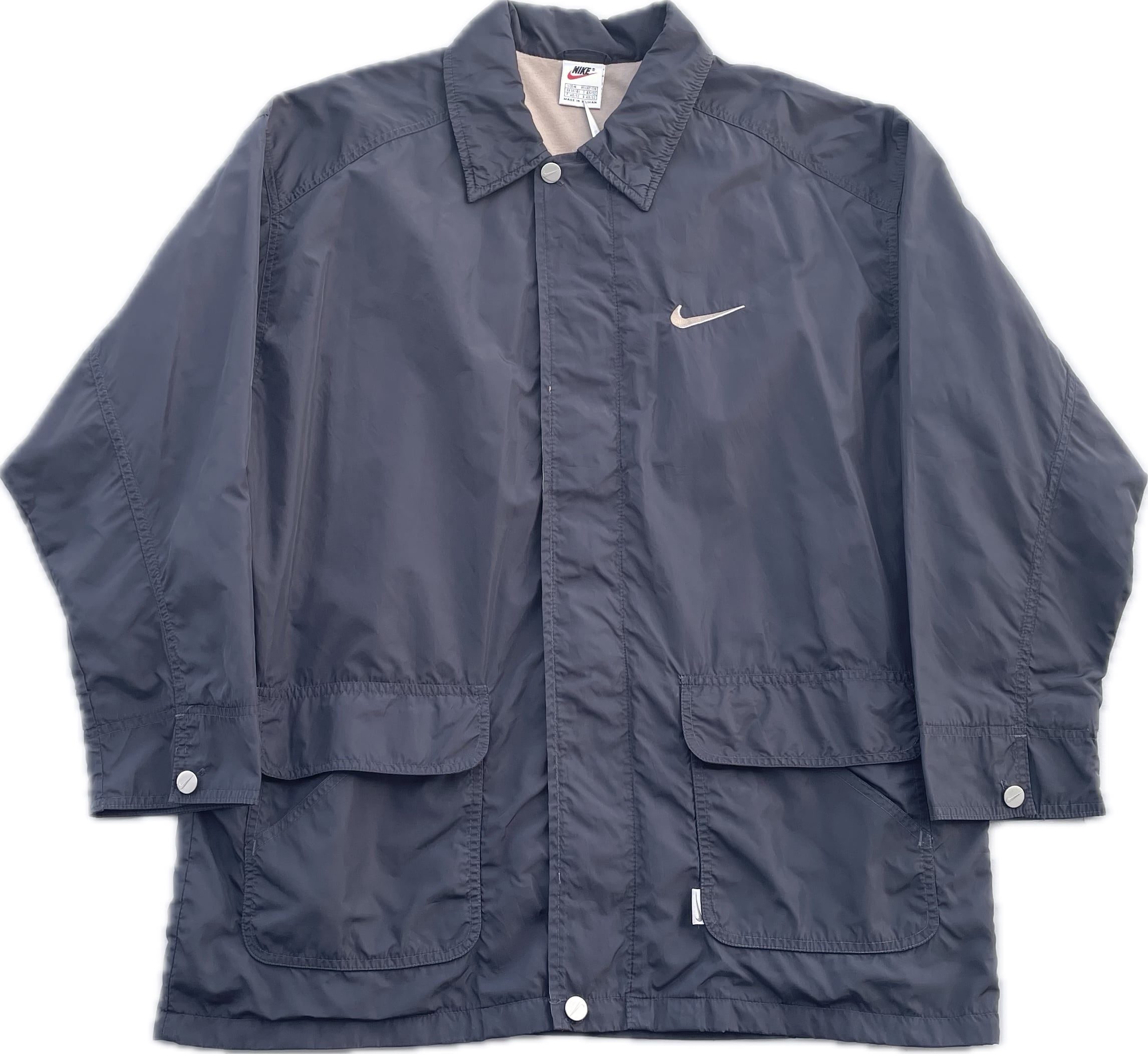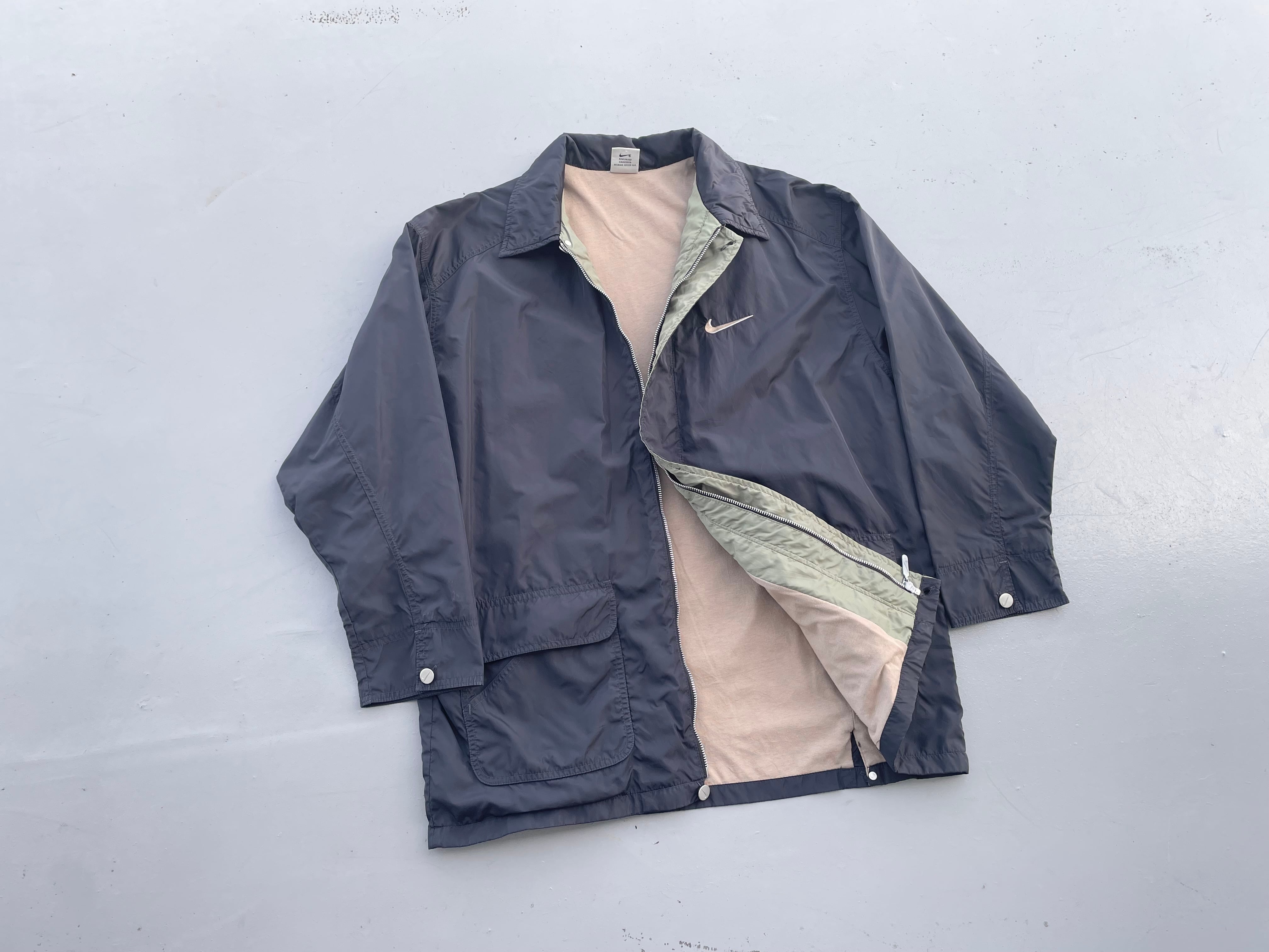 【商品詳細】ナイキのナイロンカバーオールジャケット。サイズはM。カラーはブラック。90年代台湾製。珍しいナイロン地のカバーオールジャケット。カバーオールらしいざっくりしたディテールに加えてライニングコットン貼りの別色仕様やアジャスター付、スウォッシュボタン等洒落た一着。