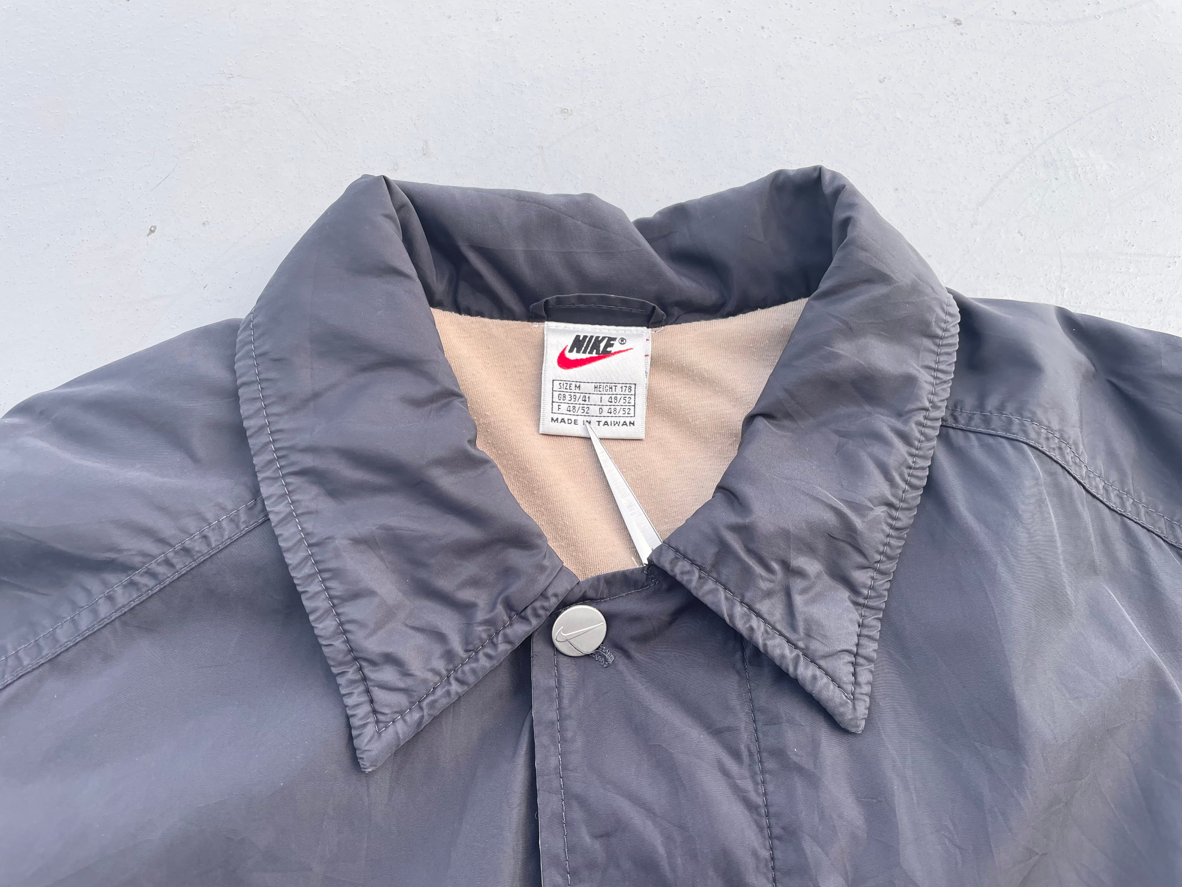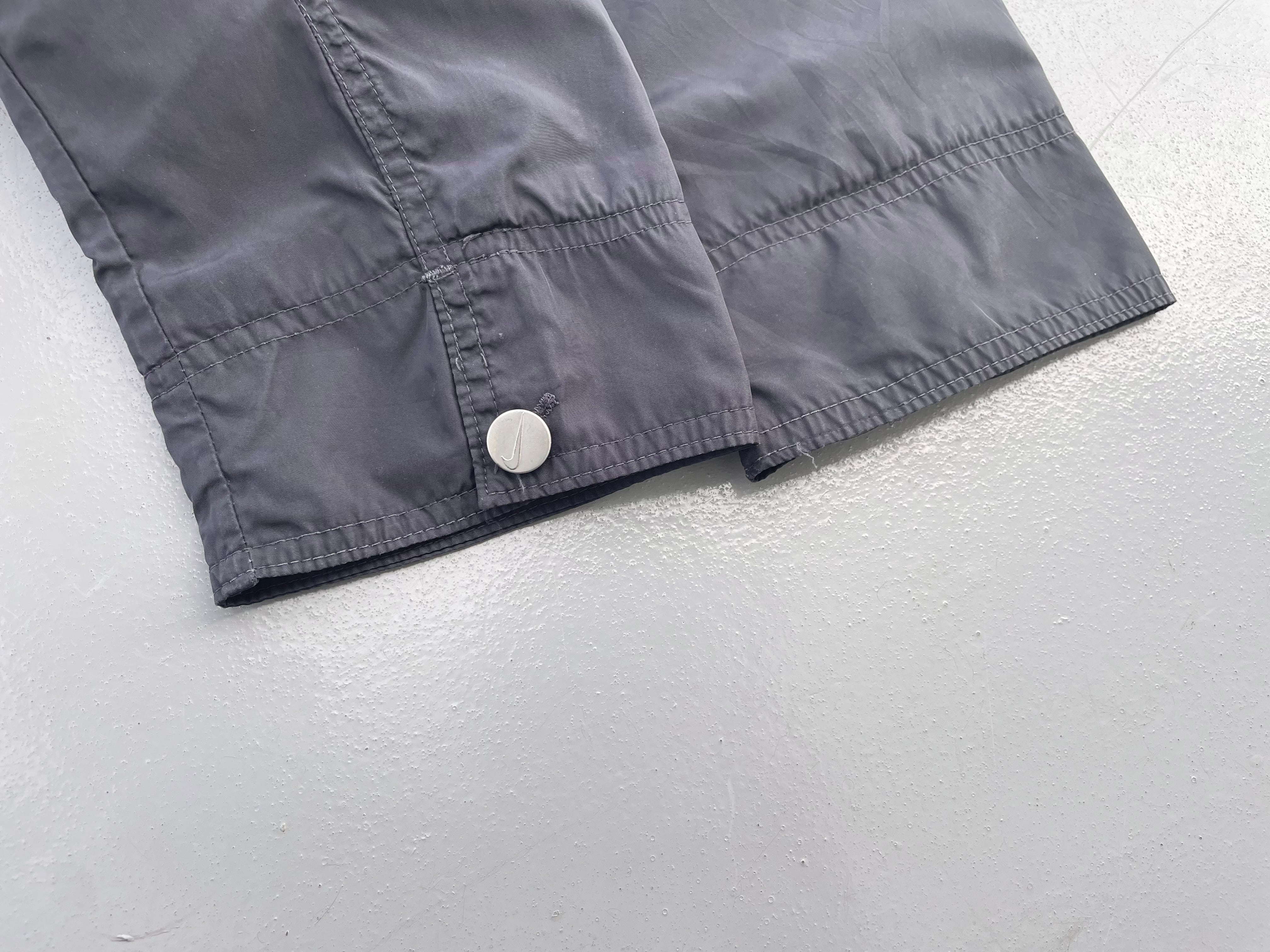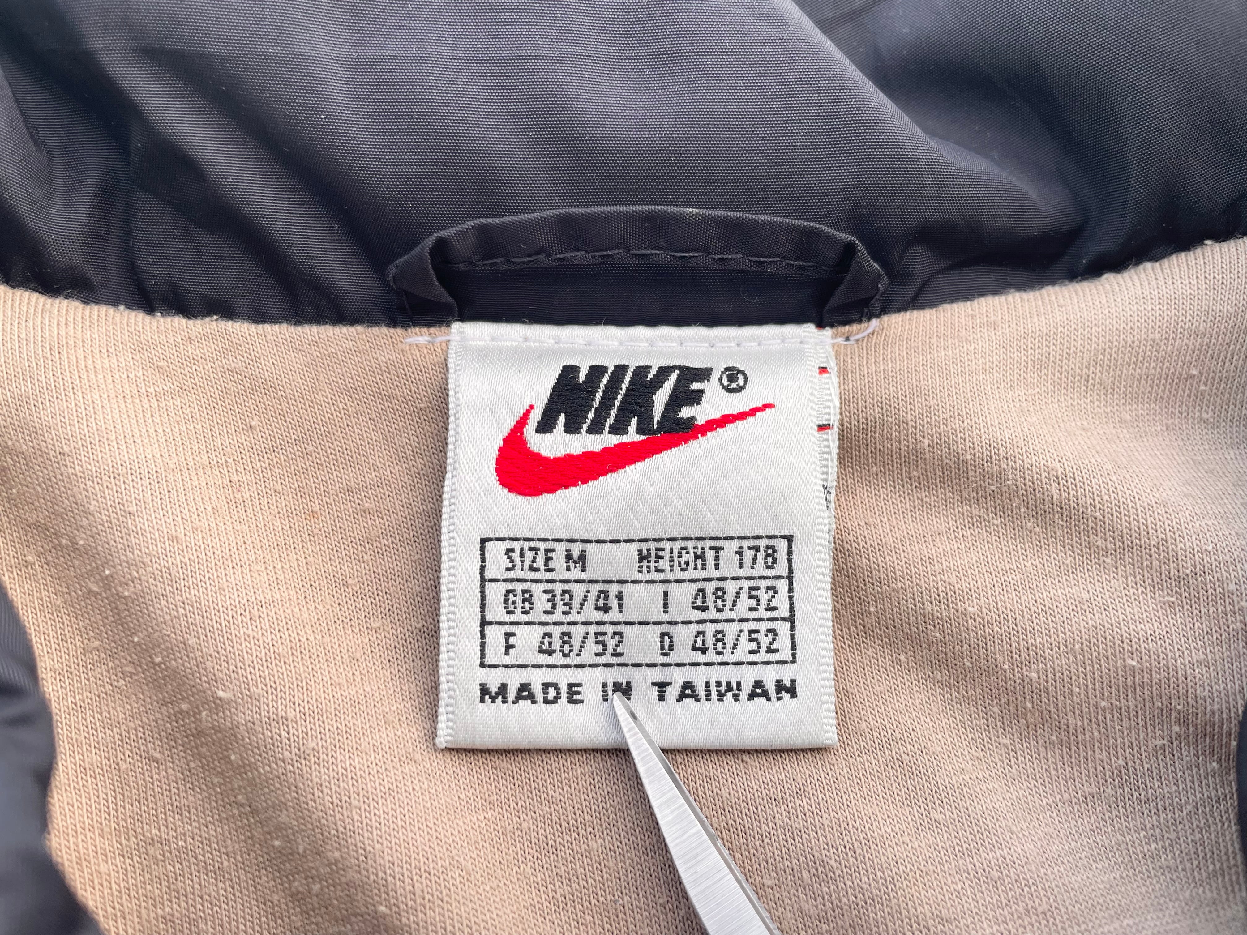 【商品詳細】ナイキのナイロンカバーオールジャケット。サイズはM。カラーはブラック。90年代台湾製。珍しいナイロン地のカバーオールジャケット。カバーオールらしいざっくりしたディテールに加えてライニングコットン貼りの別色仕様やアジャスター付、スウォッシュボタン等洒落た一着。