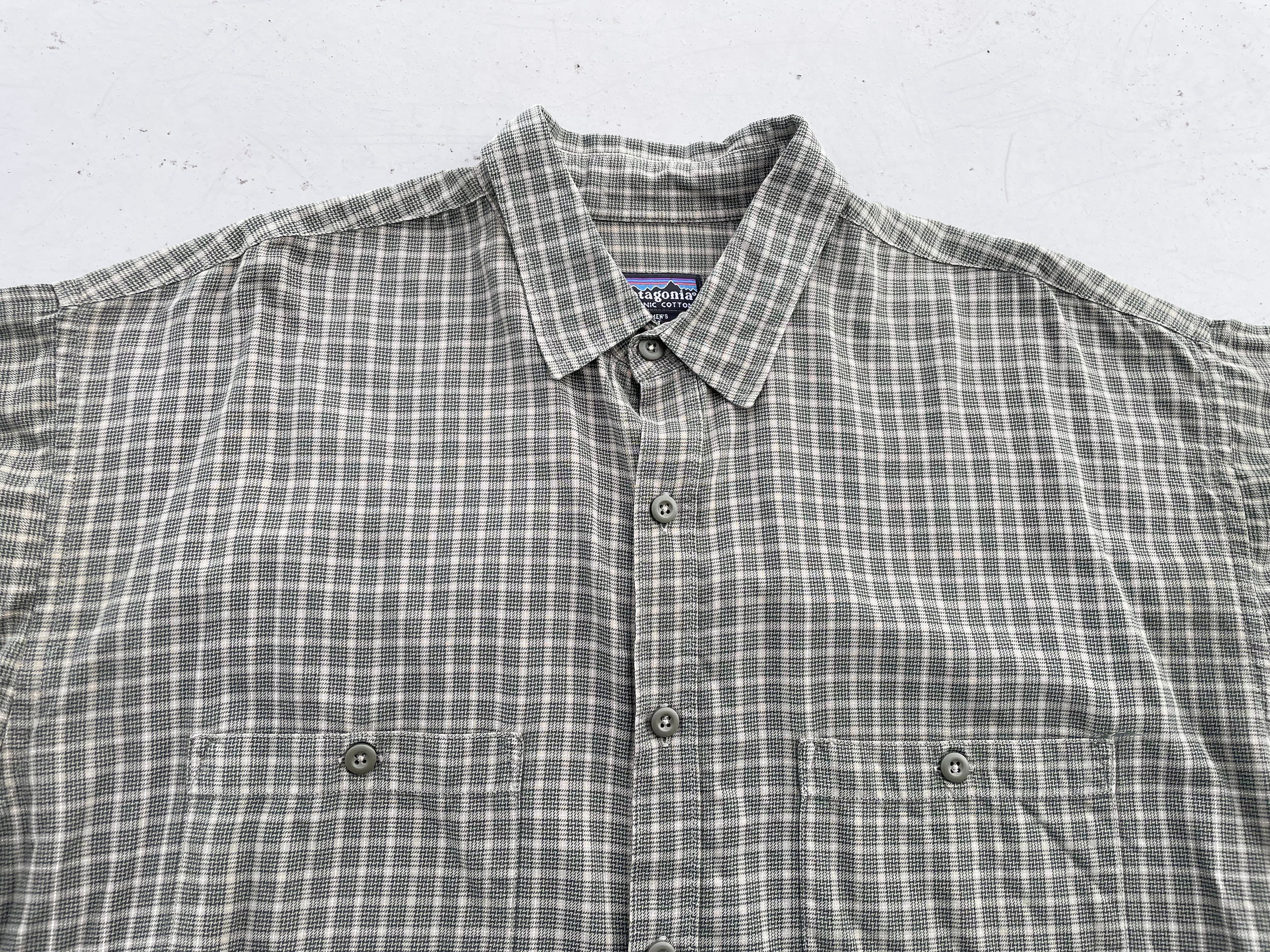 【商品詳細】パタゴニアの長袖シャツ。サイズはL。カラーは深緑ベースのチェックデザイン。02年ポルトガル製。人気のポルトガル製シャツ。玄人カラーなチェックデザインで服装選ばず着回しやすそうです。ざっくり着れる大きめサイズ。サラッとした触り心地のコットン地で今時期ちょうど良さそうです。