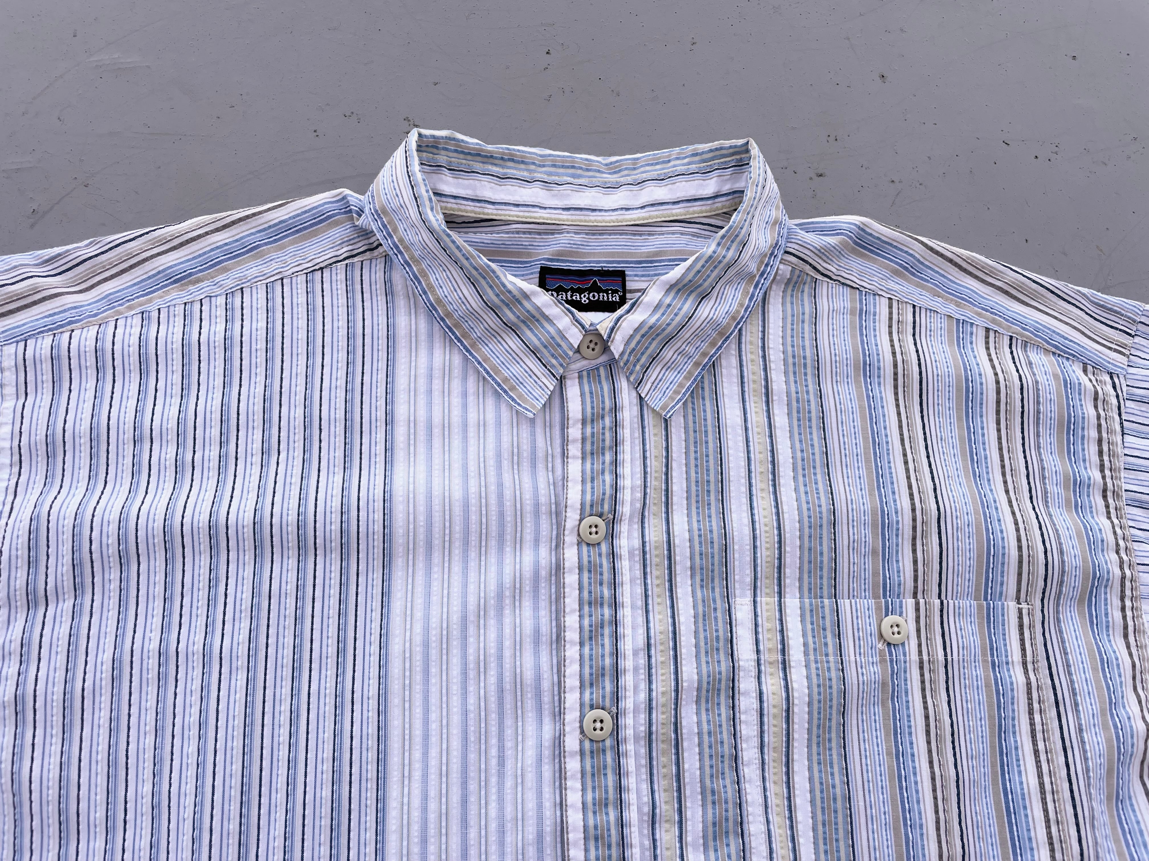 【商品詳細】パタゴニアの長袖シャツ。サイズはL。カラーはホワイト×ブルー×ベージュベースのマルチストライプパターン。06年タイ製。軽い仕上がりのシアサッカーシャツ。涼しげな配色と多色使いのストライプが洒落てます。旬なボックスシルエットで今っぽくご着用いただけるかと。